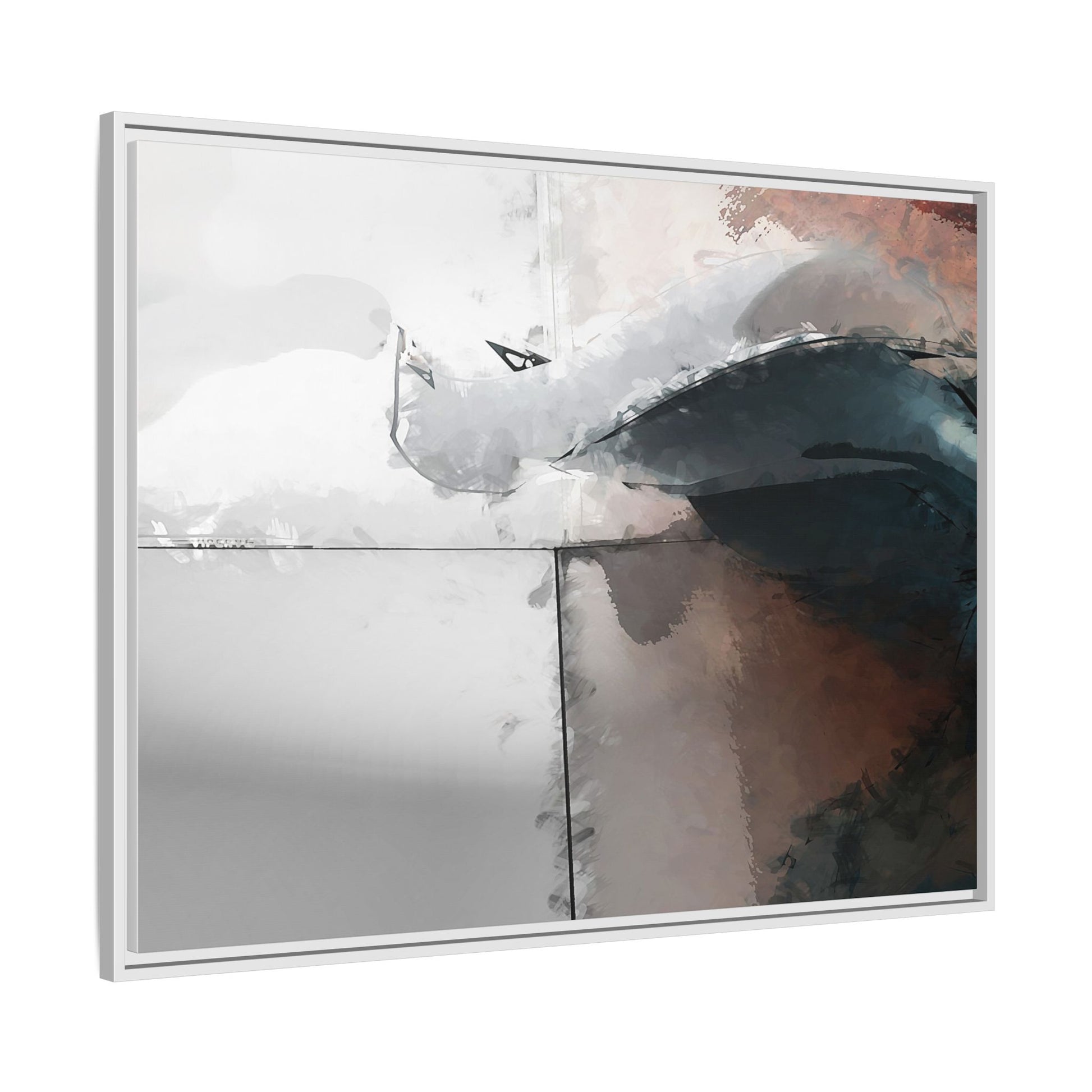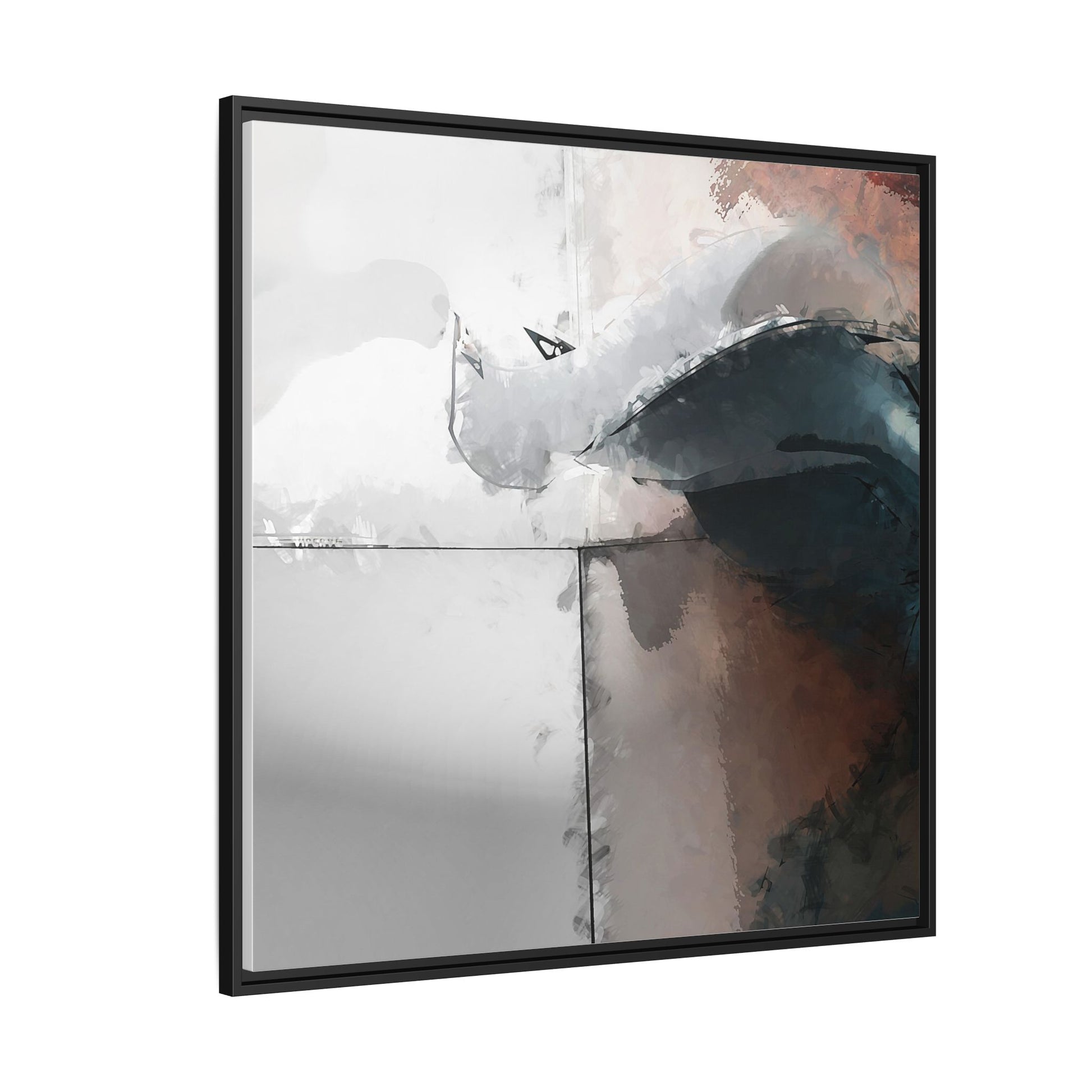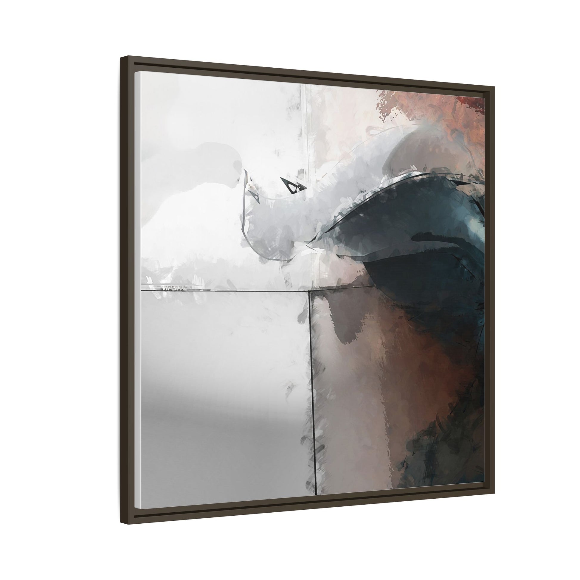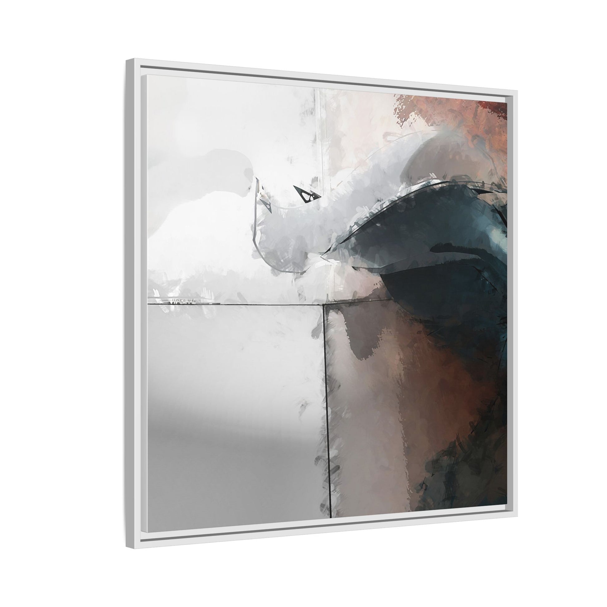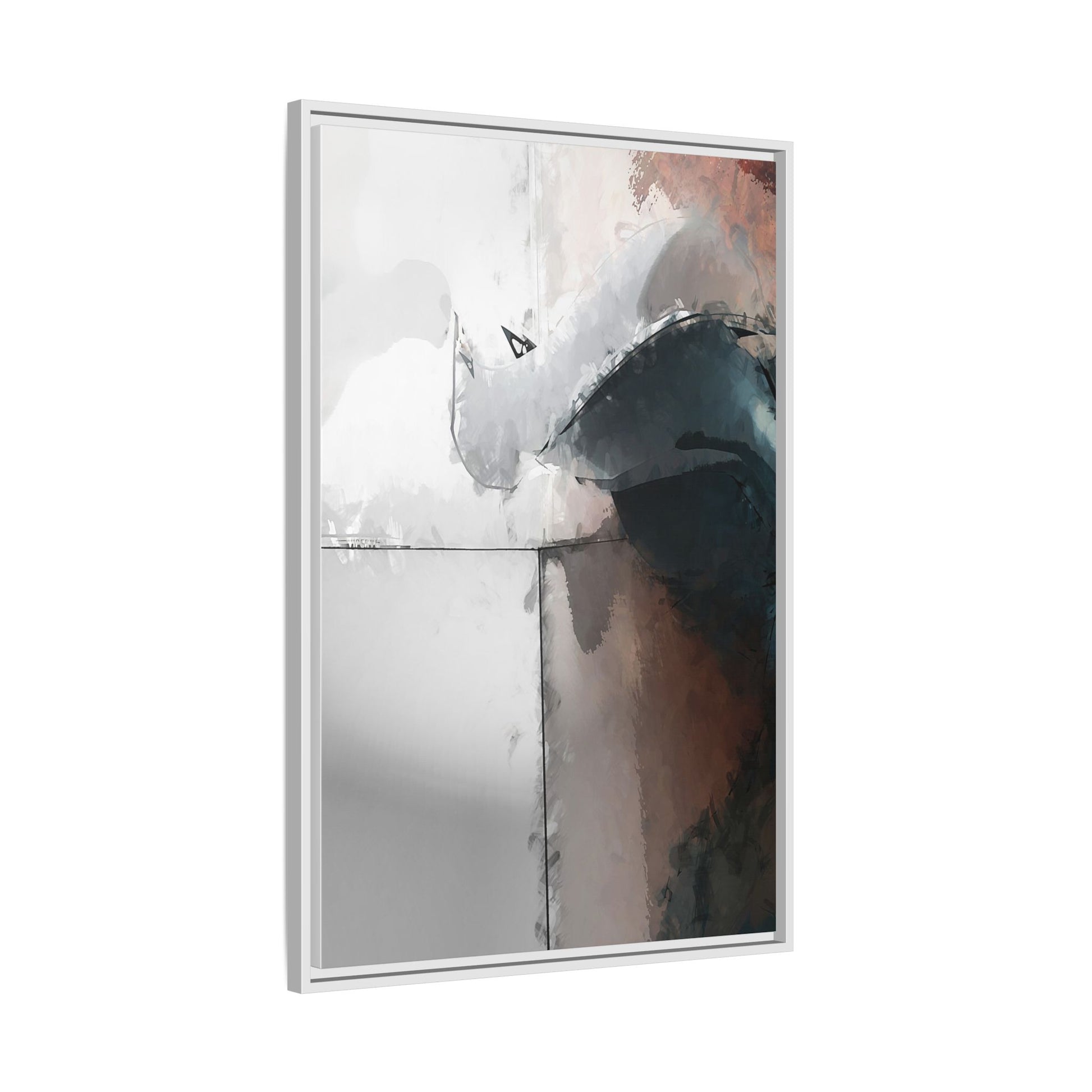 This abstract digital artwork features a minimalist, geometric composition with soft, blended colors ranging from cool grays to warm earth tones. The image is divided by sharp vertical lines, creating a segmented visual landscape with an ethereal, dreamlike quality. Subtle brushstrokes and watercolor-like textures give the piece a fluid, organic feel despite its angular structure. Darker blue-gray shapes dominate the lower right portion of the image, creating a sense of depth and contrast against the lighter background. The overall style suggests a modern, conceptual approach to digital painting, blending architectural elements with abstract expressionism.