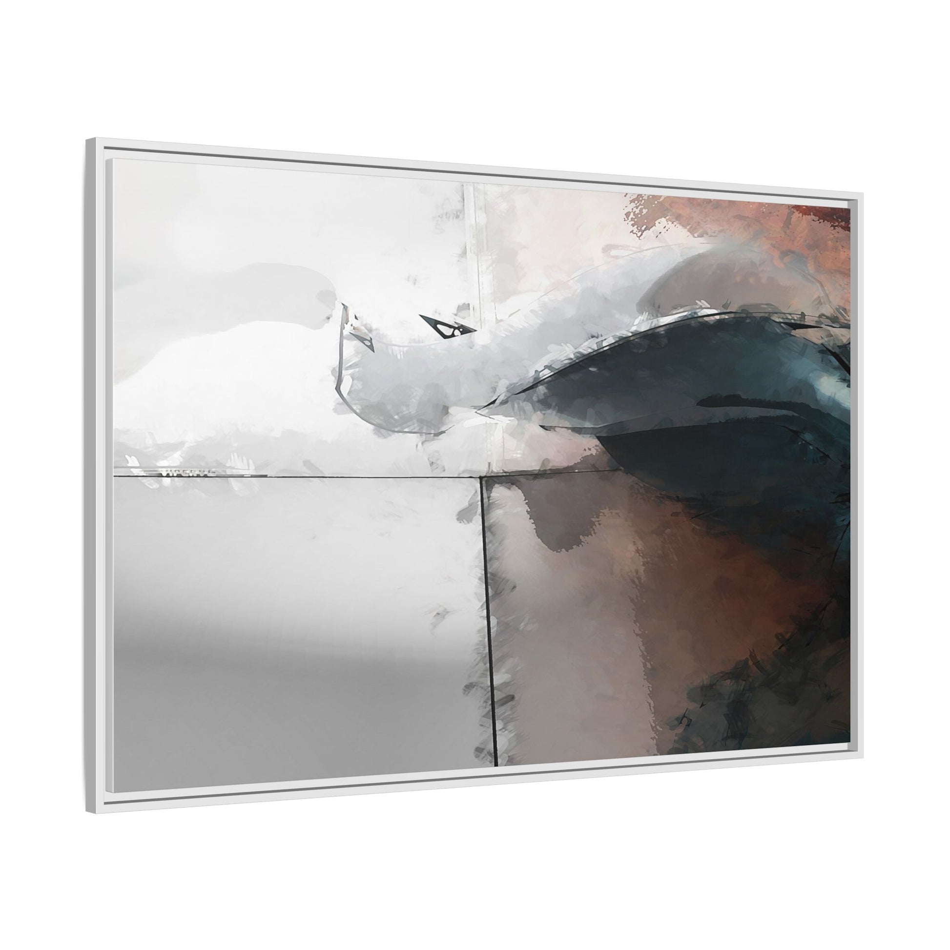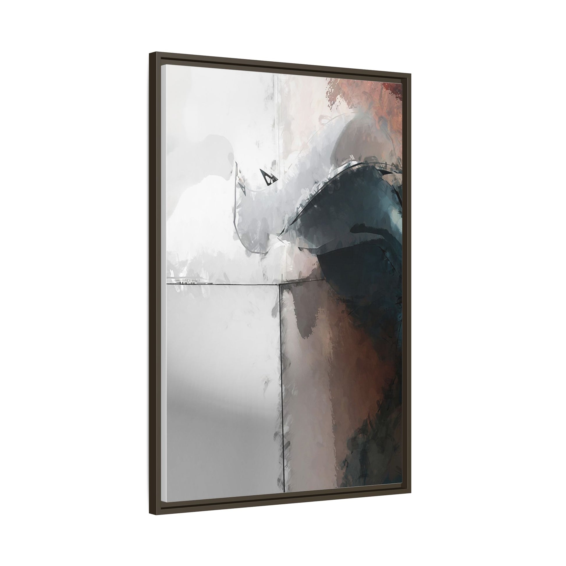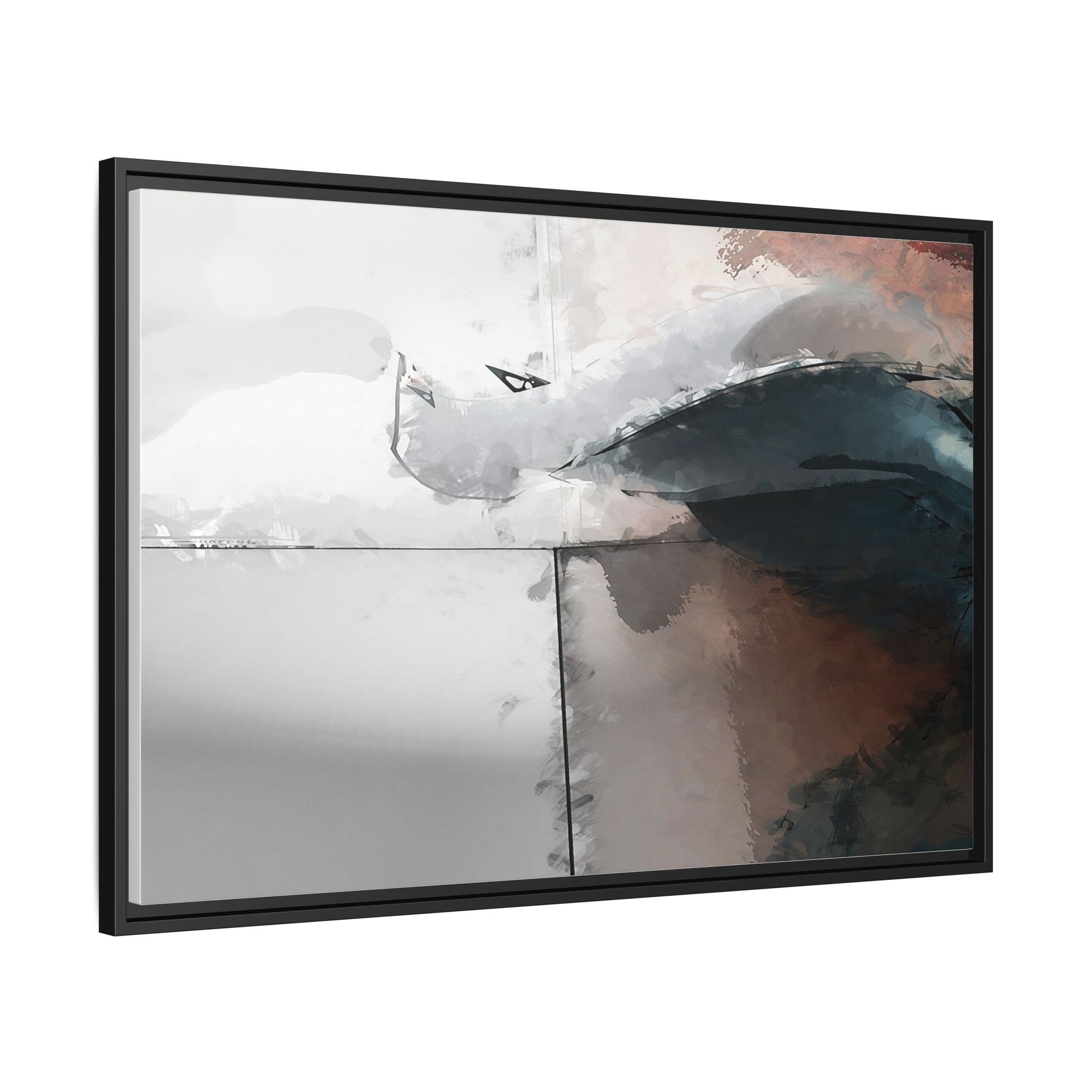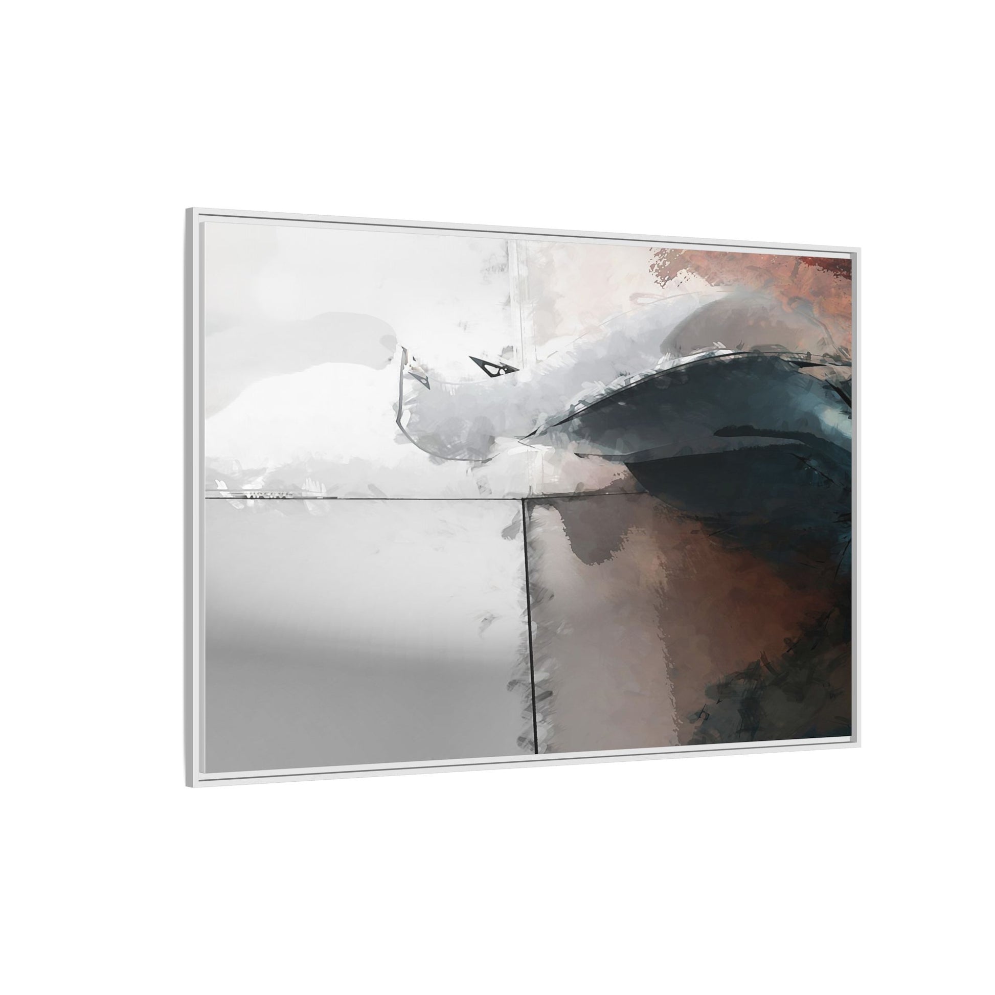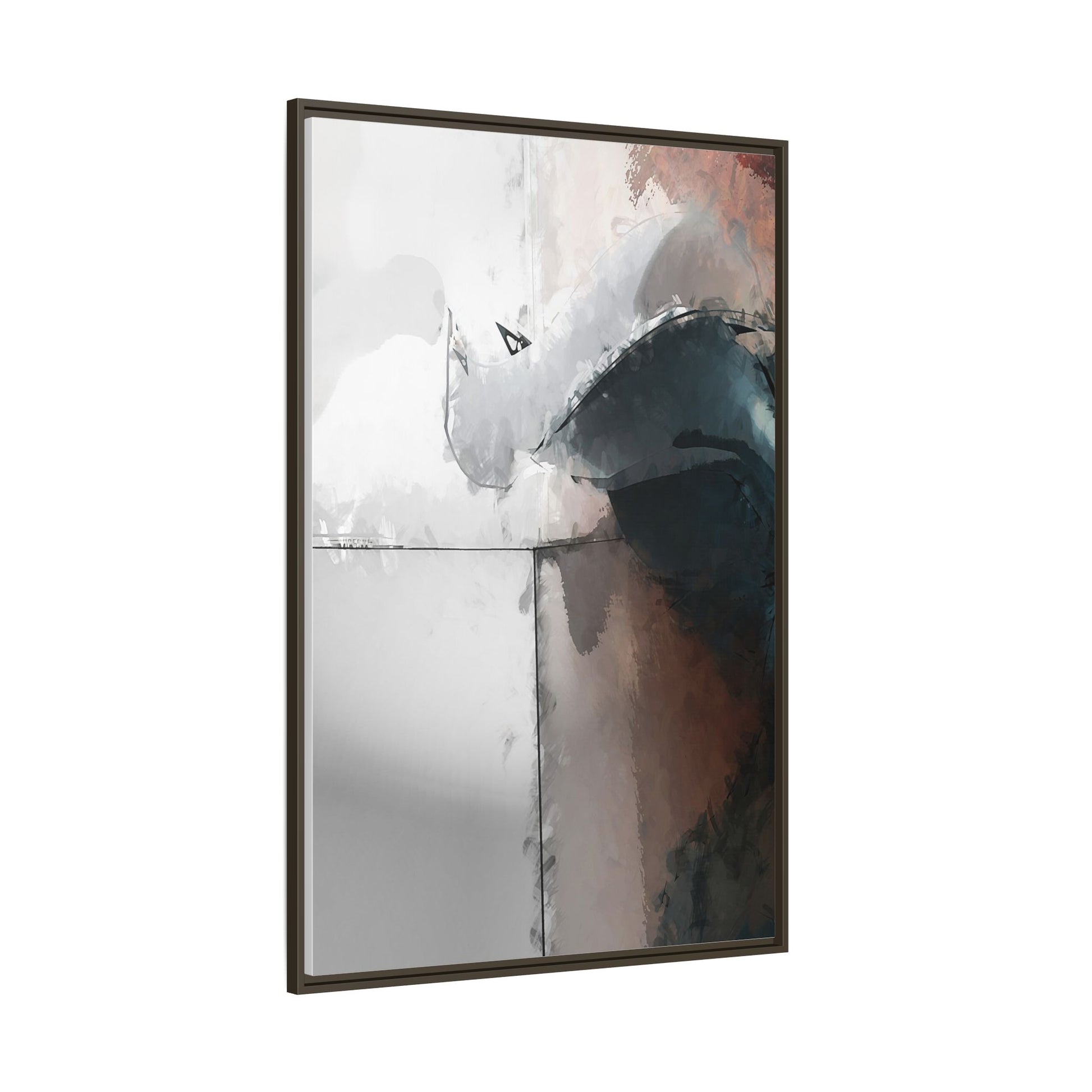 This abstract digital artwork features a minimalist, geometric composition with soft, blended colors ranging from cool grays to warm earth tones. The image is divided by sharp vertical lines, creating a segmented visual landscape with an ethereal, dreamlike quality. Subtle brushstrokes and watercolor-like textures give the piece a fluid, organic feel despite its angular structure. Darker blue-gray shapes dominate the lower right portion of the image, creating a sense of depth and contrast against the lighter background. The overall style suggests a modern, conceptual approach to digital painting, blending architectural elements with abstract expressionism.