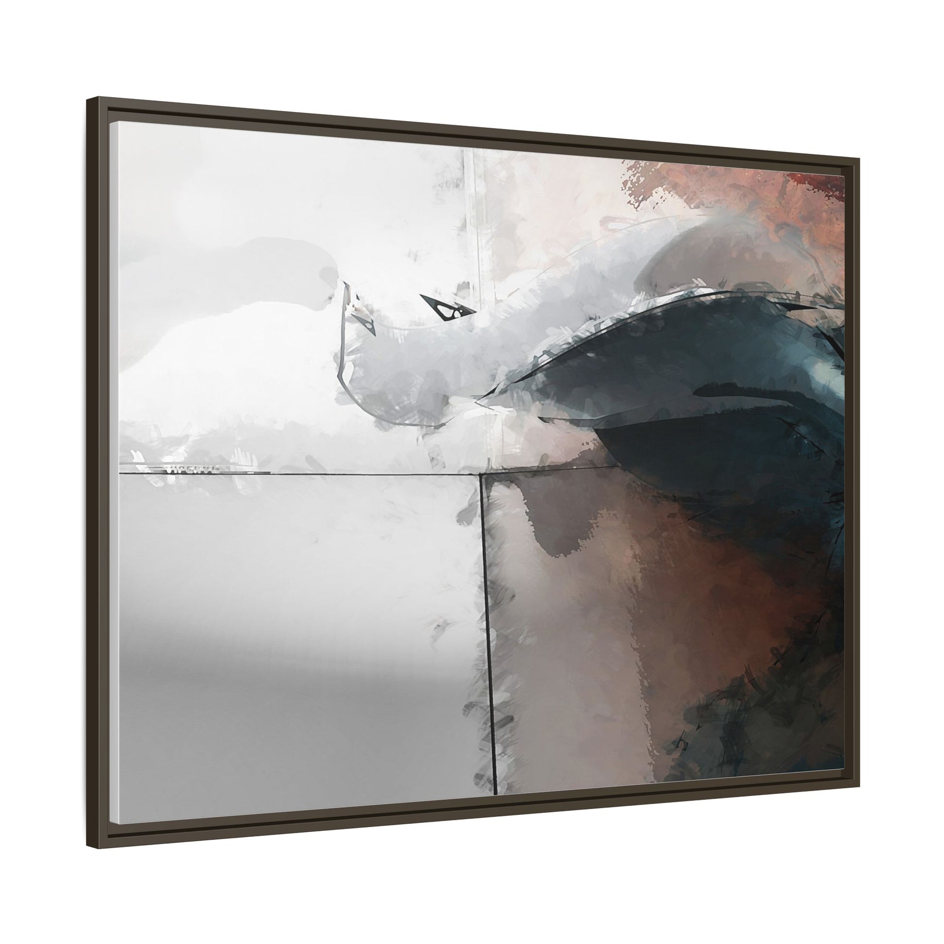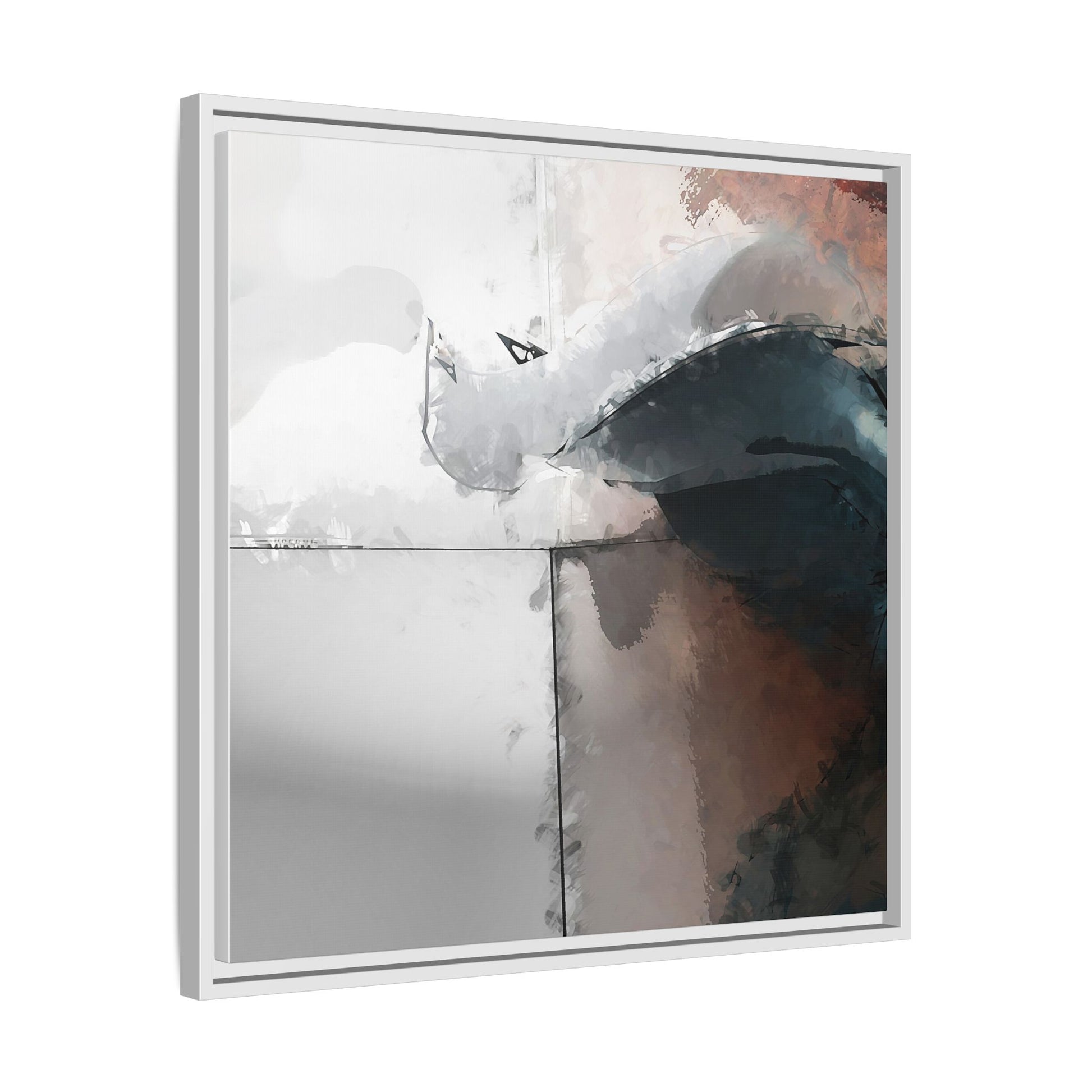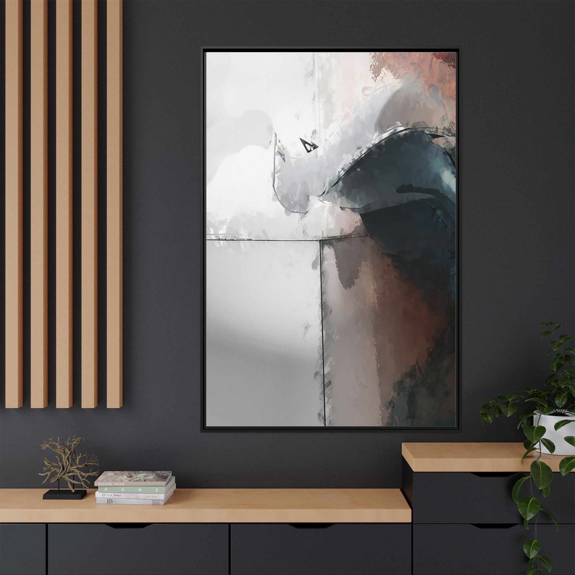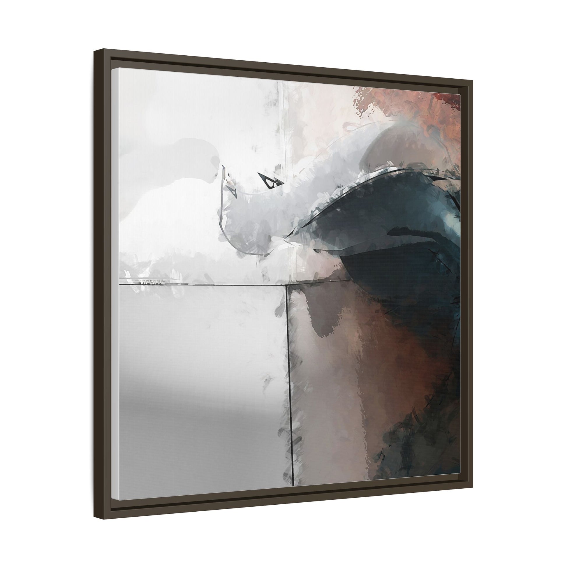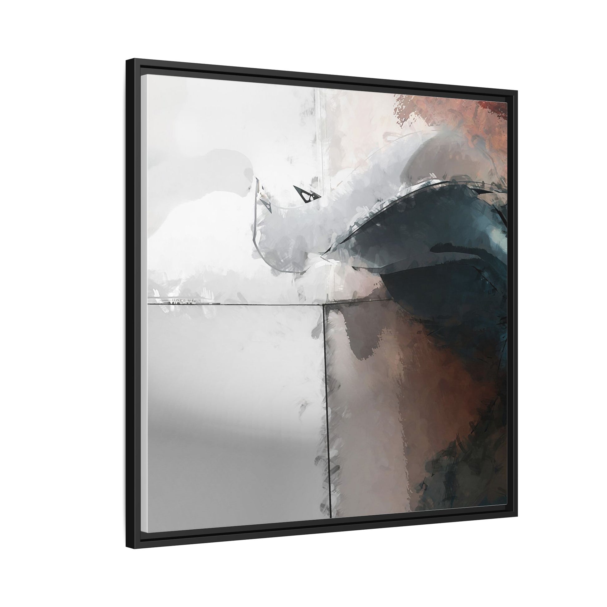 This abstract digital artwork features a minimalist, geometric composition with soft, blended colors ranging from cool grays to warm earth tones. The image is divided by sharp vertical lines, creating a segmented visual landscape with an ethereal, dreamlike quality. Subtle brushstrokes and watercolor-like textures give the piece a fluid, organic feel despite its angular structure. Darker blue-gray shapes dominate the lower right portion of the image, creating a sense of depth and contrast against the lighter background. The overall style suggests a modern, conceptual approach to digital painting, blending architectural elements with abstract expressionism.