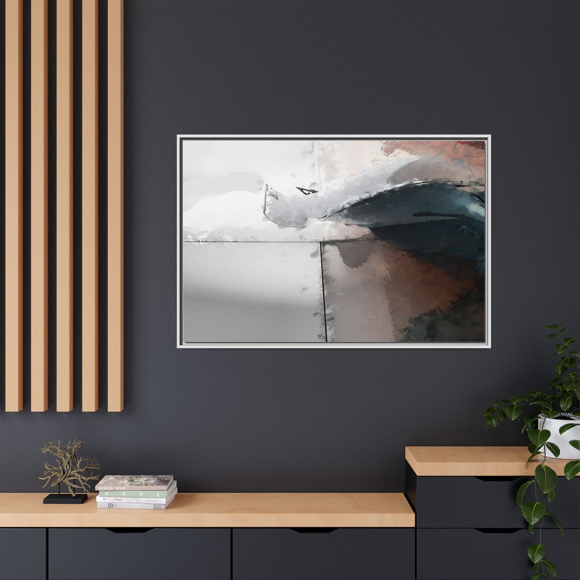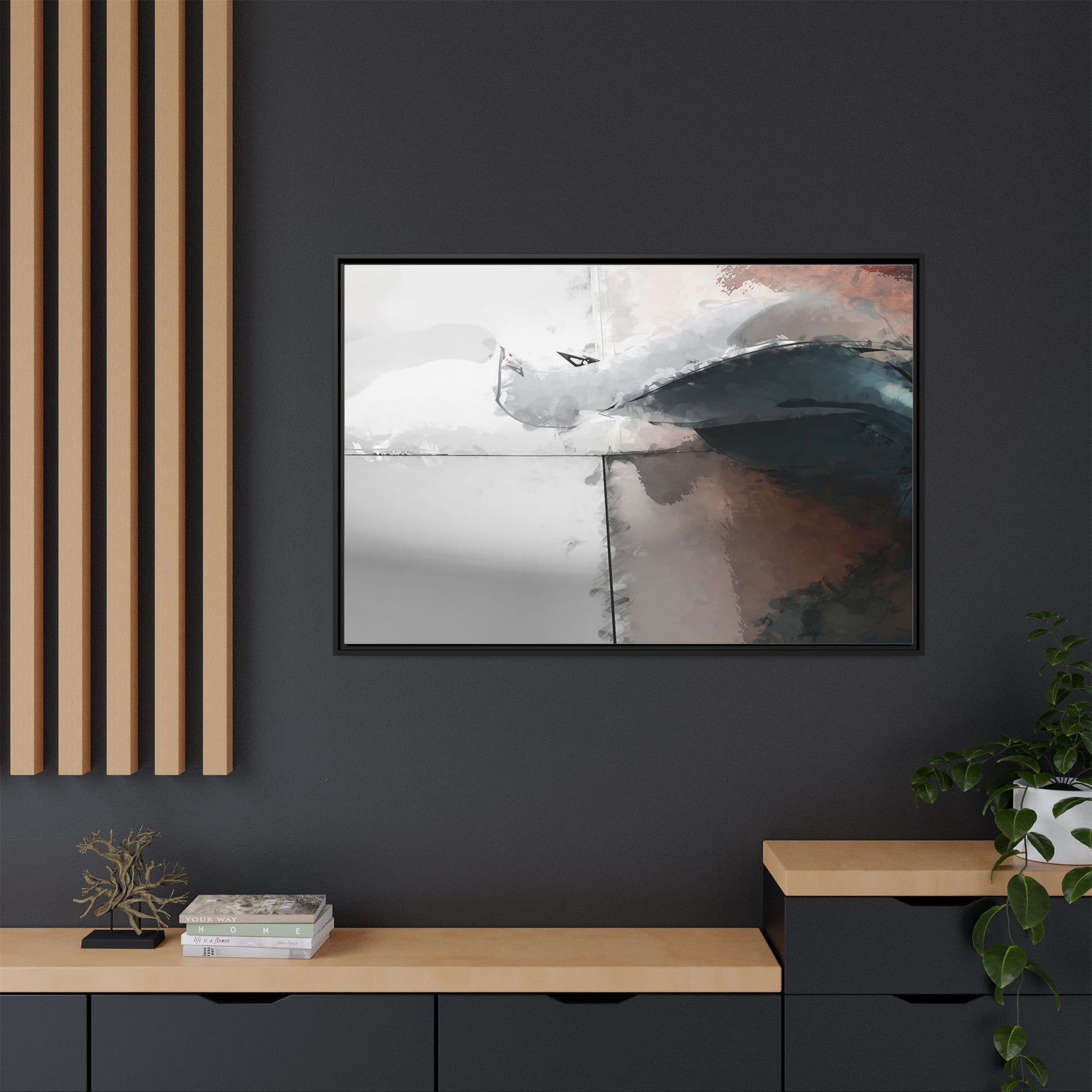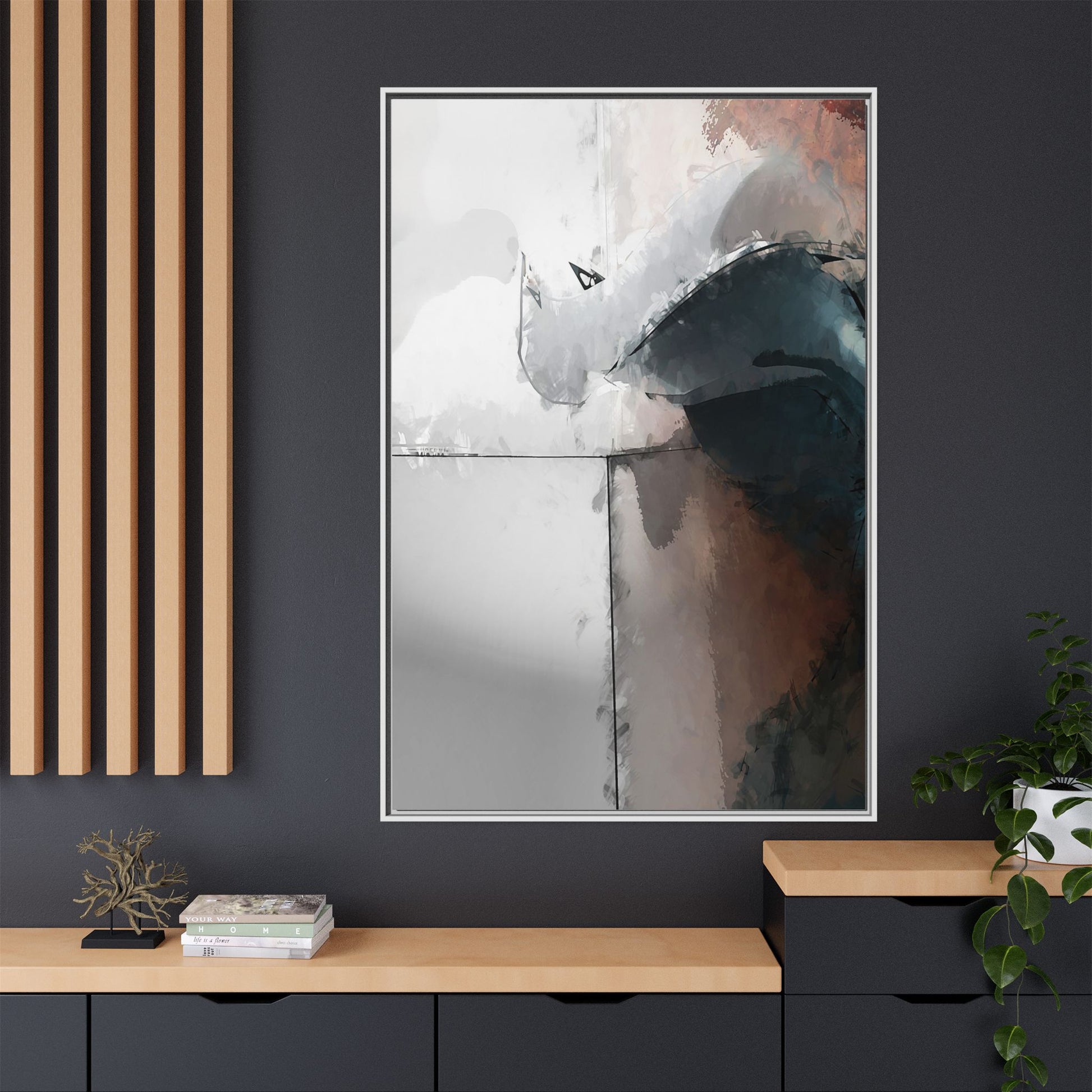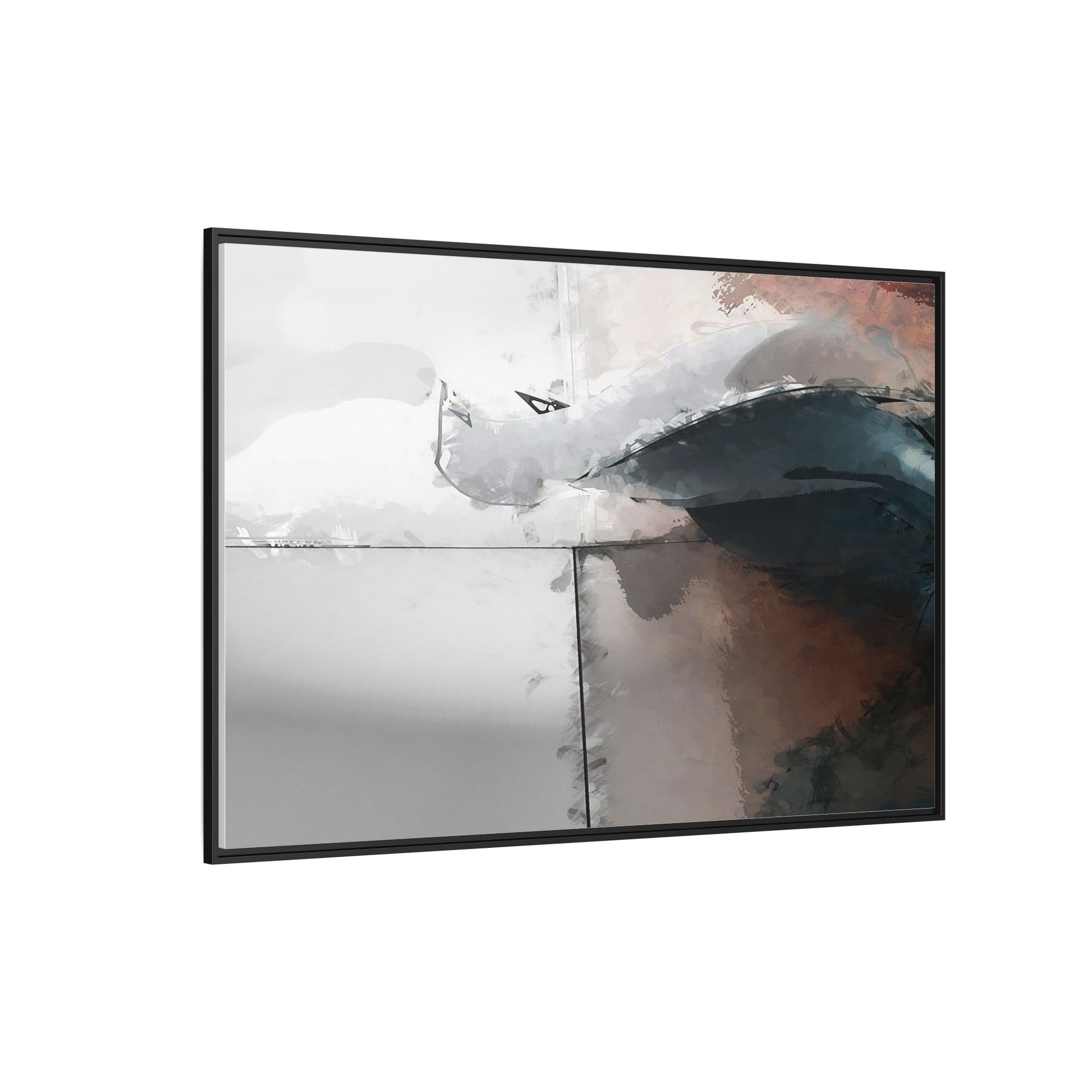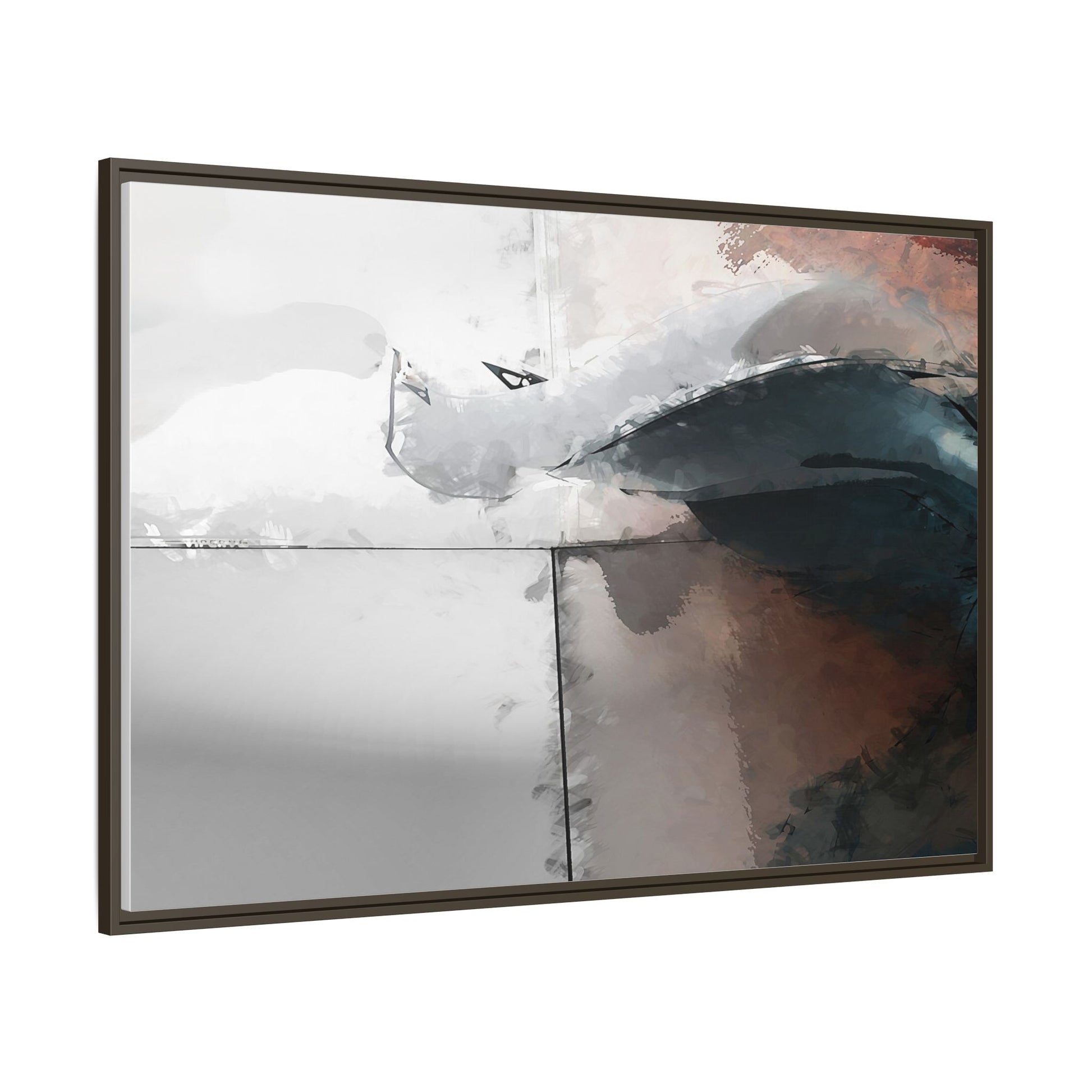 This abstract digital artwork features a minimalist, geometric composition with soft, blended colors ranging from cool grays to warm earth tones. The image is divided by sharp vertical lines, creating a segmented visual landscape with an ethereal, dreamlike quality. Subtle brushstrokes and watercolor-like textures give the piece a fluid, organic feel despite its angular structure. Darker blue-gray shapes dominate the lower right portion of the image, creating a sense of depth and contrast against the lighter background. The overall style suggests a modern, conceptual approach to digital painting, blending architectural elements with abstract expressionism.