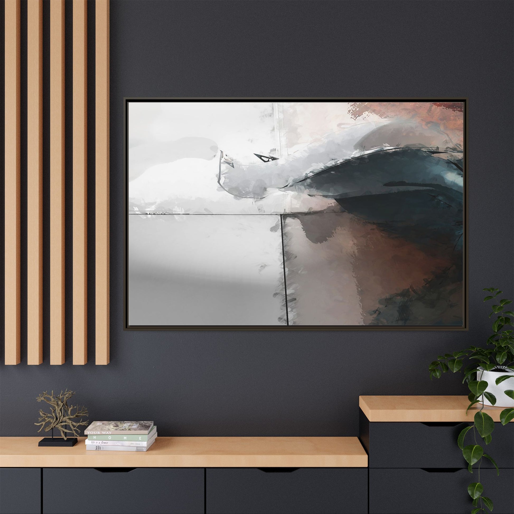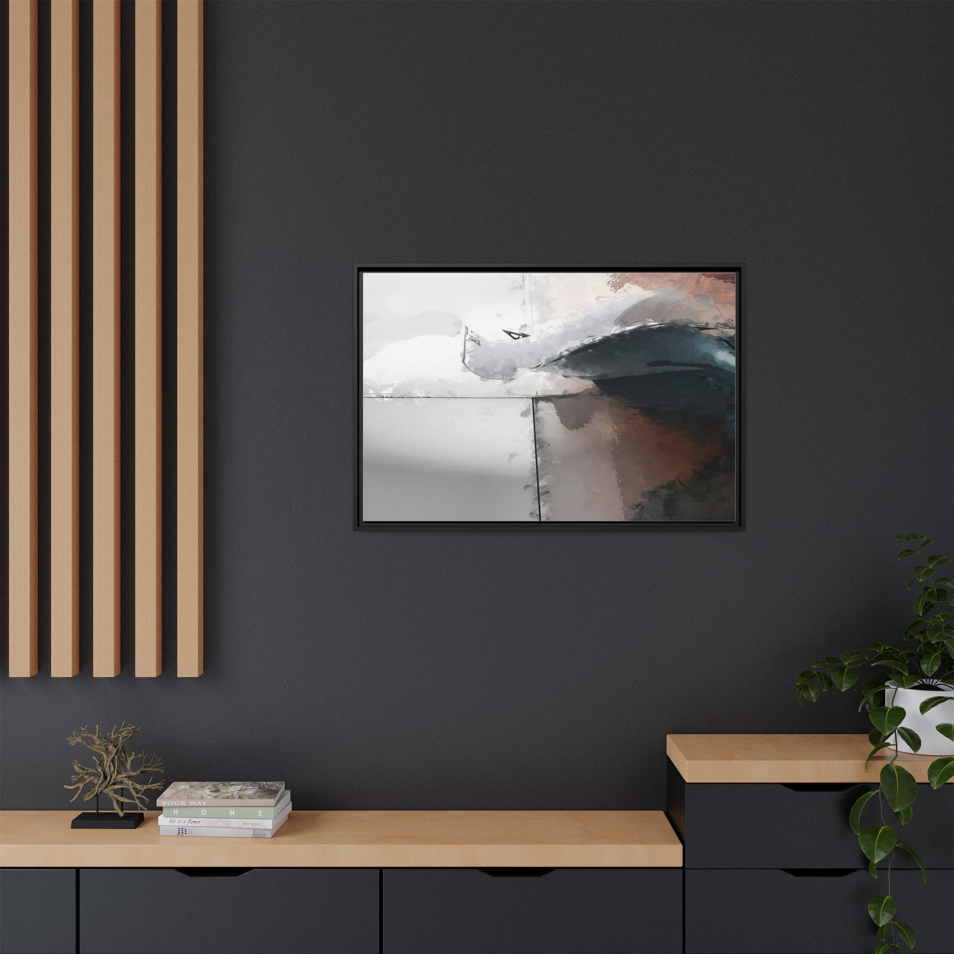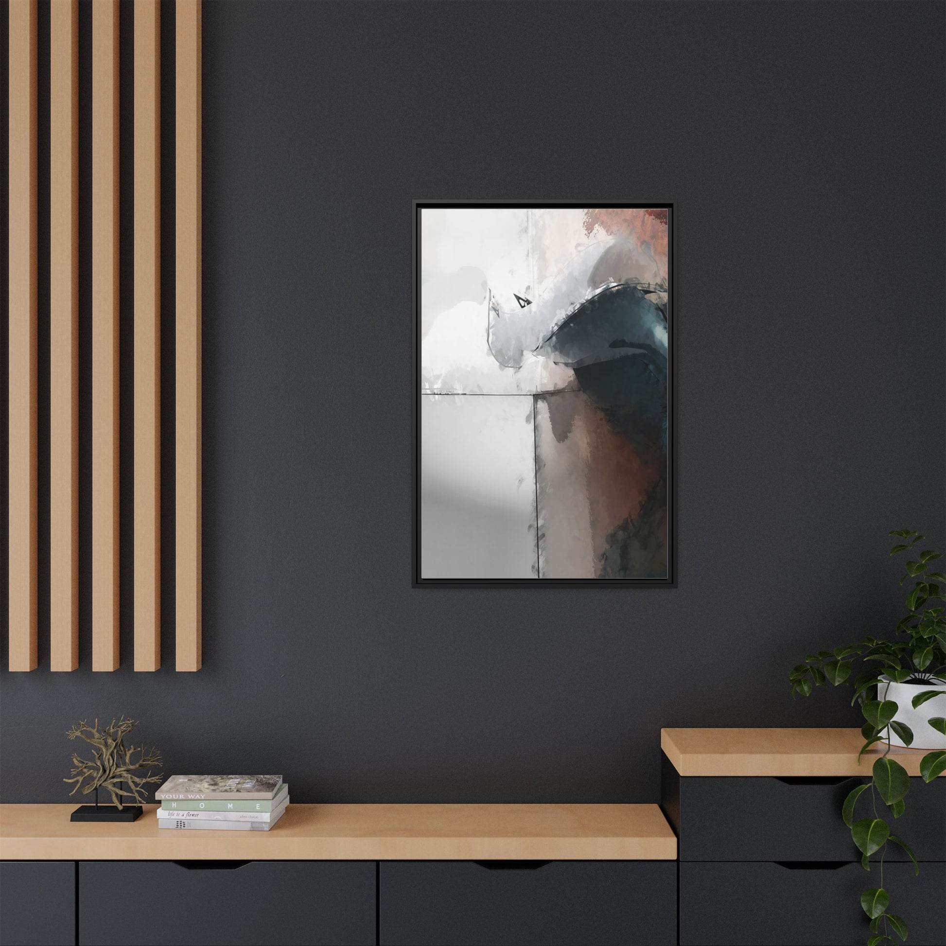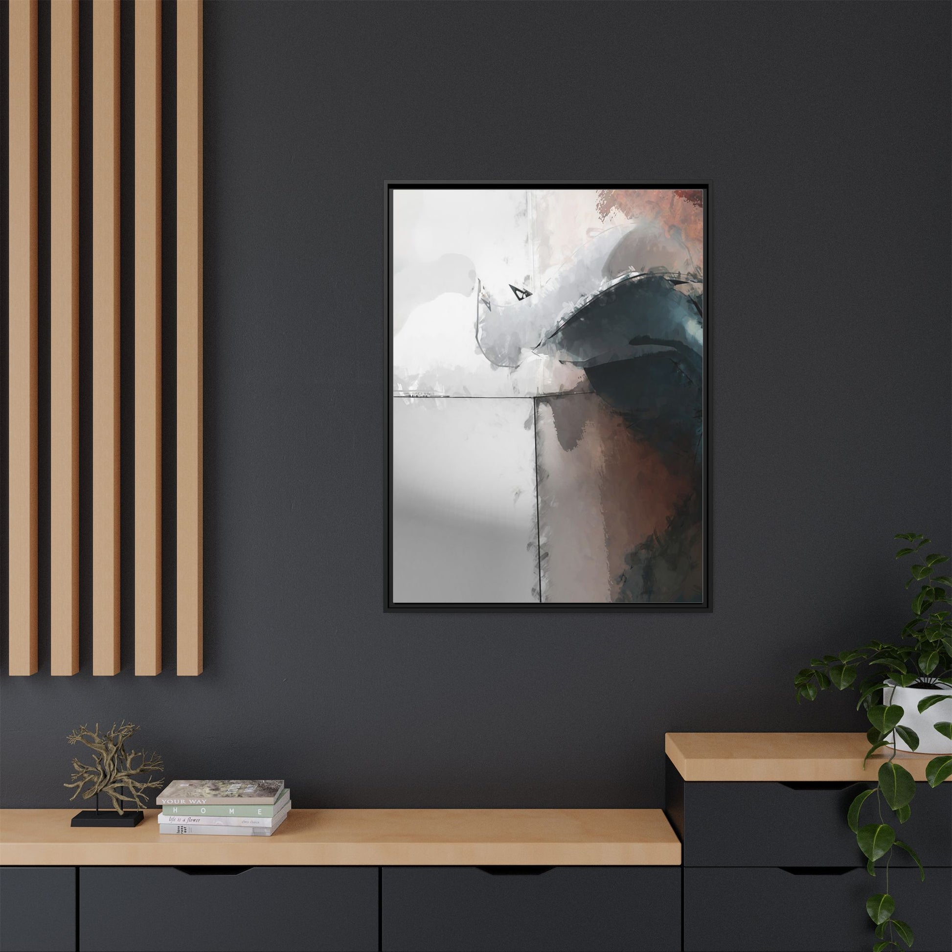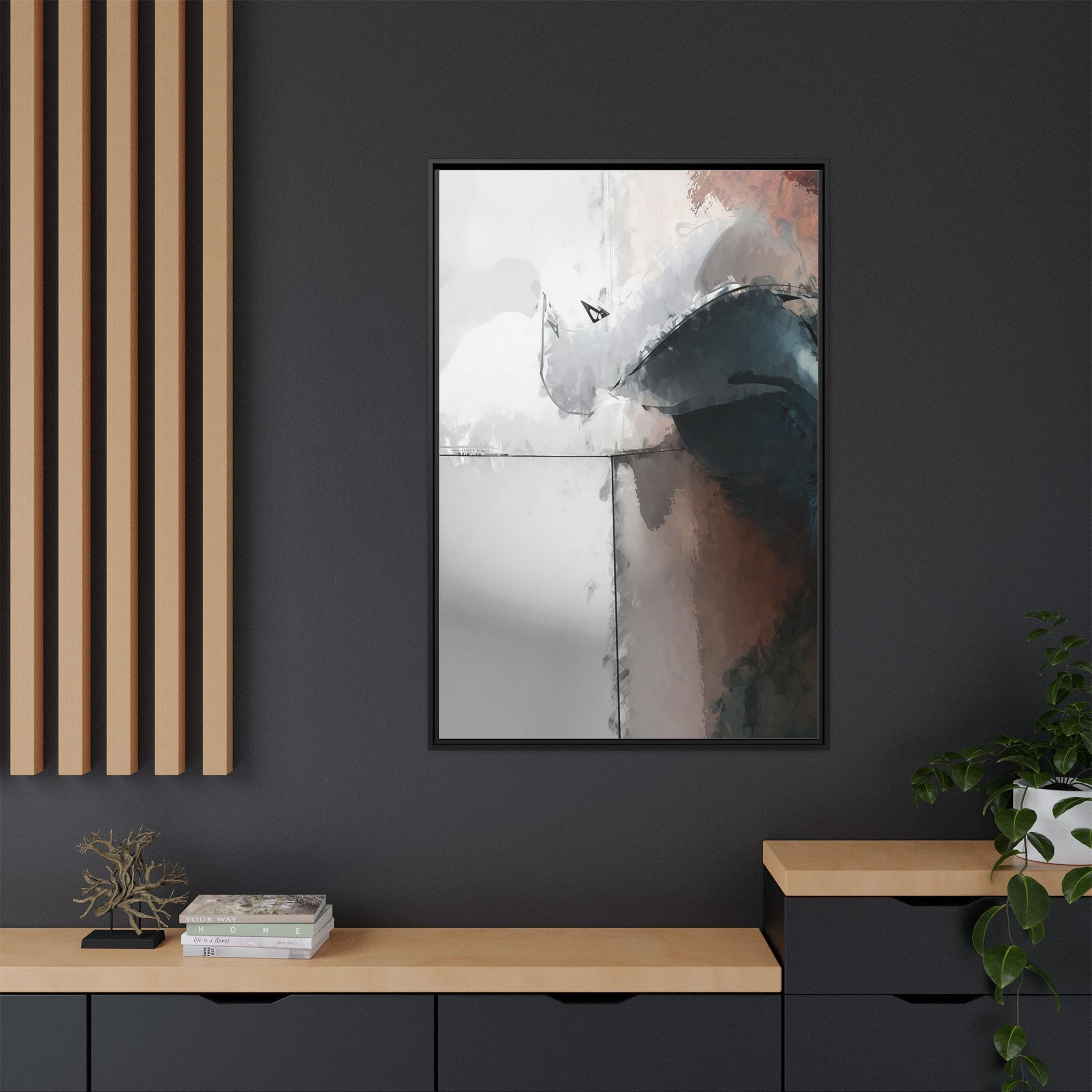 This abstract digital artwork features a minimalist, geometric composition with soft, blended colors ranging from cool grays to warm earth tones. The image is divided by sharp vertical lines, creating a segmented visual landscape with an ethereal, dreamlike quality. Subtle brushstrokes and watercolor-like textures give the piece a fluid, organic feel despite its angular structure. Darker blue-gray shapes dominate the lower right portion of the image, creating a sense of depth and contrast against the lighter background. The overall style suggests a modern, conceptual approach to digital painting, blending architectural elements with abstract expressionism.