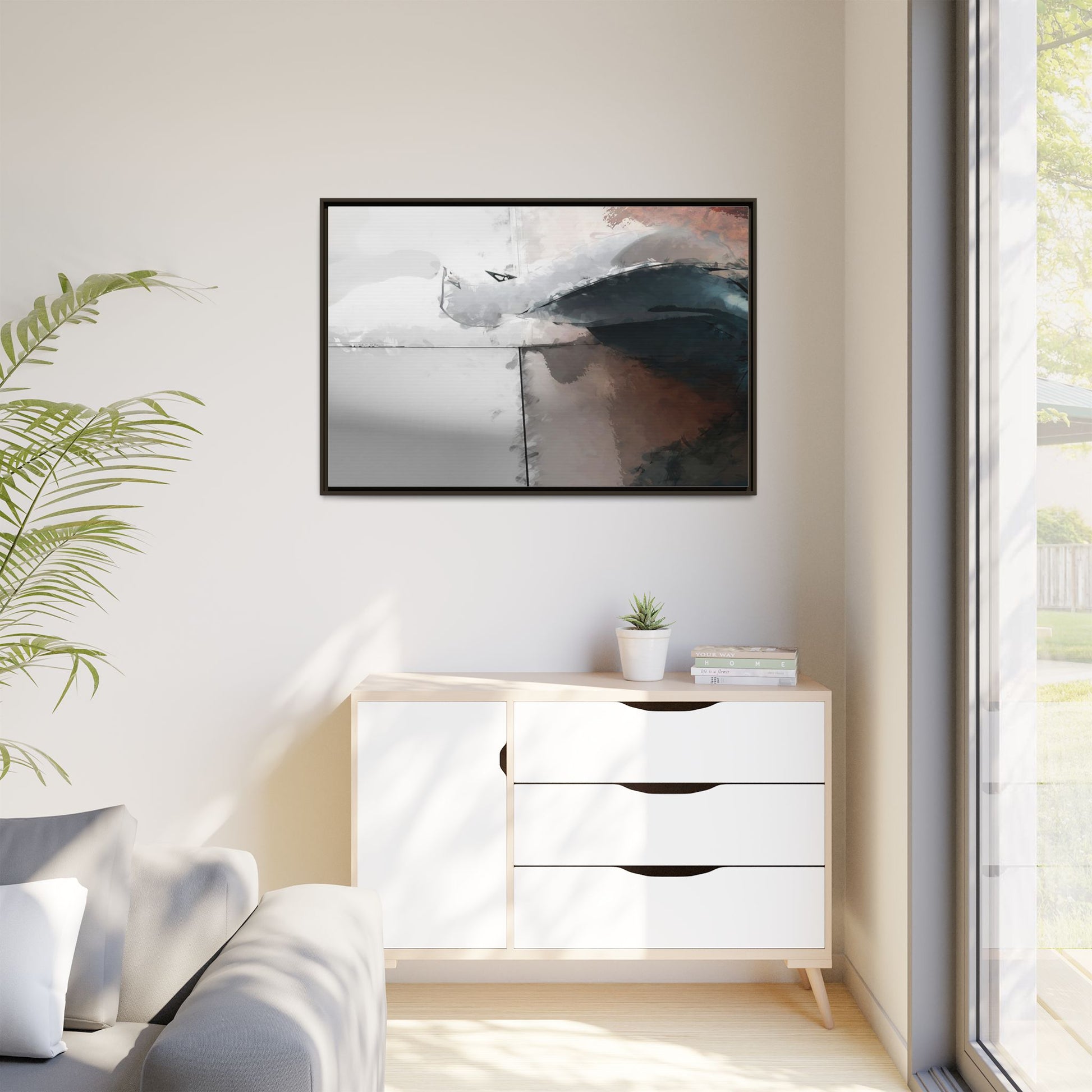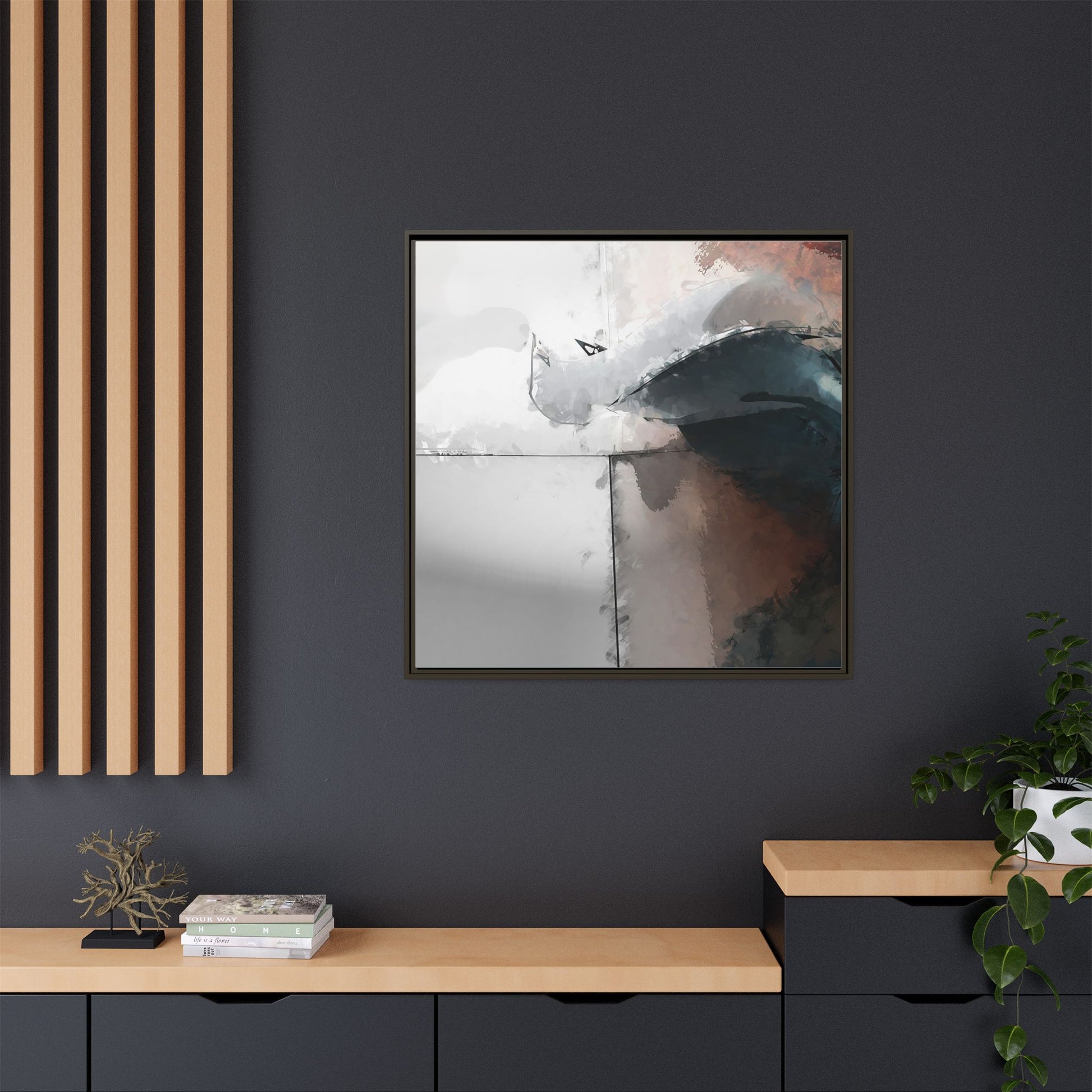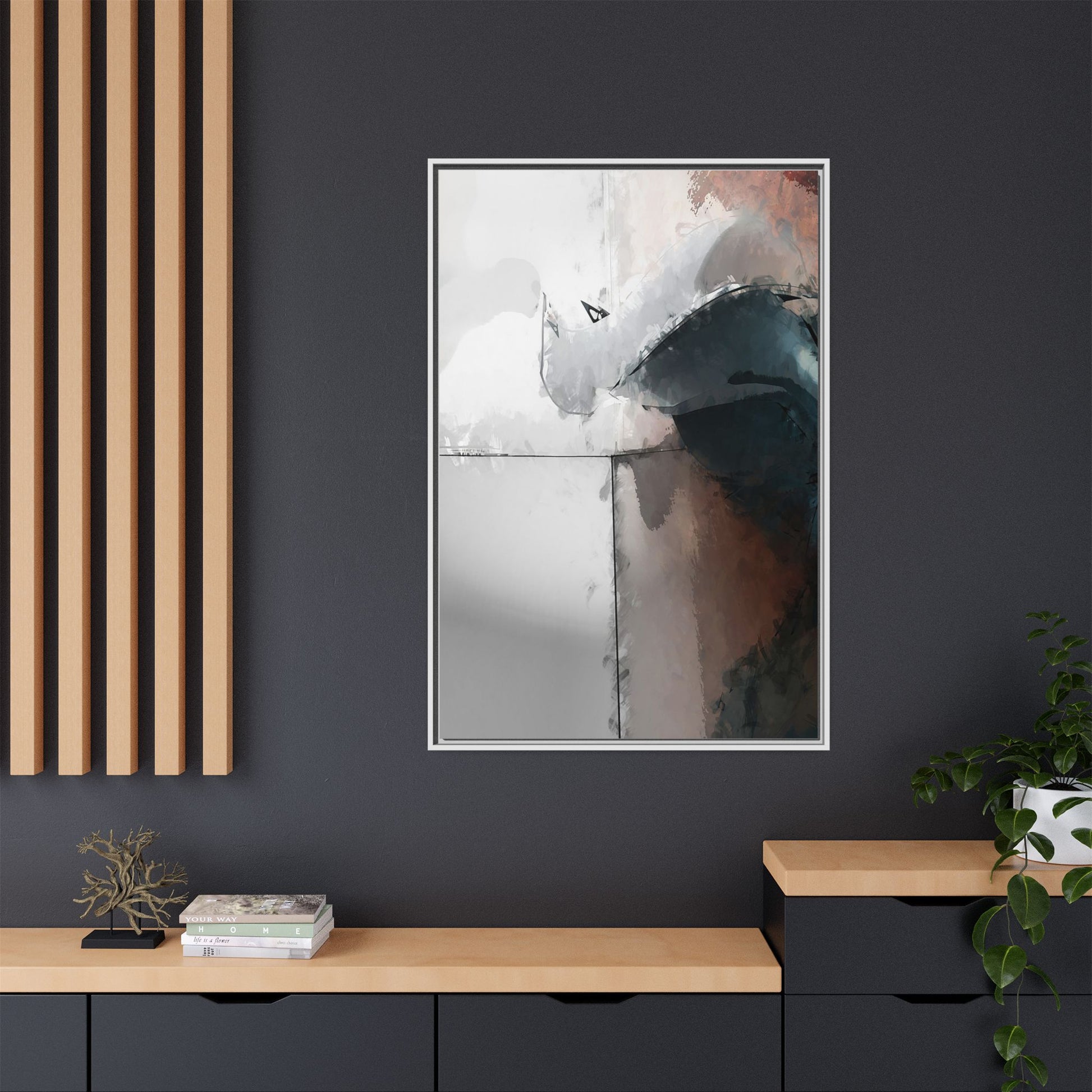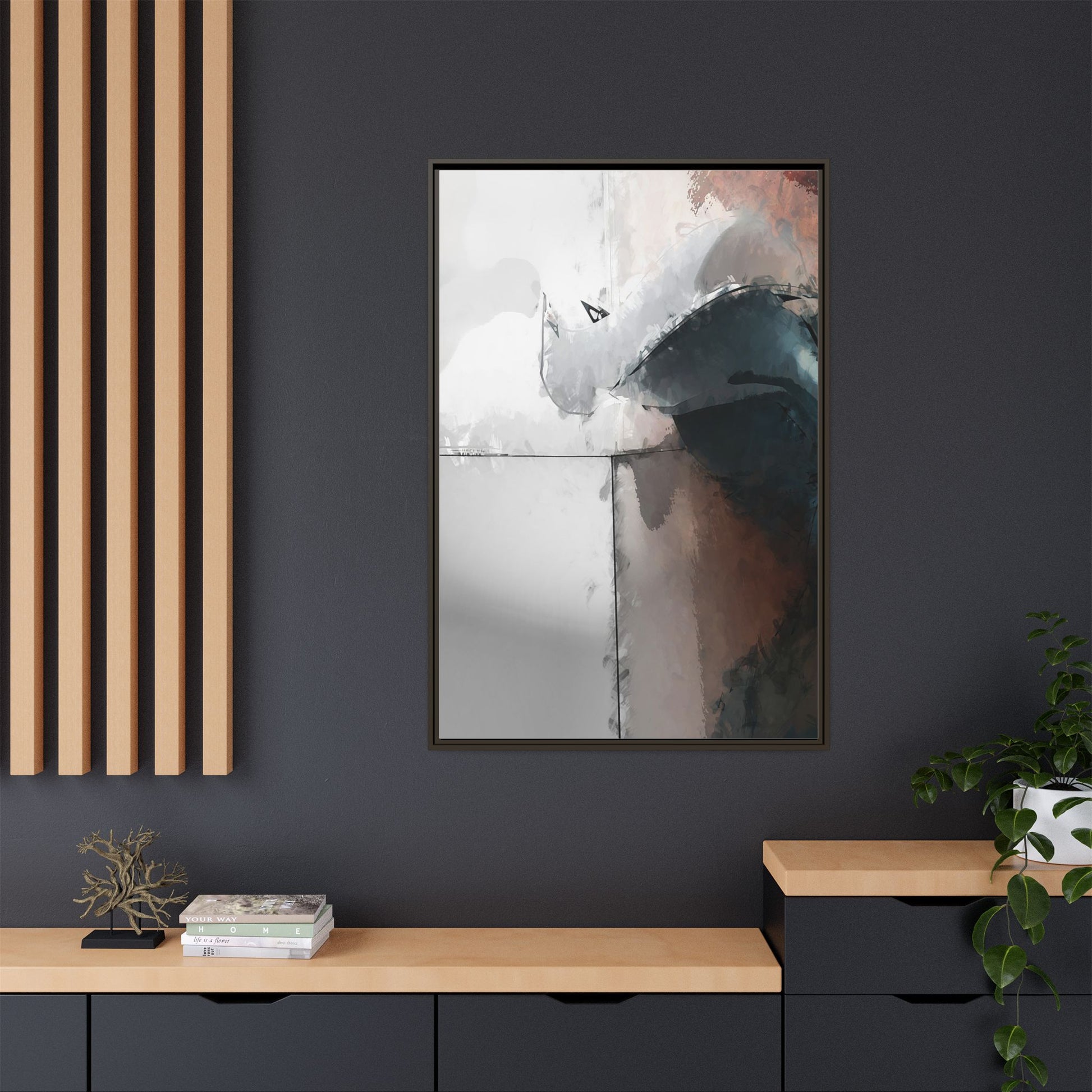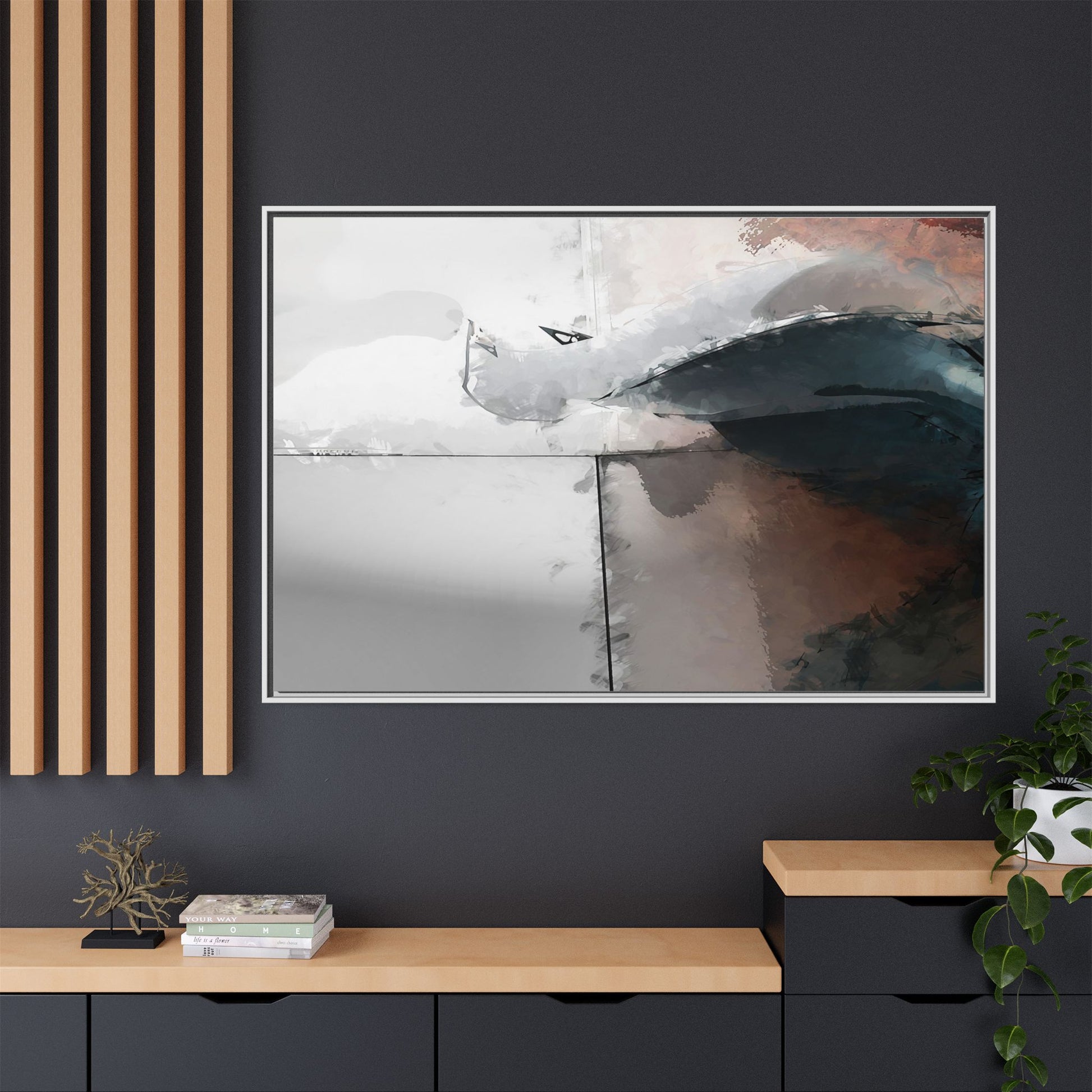 This abstract digital artwork features a minimalist, geometric composition with soft, blended colors ranging from cool grays to warm earth tones. The image is divided by sharp vertical lines, creating a segmented visual landscape with an ethereal, dreamlike quality. Subtle brushstrokes and watercolor-like textures give the piece a fluid, organic feel despite its angular structure. Darker blue-gray shapes dominate the lower right portion of the image, creating a sense of depth and contrast against the lighter background. The overall style suggests a modern, conceptual approach to digital painting, blending architectural elements with abstract expressionism.