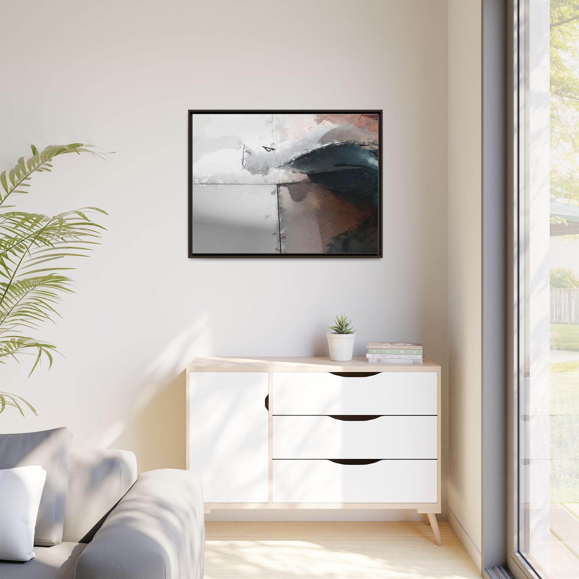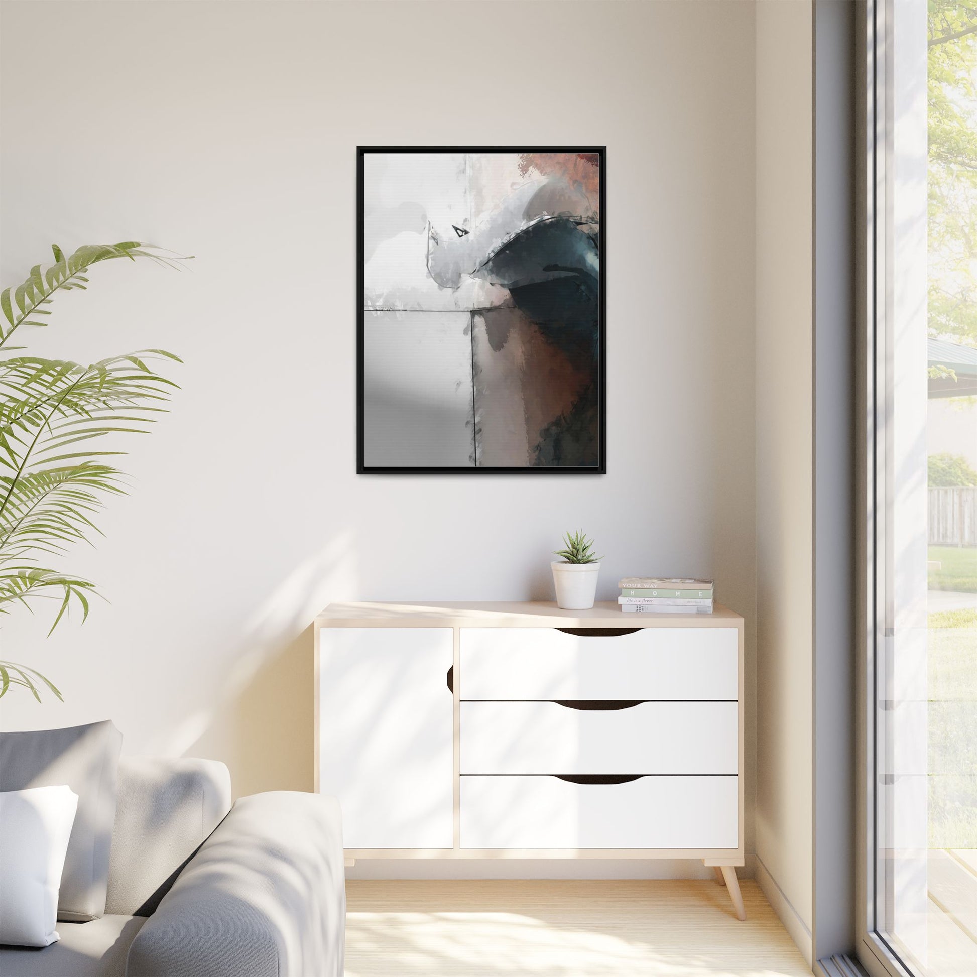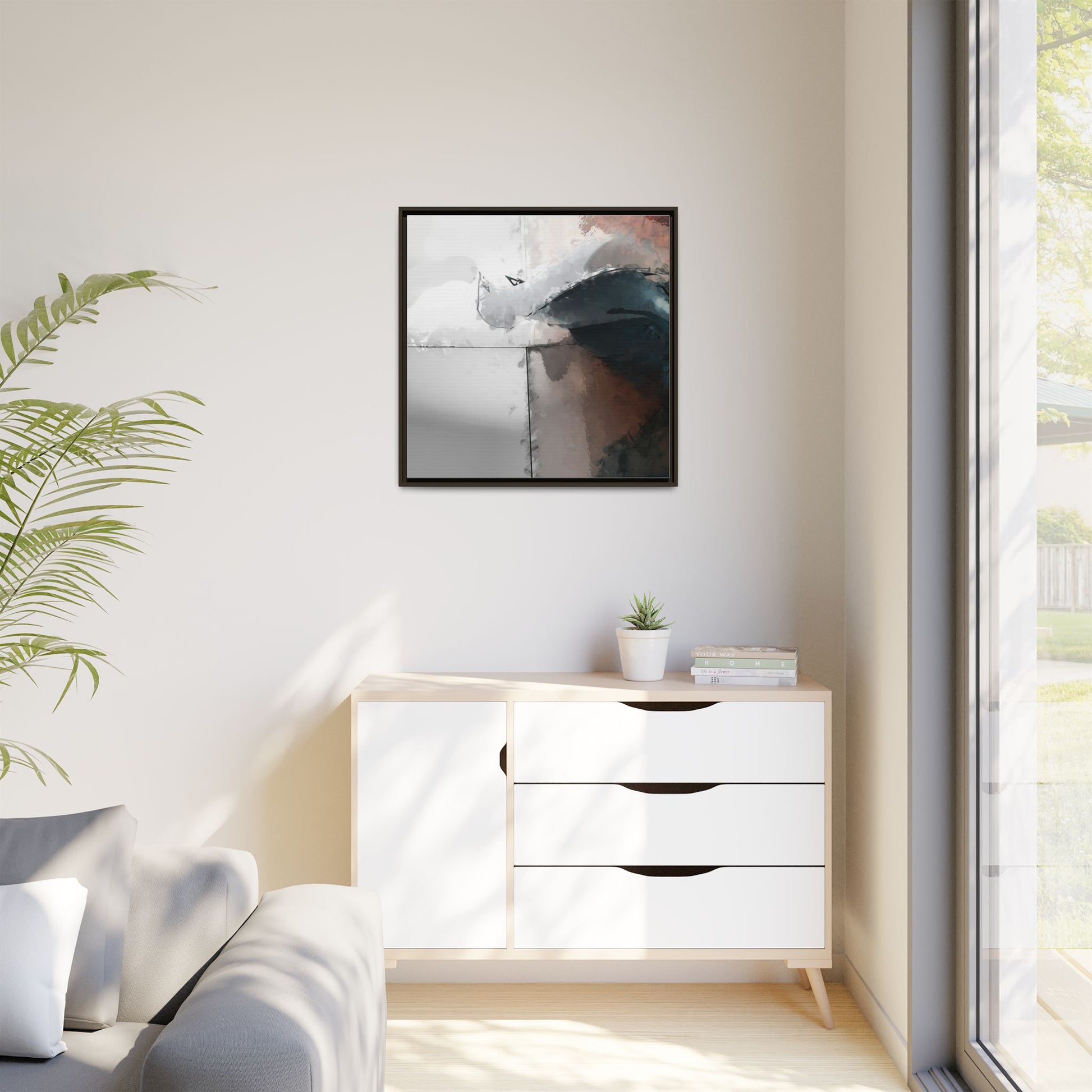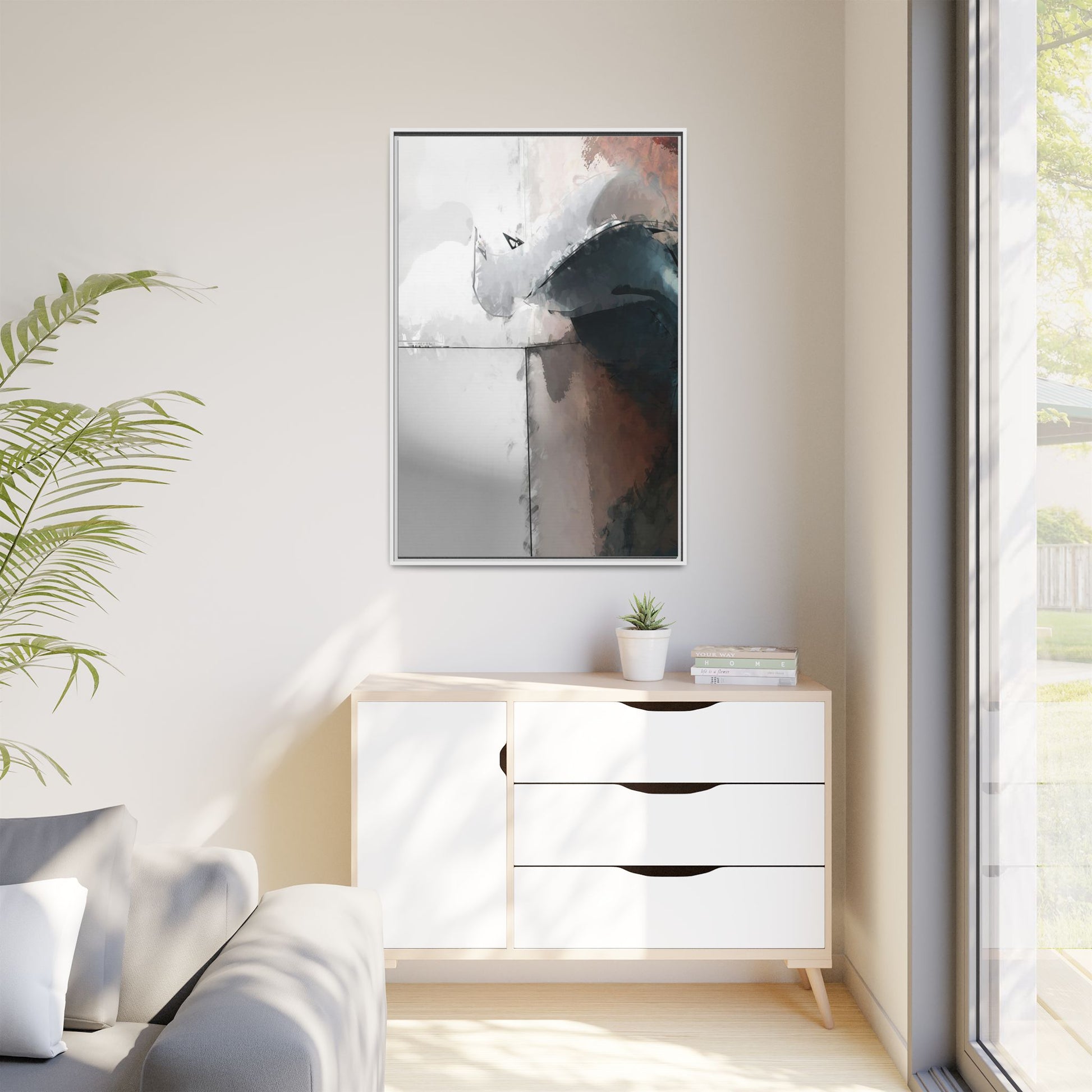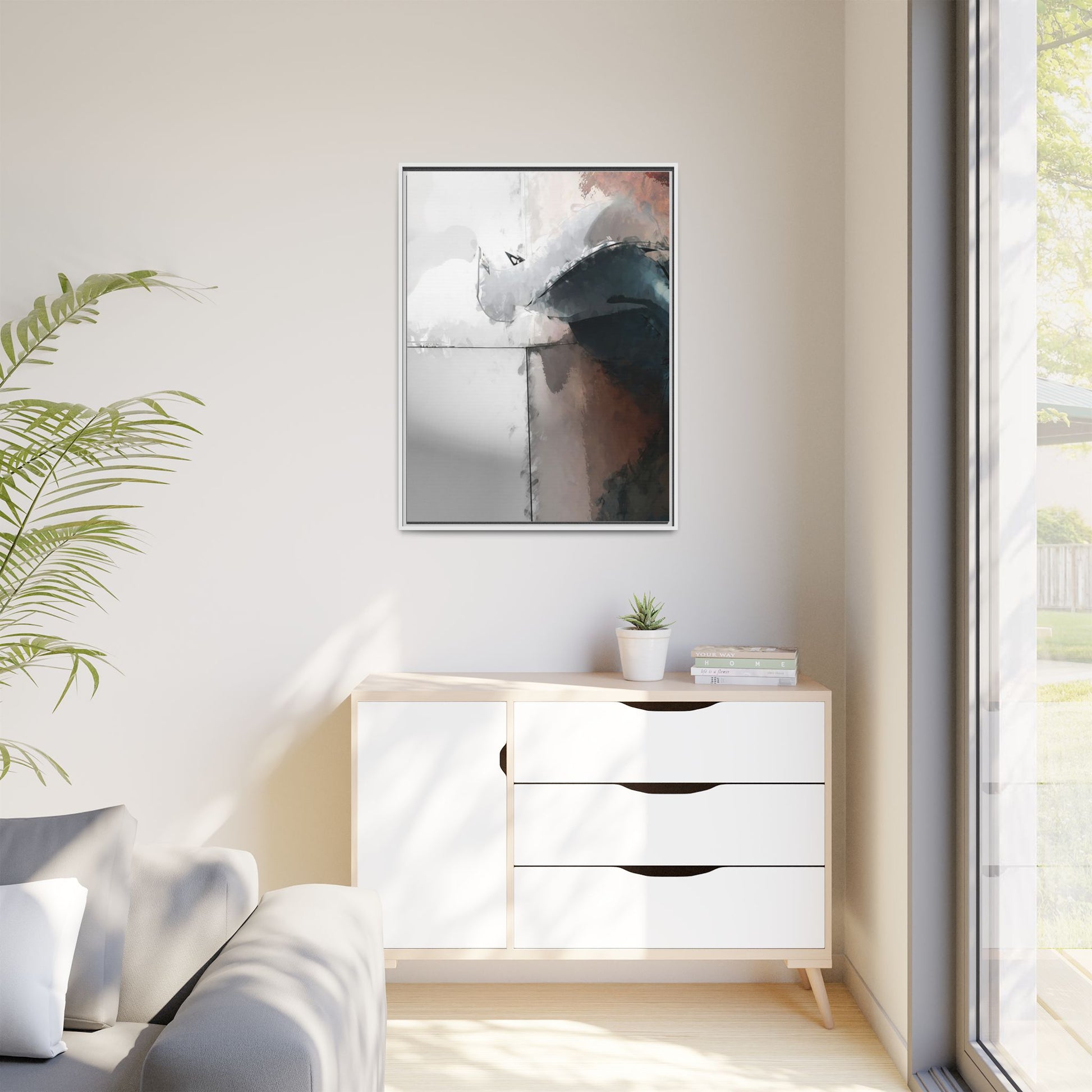 This abstract digital artwork features a minimalist, geometric composition with soft, blended colors ranging from cool grays to warm earth tones. The image is divided by sharp vertical lines, creating a segmented visual landscape with an ethereal, dreamlike quality. Subtle brushstrokes and watercolor-like textures give the piece a fluid, organic feel despite its angular structure. Darker blue-gray shapes dominate the lower right portion of the image, creating a sense of depth and contrast against the lighter background. The overall style suggests a modern, conceptual approach to digital painting, blending architectural elements with abstract expressionism.