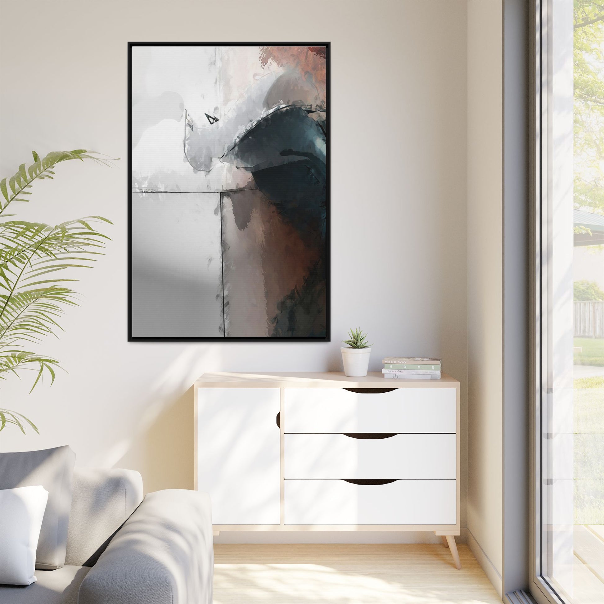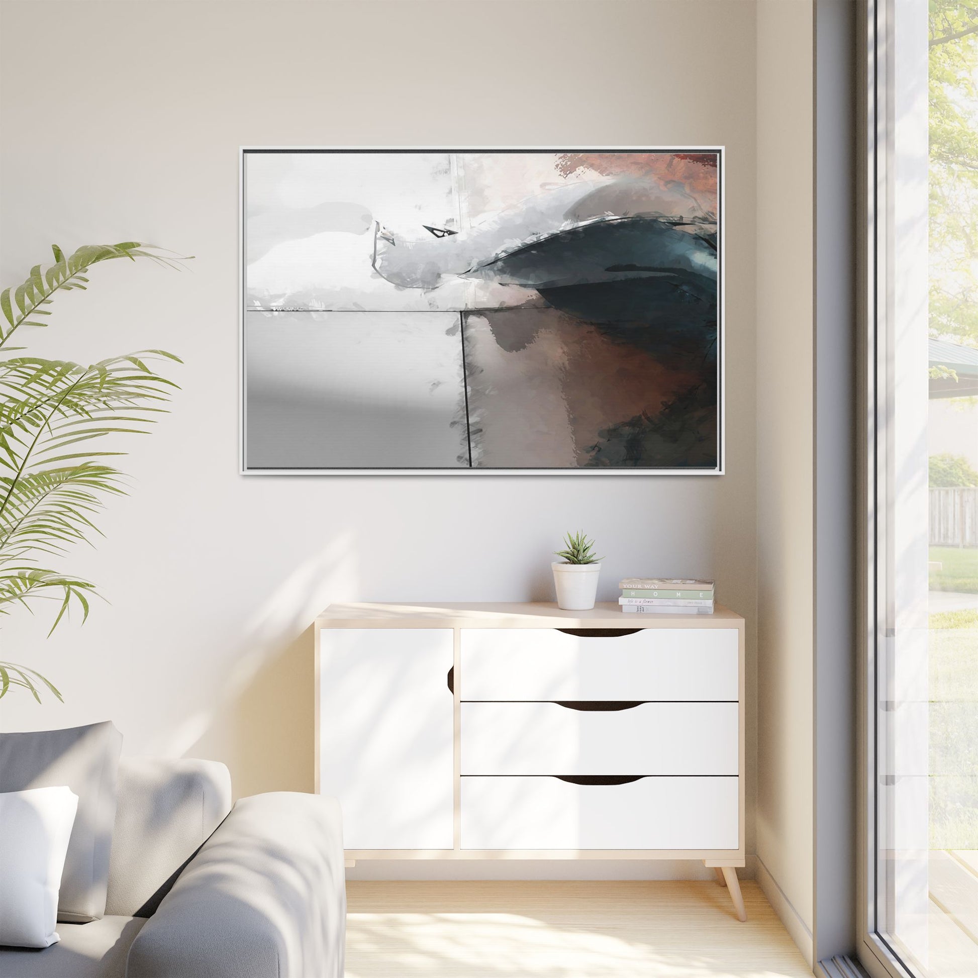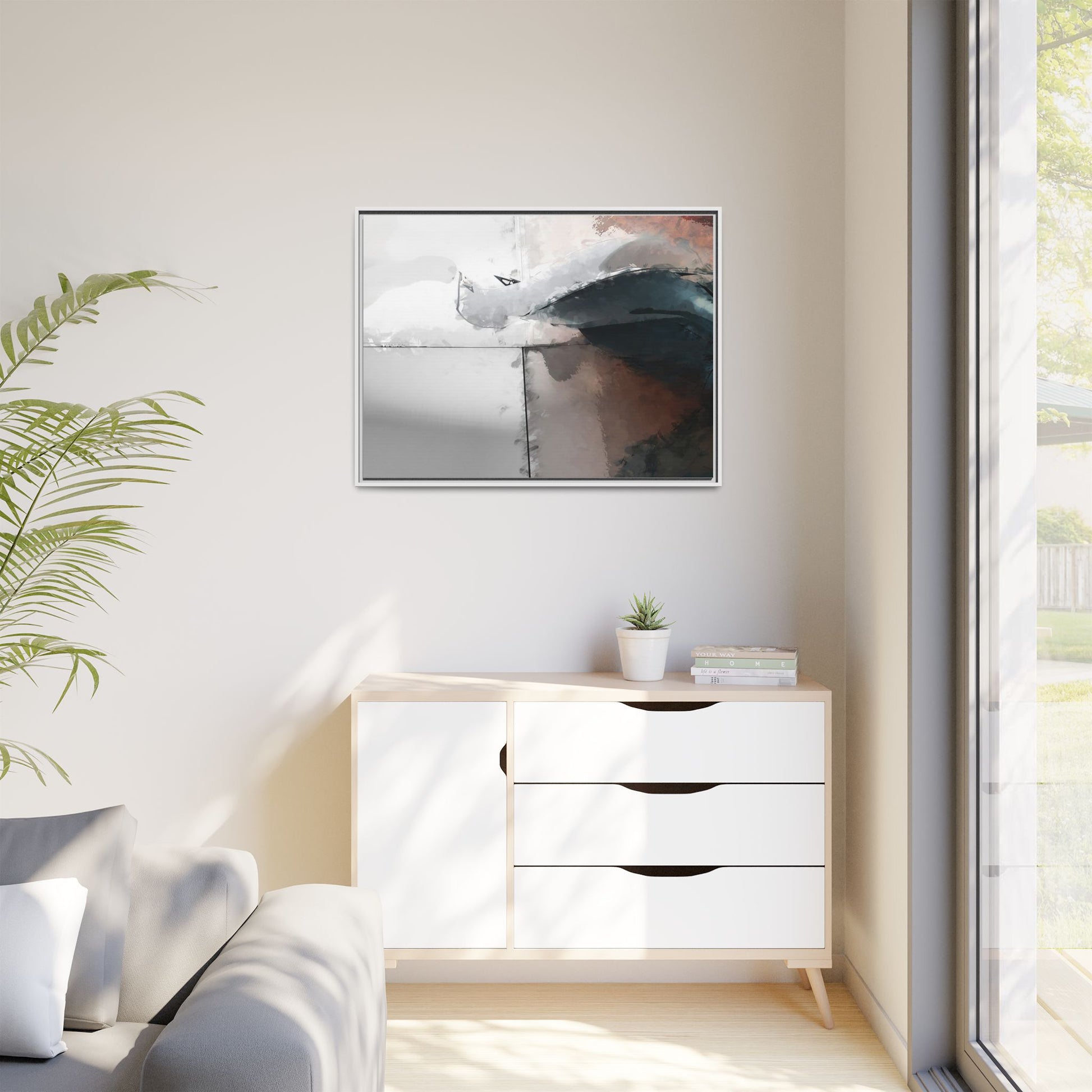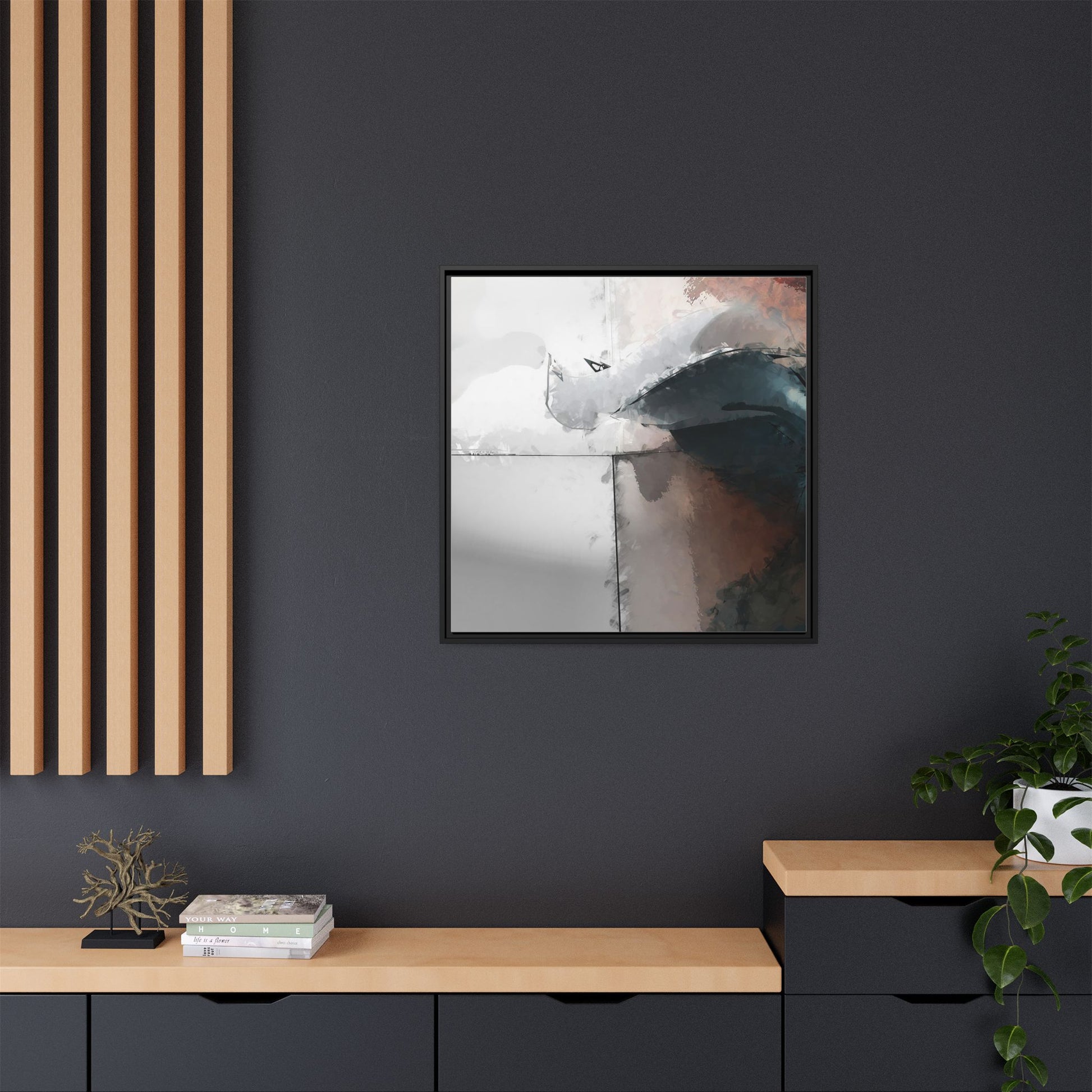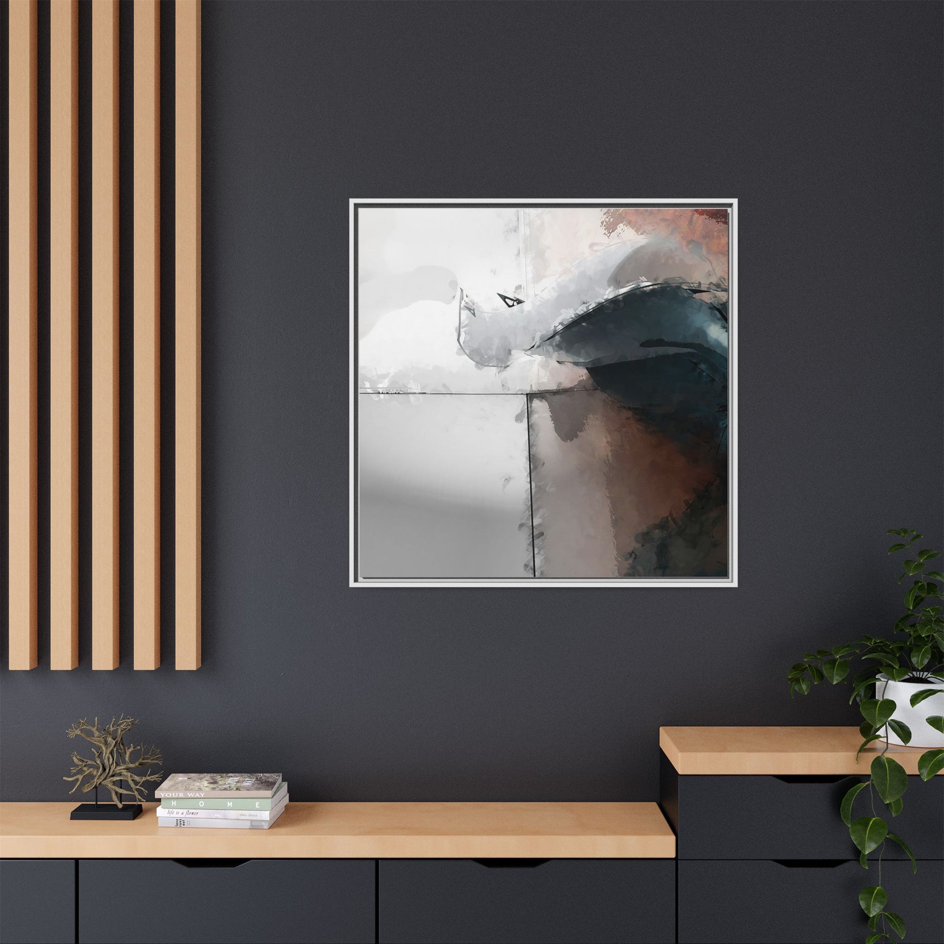 This abstract digital artwork features a minimalist, geometric composition with soft, blended colors ranging from cool grays to warm earth tones. The image is divided by sharp vertical lines, creating a segmented visual landscape with an ethereal, dreamlike quality. Subtle brushstrokes and watercolor-like textures give the piece a fluid, organic feel despite its angular structure. Darker blue-gray shapes dominate the lower right portion of the image, creating a sense of depth and contrast against the lighter background. The overall style suggests a modern, conceptual approach to digital painting, blending architectural elements with abstract expressionism.