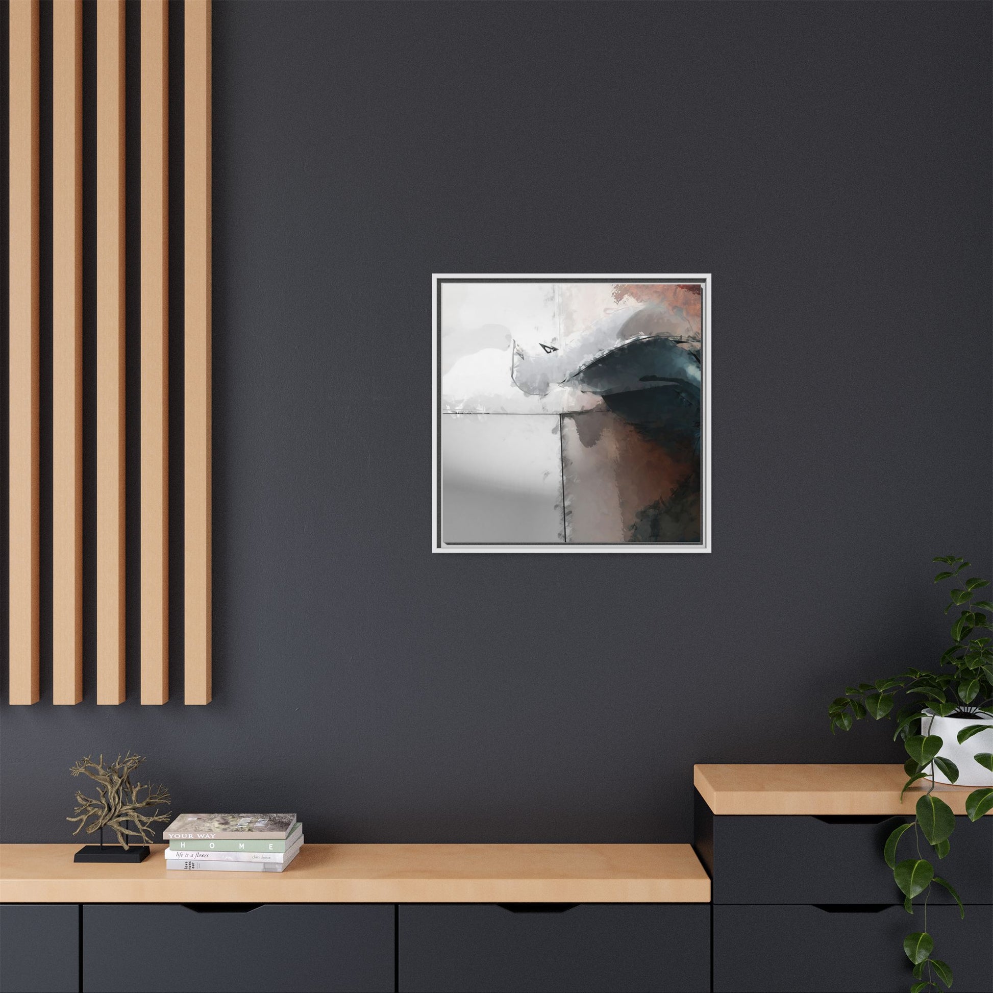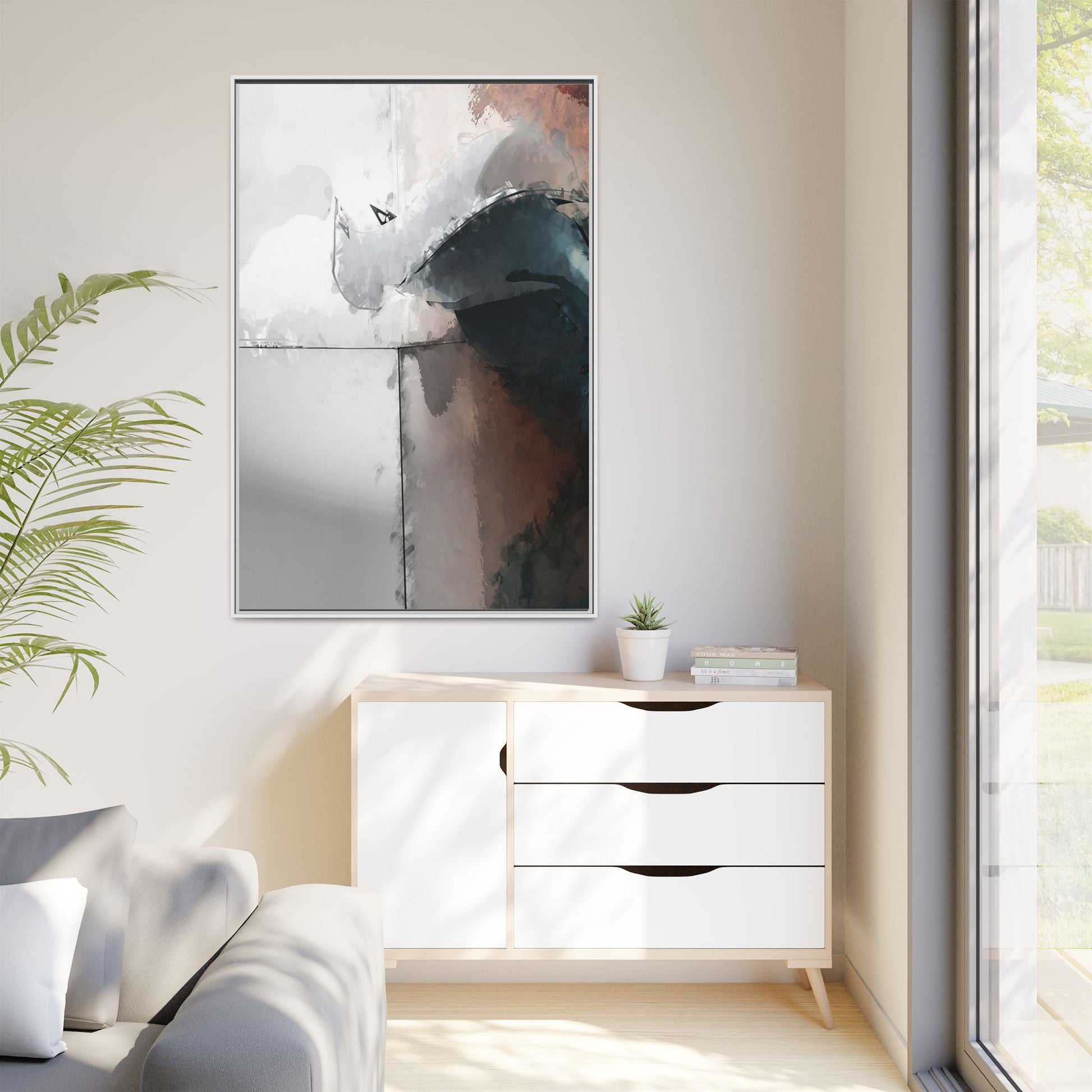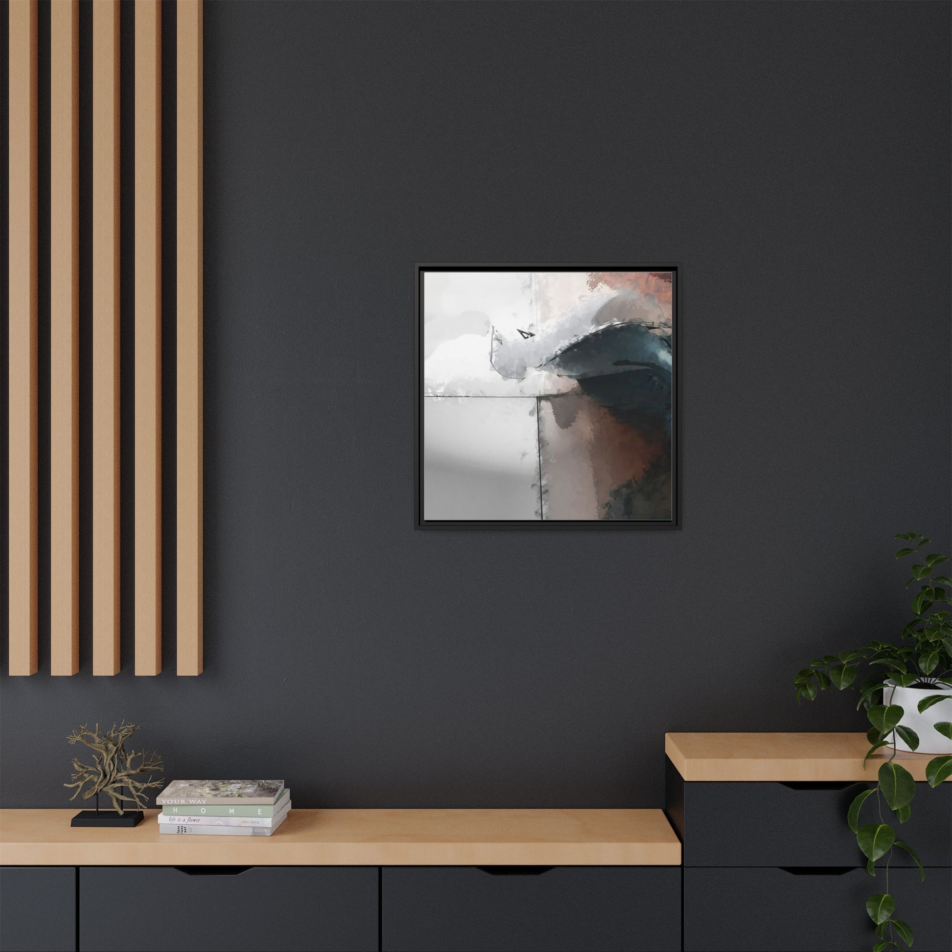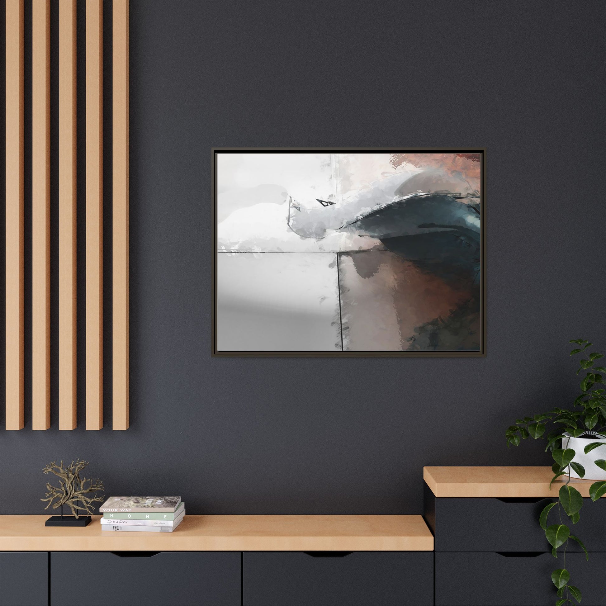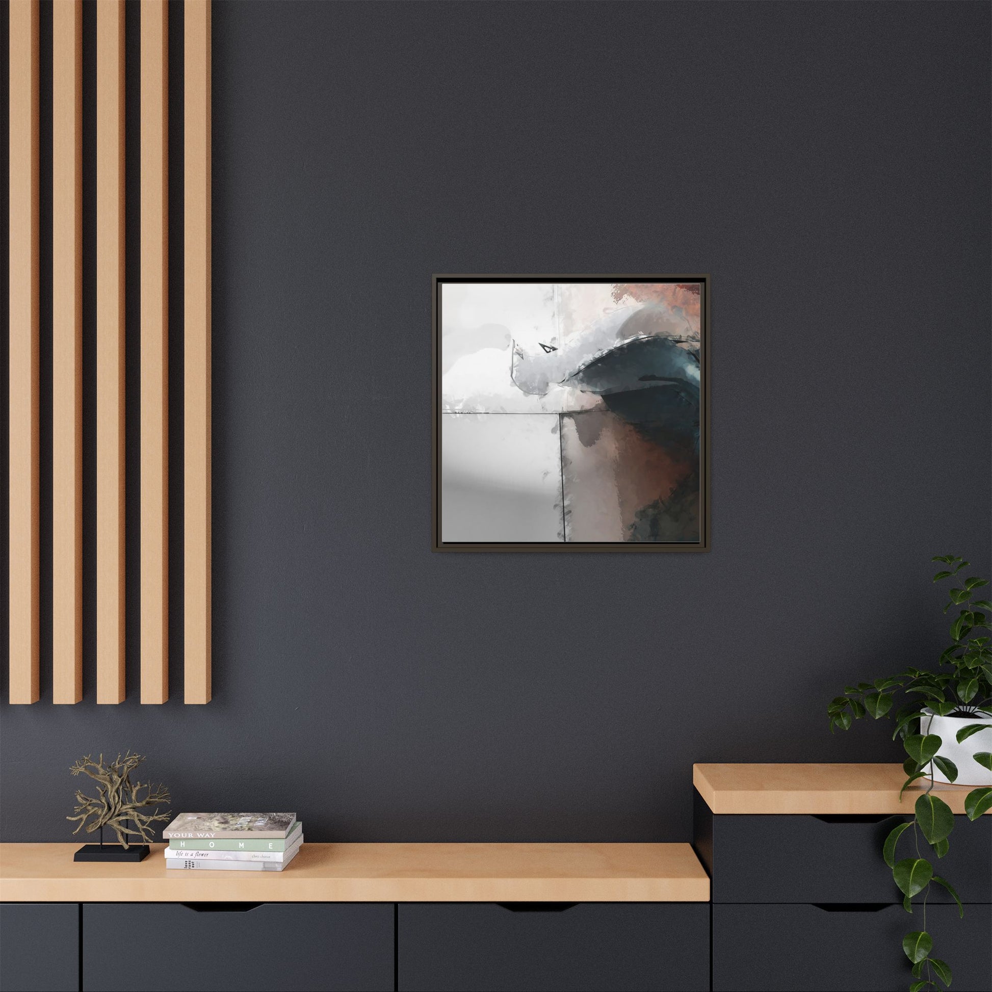 This abstract digital artwork features a minimalist, geometric composition with soft, blended colors ranging from cool grays to warm earth tones. The image is divided by sharp vertical lines, creating a segmented visual landscape with an ethereal, dreamlike quality. Subtle brushstrokes and watercolor-like textures give the piece a fluid, organic feel despite its angular structure. Darker blue-gray shapes dominate the lower right portion of the image, creating a sense of depth and contrast against the lighter background. The overall style suggests a modern, conceptual approach to digital painting, blending architectural elements with abstract expressionism.