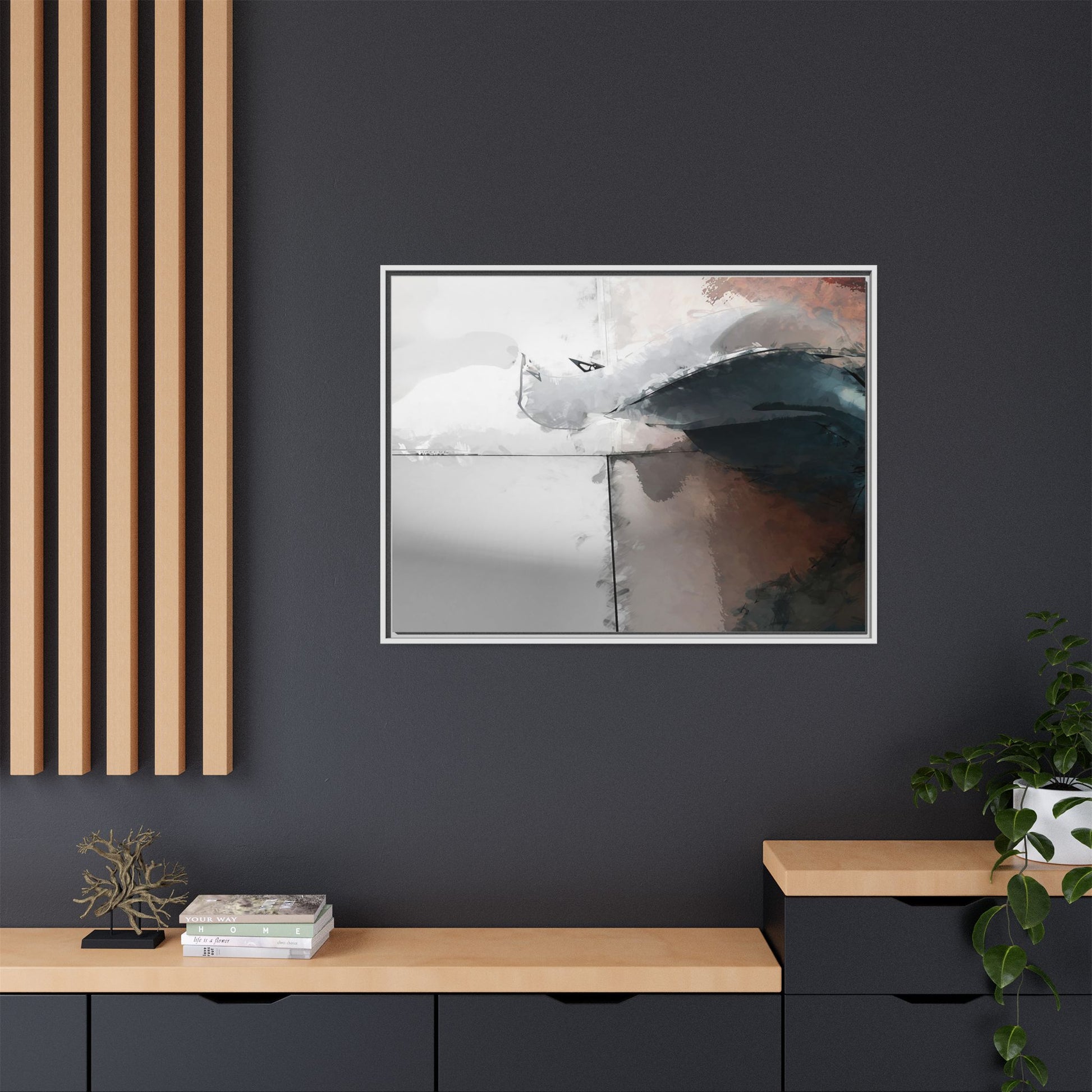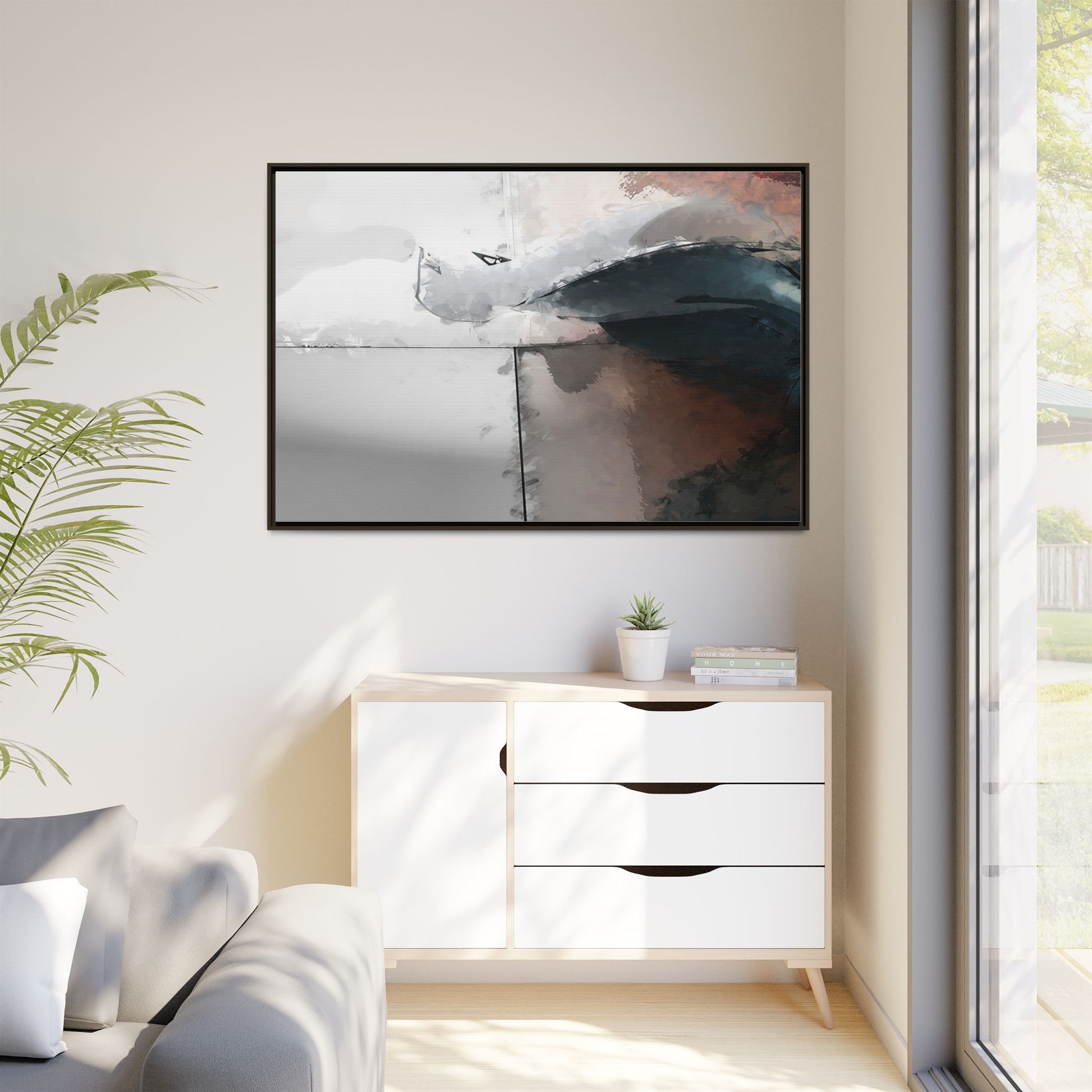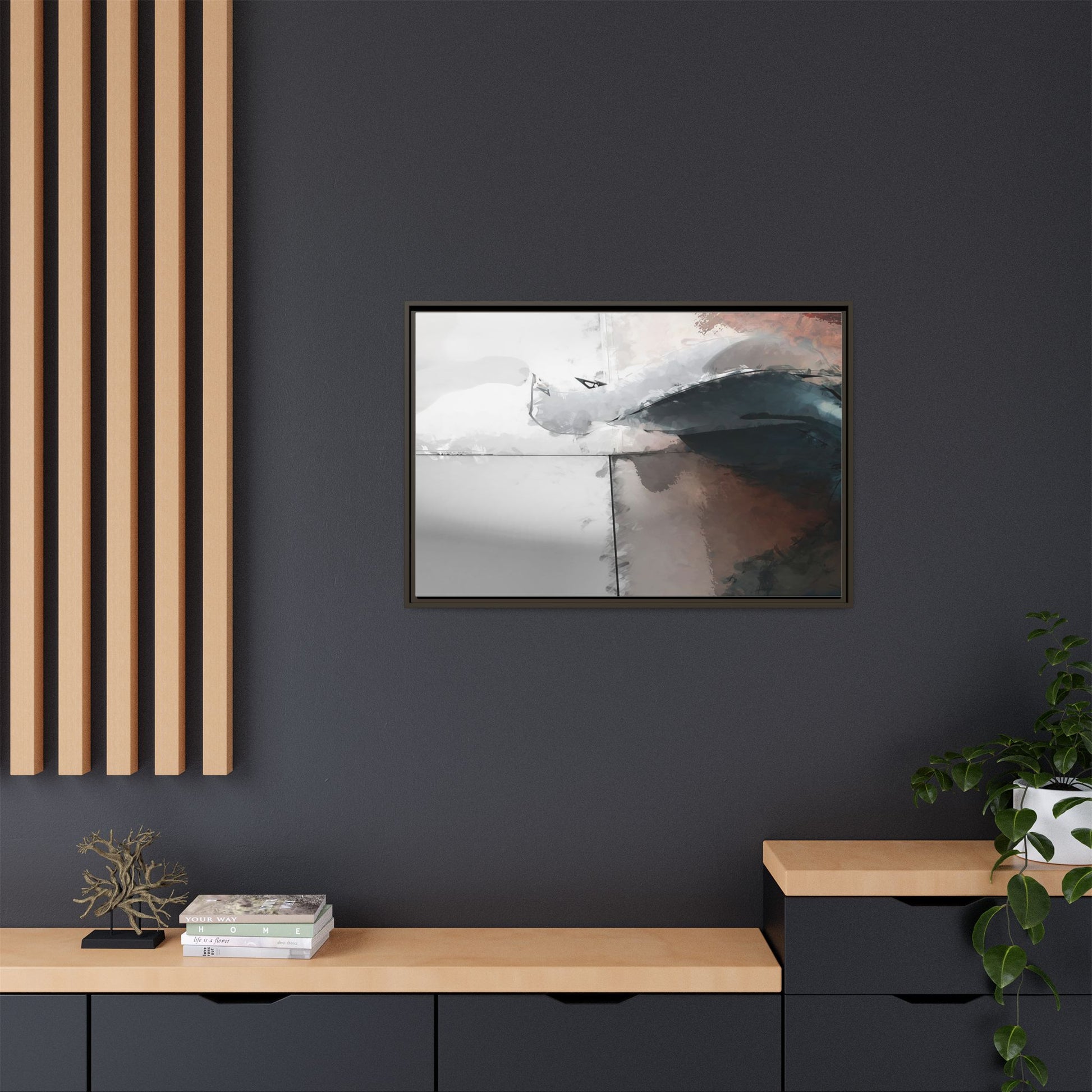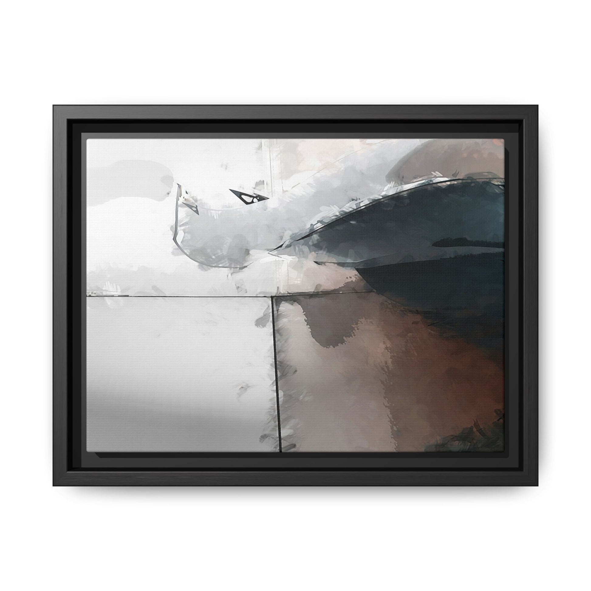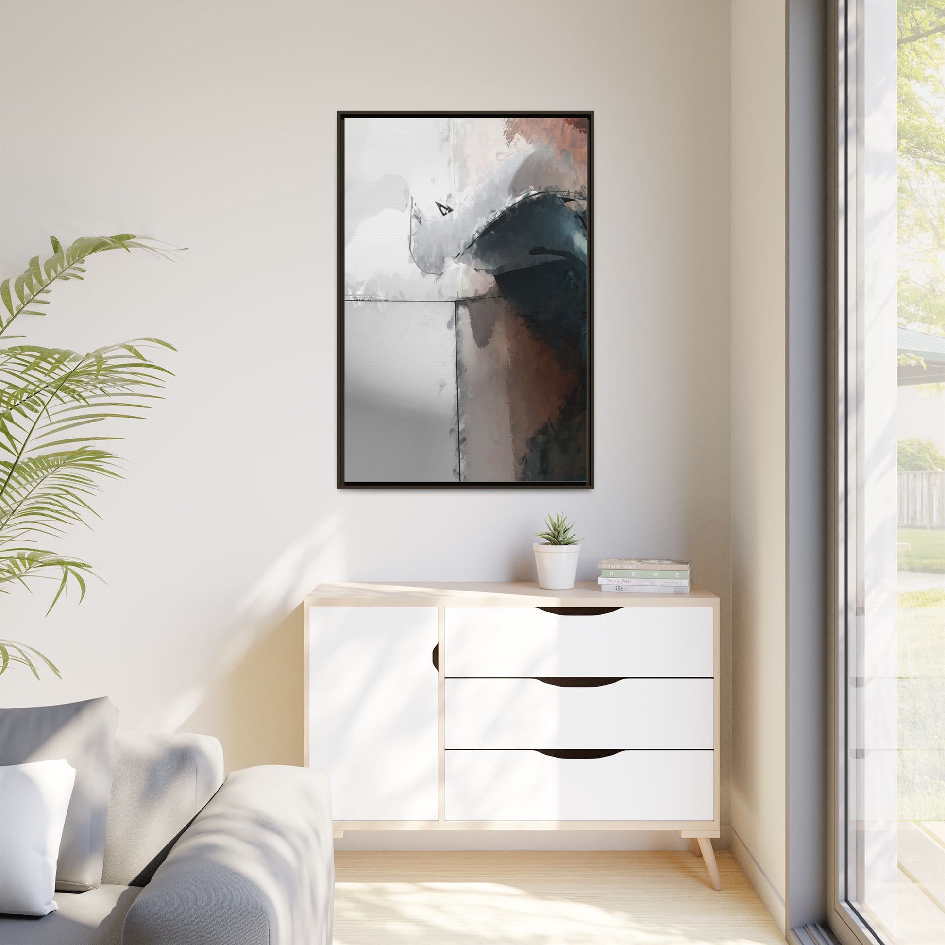 This abstract digital artwork features a minimalist, geometric composition with soft, blended colors ranging from cool grays to warm earth tones. The image is divided by sharp vertical lines, creating a segmented visual landscape with an ethereal, dreamlike quality. Subtle brushstrokes and watercolor-like textures give the piece a fluid, organic feel despite its angular structure. Darker blue-gray shapes dominate the lower right portion of the image, creating a sense of depth and contrast against the lighter background. The overall style suggests a modern, conceptual approach to digital painting, blending architectural elements with abstract expressionism.
