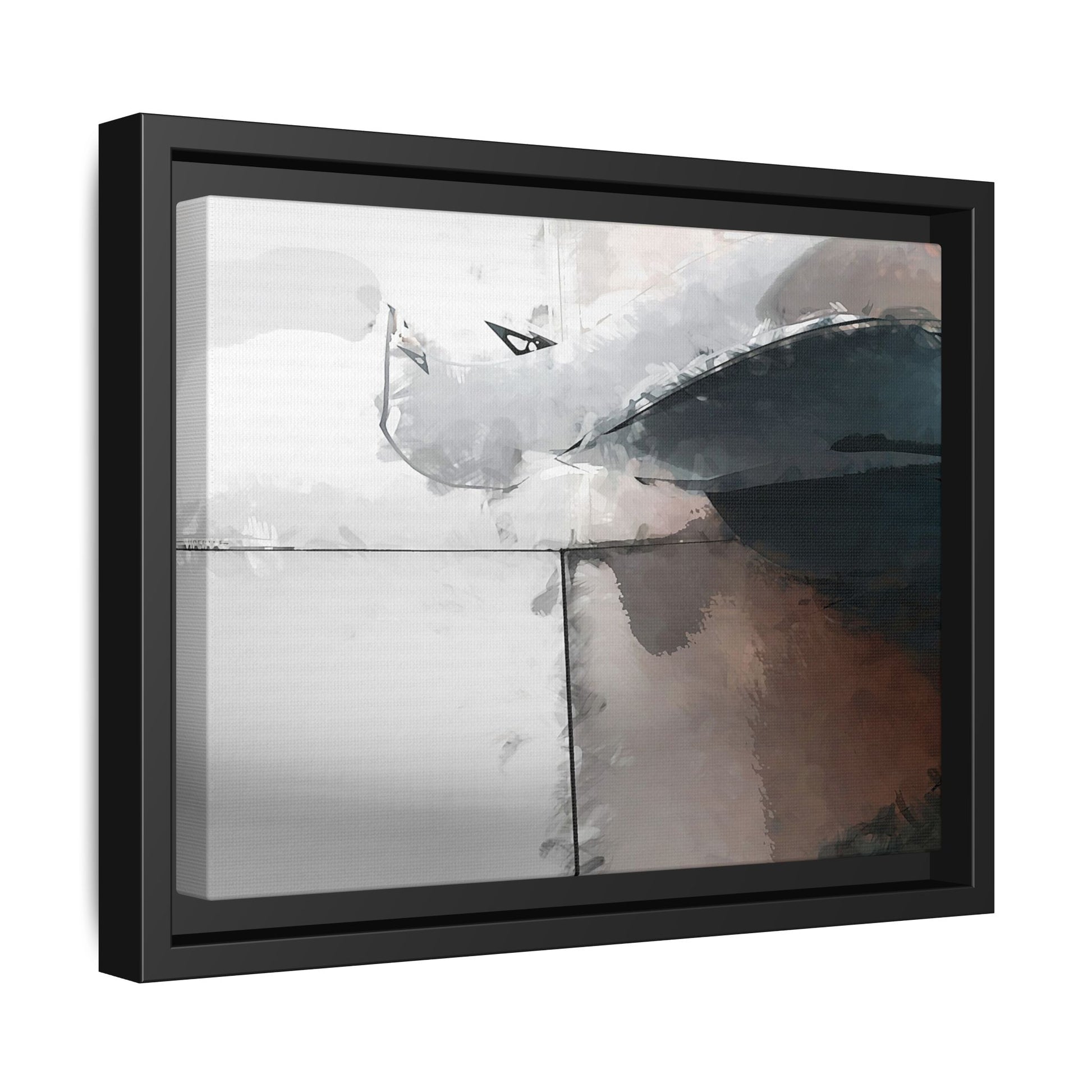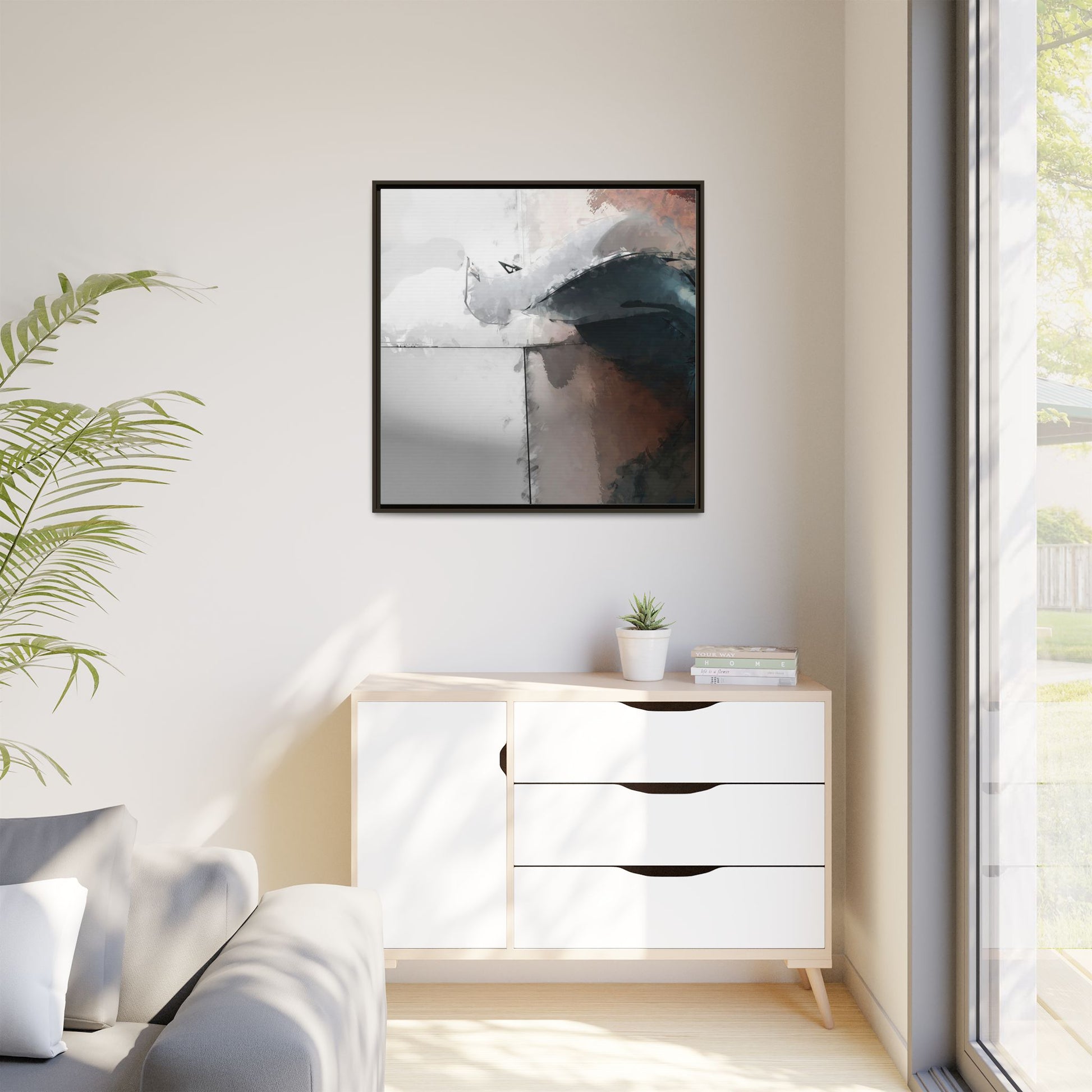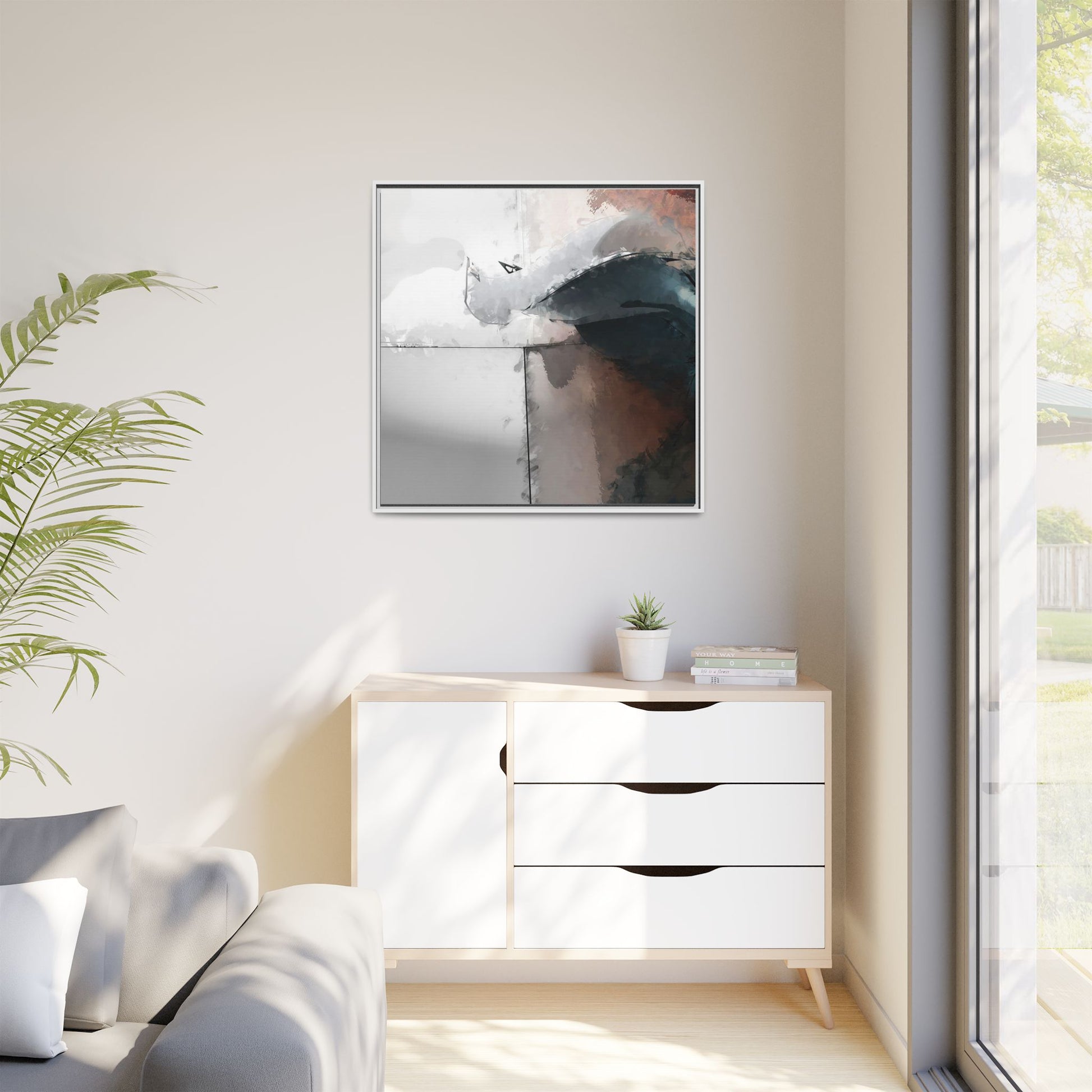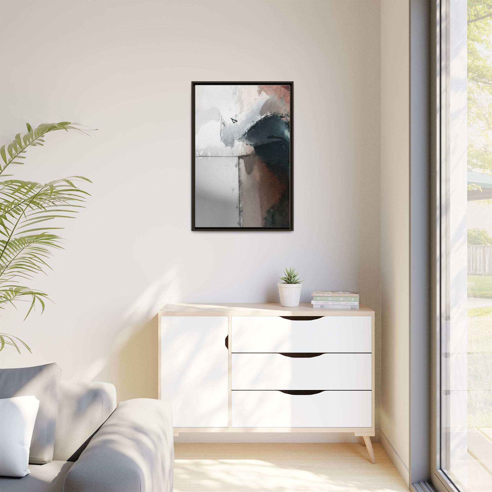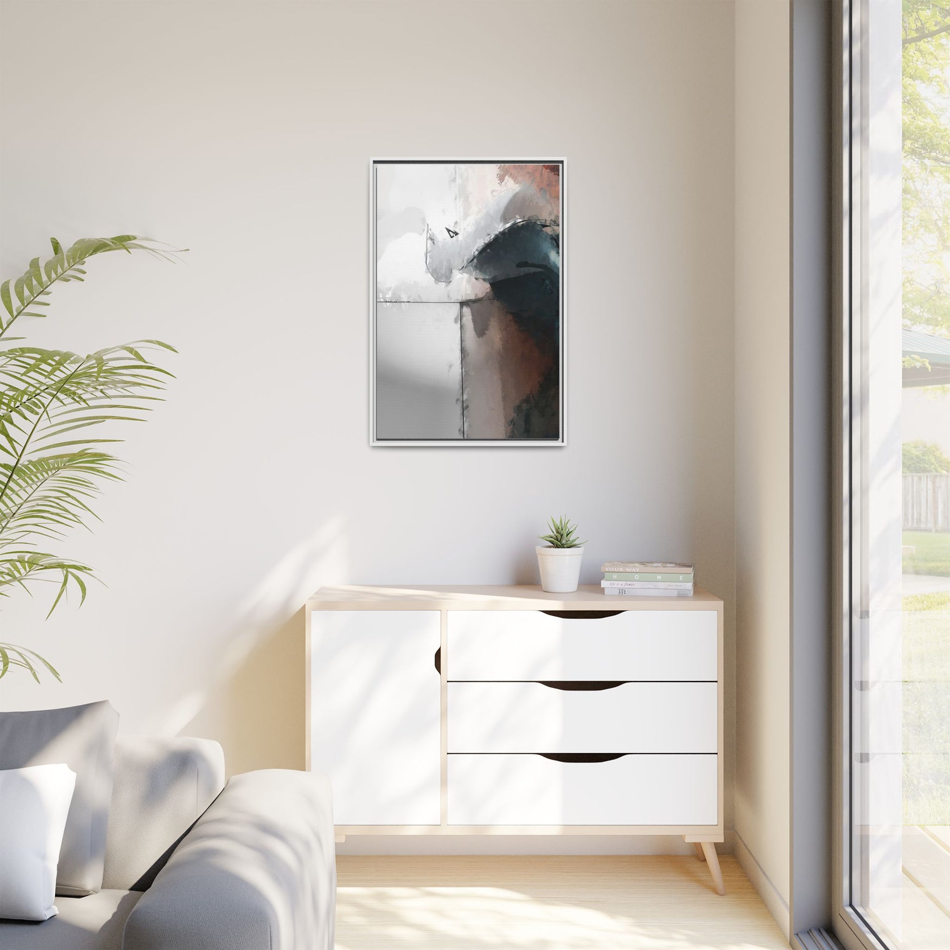 This abstract digital artwork features a minimalist, geometric composition with soft, blended colors ranging from cool grays to warm earth tones. The image is divided by sharp vertical lines, creating a segmented visual landscape with an ethereal, dreamlike quality. Subtle brushstrokes and watercolor-like textures give the piece a fluid, organic feel despite its angular structure. Darker blue-gray shapes dominate the lower right portion of the image, creating a sense of depth and contrast against the lighter background. The overall style suggests a modern, conceptual approach to digital painting, blending architectural elements with abstract expressionism.