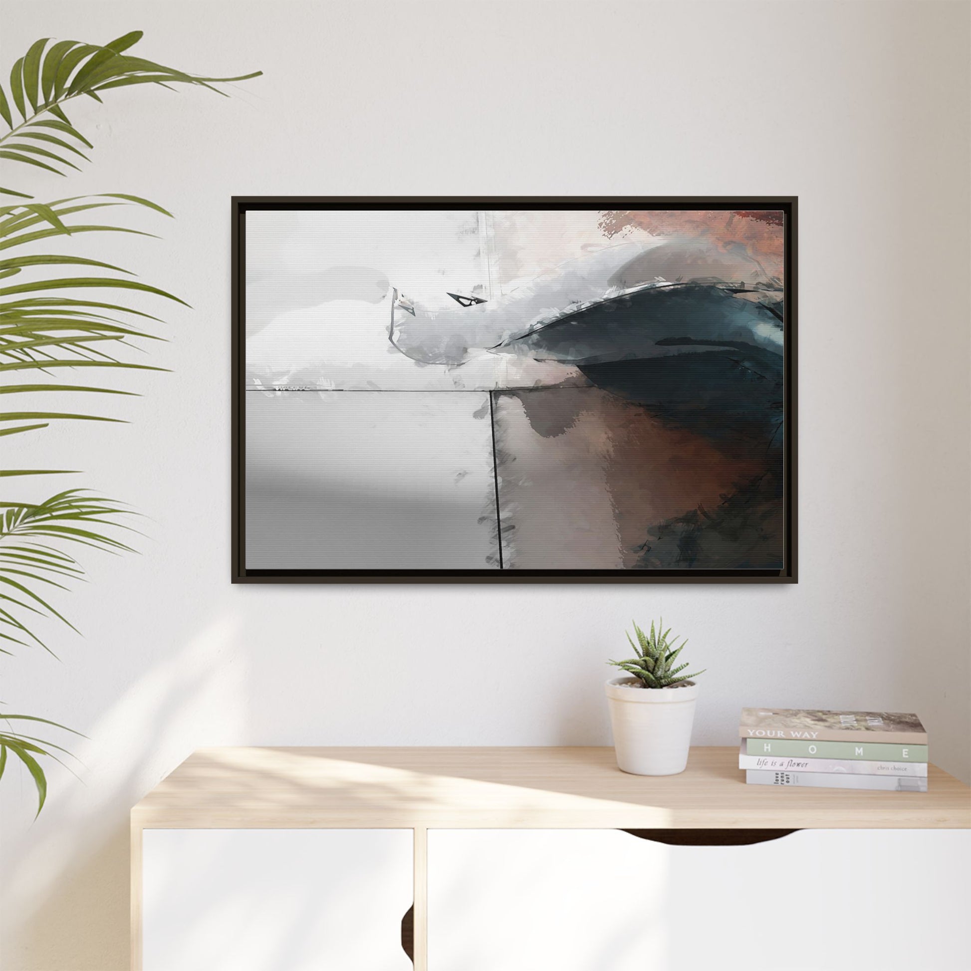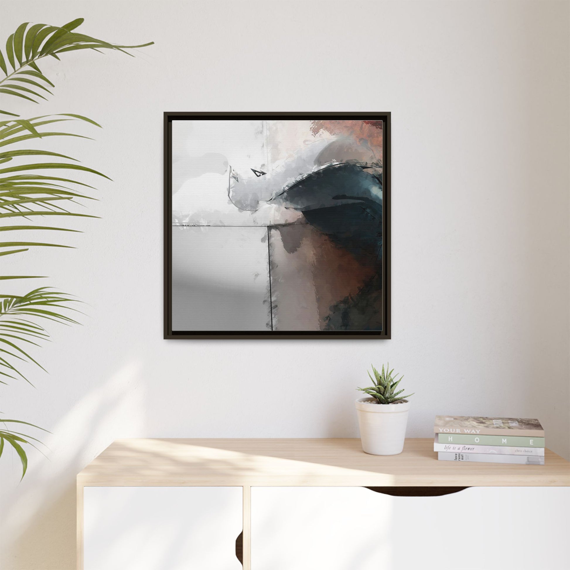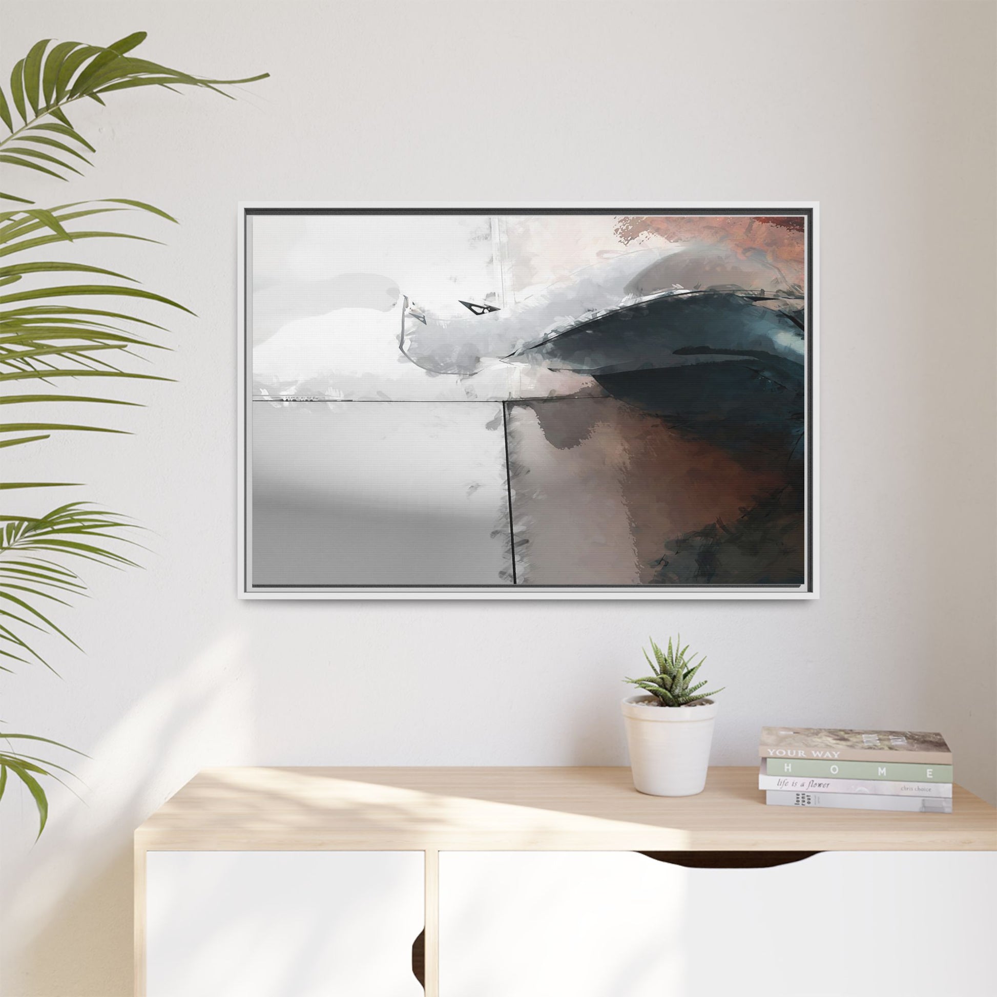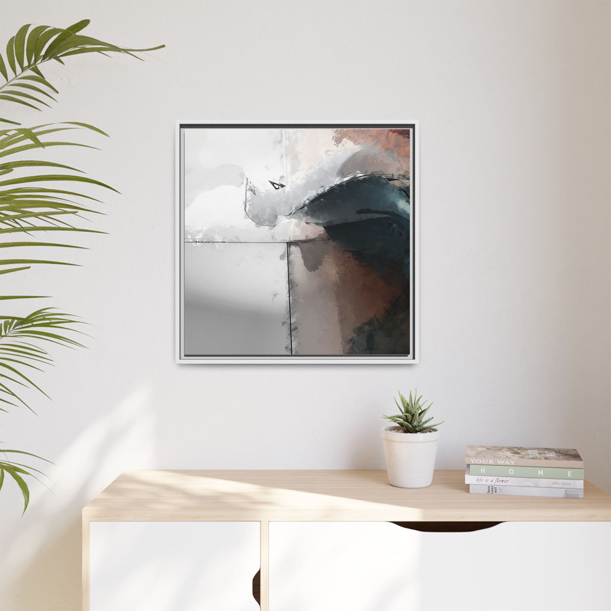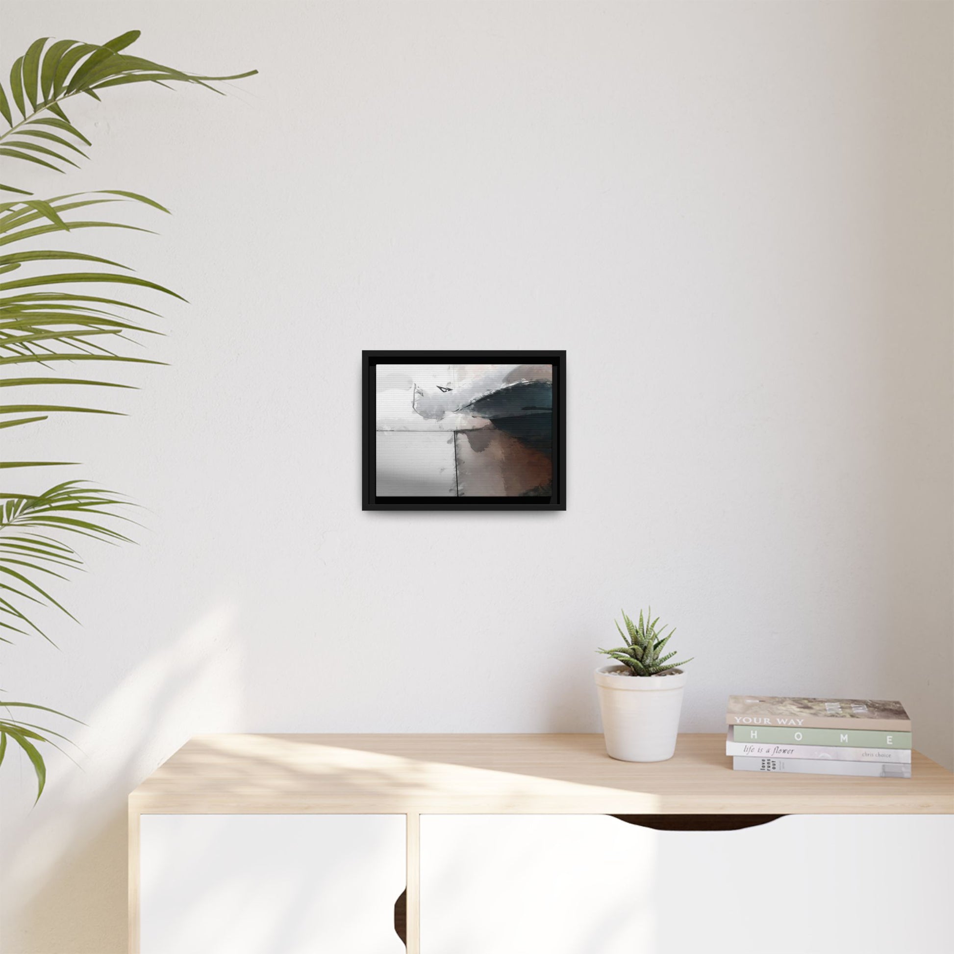 This abstract digital artwork features a minimalist, geometric composition with soft, blended colors ranging from cool grays to warm earth tones. The image is divided by sharp vertical lines, creating a segmented visual landscape with an ethereal, dreamlike quality. Subtle brushstrokes and watercolor-like textures give the piece a fluid, organic feel despite its angular structure. Darker blue-gray shapes dominate the lower right portion of the image, creating a sense of depth and contrast against the lighter background. The overall style suggests a modern, conceptual approach to digital painting, blending architectural elements with abstract expressionism.