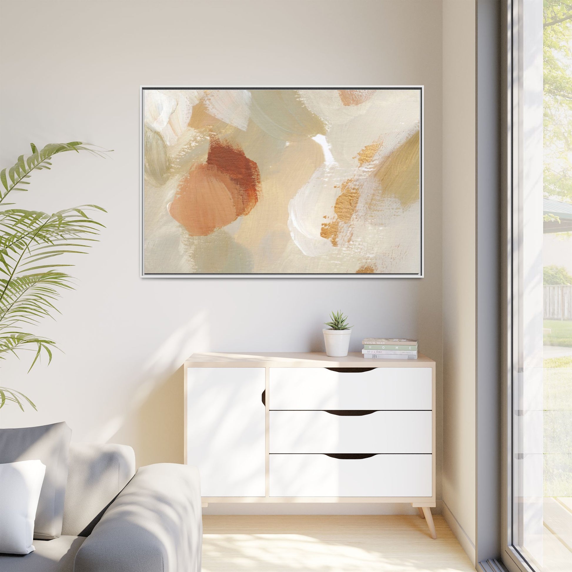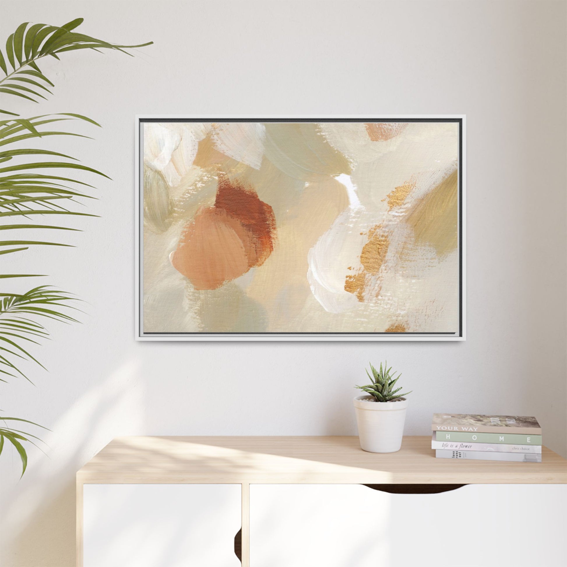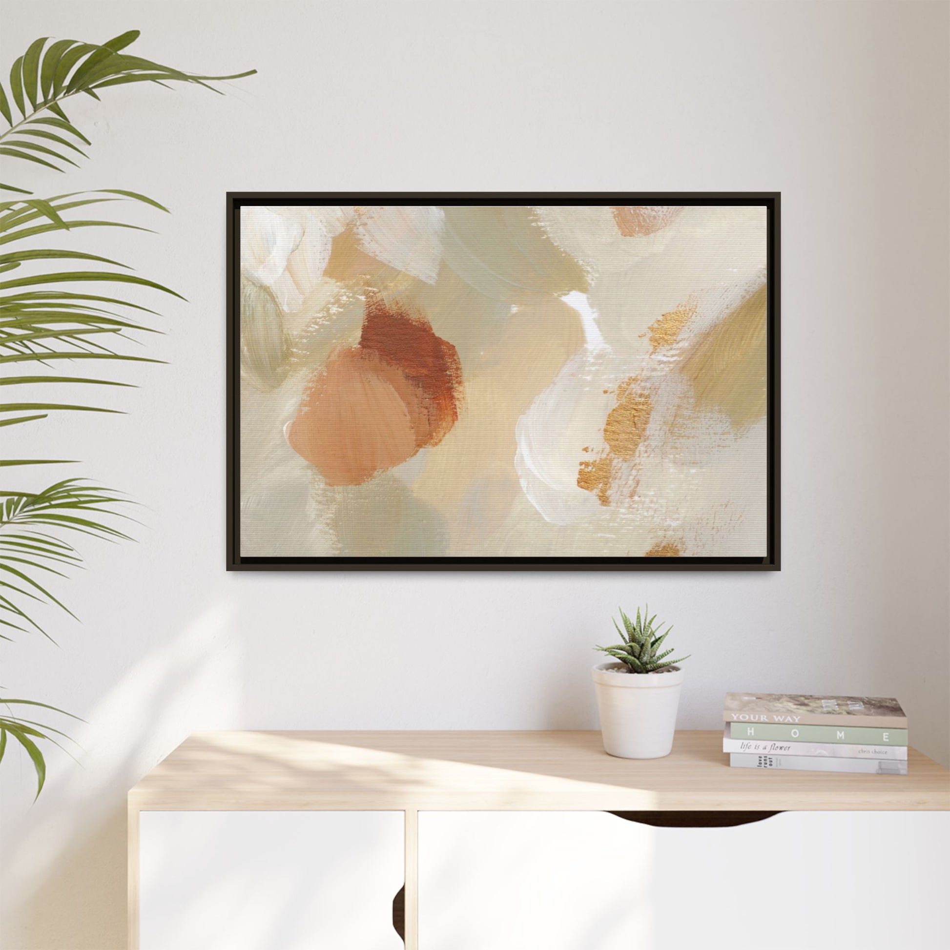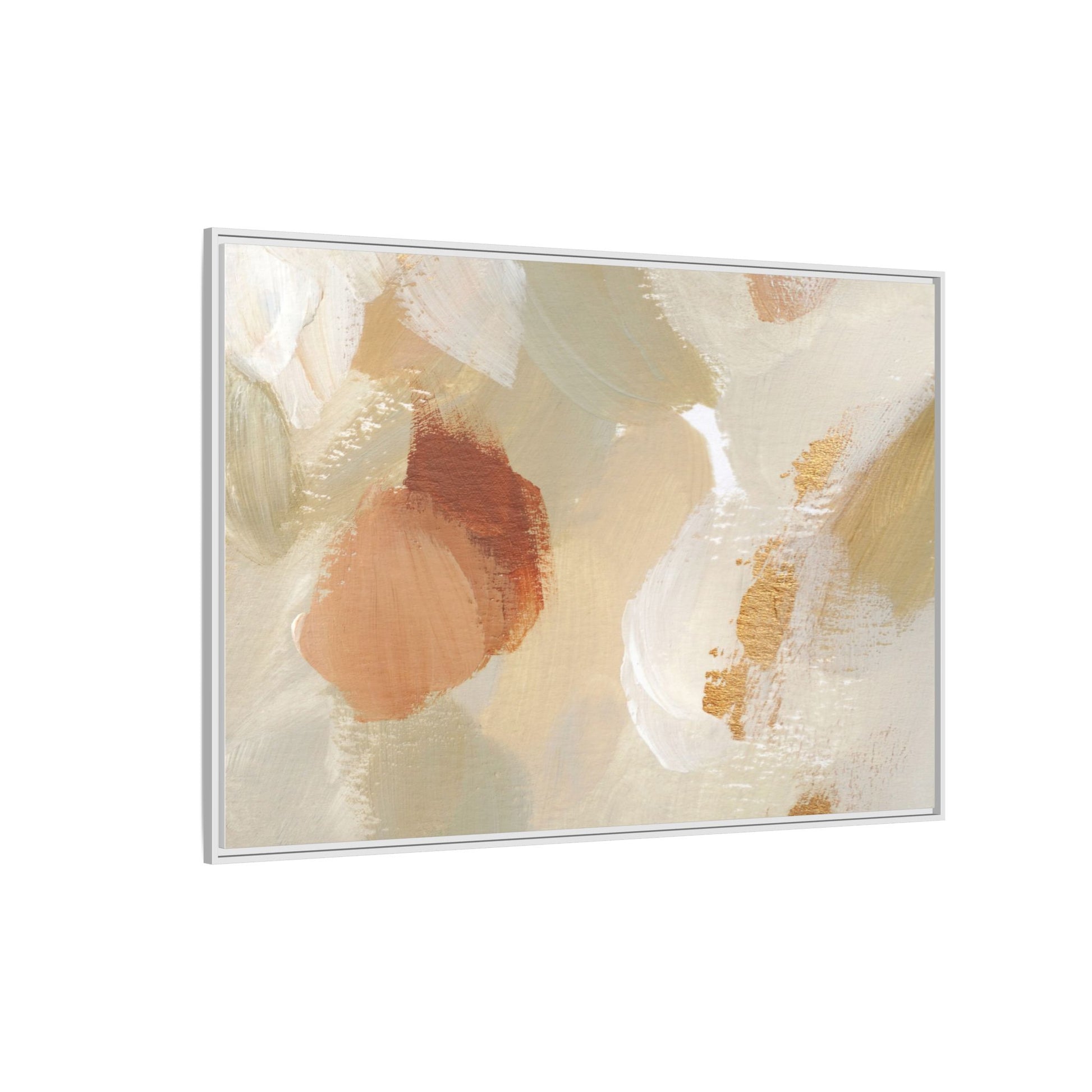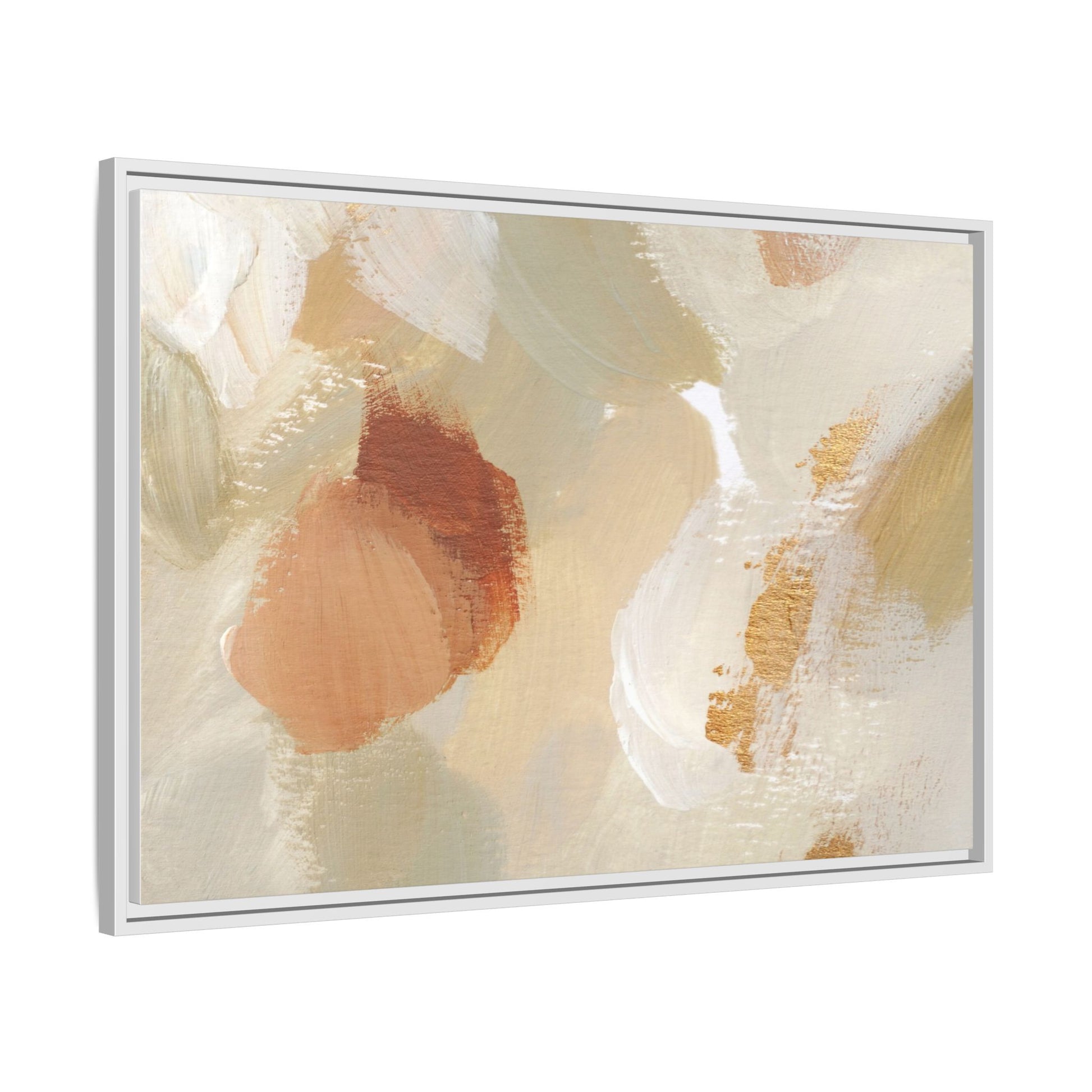 This abstract painting showcases a delicate composition of soft, organic shapes in muted earth tones. Warm peach, rust, cream, and golden hues blend seamlessly across the canvas, creating a gentle and ethereal landscape of color. The brushstrokes appear fluid and textured, with layers of paint creating depth and subtle variations in tone. Soft, blended edges give the artwork a dreamy and contemplative quality, reminiscent of natural forms like petals or clouds. The overall effect is a serene and harmonious abstract piece that invites viewers to explore its nuanced color palette and subtle textural details.