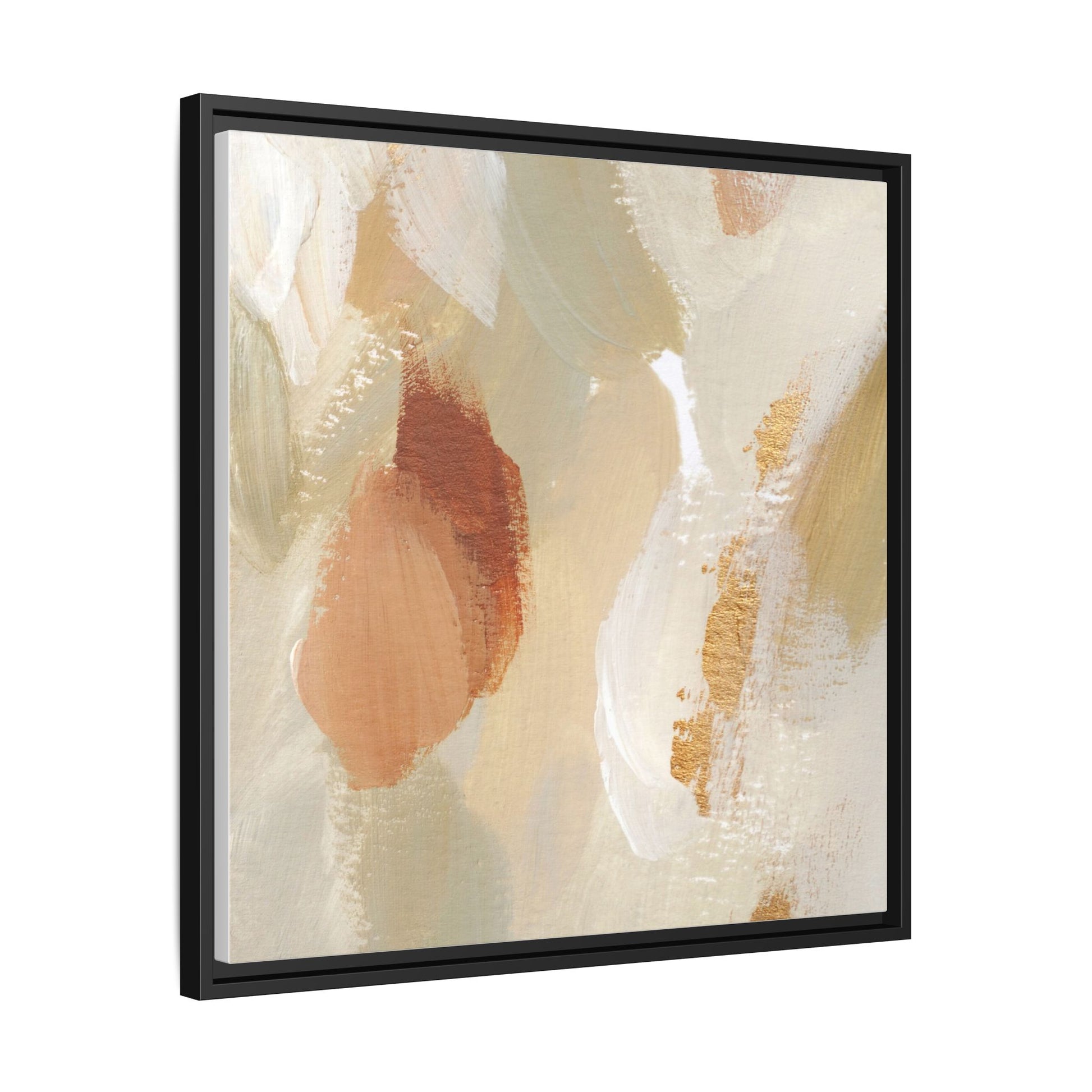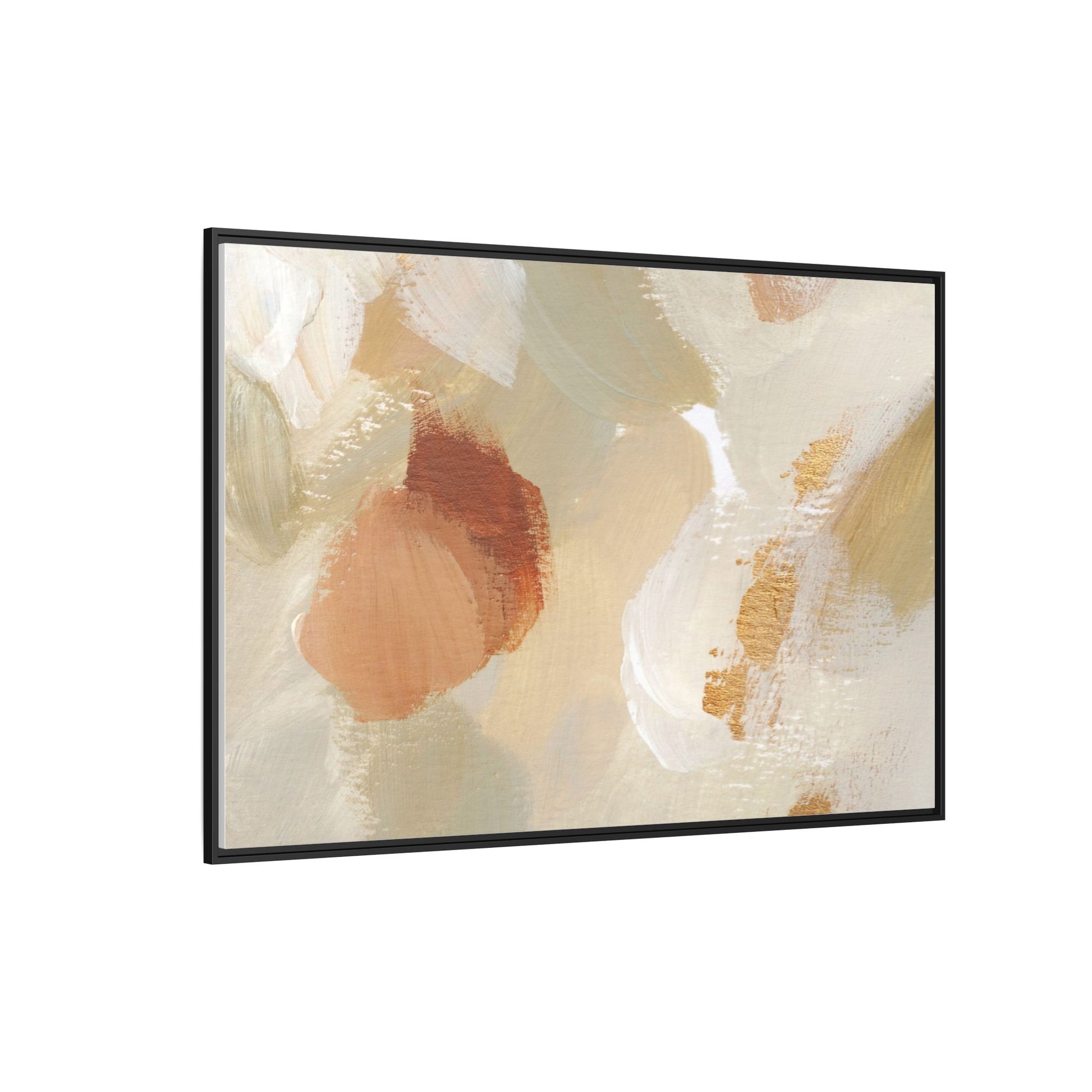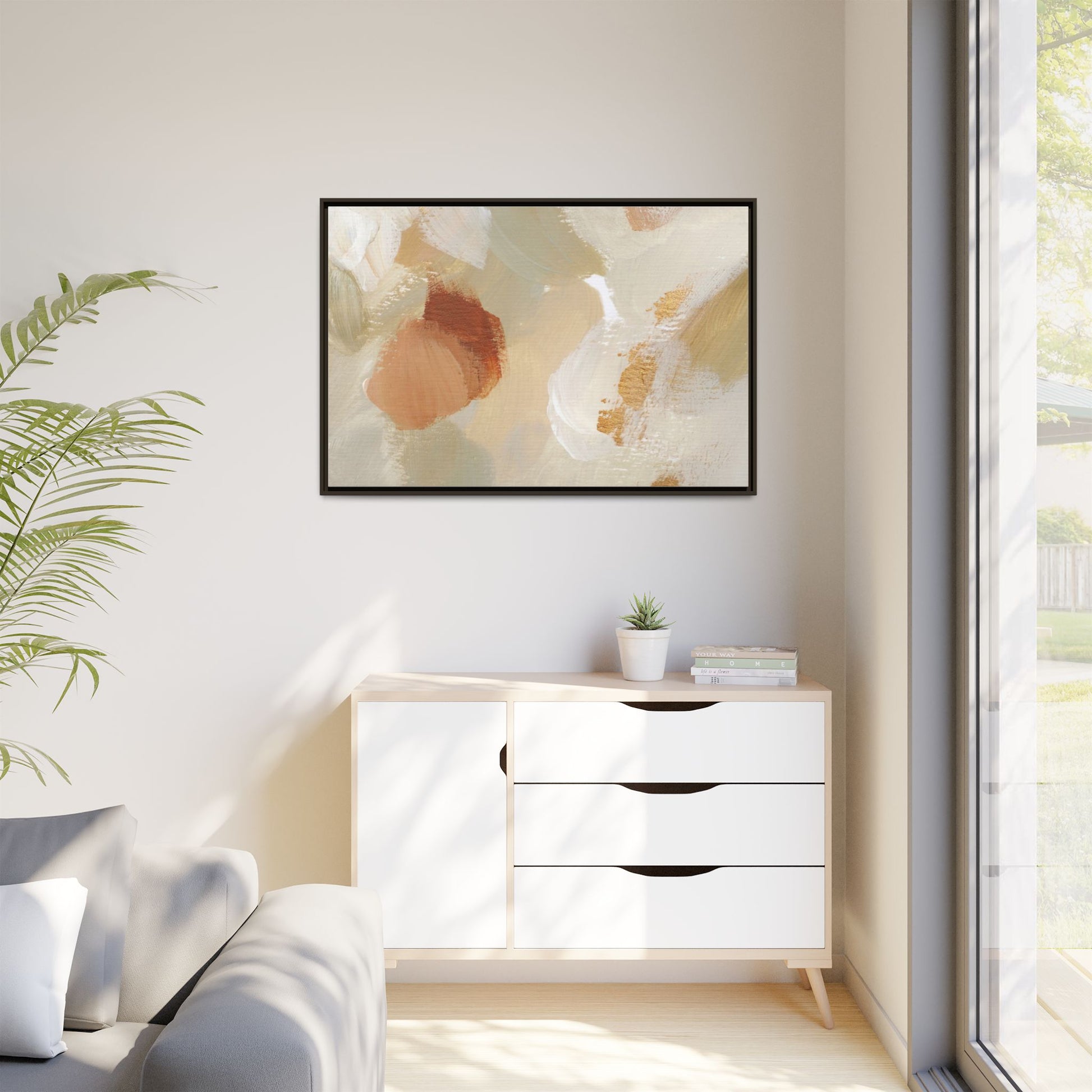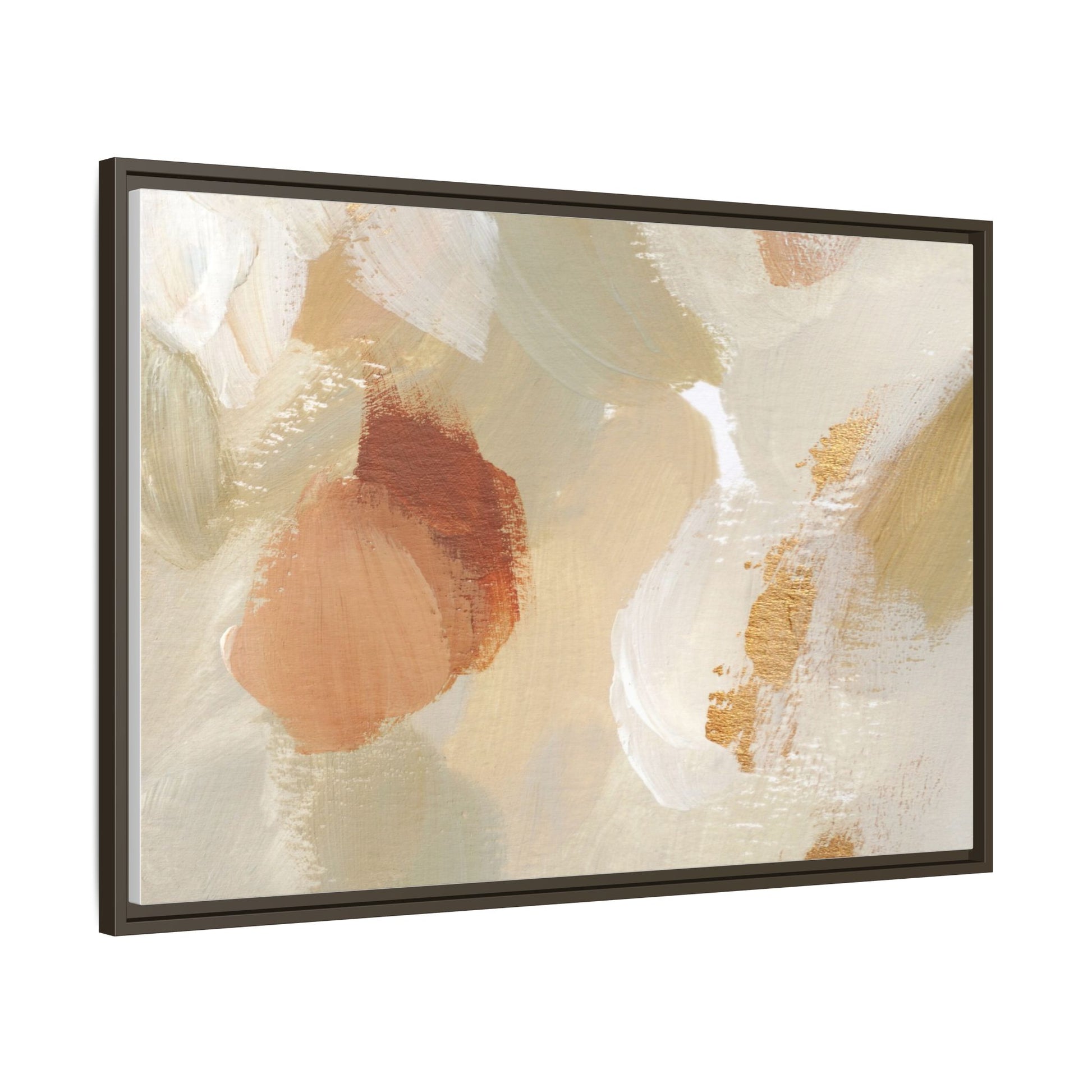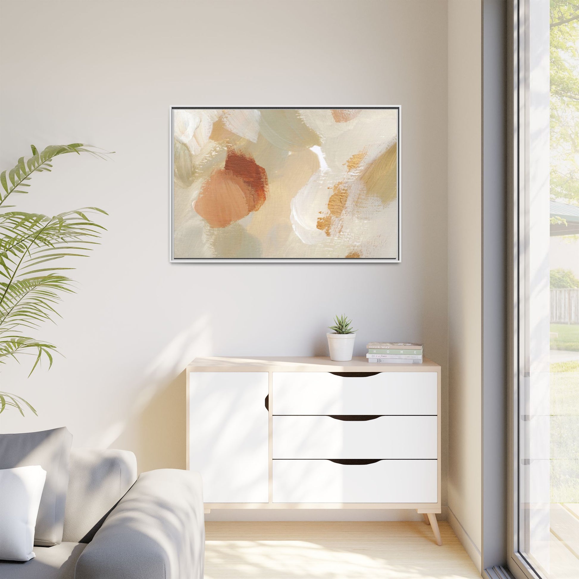 This abstract painting showcases a delicate composition of soft, organic shapes in muted earth tones. Warm peach, rust, cream, and golden hues blend seamlessly across the canvas, creating a gentle and ethereal landscape of color. The brushstrokes appear fluid and textured, with layers of paint creating depth and subtle variations in tone. Soft, blended edges give the artwork a dreamy and contemplative quality, reminiscent of natural forms like petals or clouds. The overall effect is a serene and harmonious abstract piece that invites viewers to explore its nuanced color palette and subtle textural details.