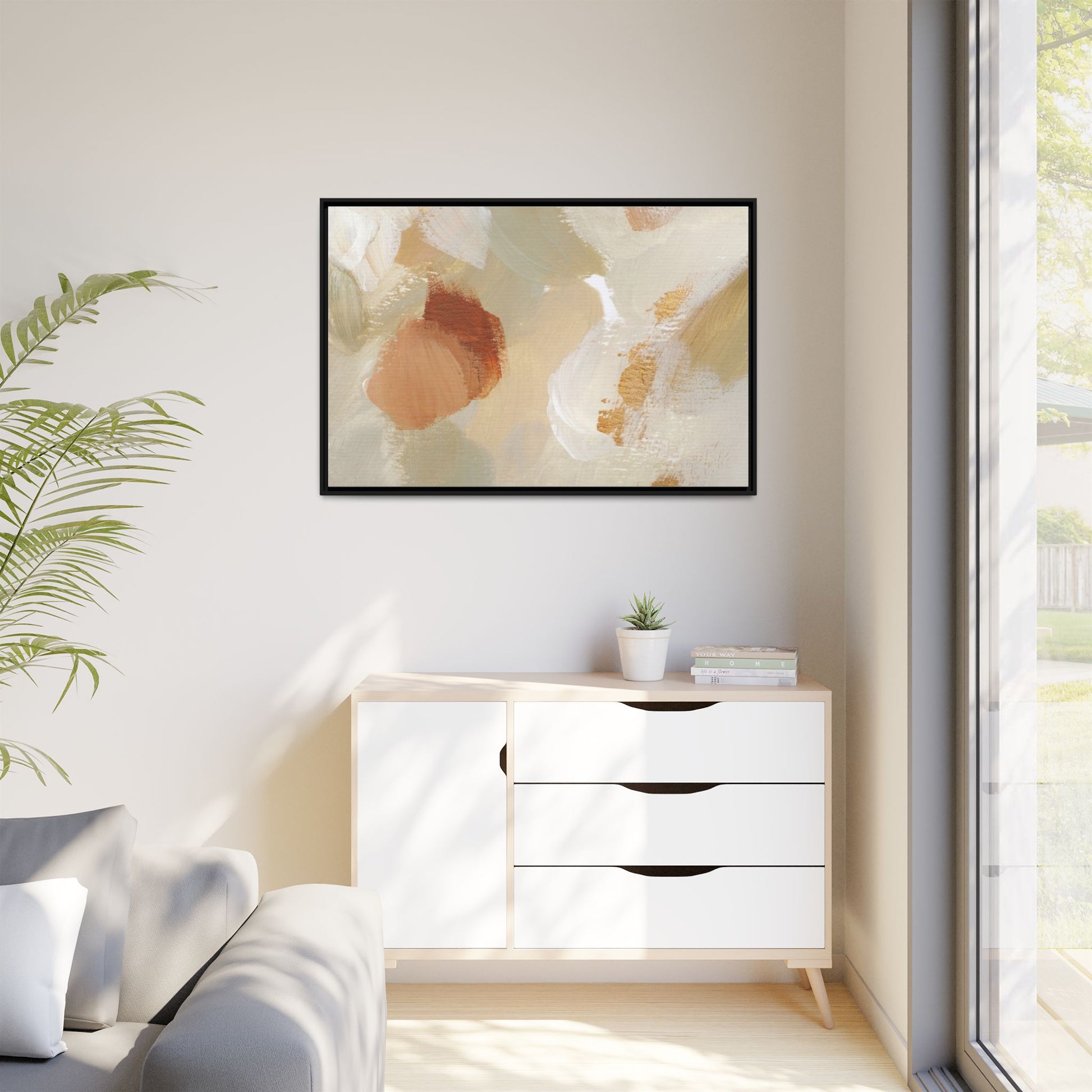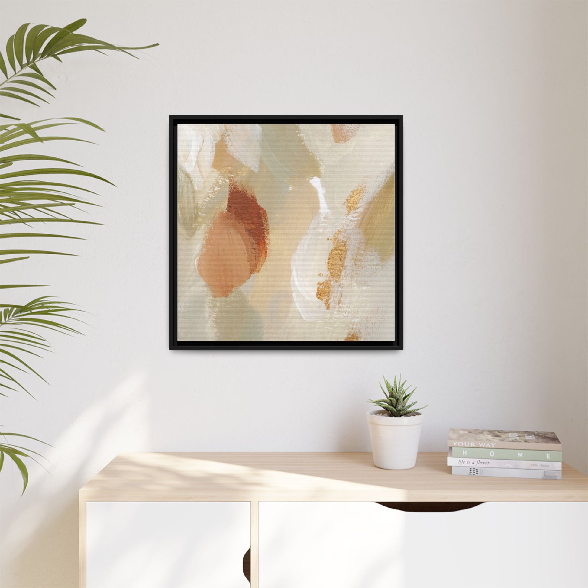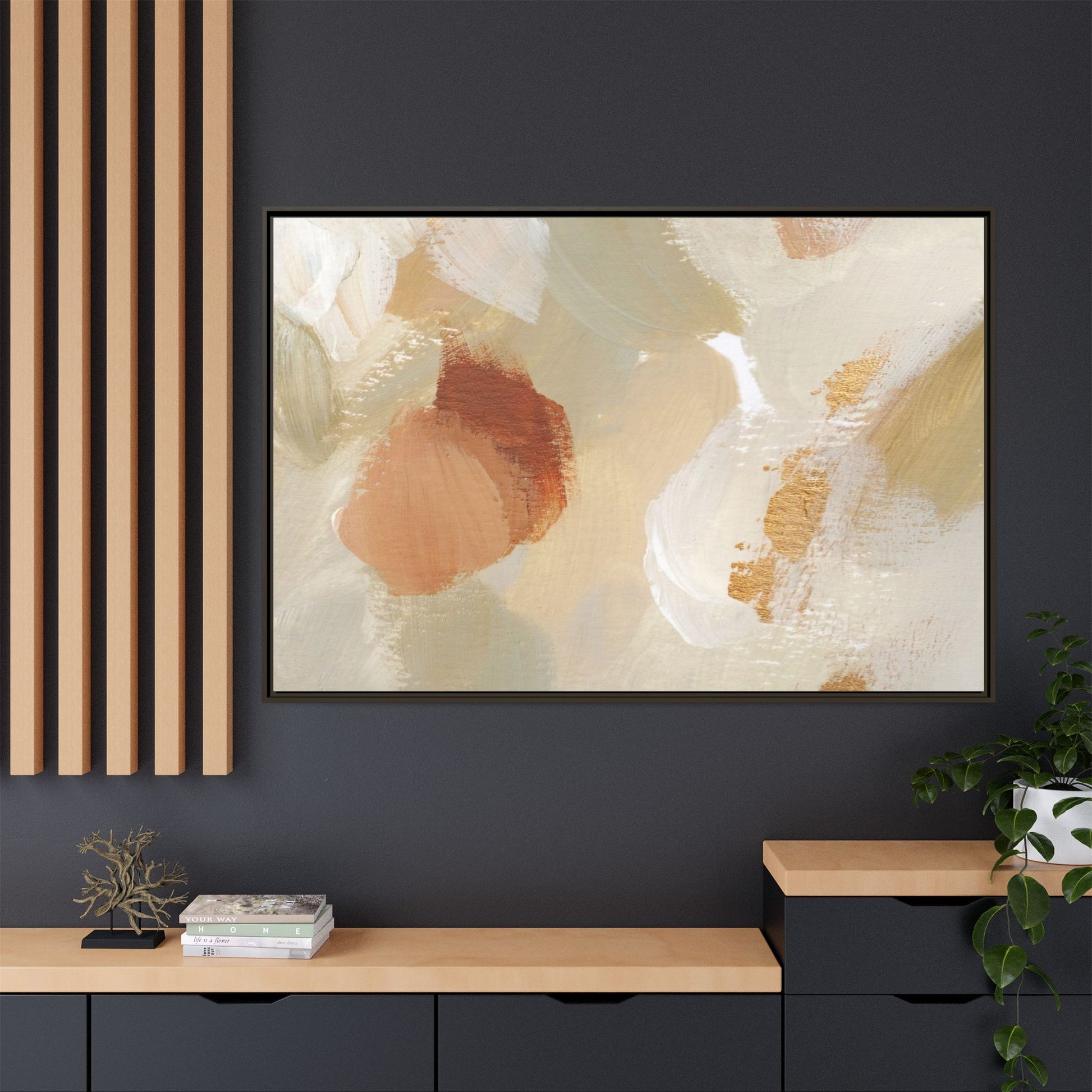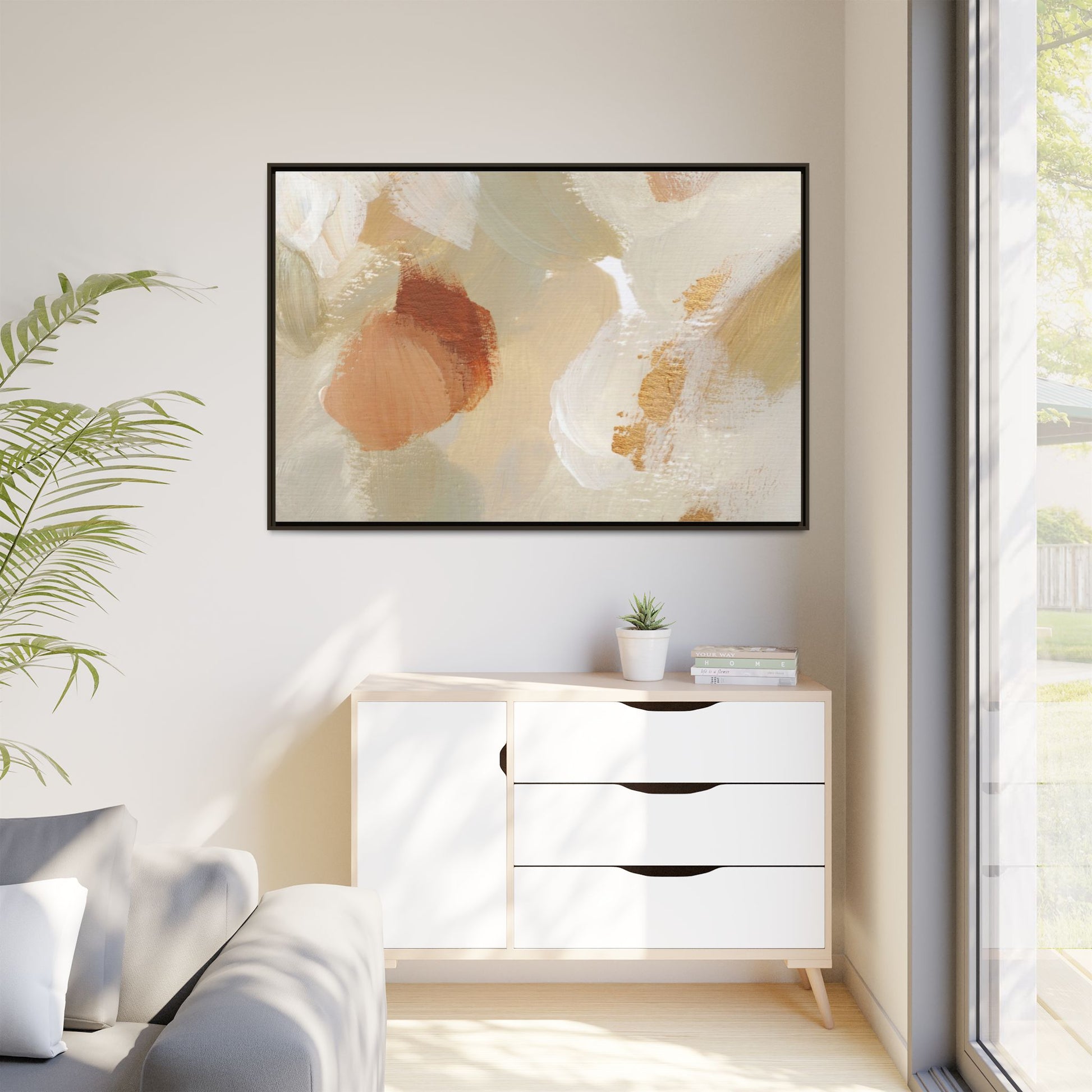 This abstract painting showcases a delicate composition of soft, organic shapes in muted earth tones. Warm peach, rust, cream, and golden hues blend seamlessly across the canvas, creating a gentle and ethereal landscape of color. The brushstrokes appear fluid and textured, with layers of paint creating depth and subtle variations in tone. Soft, blended edges give the artwork a dreamy and contemplative quality, reminiscent of natural forms like petals or clouds. The overall effect is a serene and harmonious abstract piece that invites viewers to explore its nuanced color palette and subtle textural details.