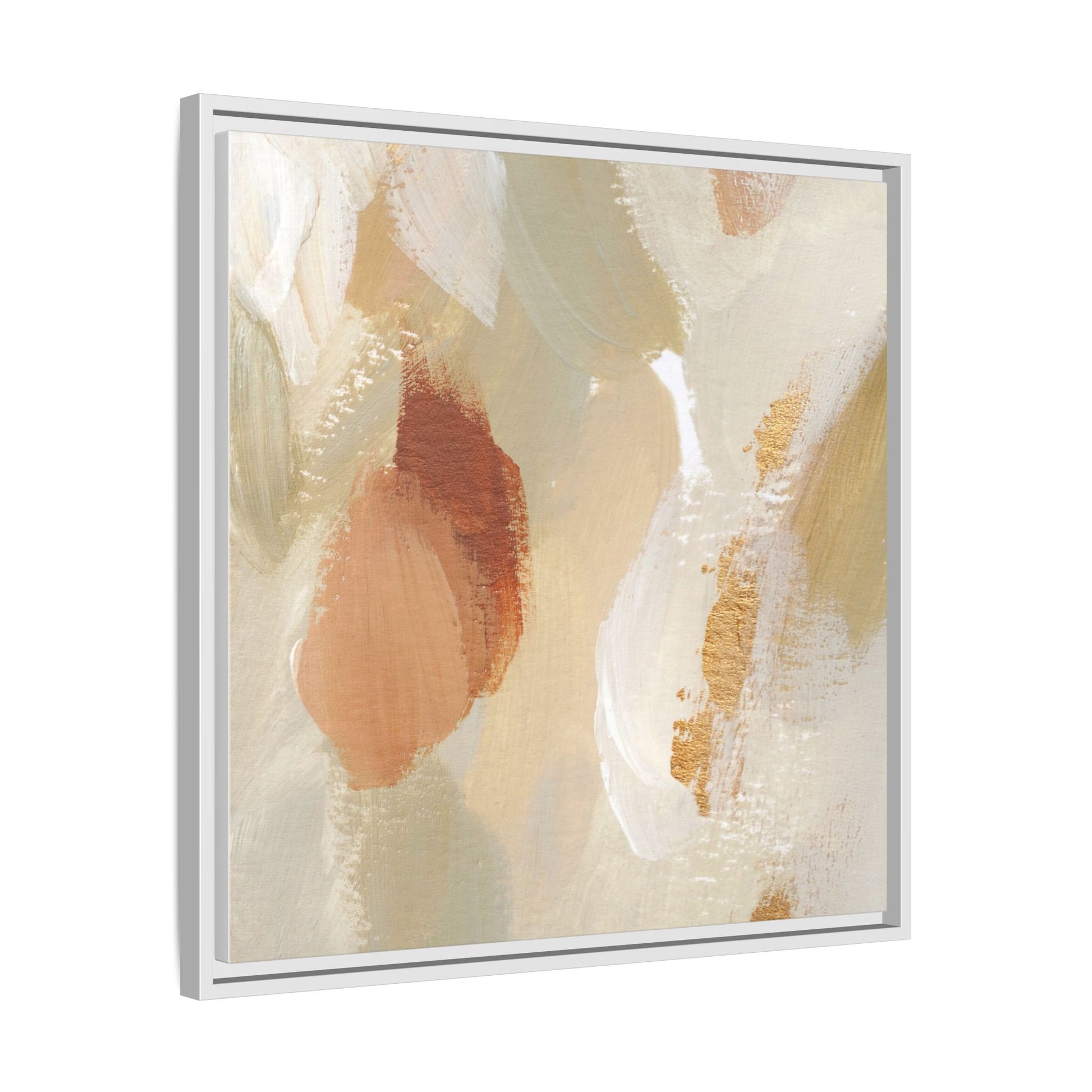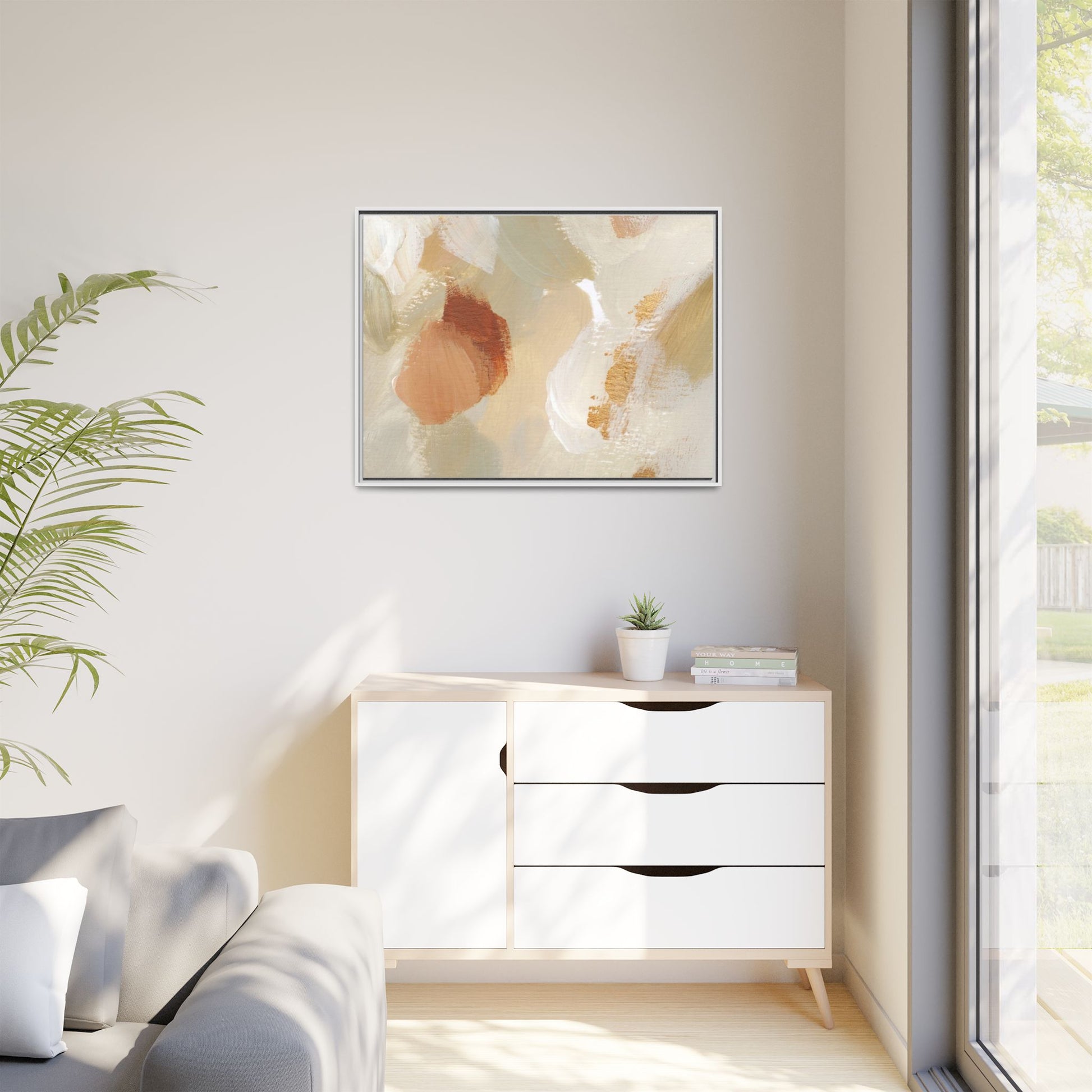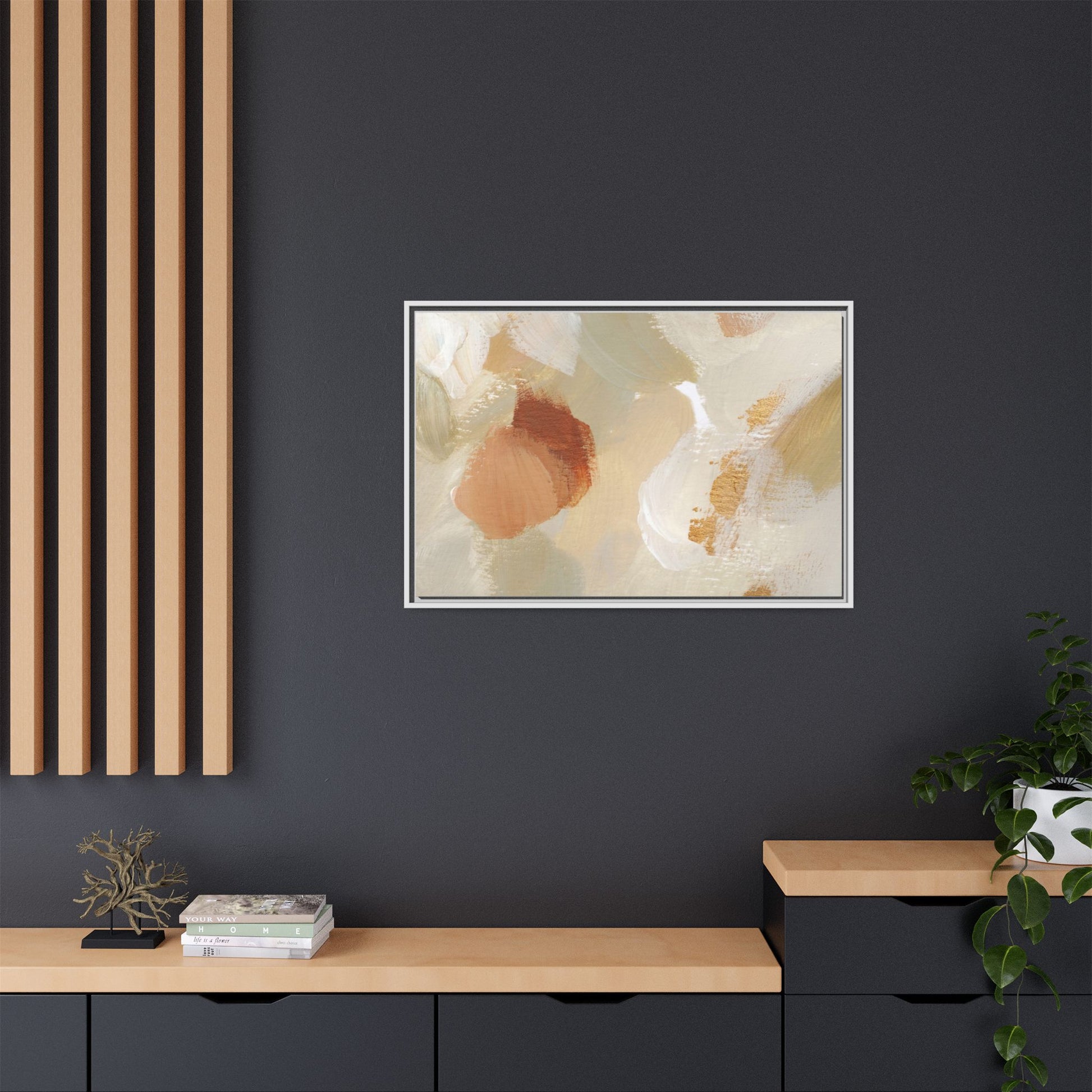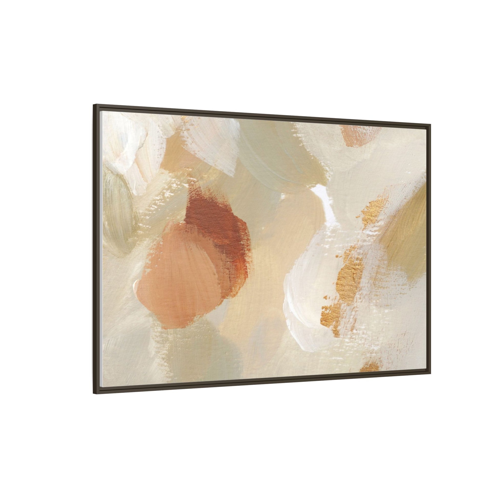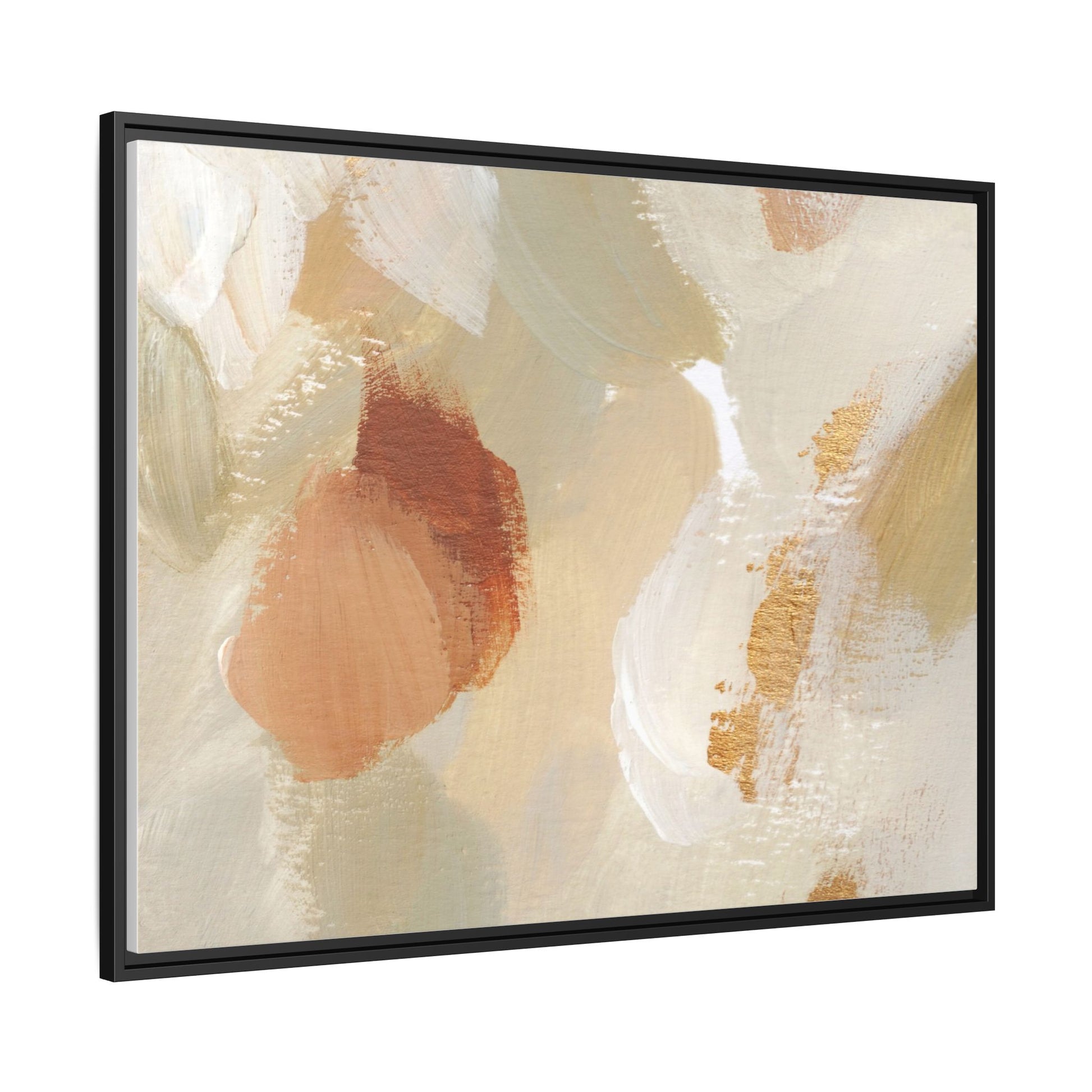This abstract painting showcases a delicate composition of soft, organic shapes in muted earth tones. Warm peach, rust, cream, and golden hues blend seamlessly across the canvas, creating a gentle and ethereal landscape of color. The brushstrokes appear fluid and textured, with layers of paint creating depth and subtle variations in tone. Soft, blended edges give the artwork a dreamy and contemplative quality, reminiscent of natural forms like petals or clouds. The overall effect is a serene and harmonious abstract piece that invites viewers to explore its nuanced color palette and subtle textural details.