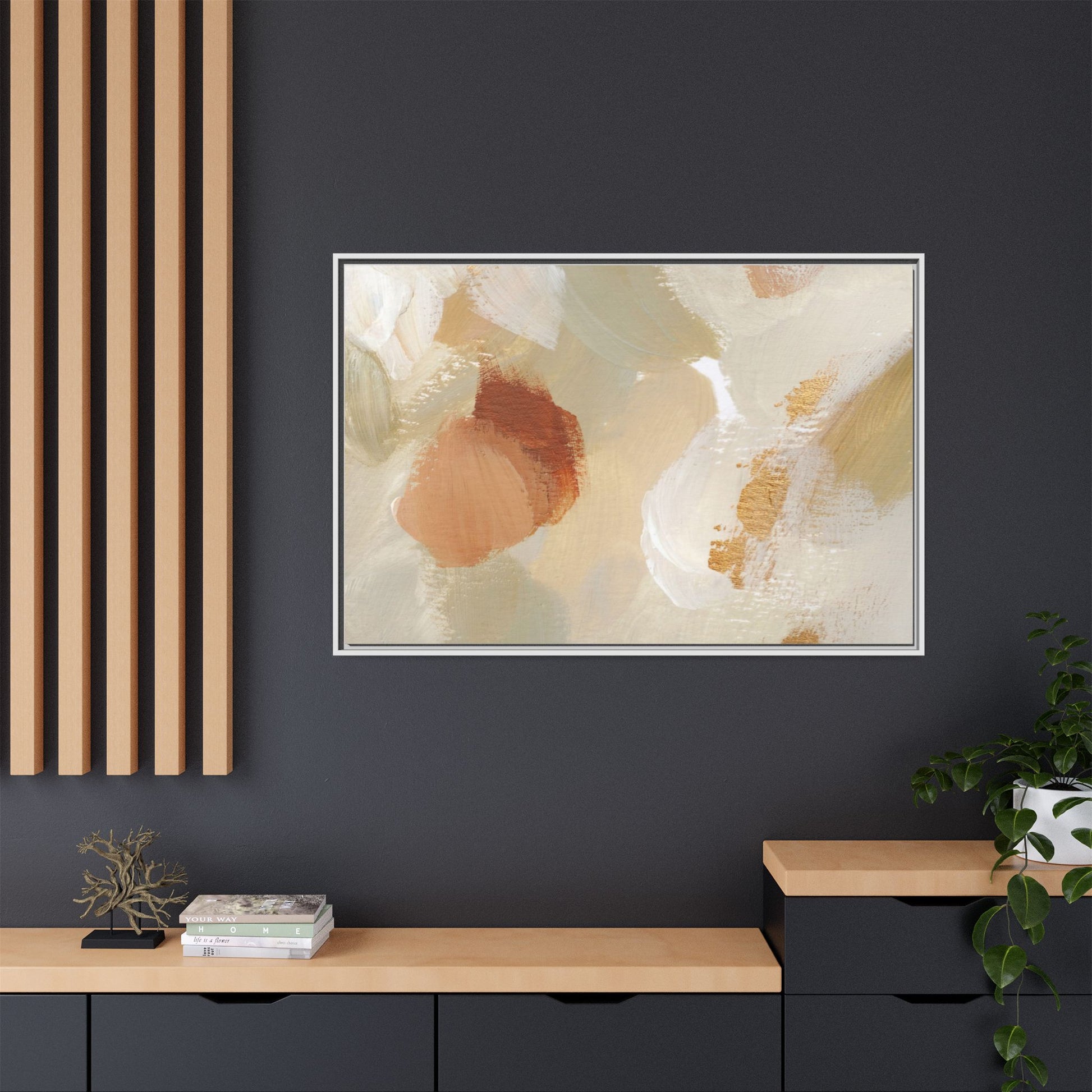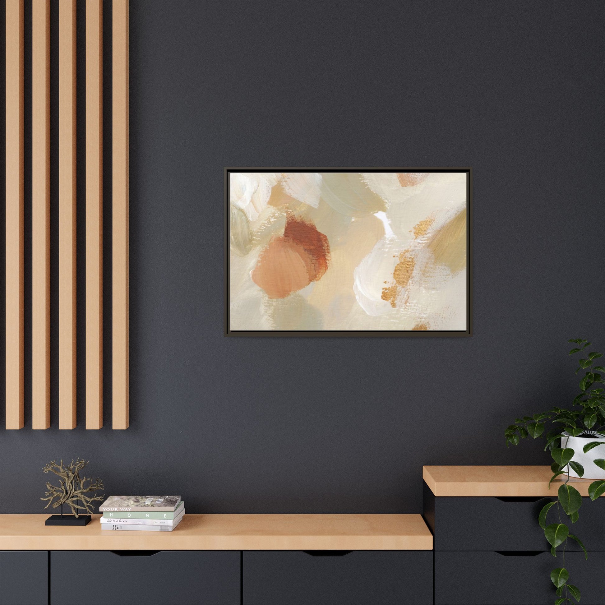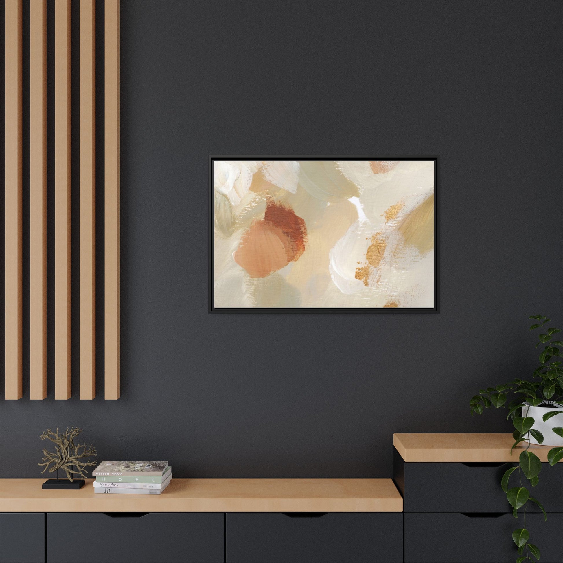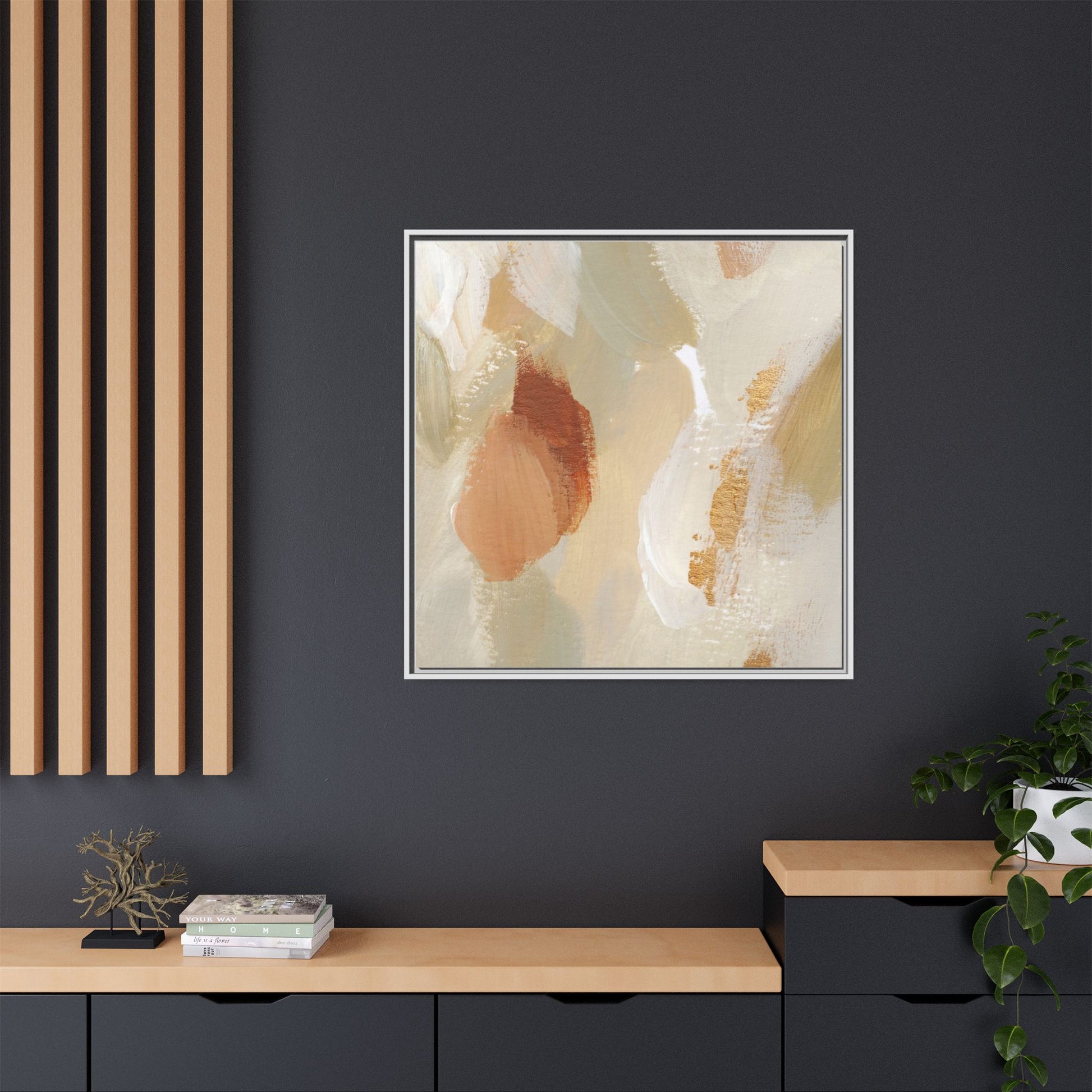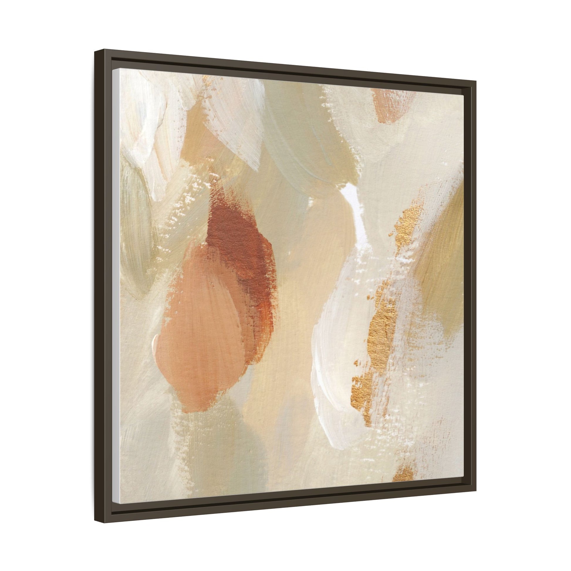 This abstract painting showcases a delicate composition of soft, organic shapes in muted earth tones. Warm peach, rust, cream, and golden hues blend seamlessly across the canvas, creating a gentle and ethereal landscape of color. The brushstrokes appear fluid and textured, with layers of paint creating depth and subtle variations in tone. Soft, blended edges give the artwork a dreamy and contemplative quality, reminiscent of natural forms like petals or clouds. The overall effect is a serene and harmonious abstract piece that invites viewers to explore its nuanced color palette and subtle textural details.