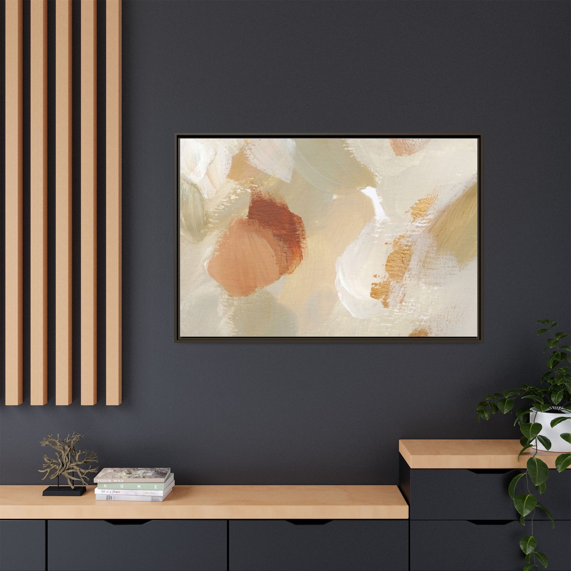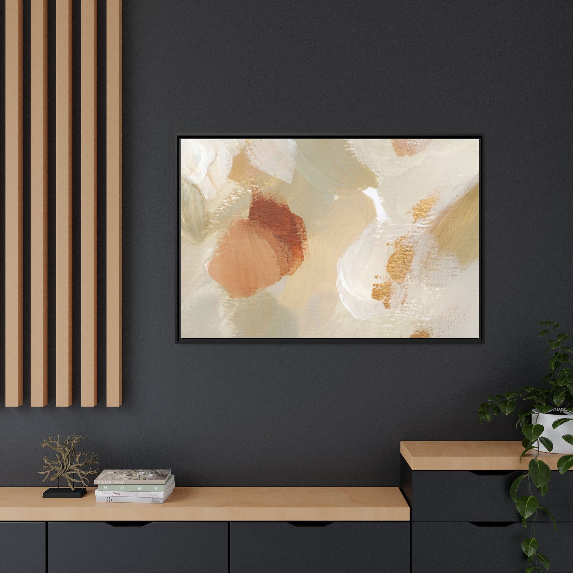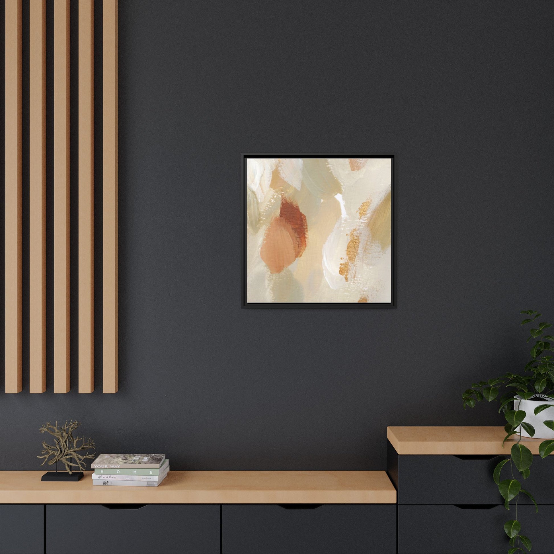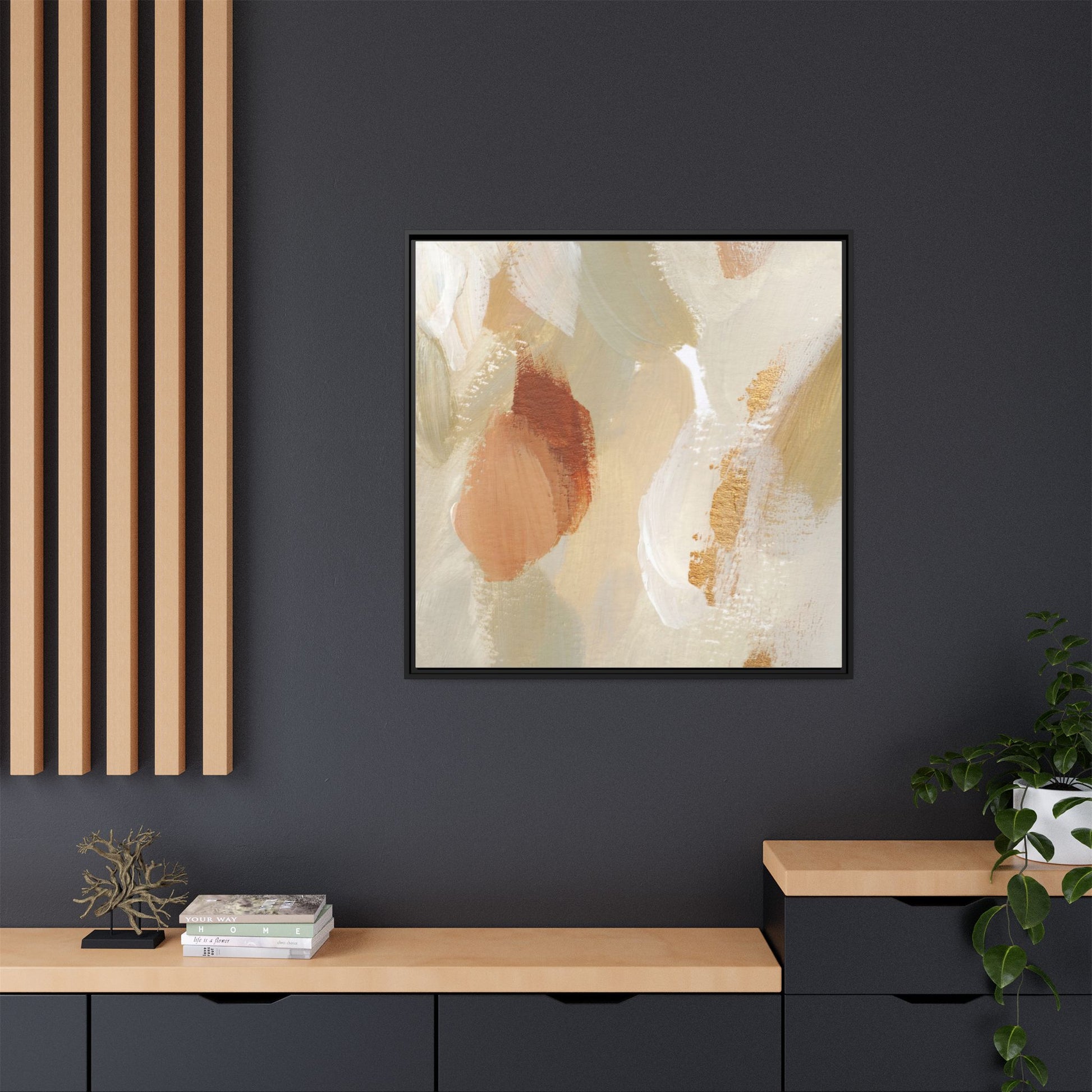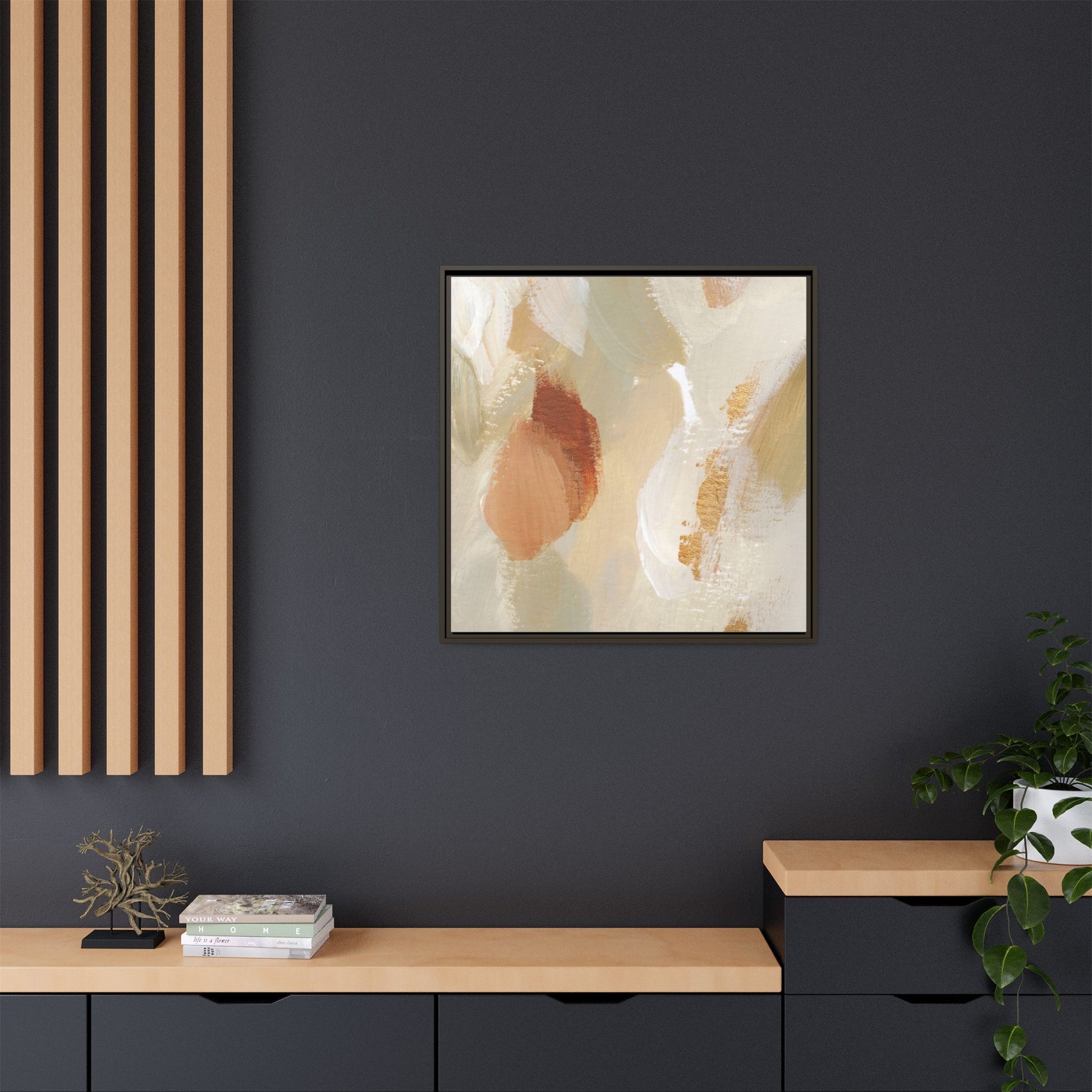 This abstract painting showcases a delicate composition of soft, organic shapes in muted earth tones. Warm peach, rust, cream, and golden hues blend seamlessly across the canvas, creating a gentle and ethereal landscape of color. The brushstrokes appear fluid and textured, with layers of paint creating depth and subtle variations in tone. Soft, blended edges give the artwork a dreamy and contemplative quality, reminiscent of natural forms like petals or clouds. The overall effect is a serene and harmonious abstract piece that invites viewers to explore its nuanced color palette and subtle textural details.