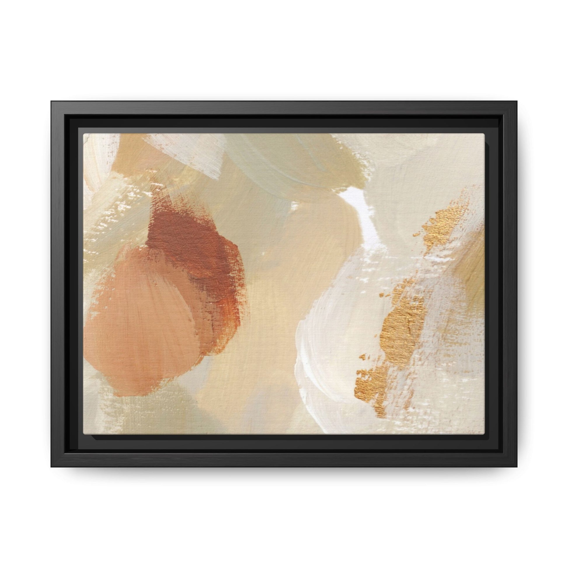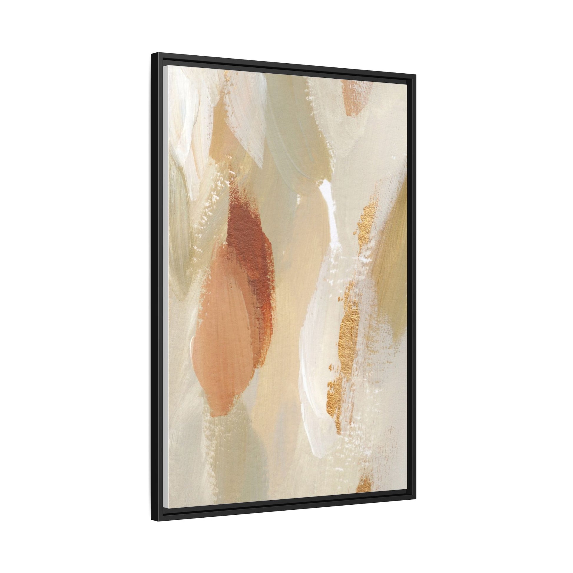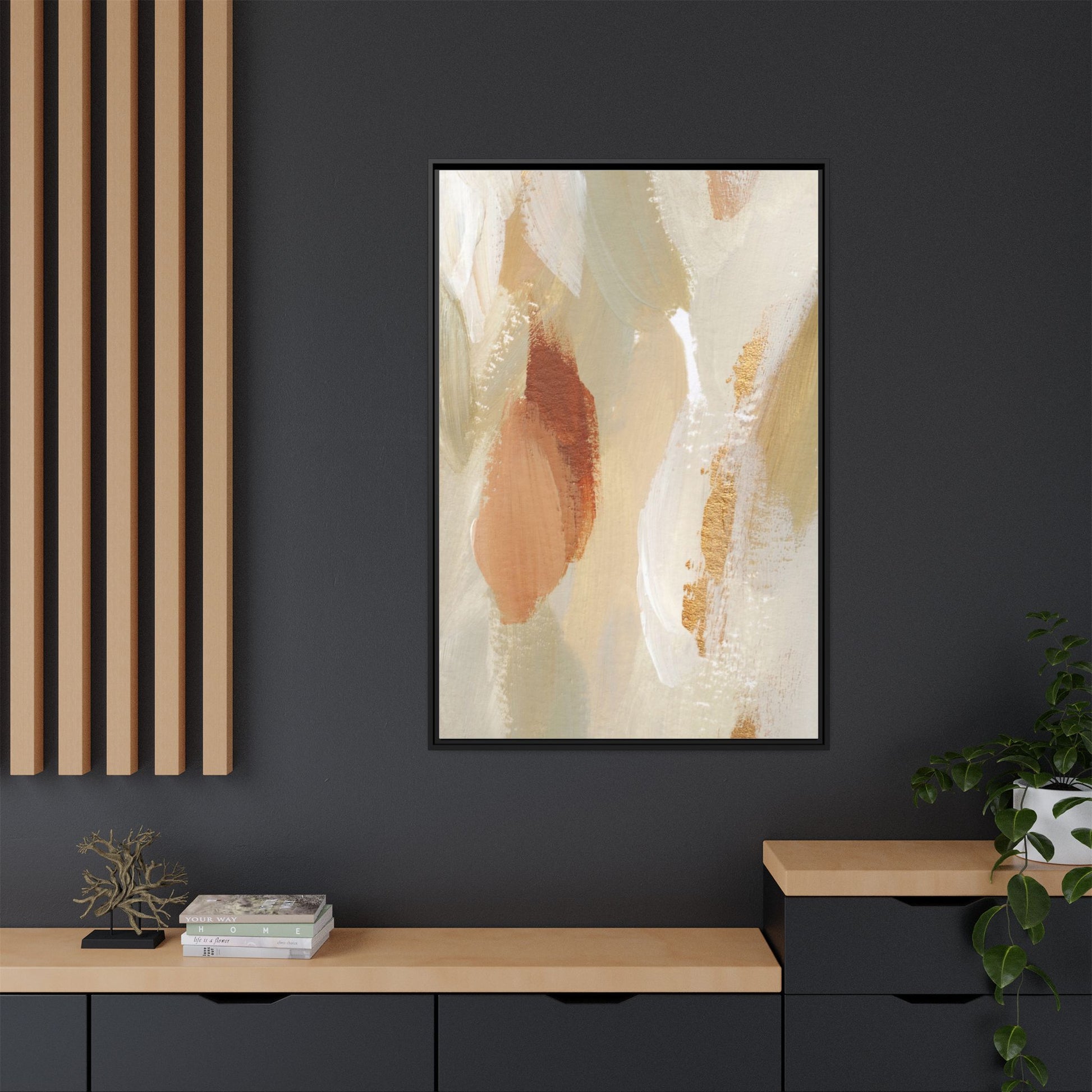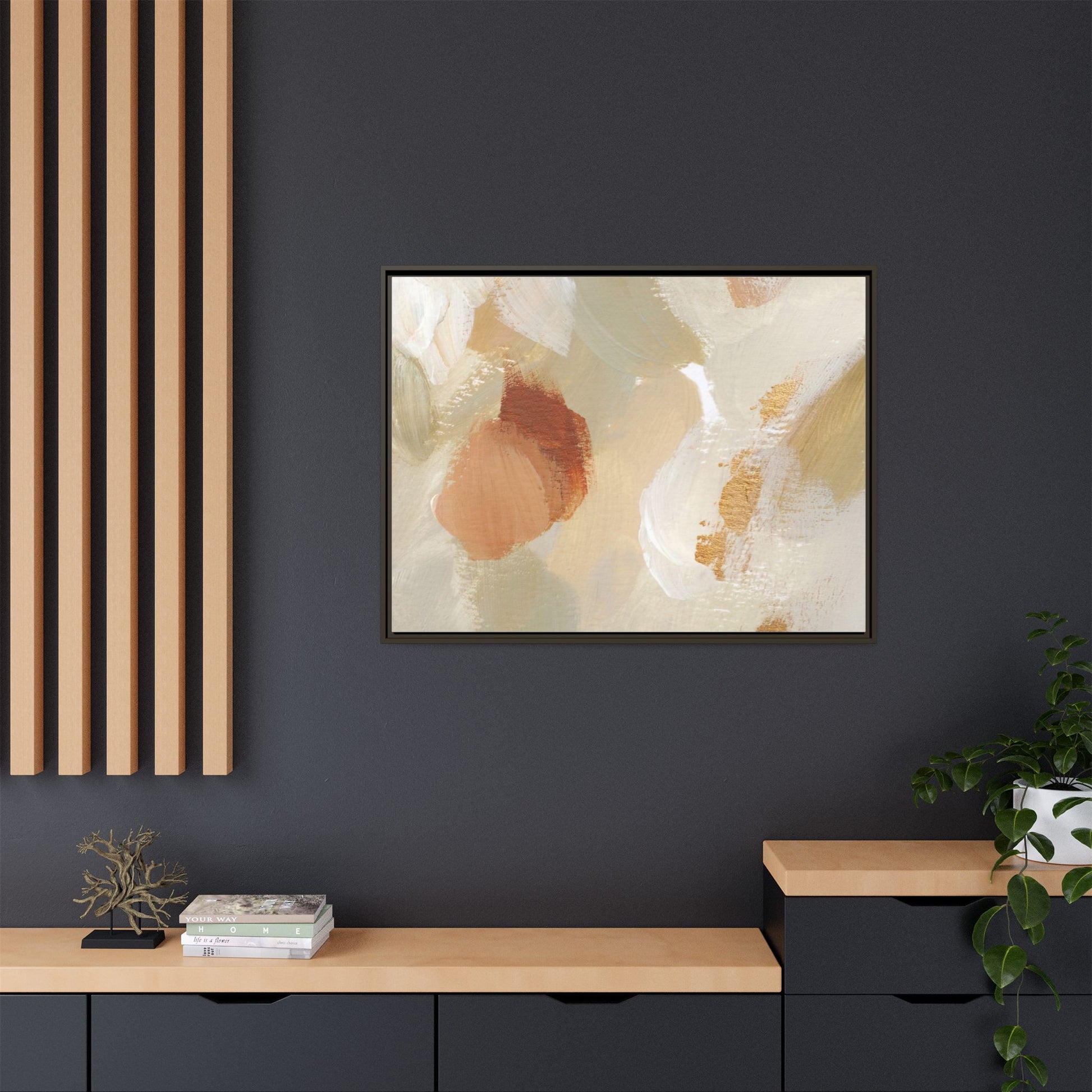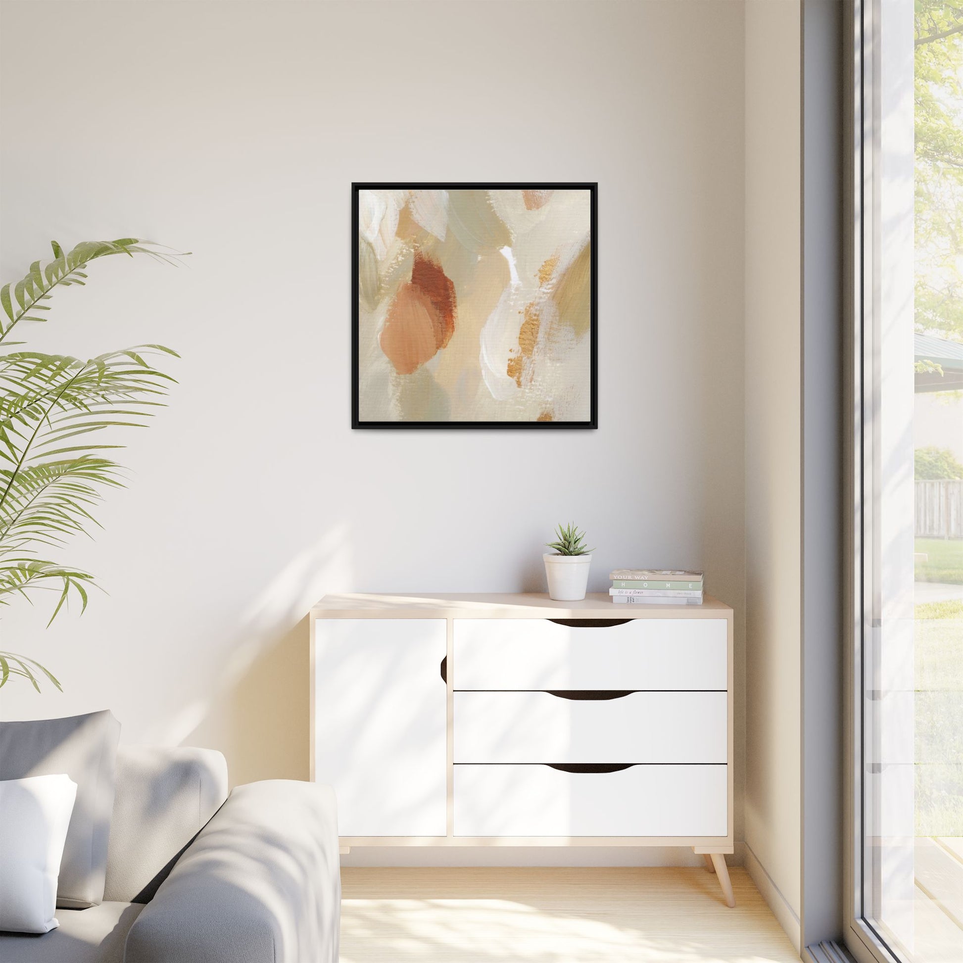 This abstract painting showcases a delicate composition of soft, organic shapes in muted earth tones. Warm peach, rust, cream, and golden hues blend seamlessly across the canvas, creating a gentle and ethereal landscape of color. The brushstrokes appear fluid and textured, with layers of paint creating depth and subtle variations in tone. Soft, blended edges give the artwork a dreamy and contemplative quality, reminiscent of natural forms like petals or clouds. The overall effect is a serene and harmonious abstract piece that invites viewers to explore its nuanced color palette and subtle textural details.