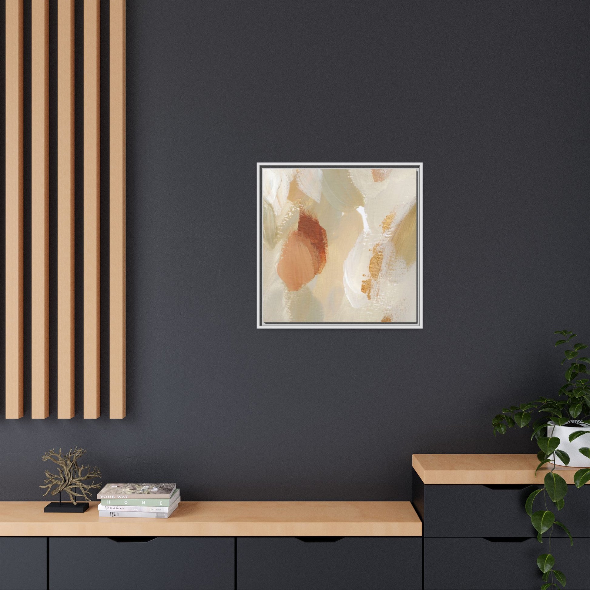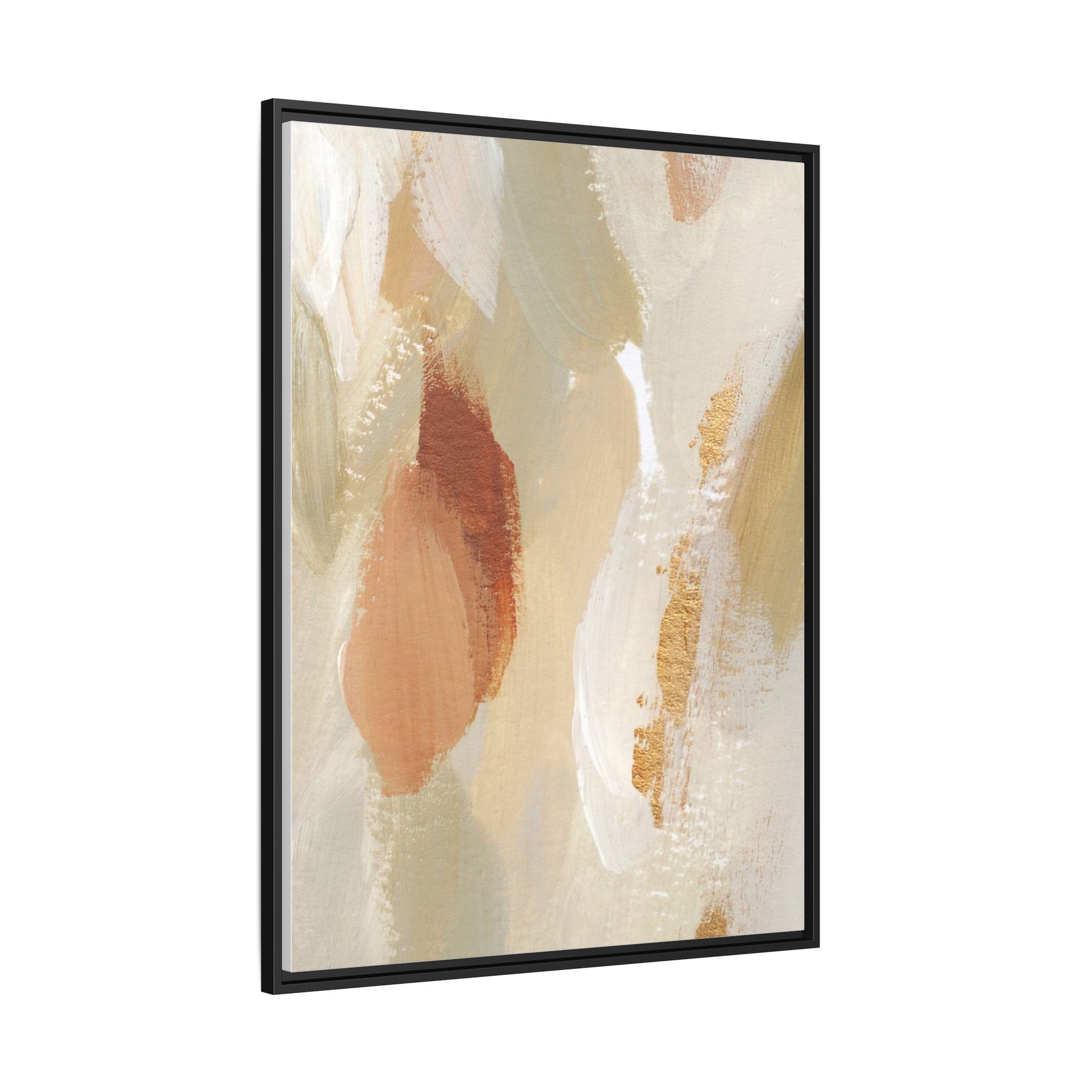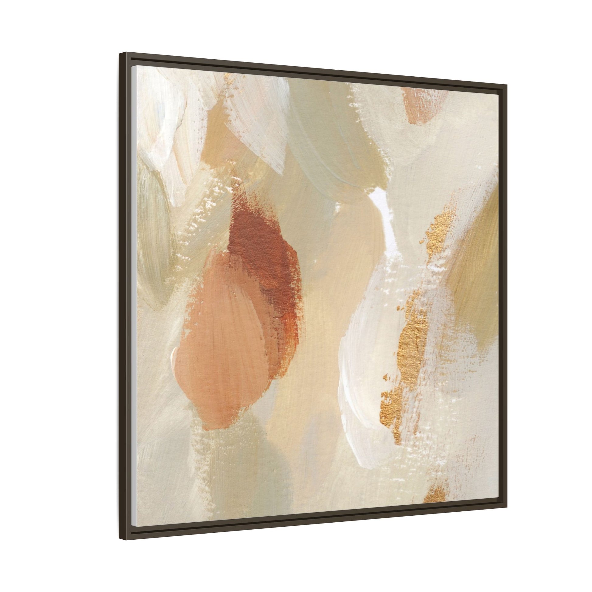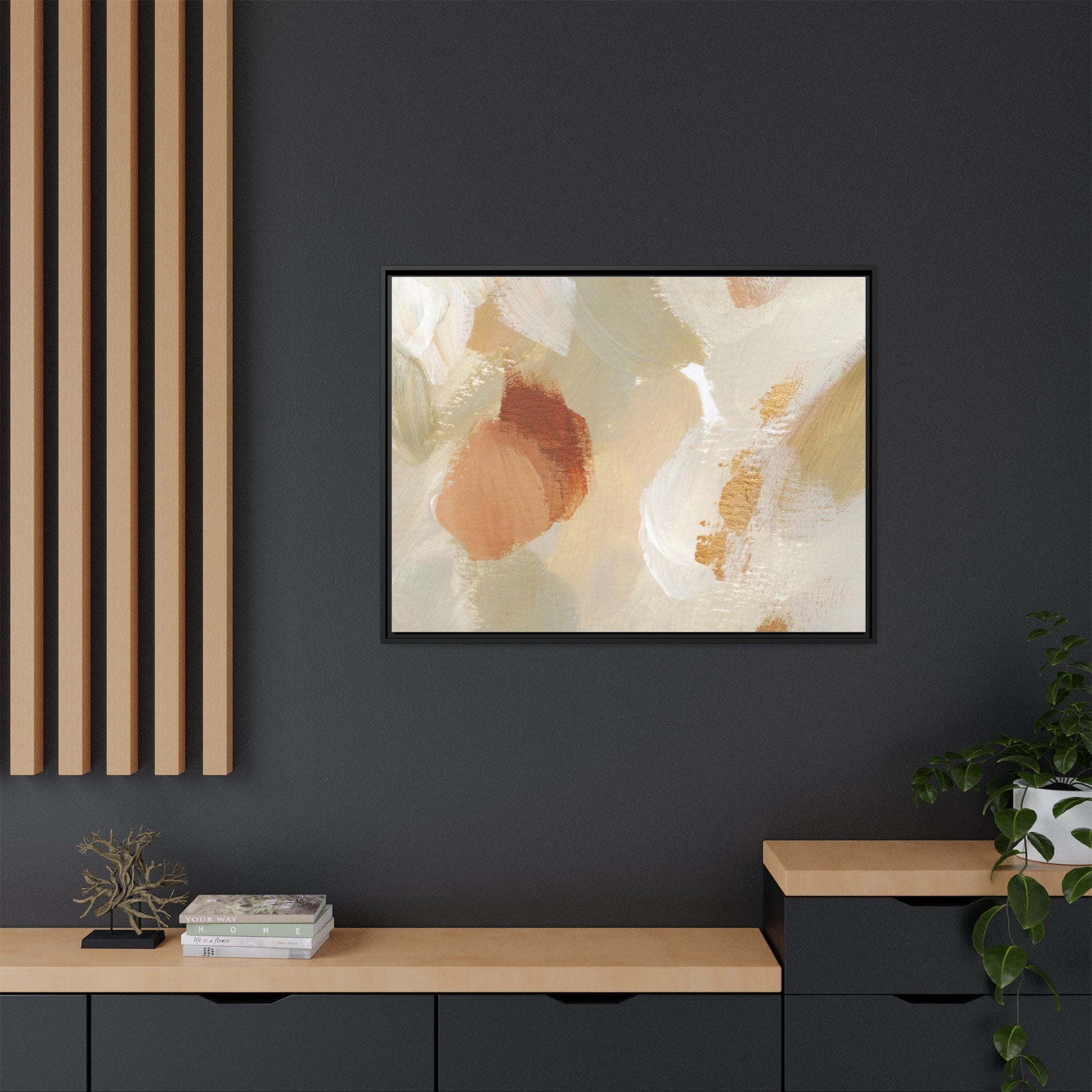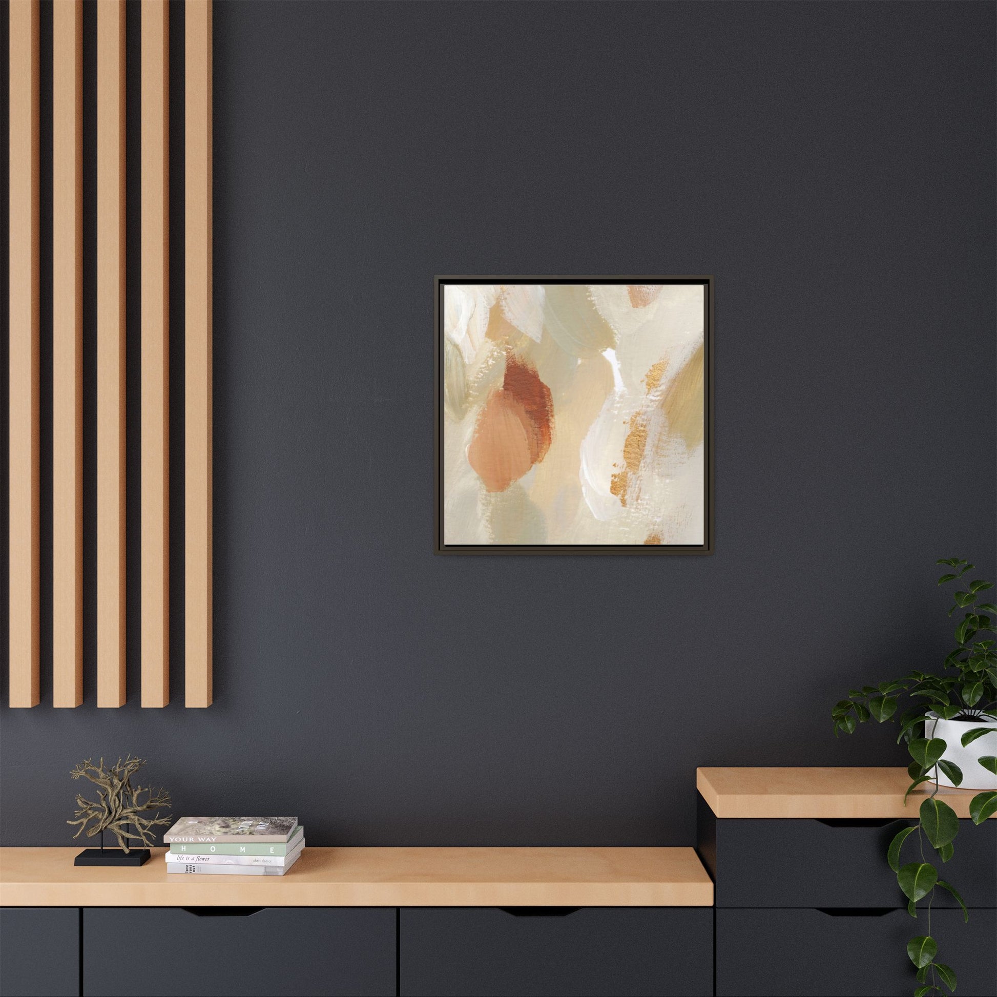 This abstract painting showcases a delicate composition of soft, organic shapes in muted earth tones. Warm peach, rust, cream, and golden hues blend seamlessly across the canvas, creating a gentle and ethereal landscape of color. The brushstrokes appear fluid and textured, with layers of paint creating depth and subtle variations in tone. Soft, blended edges give the artwork a dreamy and contemplative quality, reminiscent of natural forms like petals or clouds. The overall effect is a serene and harmonious abstract piece that invites viewers to explore its nuanced color palette and subtle textural details.