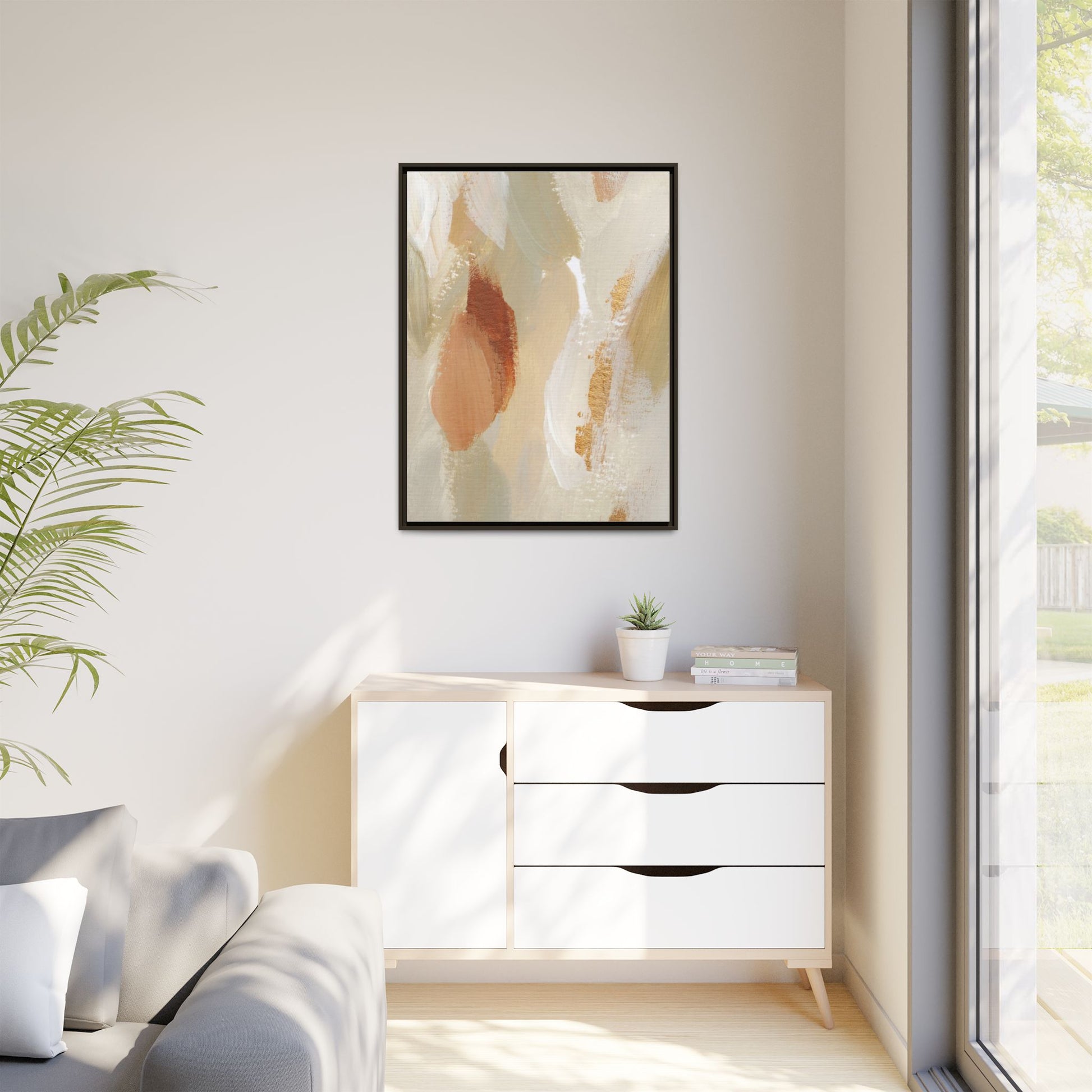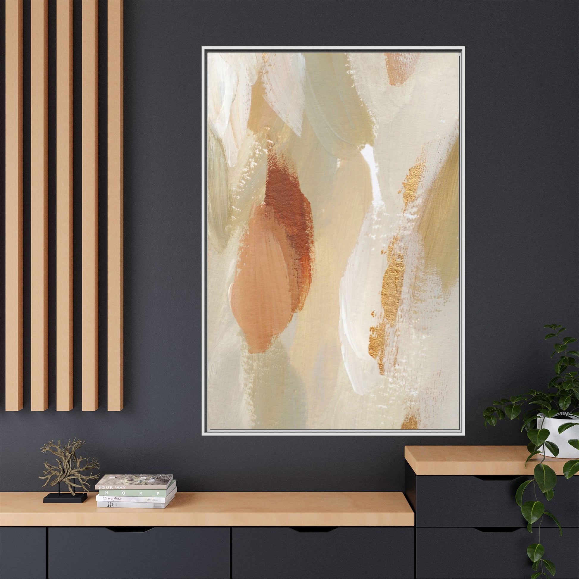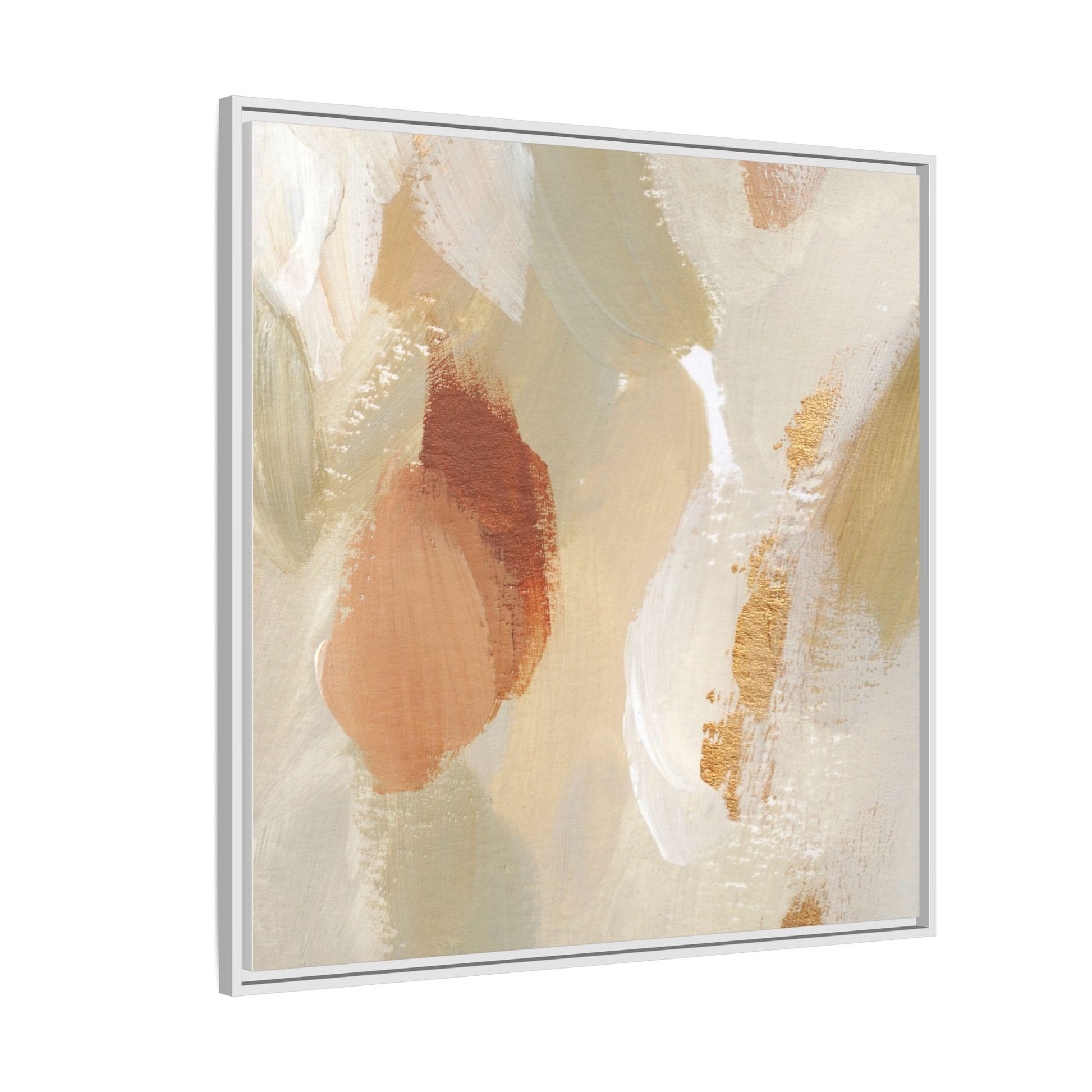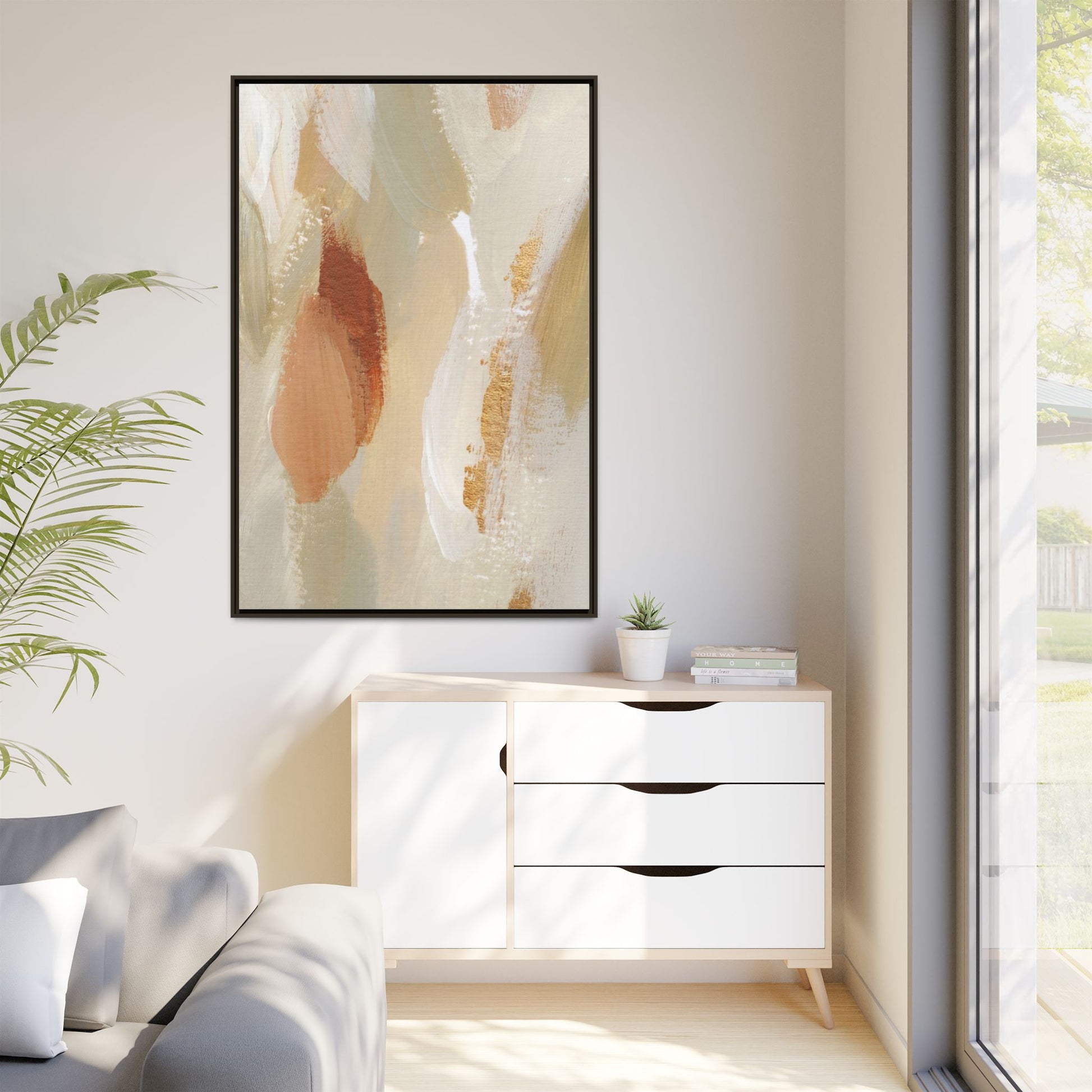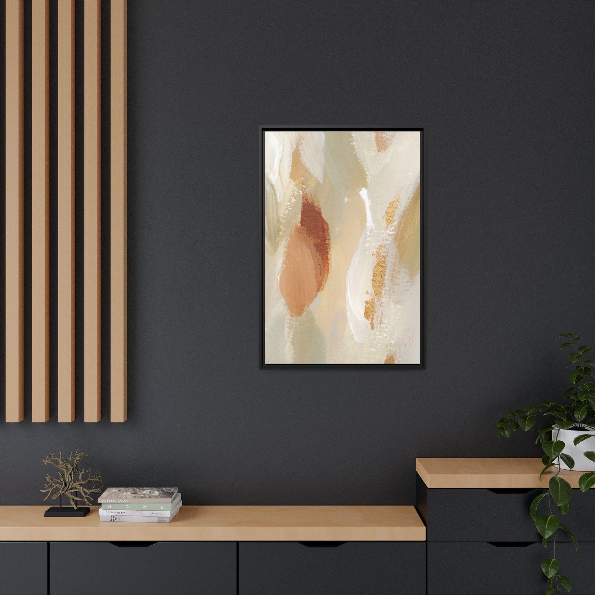 This abstract painting showcases a delicate composition of soft, organic shapes in muted earth tones. Warm peach, rust, cream, and golden hues blend seamlessly across the canvas, creating a gentle and ethereal landscape of color. The brushstrokes appear fluid and textured, with layers of paint creating depth and subtle variations in tone. Soft, blended edges give the artwork a dreamy and contemplative quality, reminiscent of natural forms like petals or clouds. The overall effect is a serene and harmonious abstract piece that invites viewers to explore its nuanced color palette and subtle textural details.