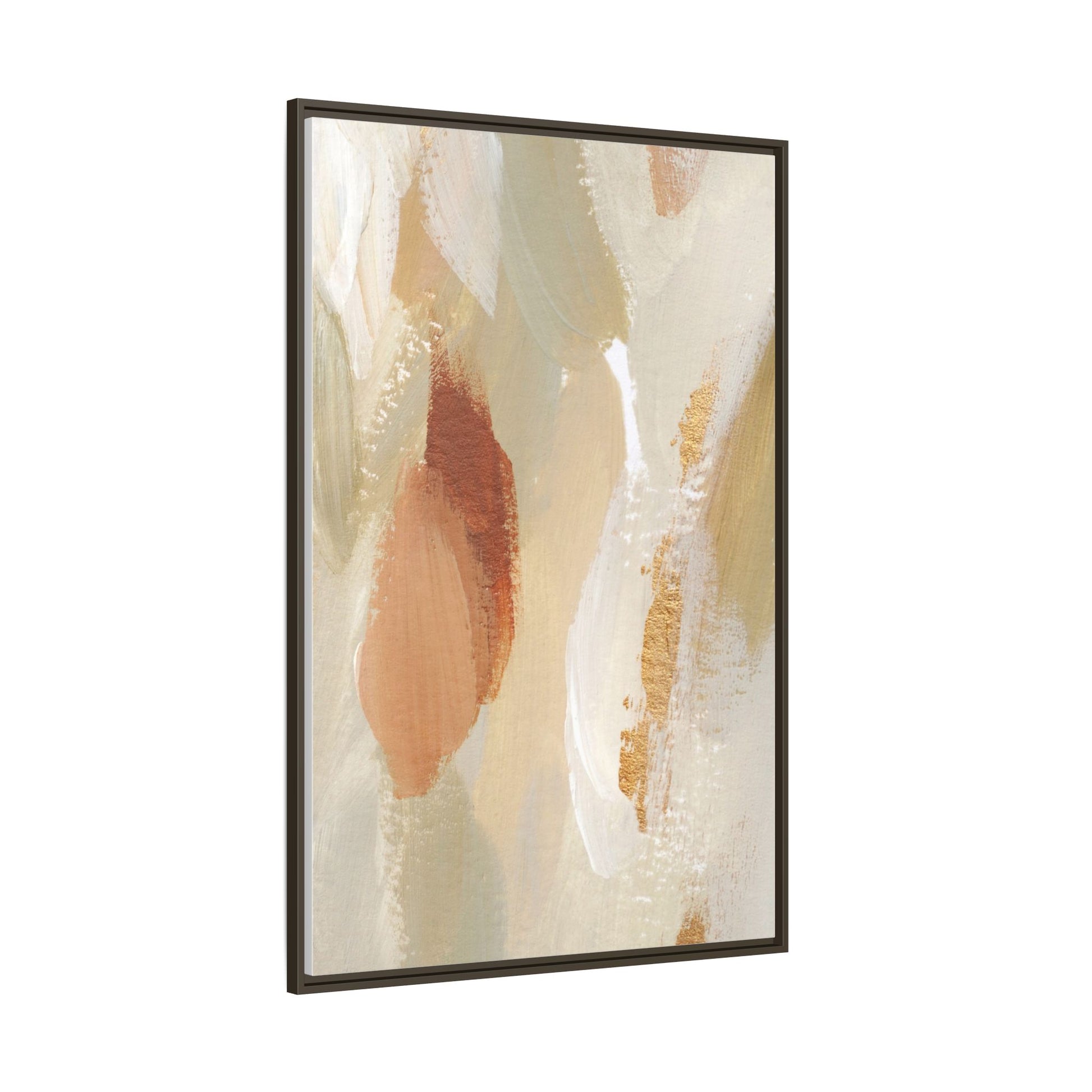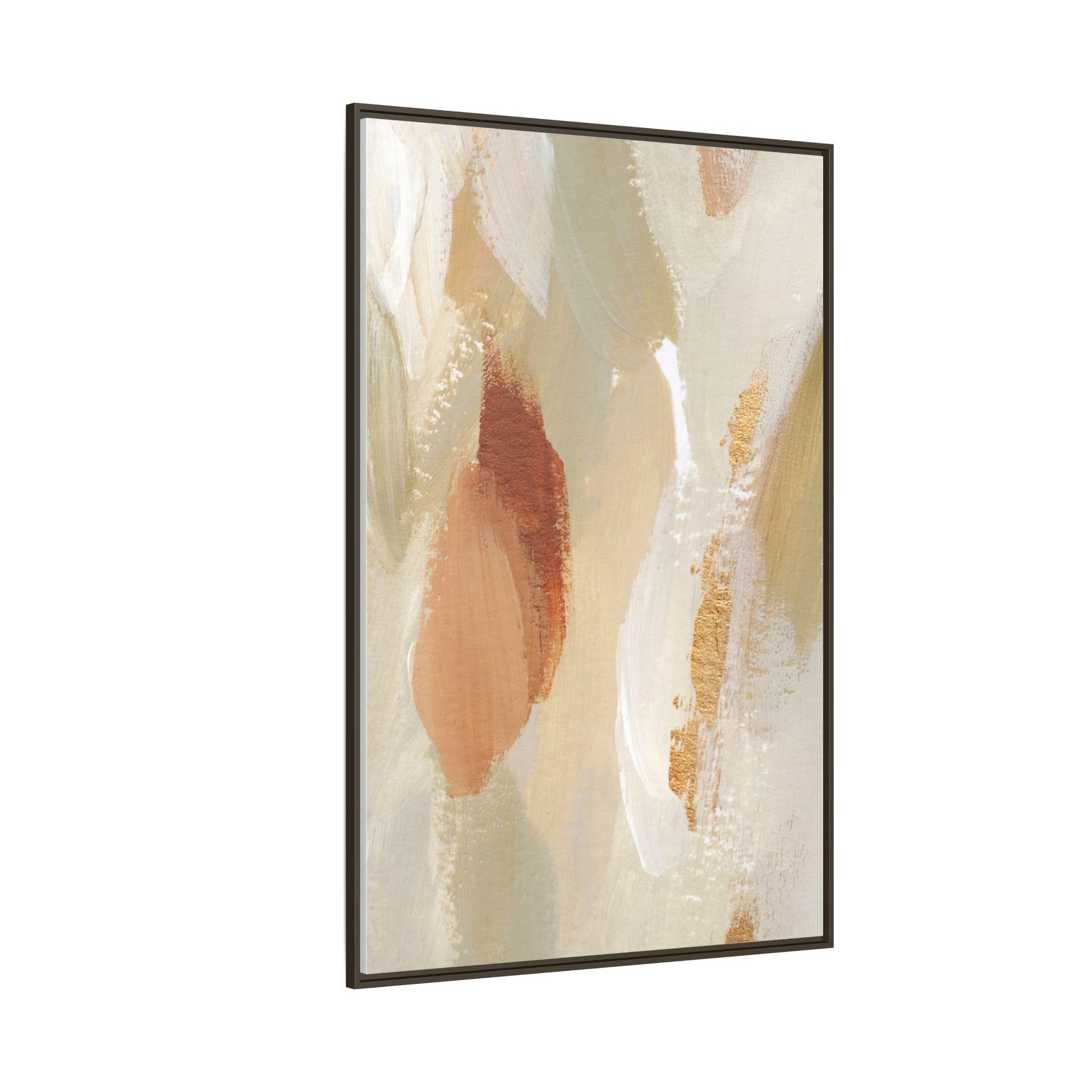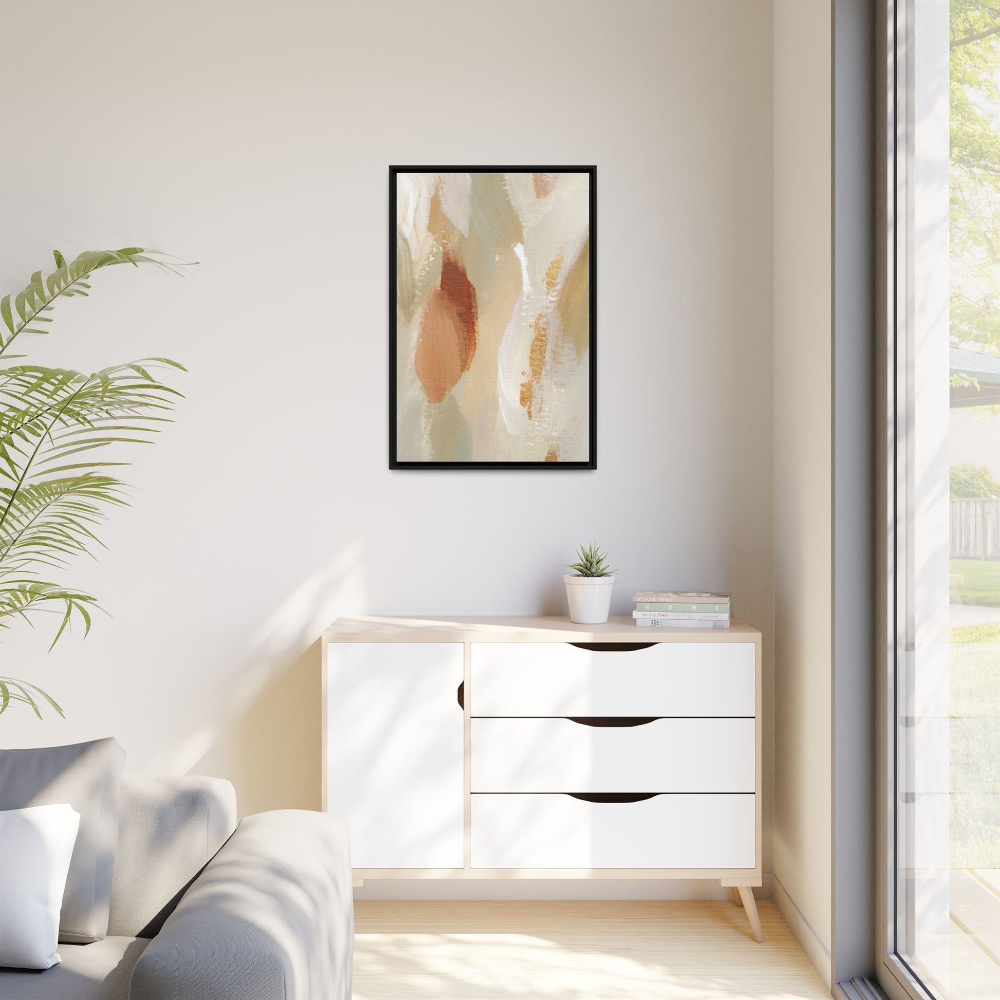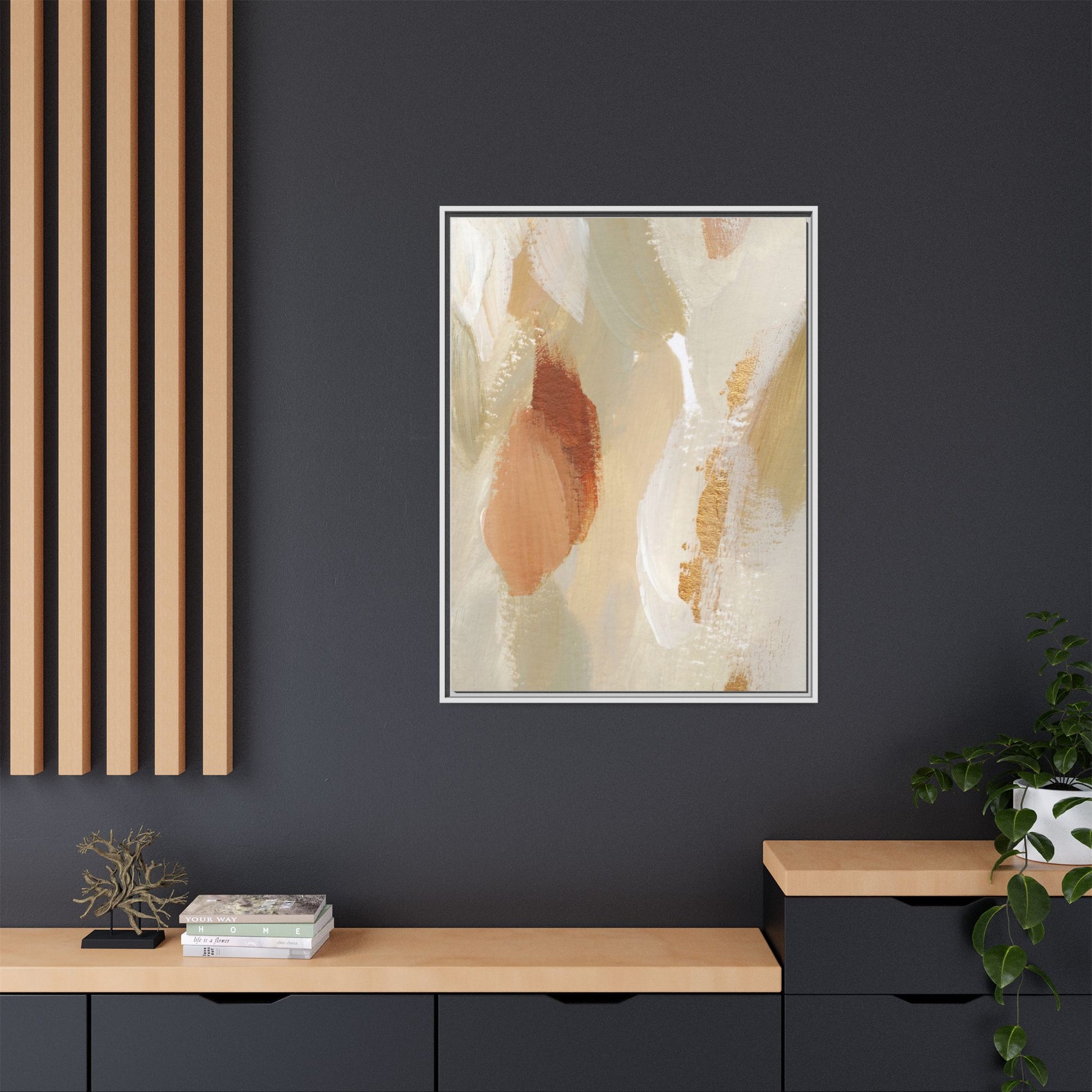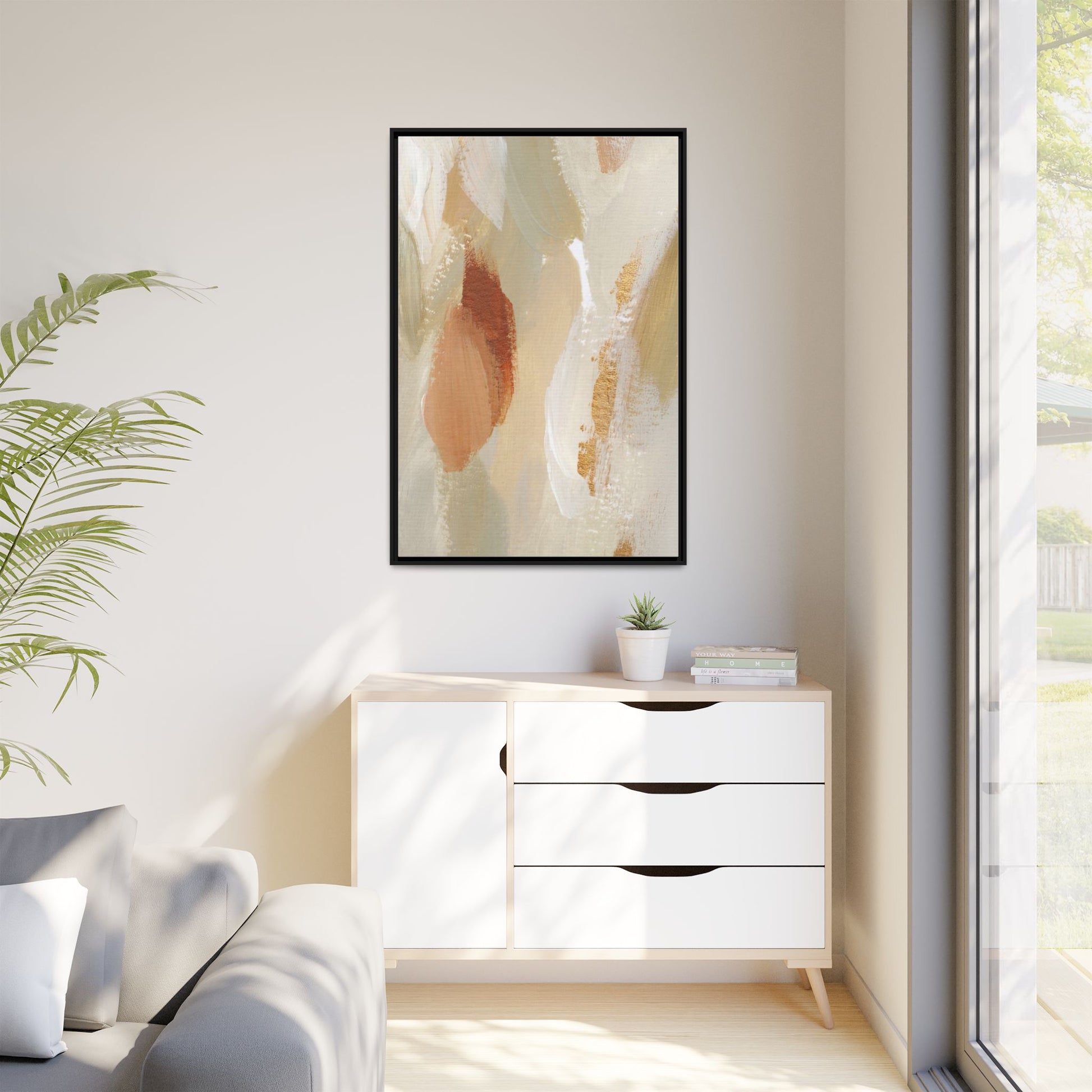 This abstract painting showcases a delicate composition of soft, organic shapes in muted earth tones. Warm peach, rust, cream, and golden hues blend seamlessly across the canvas, creating a gentle and ethereal landscape of color. The brushstrokes appear fluid and textured, with layers of paint creating depth and subtle variations in tone. Soft, blended edges give the artwork a dreamy and contemplative quality, reminiscent of natural forms like petals or clouds. The overall effect is a serene and harmonious abstract piece that invites viewers to explore its nuanced color palette and subtle textural details.