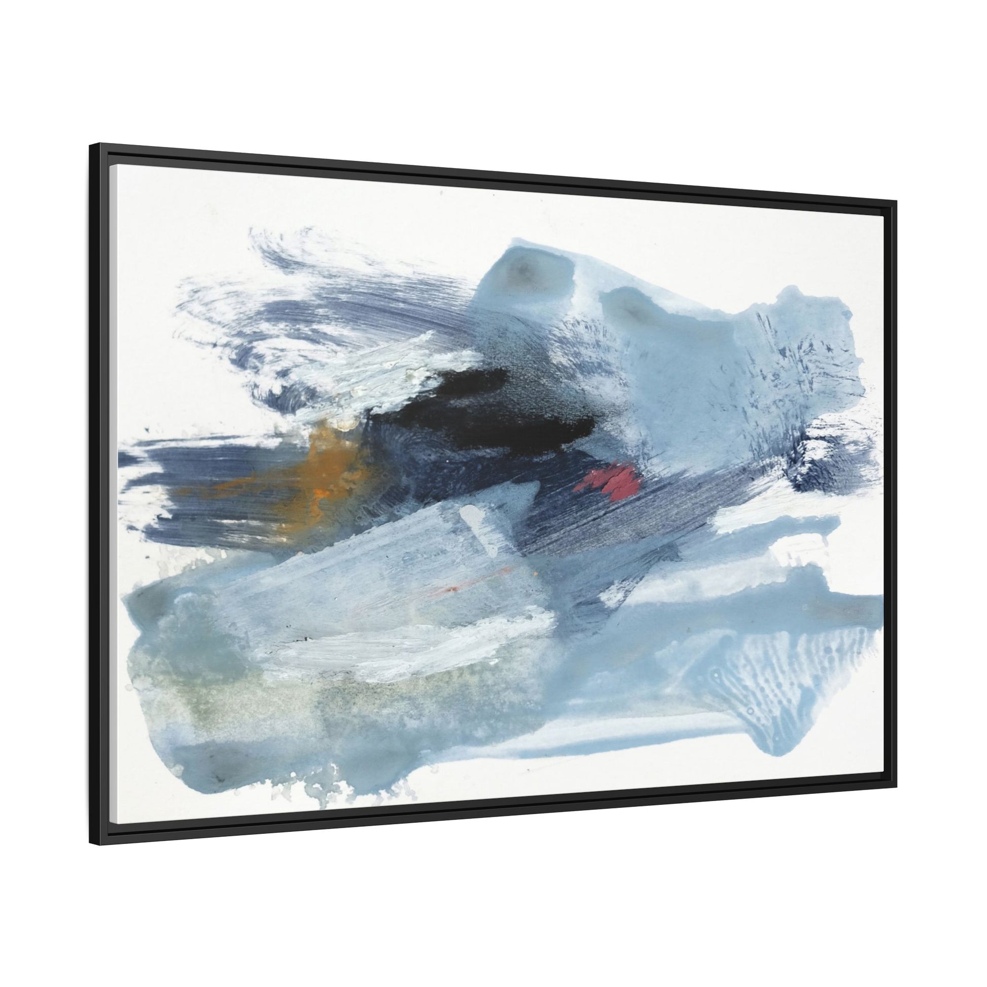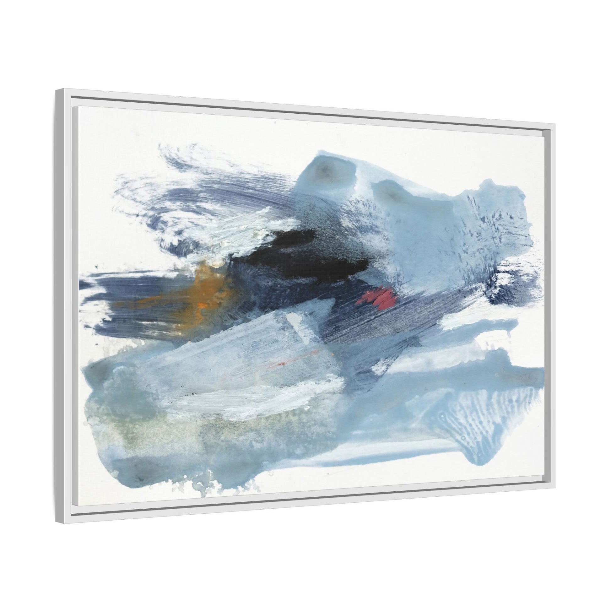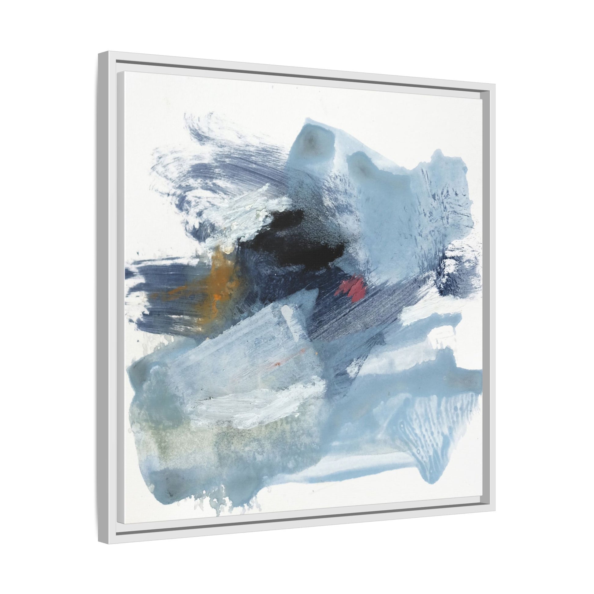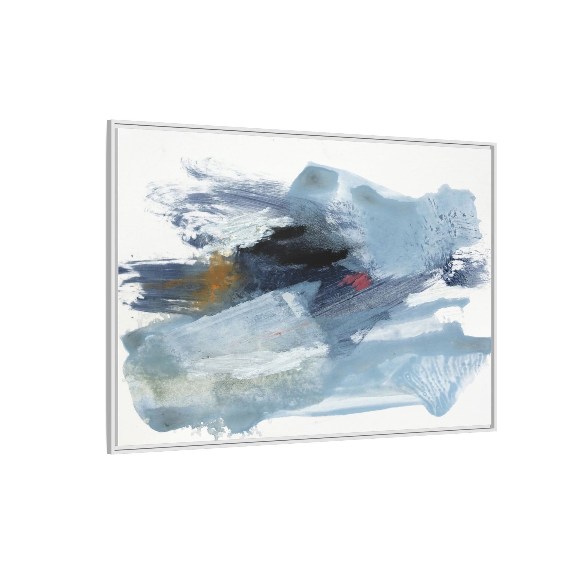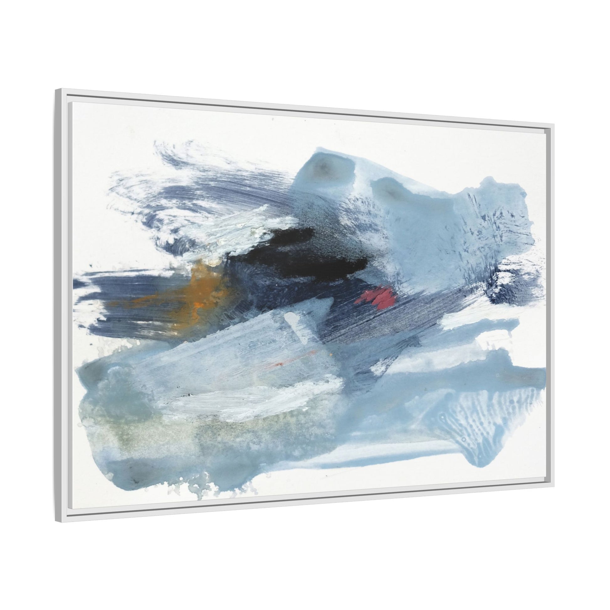 This captivating abstract watercolor painting features a dynamic composition of cool blue, white, and gray tones, interspersed with hints of golden yellow and deep red accents. The artwork showcases fluid, sweeping brushstrokes that create a sense of movement and depth, with layers of translucent and opaque paint blending and overlapping. Textural elements emerge through varied paint application techniques, including soft washes, sharp brush marks, and areas of granulated pigment that add visual complexity. The color palette evokes a sense of icy landscapes or turbulent seascapes, with the abstract forms suggesting fragmented shapes reminiscent of glaciers, waves, or atmospheric phenomena. The overall effect is ethereal and contemplative, inviting viewers to explore the nuanced interactions of color, texture, and form within the painting.