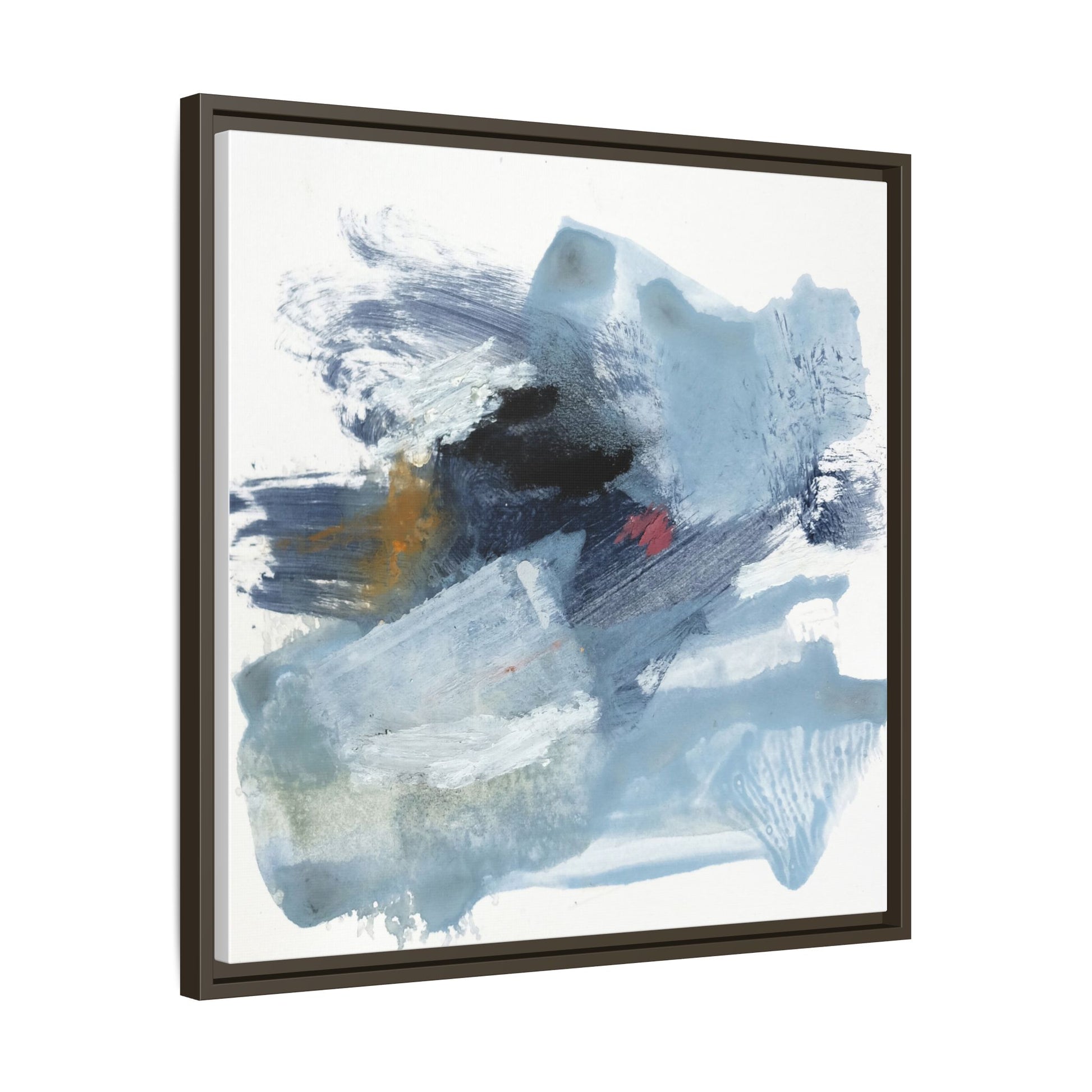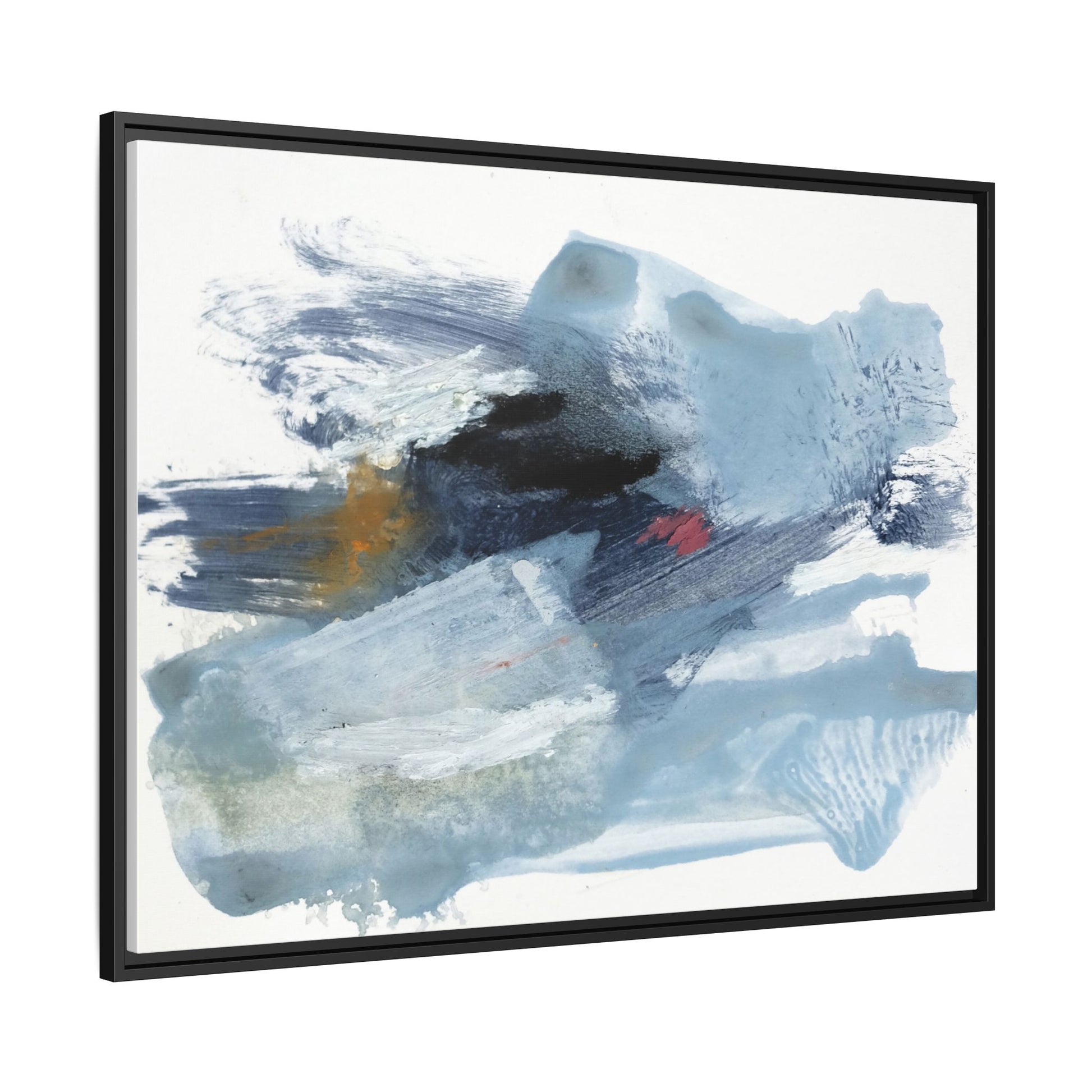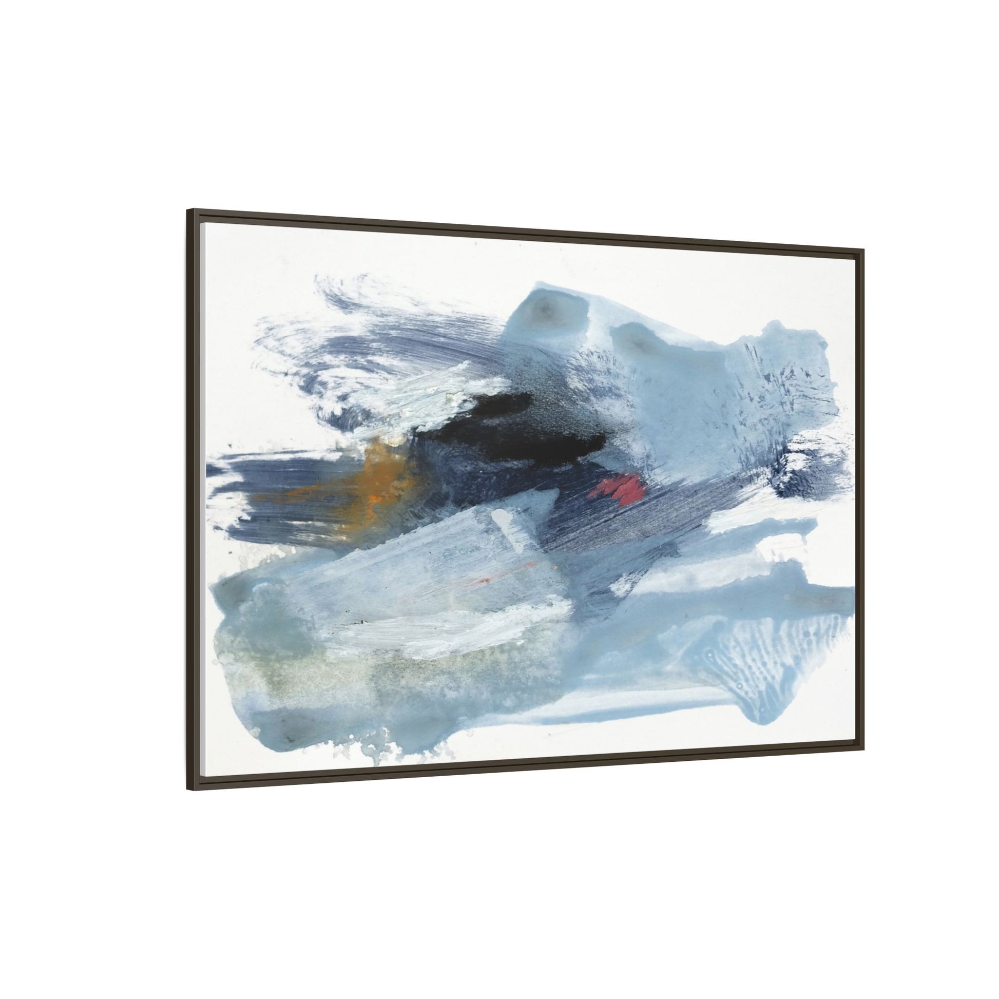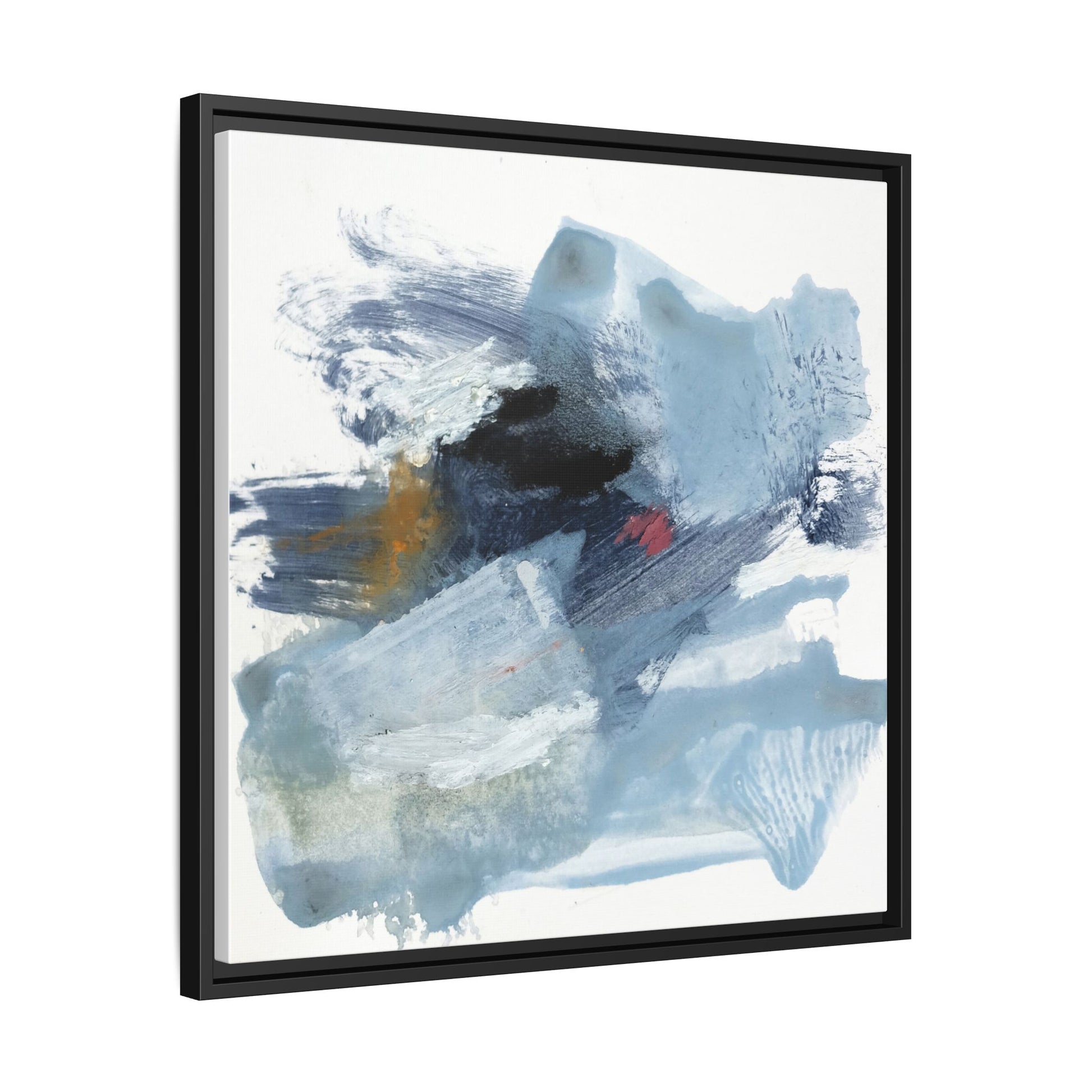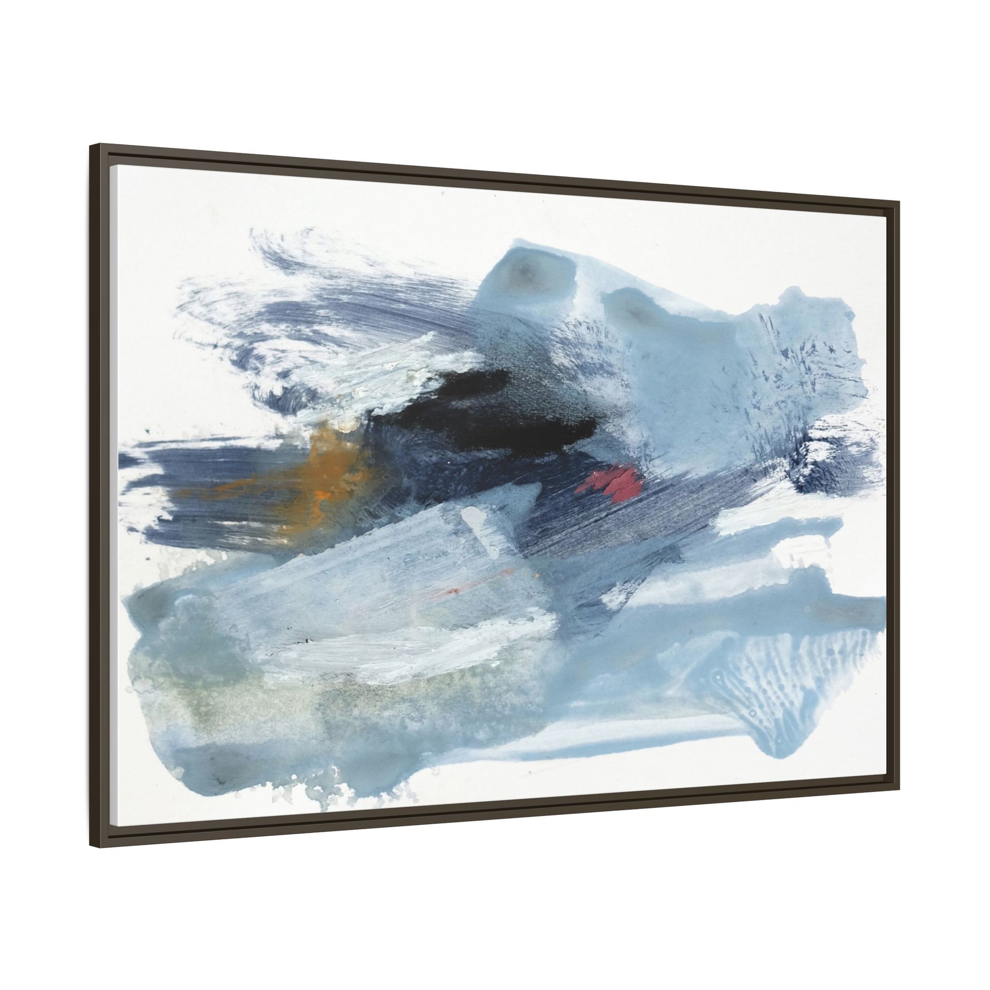 This captivating abstract watercolor painting features a dynamic composition of cool blue, white, and gray tones, interspersed with hints of golden yellow and deep red accents. The artwork showcases fluid, sweeping brushstrokes that create a sense of movement and depth, with layers of translucent and opaque paint blending and overlapping. Textural elements emerge through varied paint application techniques, including soft washes, sharp brush marks, and areas of granulated pigment that add visual complexity. The color palette evokes a sense of icy landscapes or turbulent seascapes, with the abstract forms suggesting fragmented shapes reminiscent of glaciers, waves, or atmospheric phenomena. The overall effect is ethereal and contemplative, inviting viewers to explore the nuanced interactions of color, texture, and form within the painting.