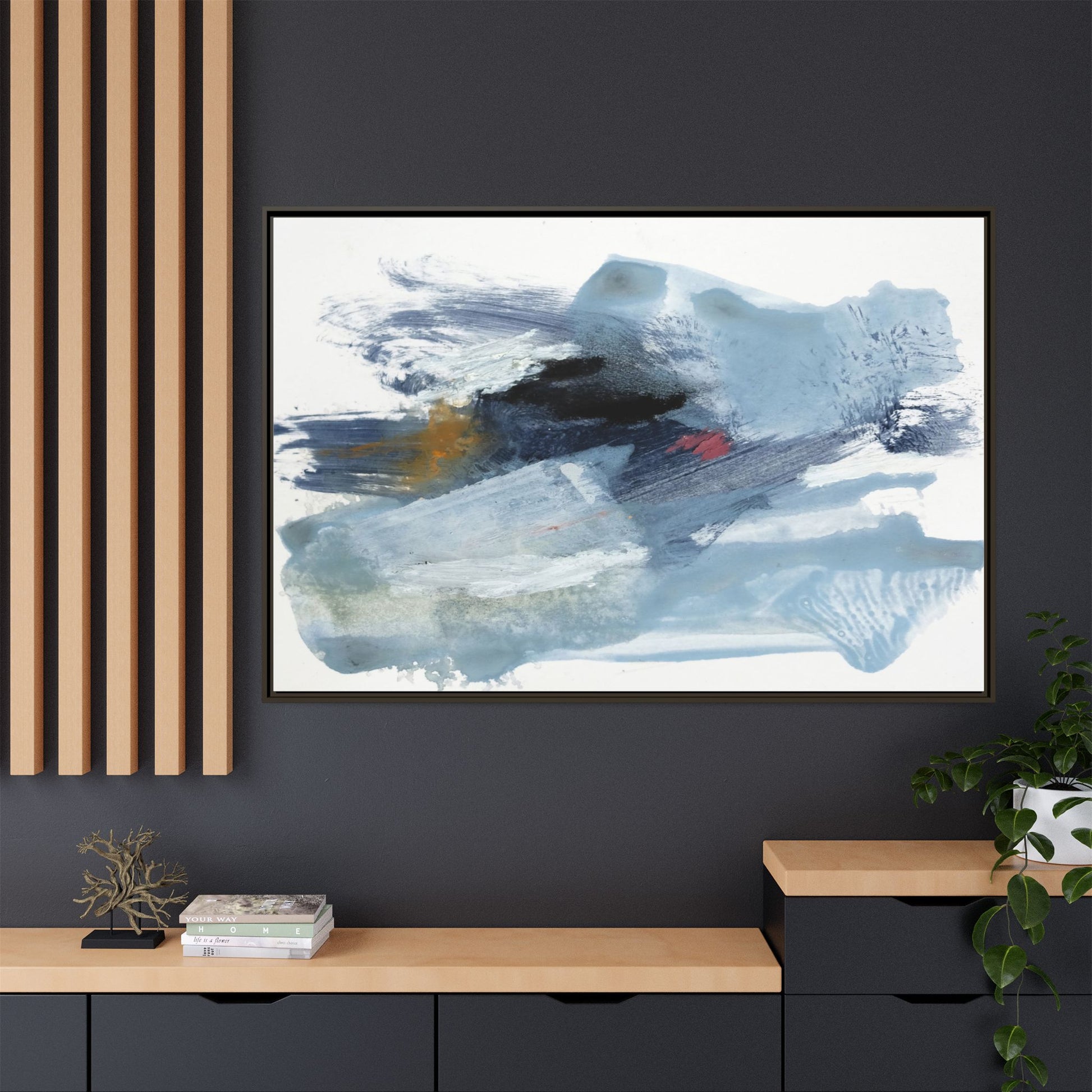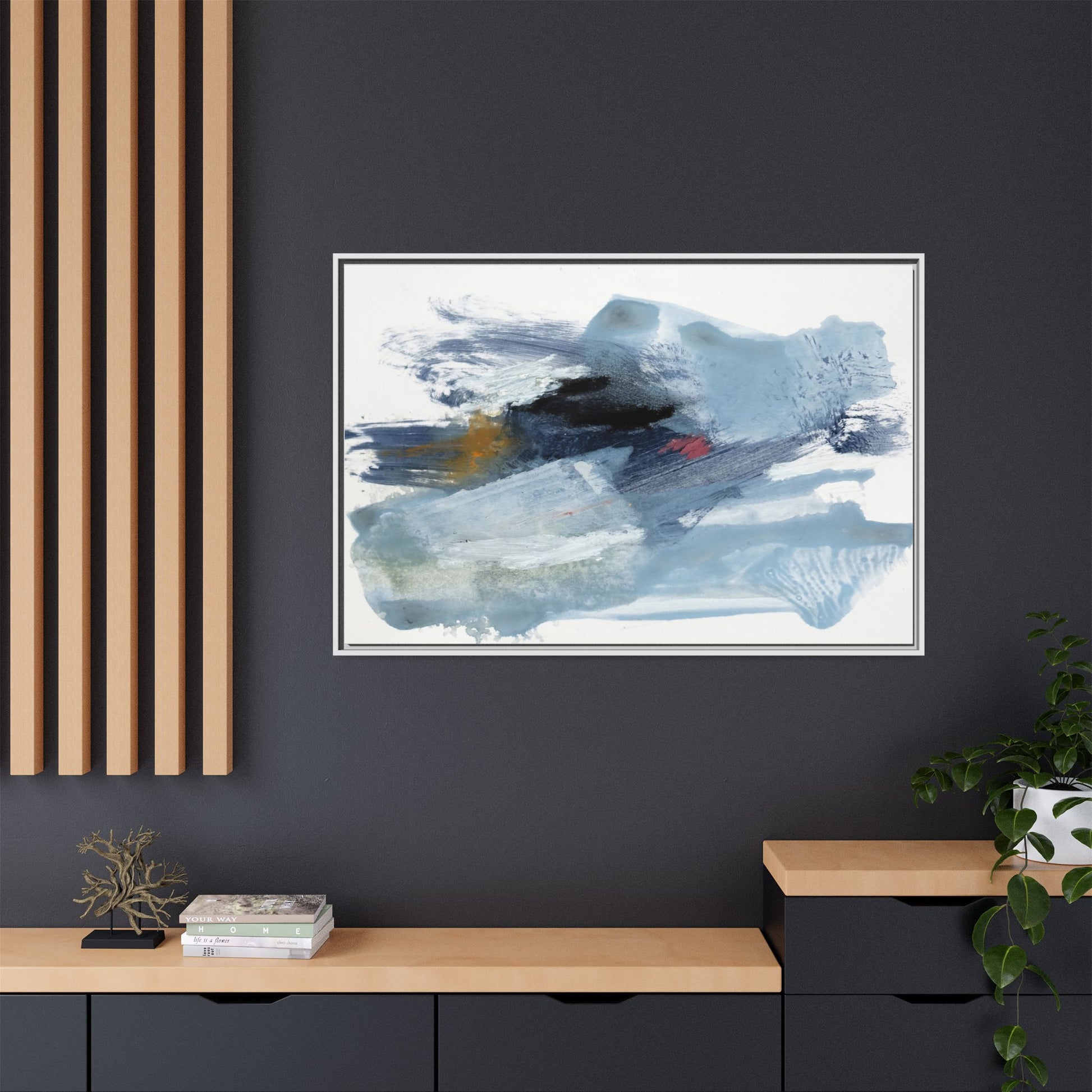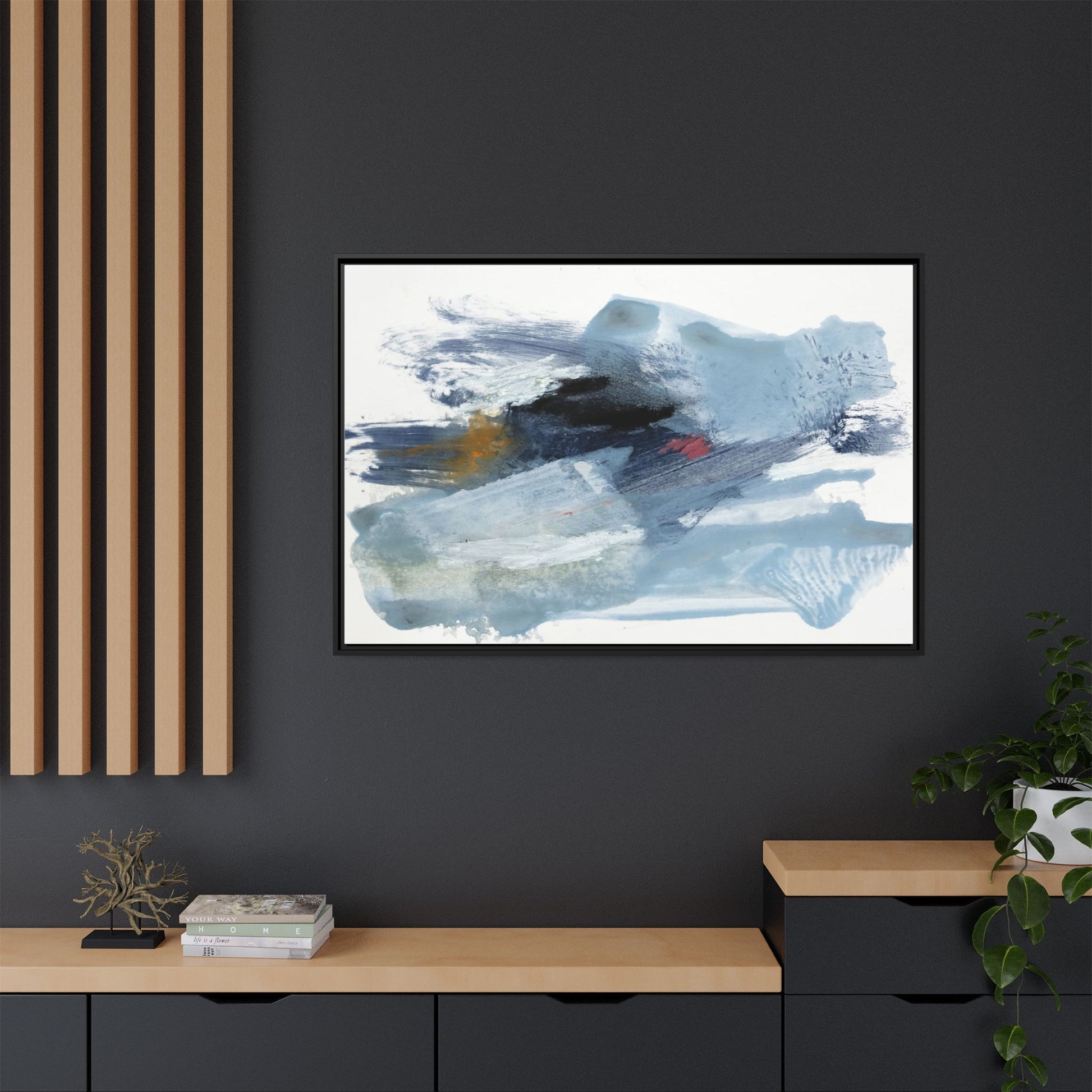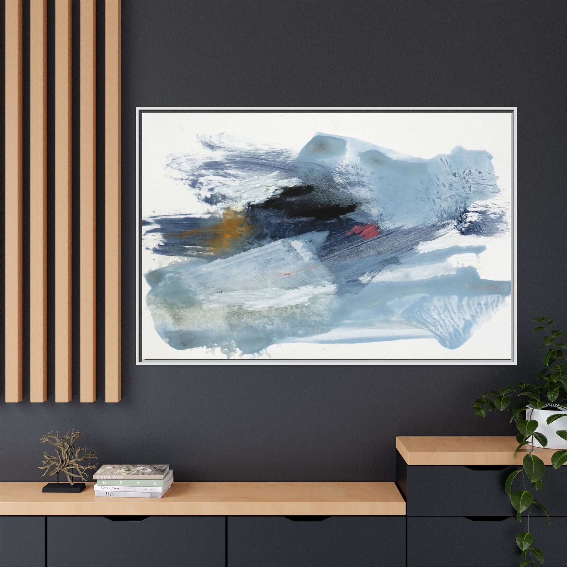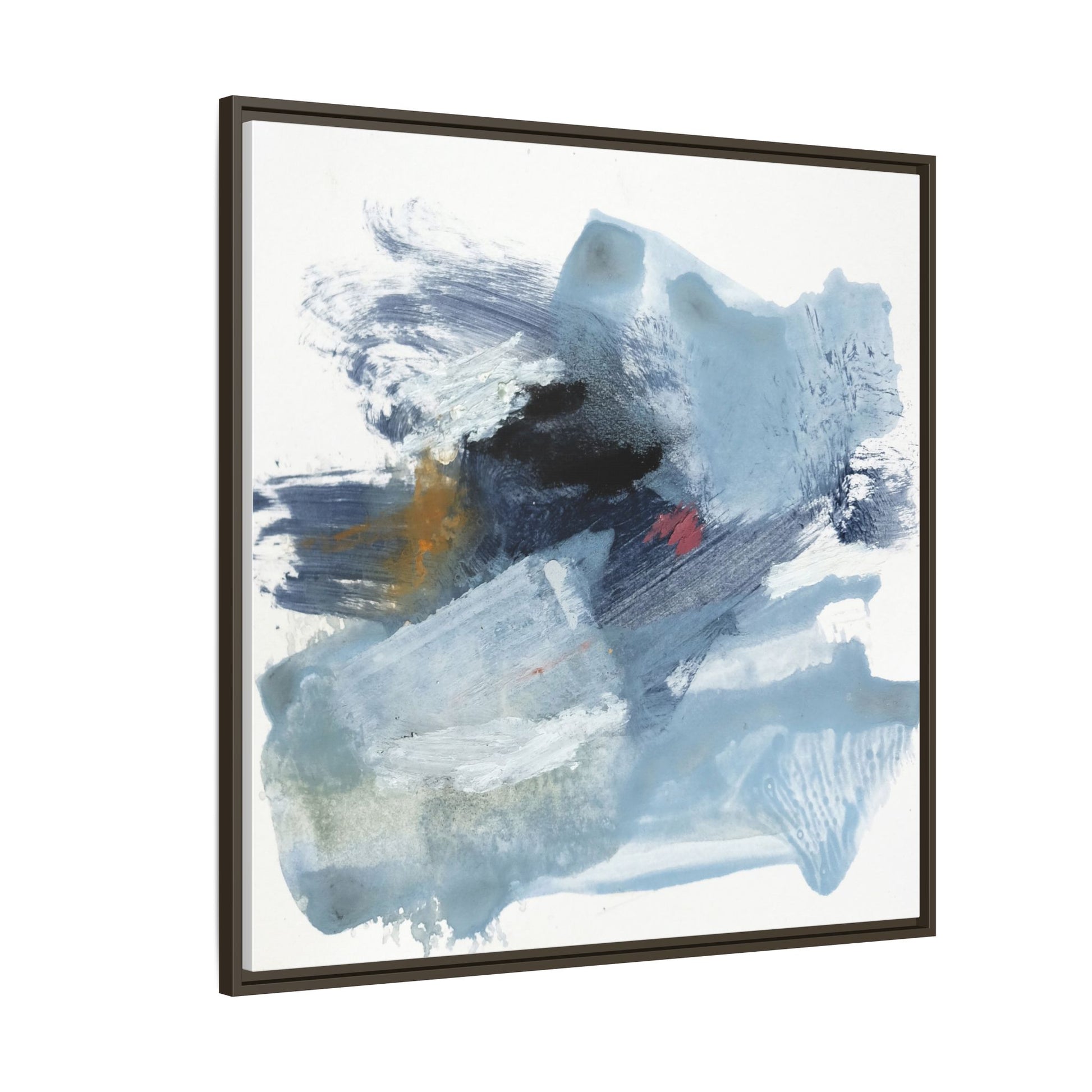 This captivating abstract watercolor painting features a dynamic composition of cool blue, white, and gray tones, interspersed with hints of golden yellow and deep red accents. The artwork showcases fluid, sweeping brushstrokes that create a sense of movement and depth, with layers of translucent and opaque paint blending and overlapping. Textural elements emerge through varied paint application techniques, including soft washes, sharp brush marks, and areas of granulated pigment that add visual complexity. The color palette evokes a sense of icy landscapes or turbulent seascapes, with the abstract forms suggesting fragmented shapes reminiscent of glaciers, waves, or atmospheric phenomena. The overall effect is ethereal and contemplative, inviting viewers to explore the nuanced interactions of color, texture, and form within the painting.