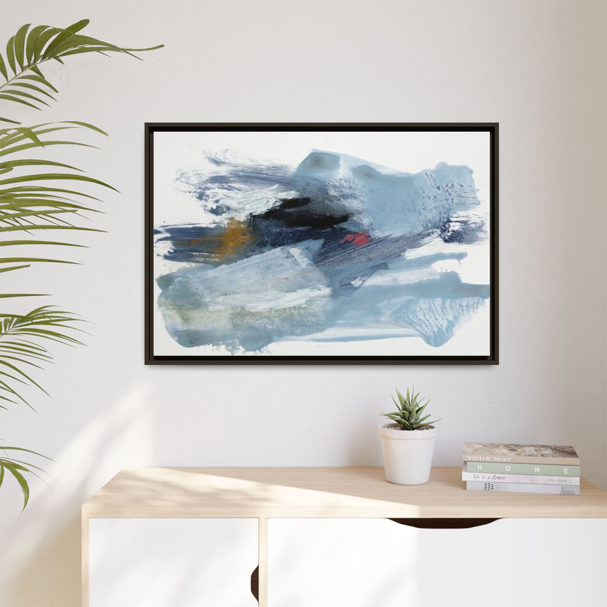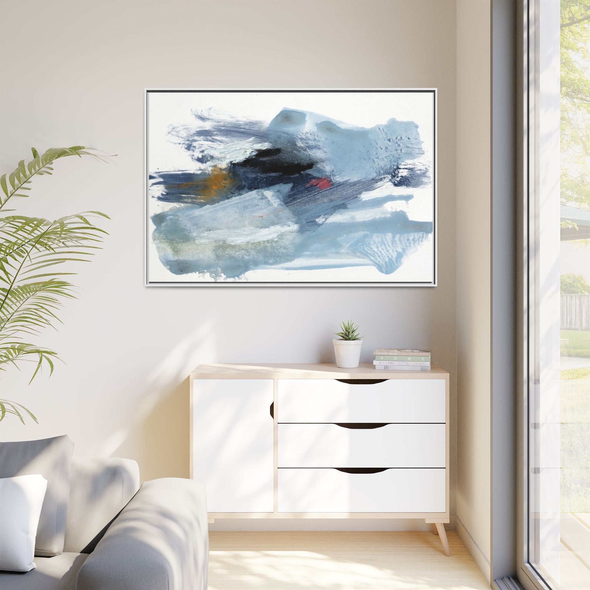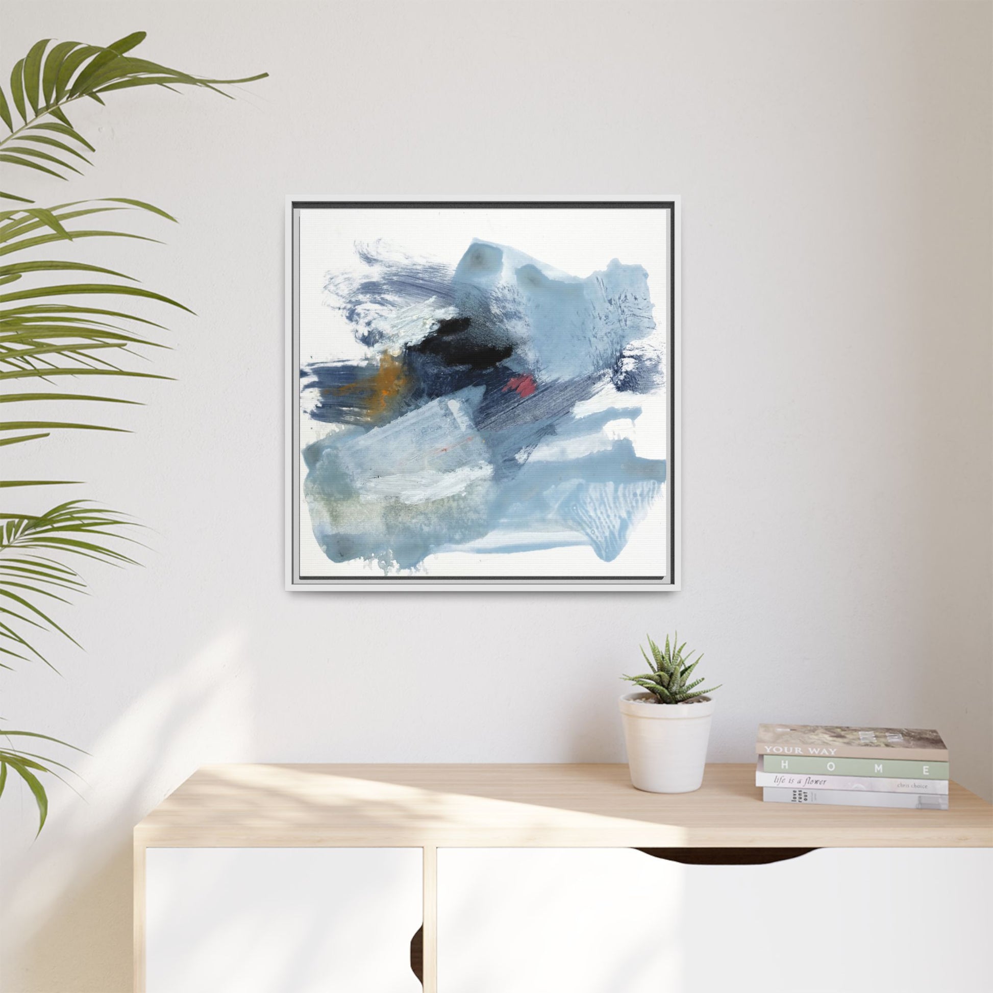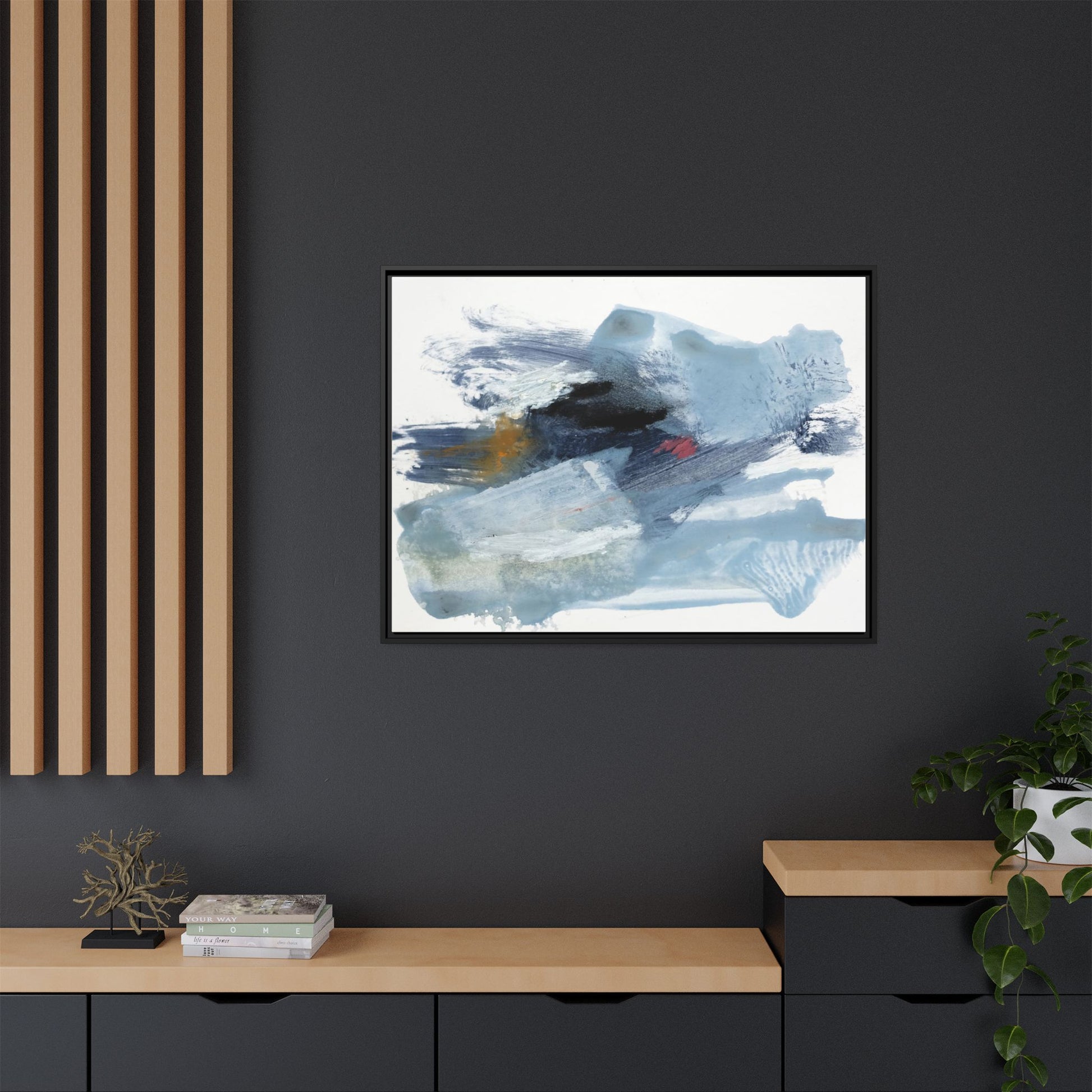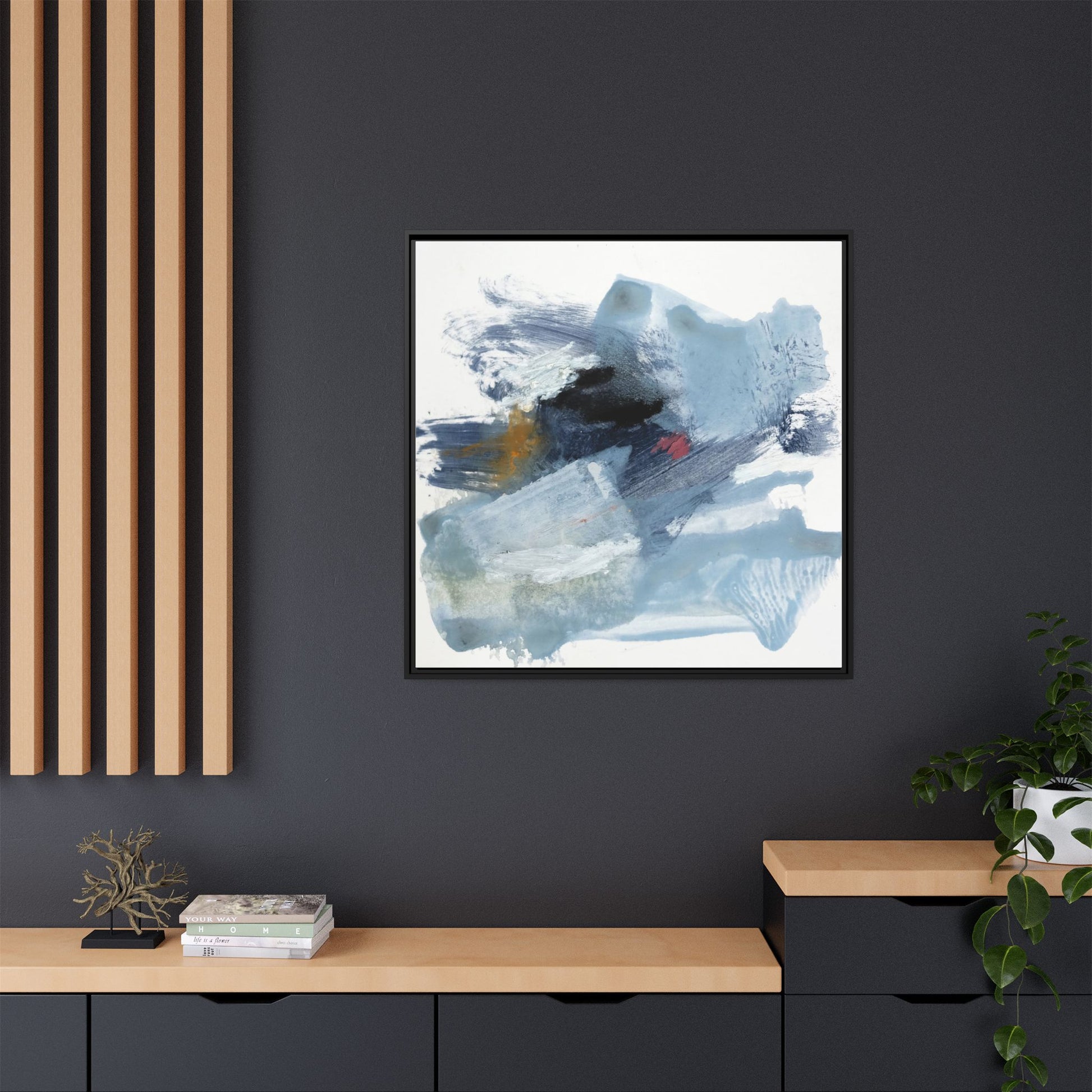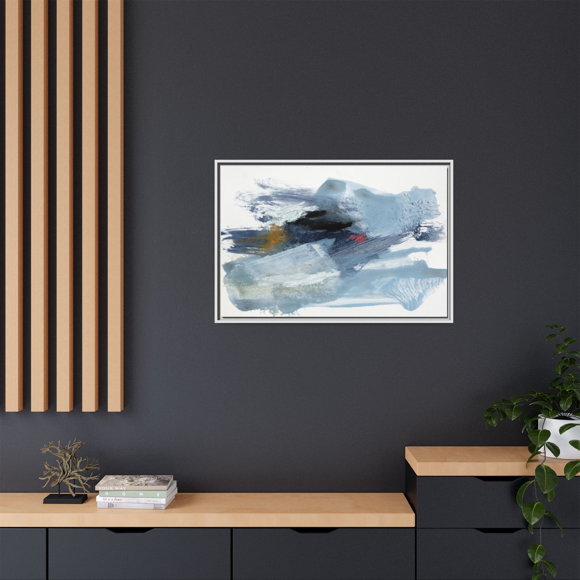 This captivating abstract watercolor painting features a dynamic composition of cool blue, white, and gray tones, interspersed with hints of golden yellow and deep red accents. The artwork showcases fluid, sweeping brushstrokes that create a sense of movement and depth, with layers of translucent and opaque paint blending and overlapping. Textural elements emerge through varied paint application techniques, including soft washes, sharp brush marks, and areas of granulated pigment that add visual complexity. The color palette evokes a sense of icy landscapes or turbulent seascapes, with the abstract forms suggesting fragmented shapes reminiscent of glaciers, waves, or atmospheric phenomena. The overall effect is ethereal and contemplative, inviting viewers to explore the nuanced interactions of color, texture, and form within the painting.