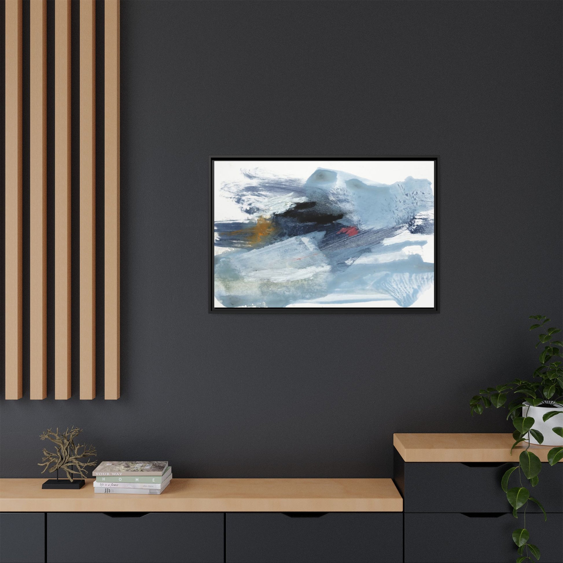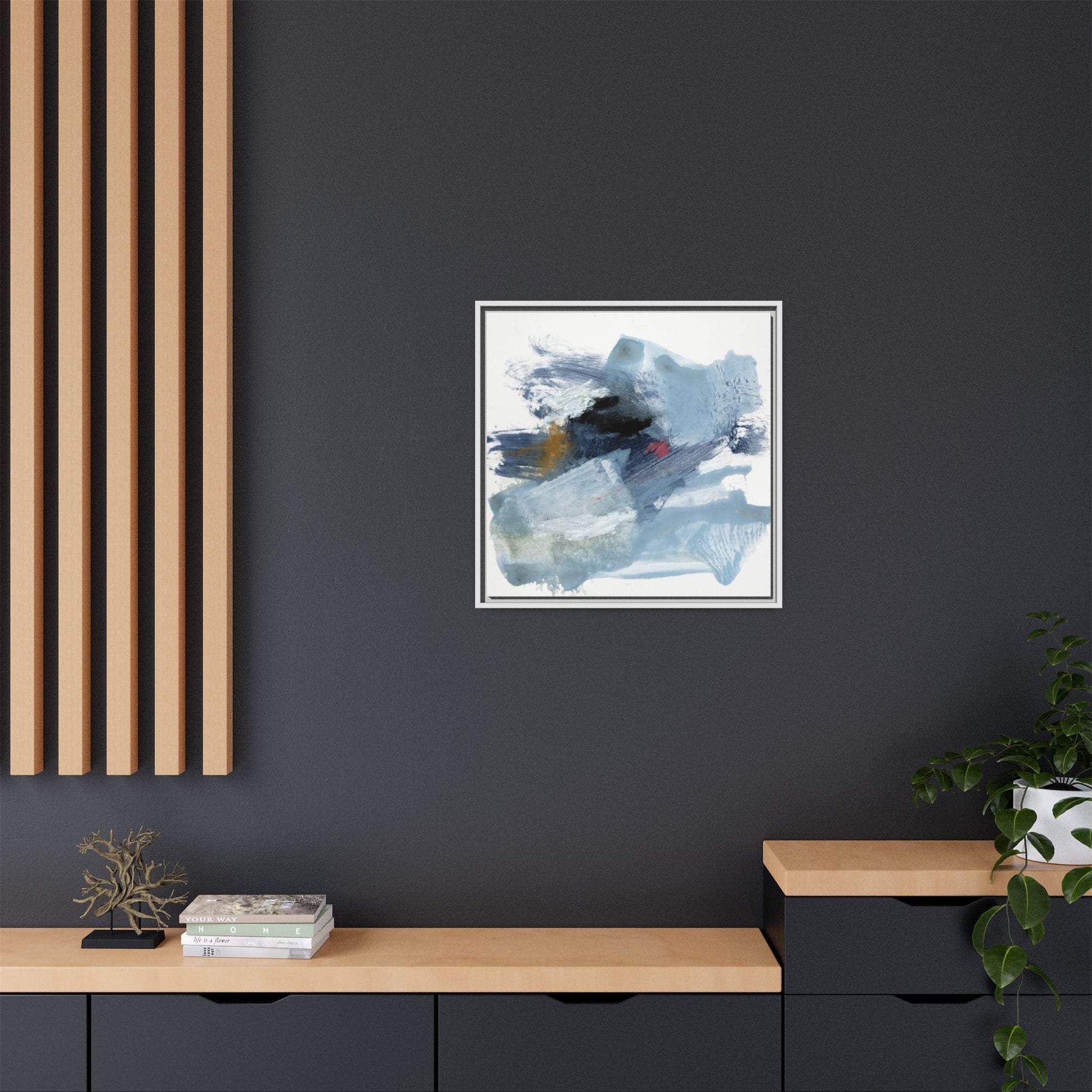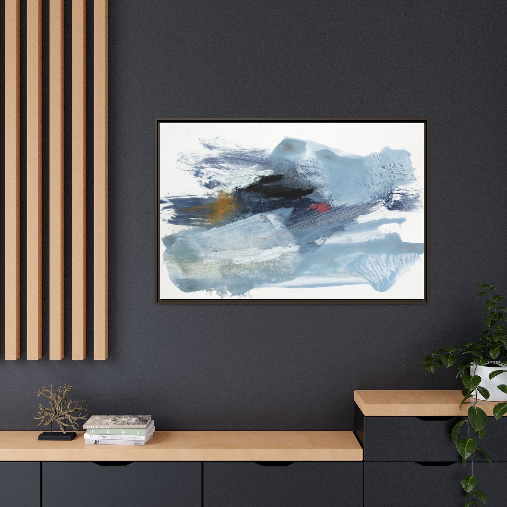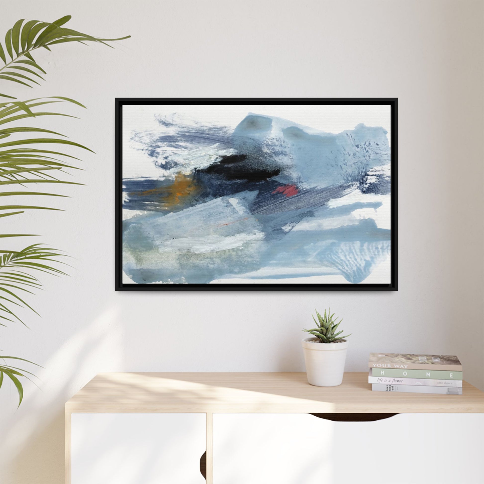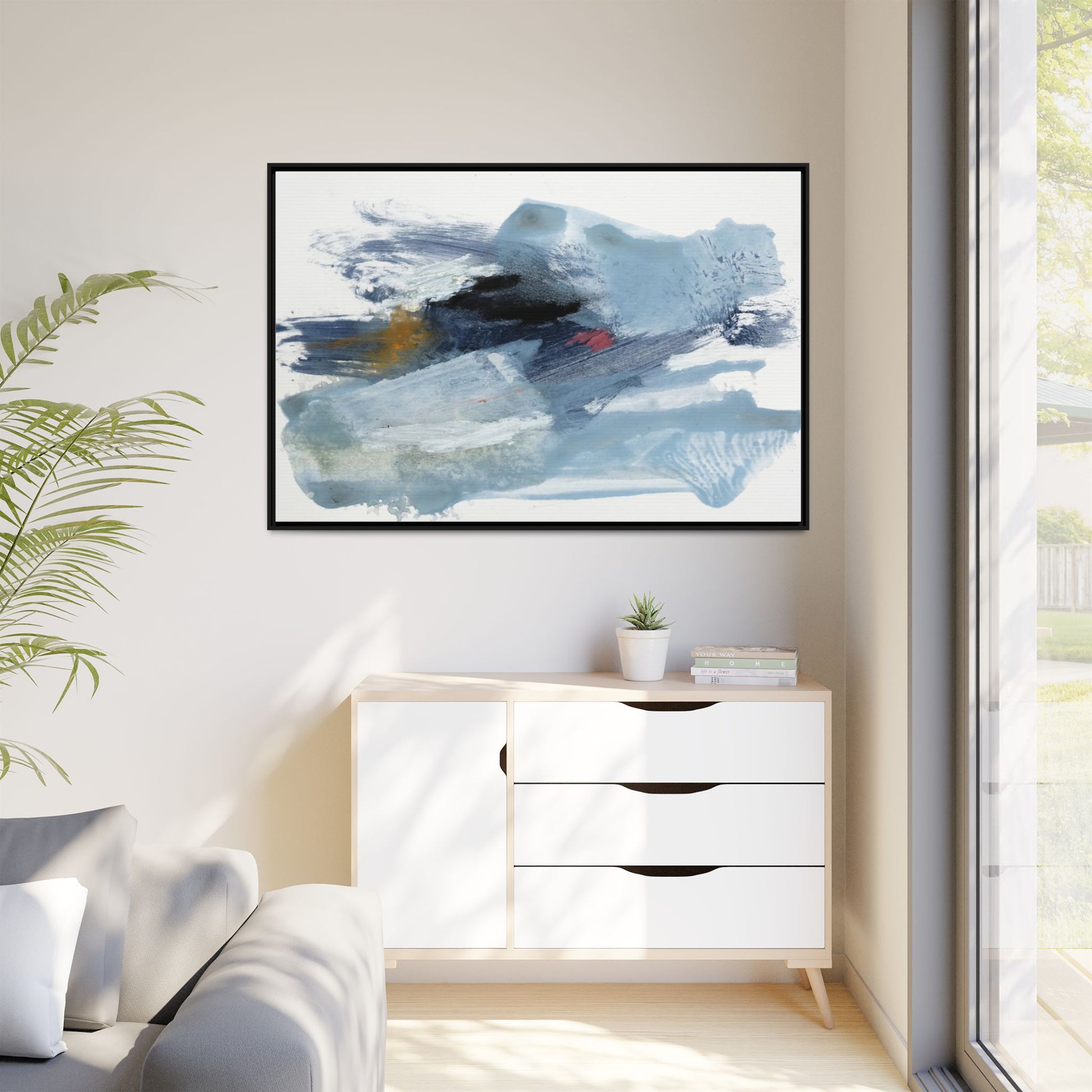 This captivating abstract watercolor painting features a dynamic composition of cool blue, white, and gray tones, interspersed with hints of golden yellow and deep red accents. The artwork showcases fluid, sweeping brushstrokes that create a sense of movement and depth, with layers of translucent and opaque paint blending and overlapping. Textural elements emerge through varied paint application techniques, including soft washes, sharp brush marks, and areas of granulated pigment that add visual complexity. The color palette evokes a sense of icy landscapes or turbulent seascapes, with the abstract forms suggesting fragmented shapes reminiscent of glaciers, waves, or atmospheric phenomena. The overall effect is ethereal and contemplative, inviting viewers to explore the nuanced interactions of color, texture, and form within the painting.