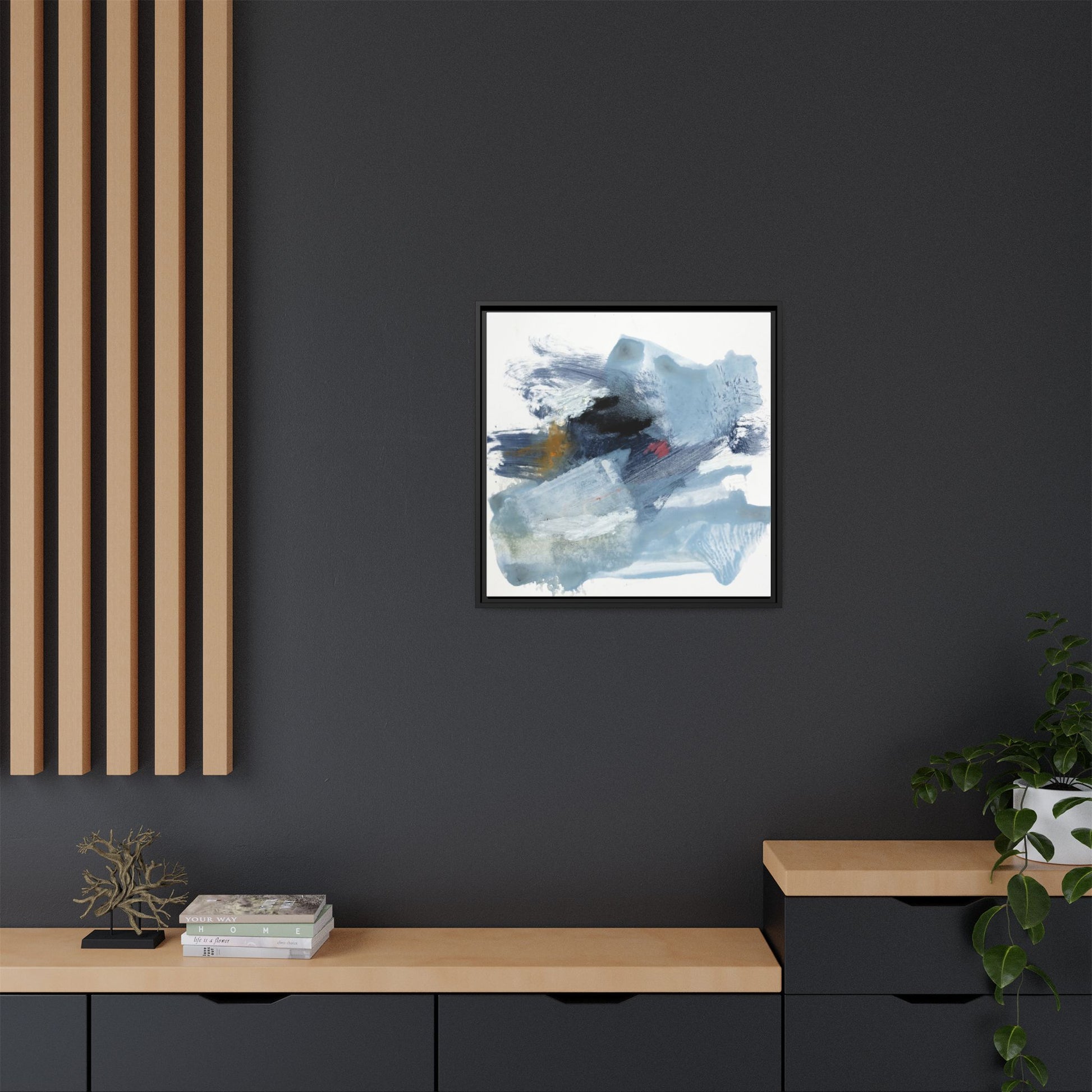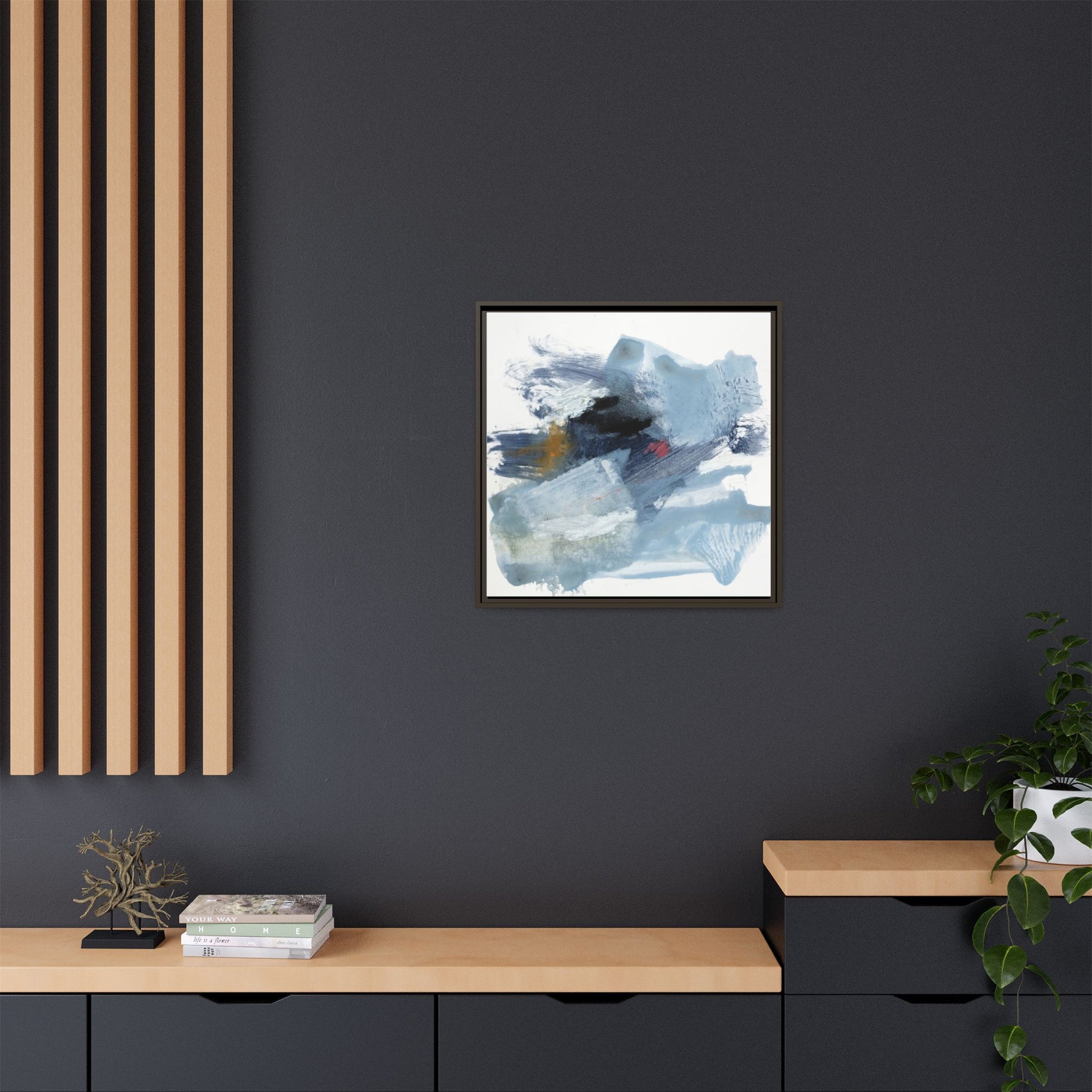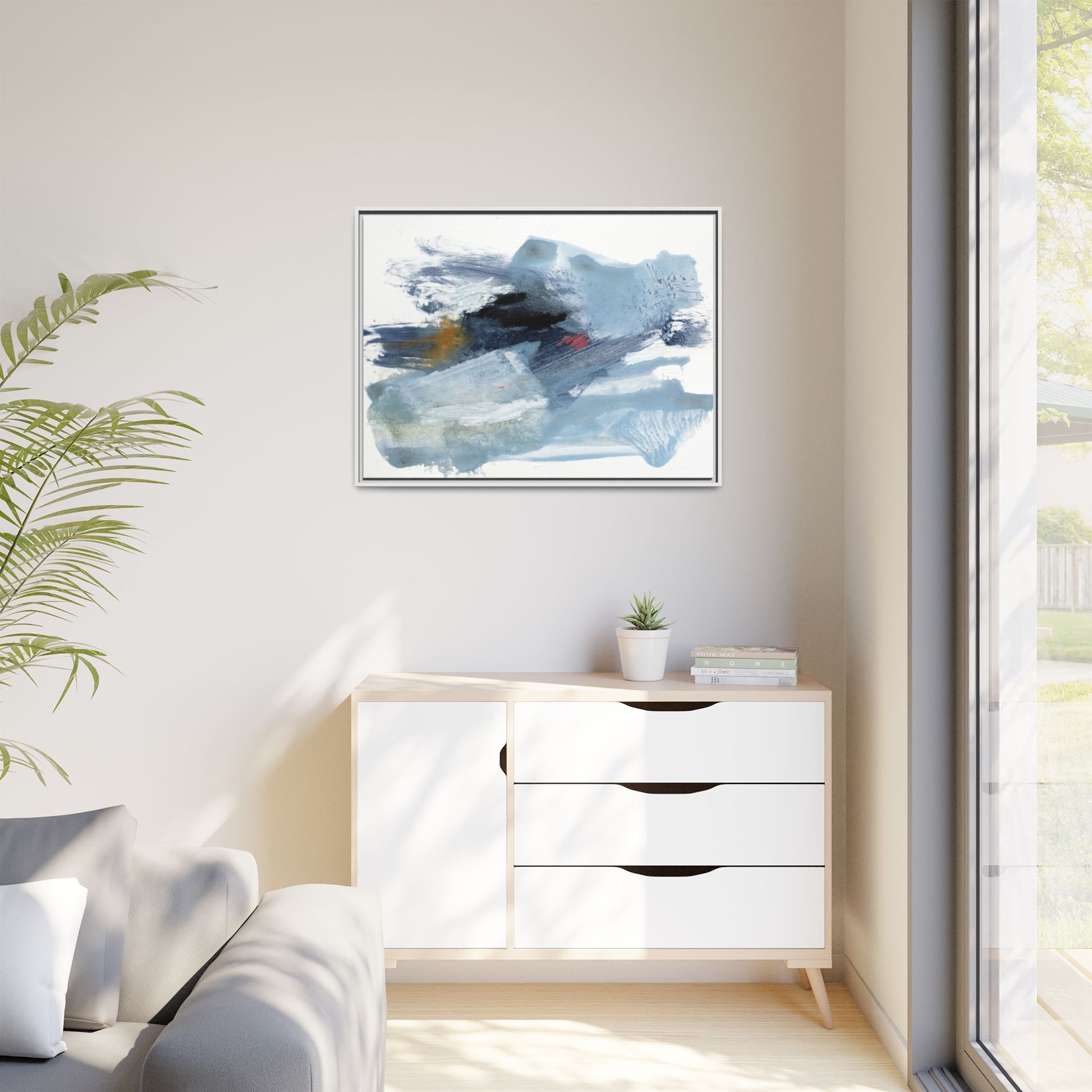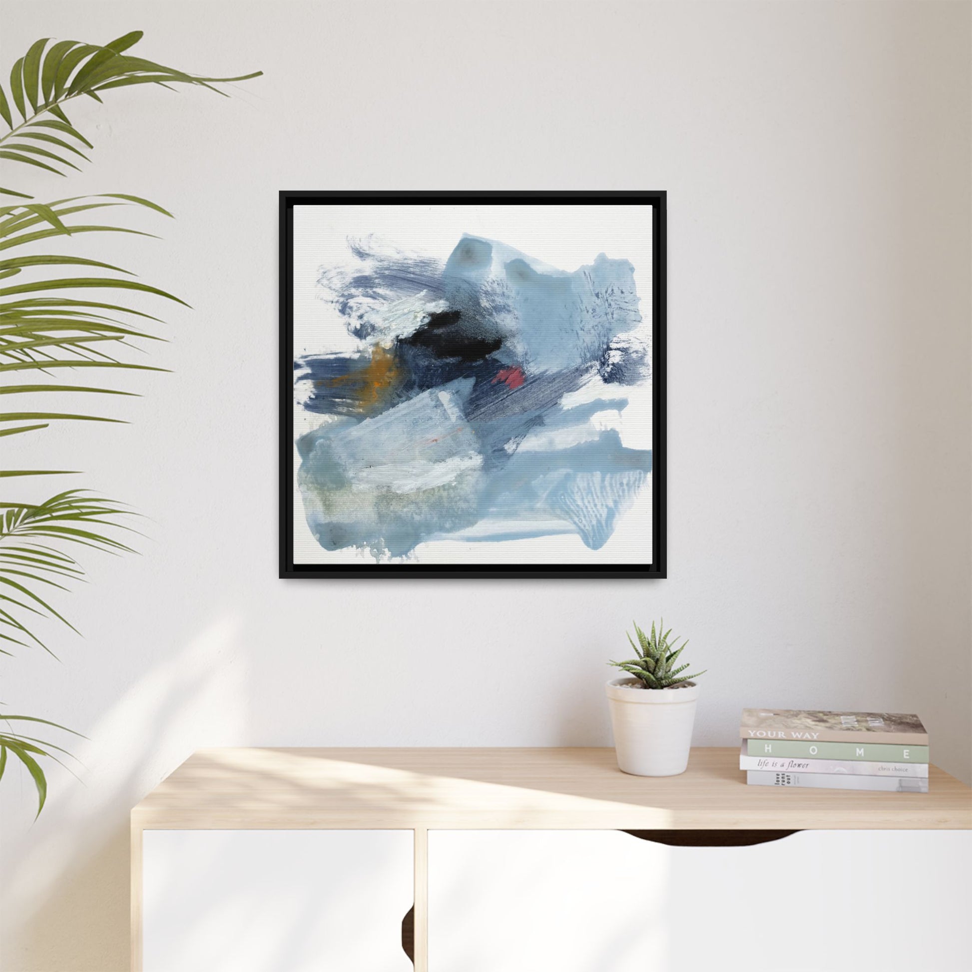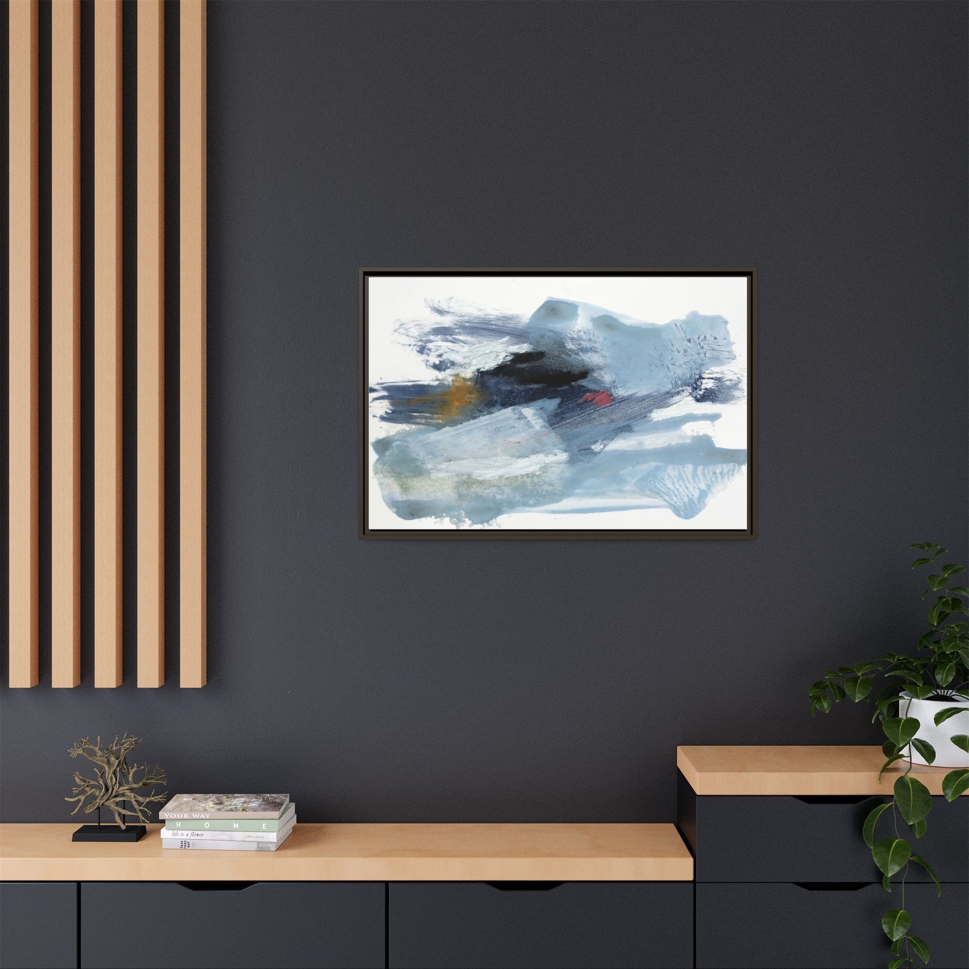 This captivating abstract watercolor painting features a dynamic composition of cool blue, white, and gray tones, interspersed with hints of golden yellow and deep red accents. The artwork showcases fluid, sweeping brushstrokes that create a sense of movement and depth, with layers of translucent and opaque paint blending and overlapping. Textural elements emerge through varied paint application techniques, including soft washes, sharp brush marks, and areas of granulated pigment that add visual complexity. The color palette evokes a sense of icy landscapes or turbulent seascapes, with the abstract forms suggesting fragmented shapes reminiscent of glaciers, waves, or atmospheric phenomena. The overall effect is ethereal and contemplative, inviting viewers to explore the nuanced interactions of color, texture, and form within the painting.