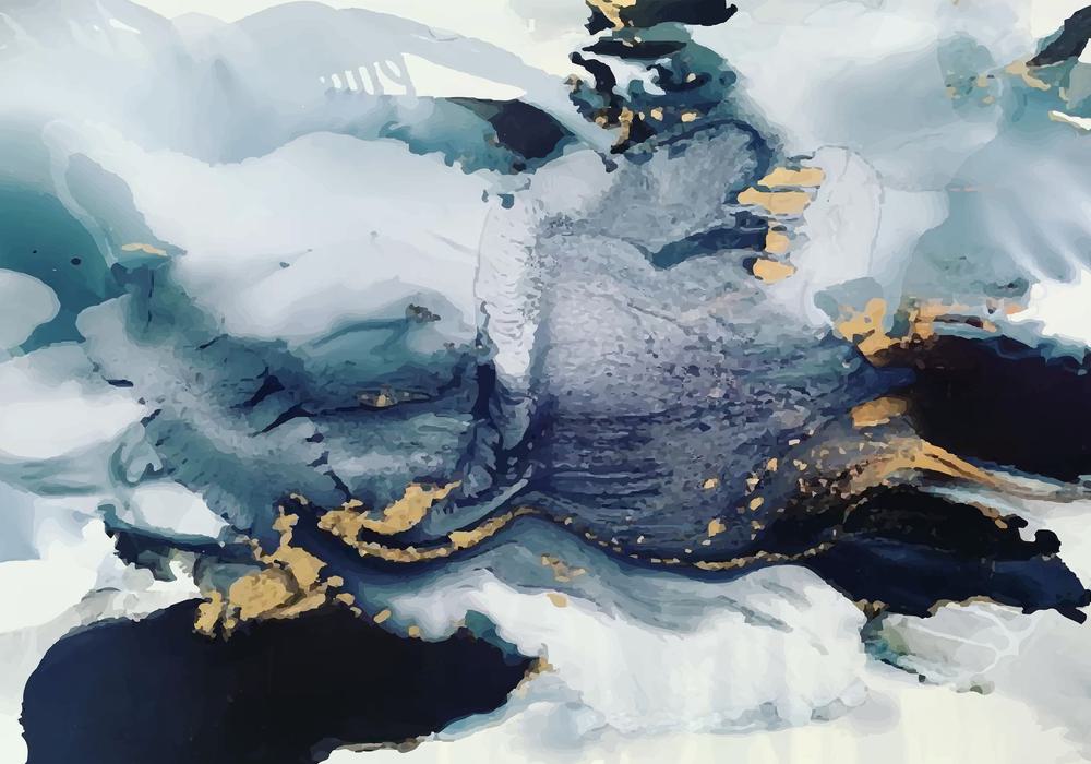 A swirling confluence of deep blues and shimmering golds collides like ocean waves under a shadowed sky, evoking a sense of shifting, cosmic energies.