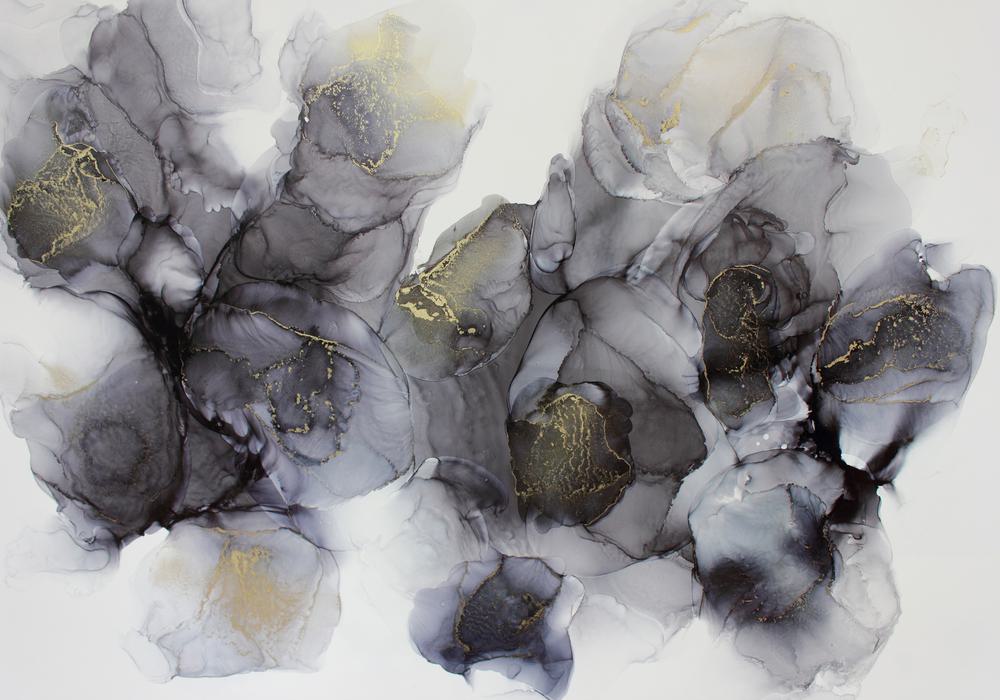 A fluid interplay of translucent layers and gilded accents suggests a hidden luminosity beneath shadowy forms, evoking a sense of mystery and elegance.