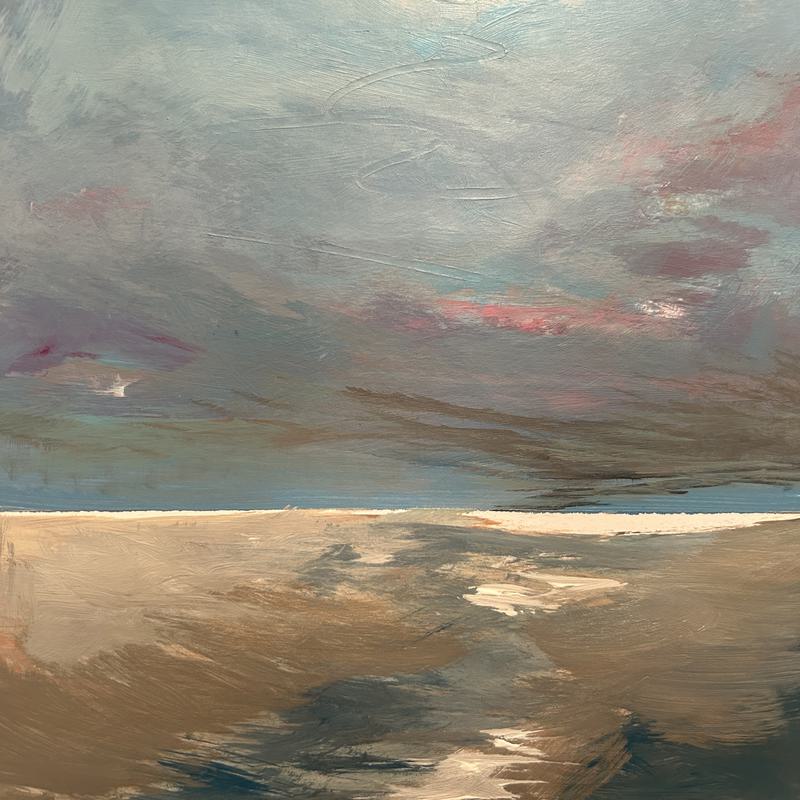 An expansive horizon merges sky and earth in sweeping hues, evoking a serene dance between dusk and dawn.