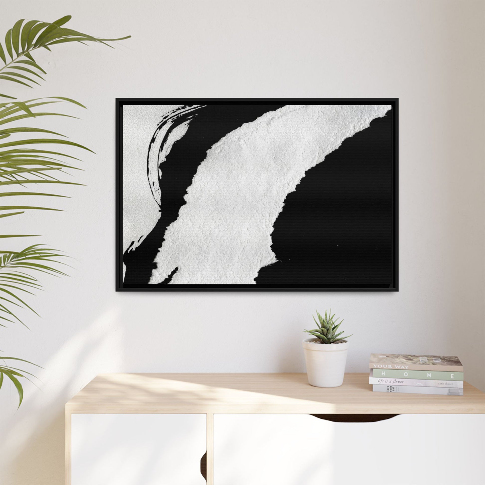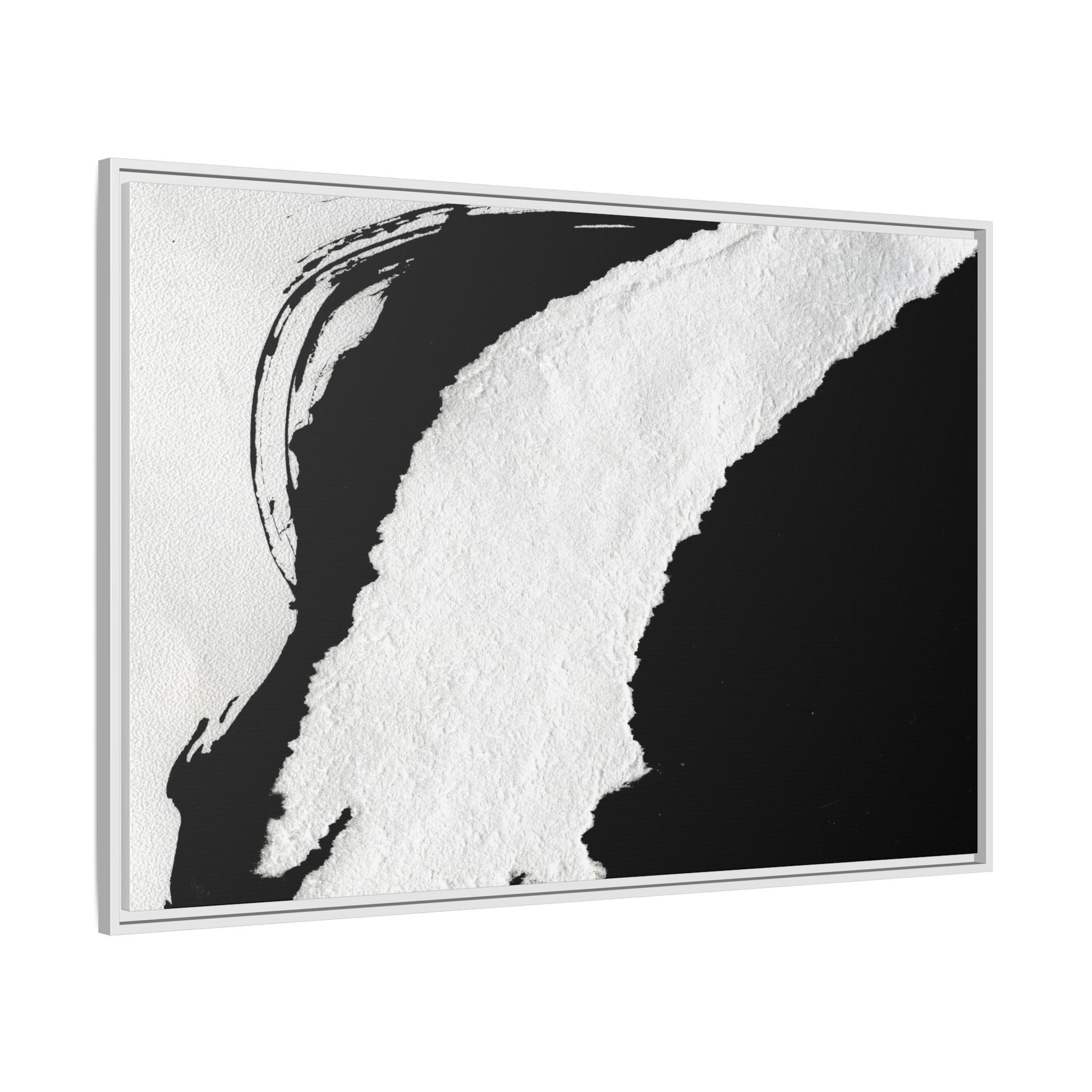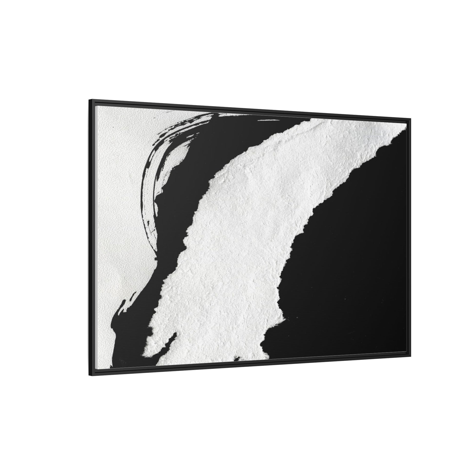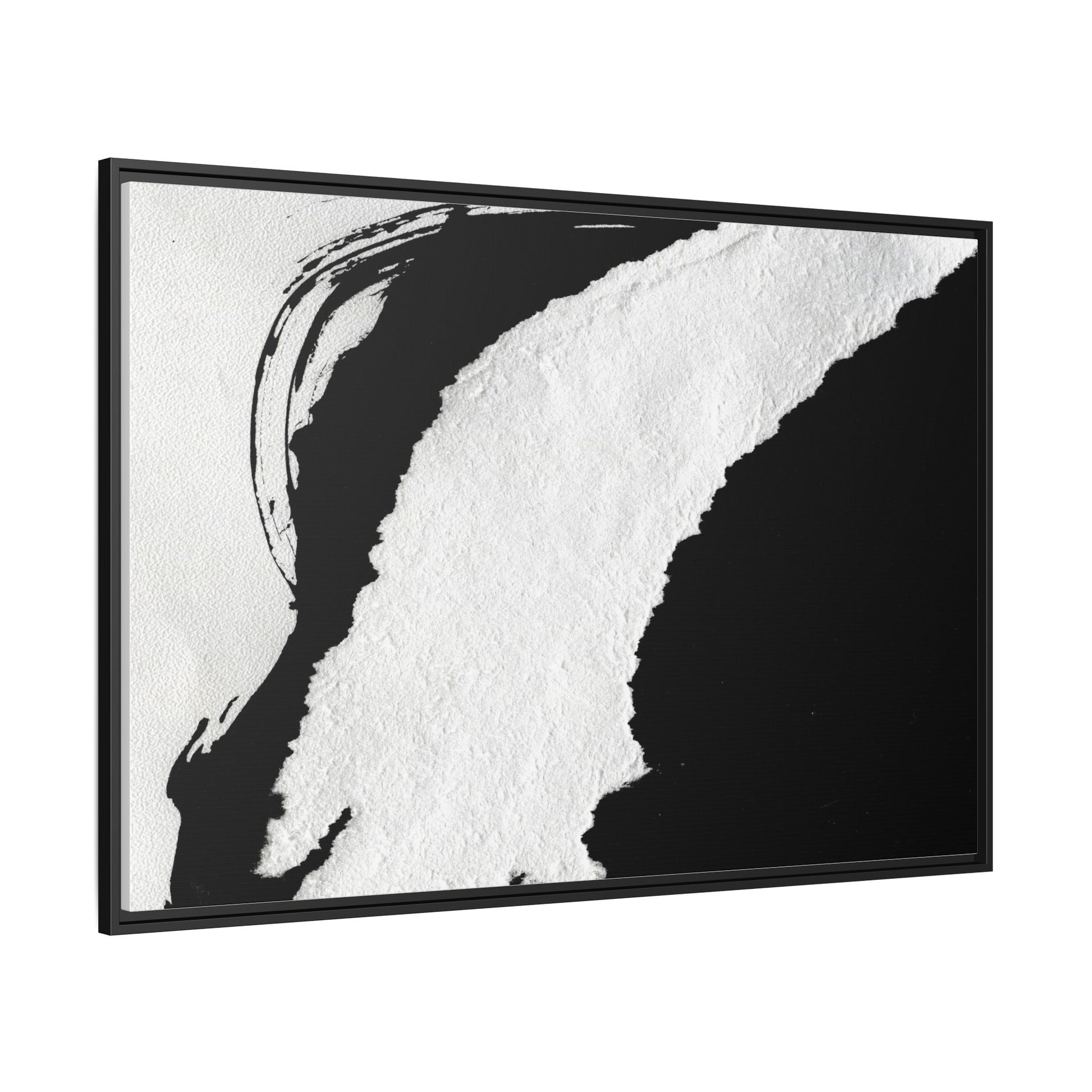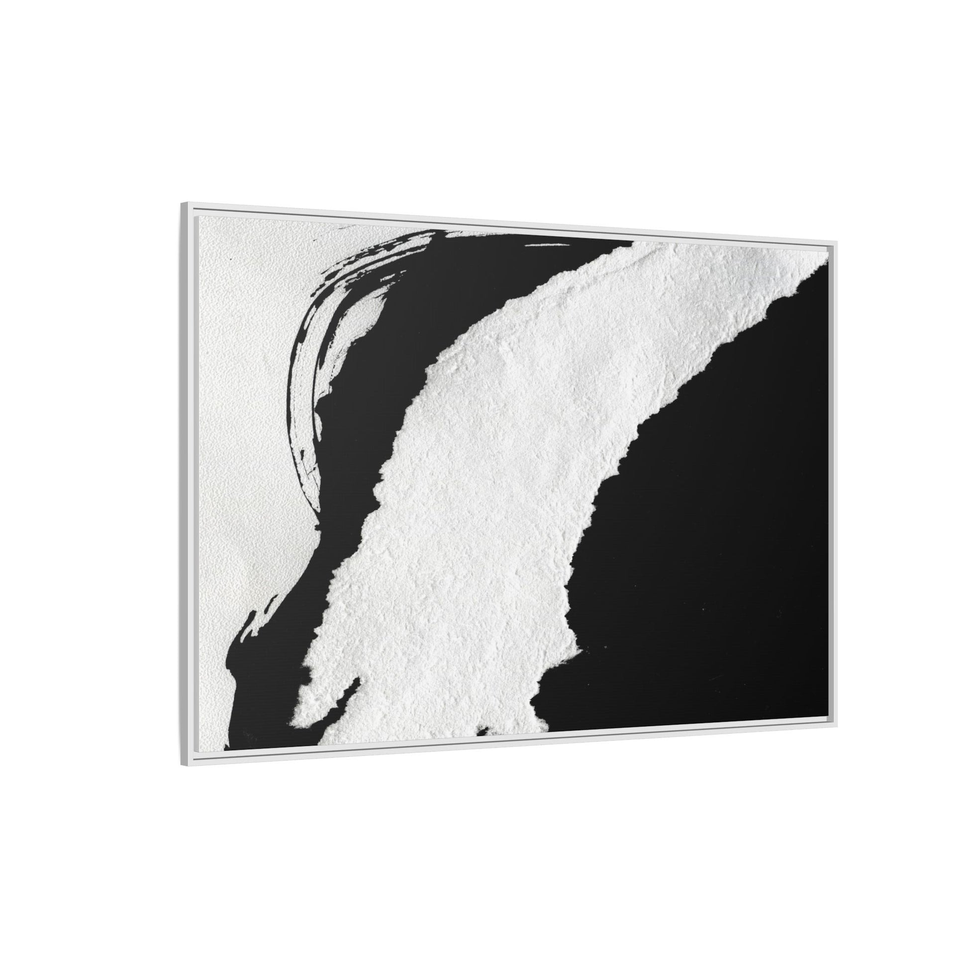 This striking black and white abstract image features a bold, organic composition of contrasting shapes and textures. The artwork presents a dramatic interplay between deep black backgrounds and a textured white central form that appears to flow and curve dynamically. Sharp, gestural brush-like marks accent the left side of the image, creating a sense of movement and energy. The white section has a rough, almost paper-like texture that adds depth and tactile quality to the piece. The overall design suggests a minimalist, expressionist approach to visual art, emphasizing form, contrast, and gestural mark-making.