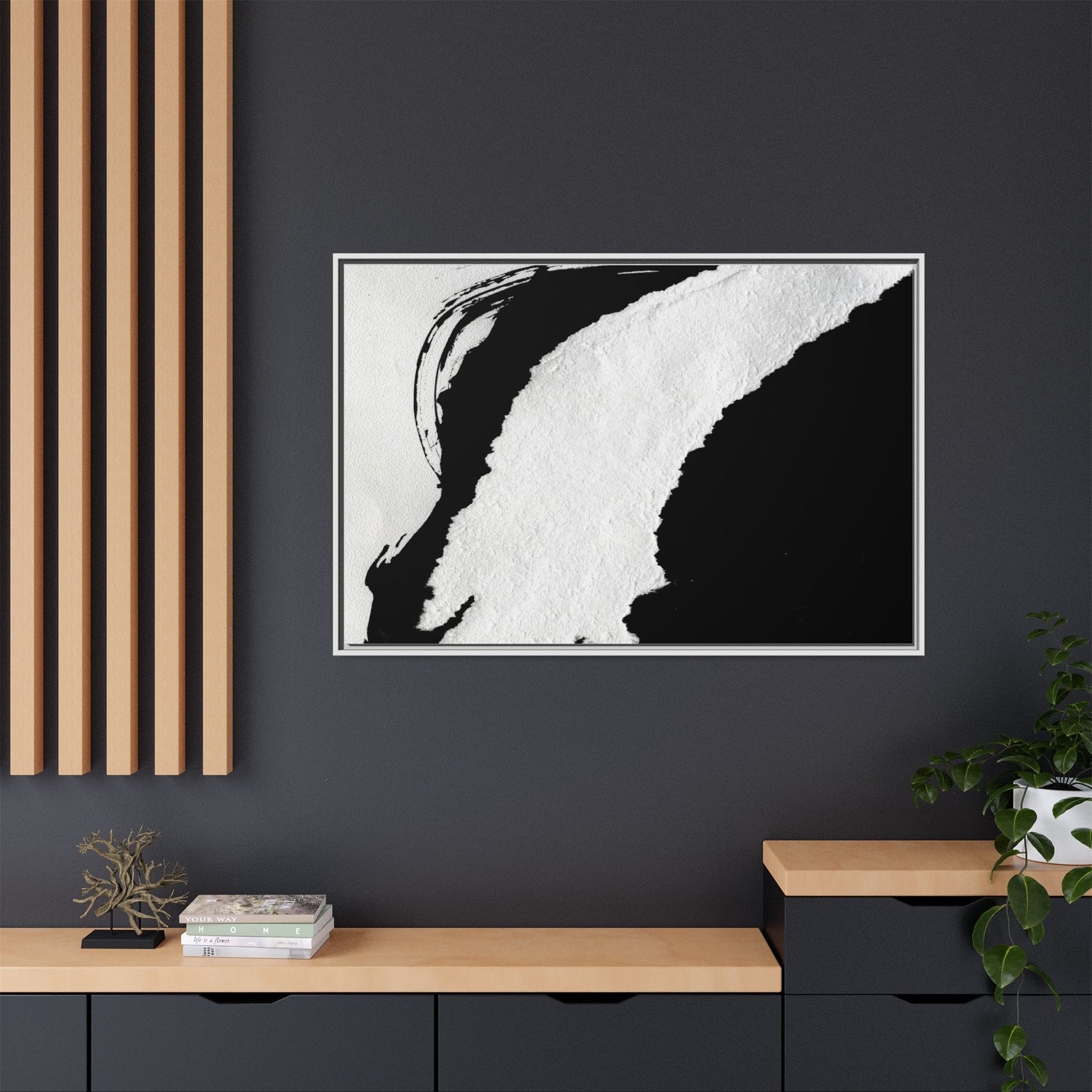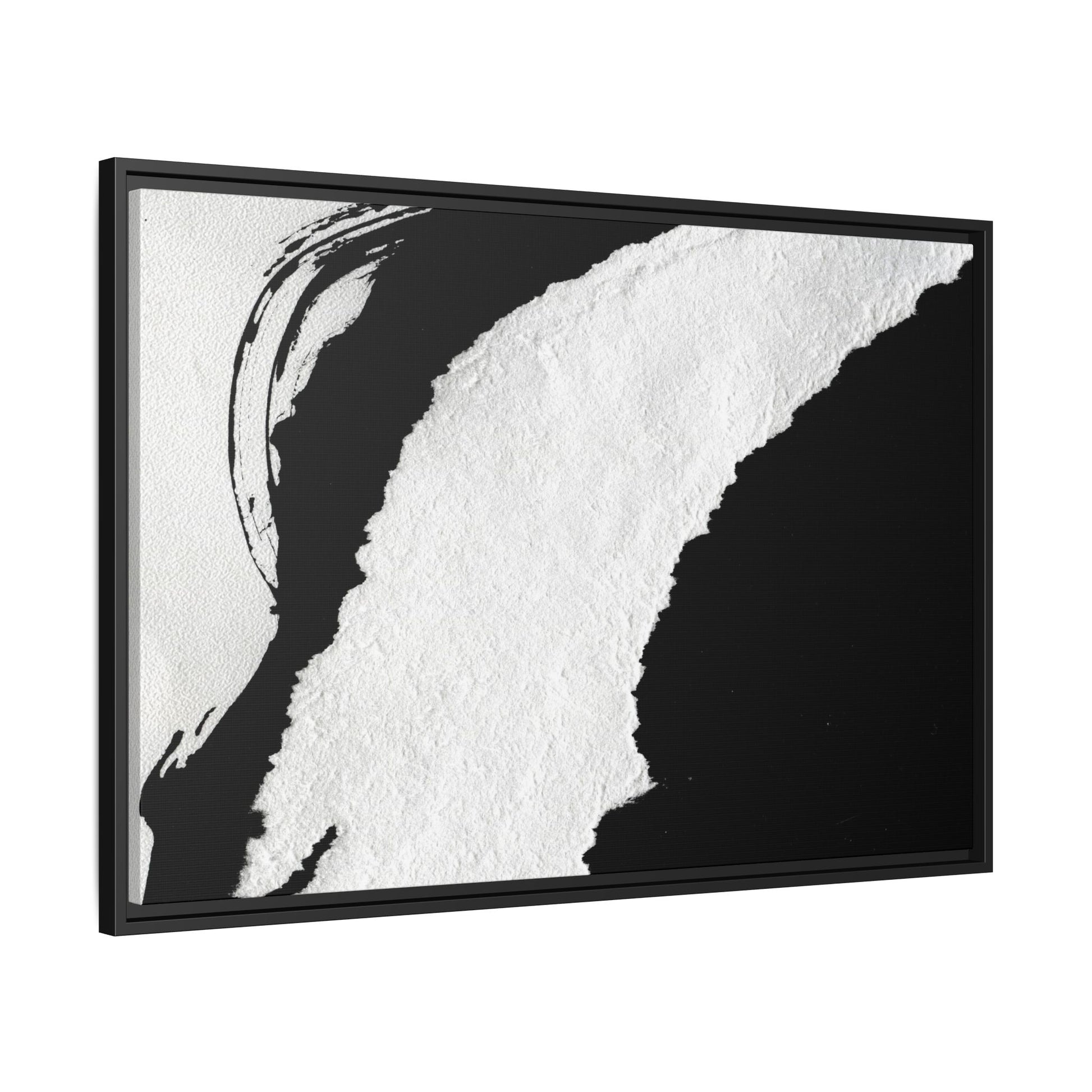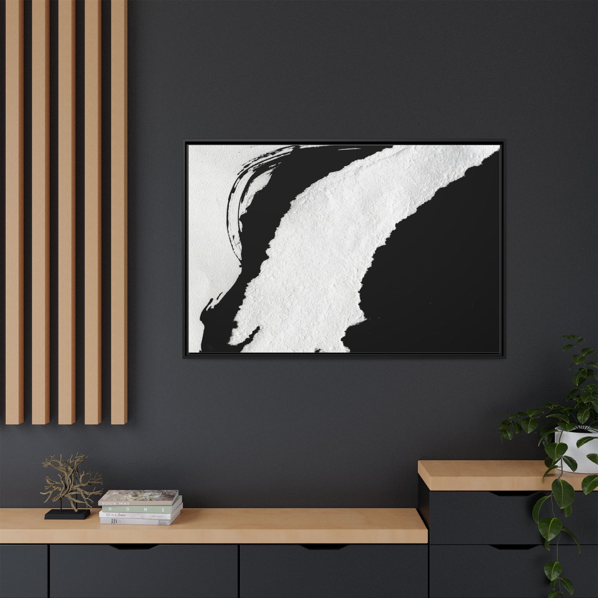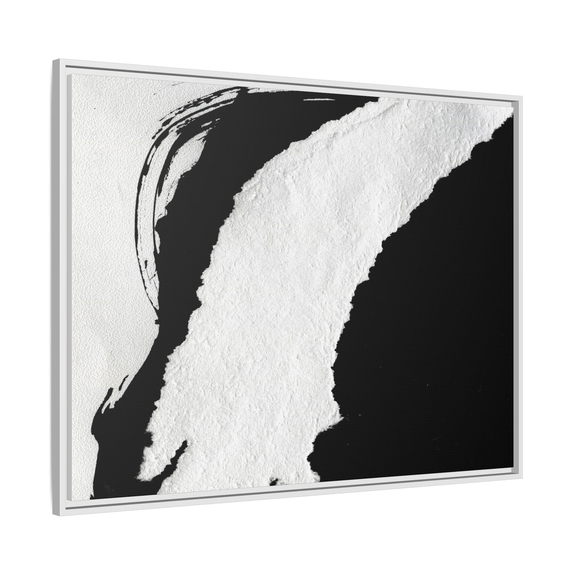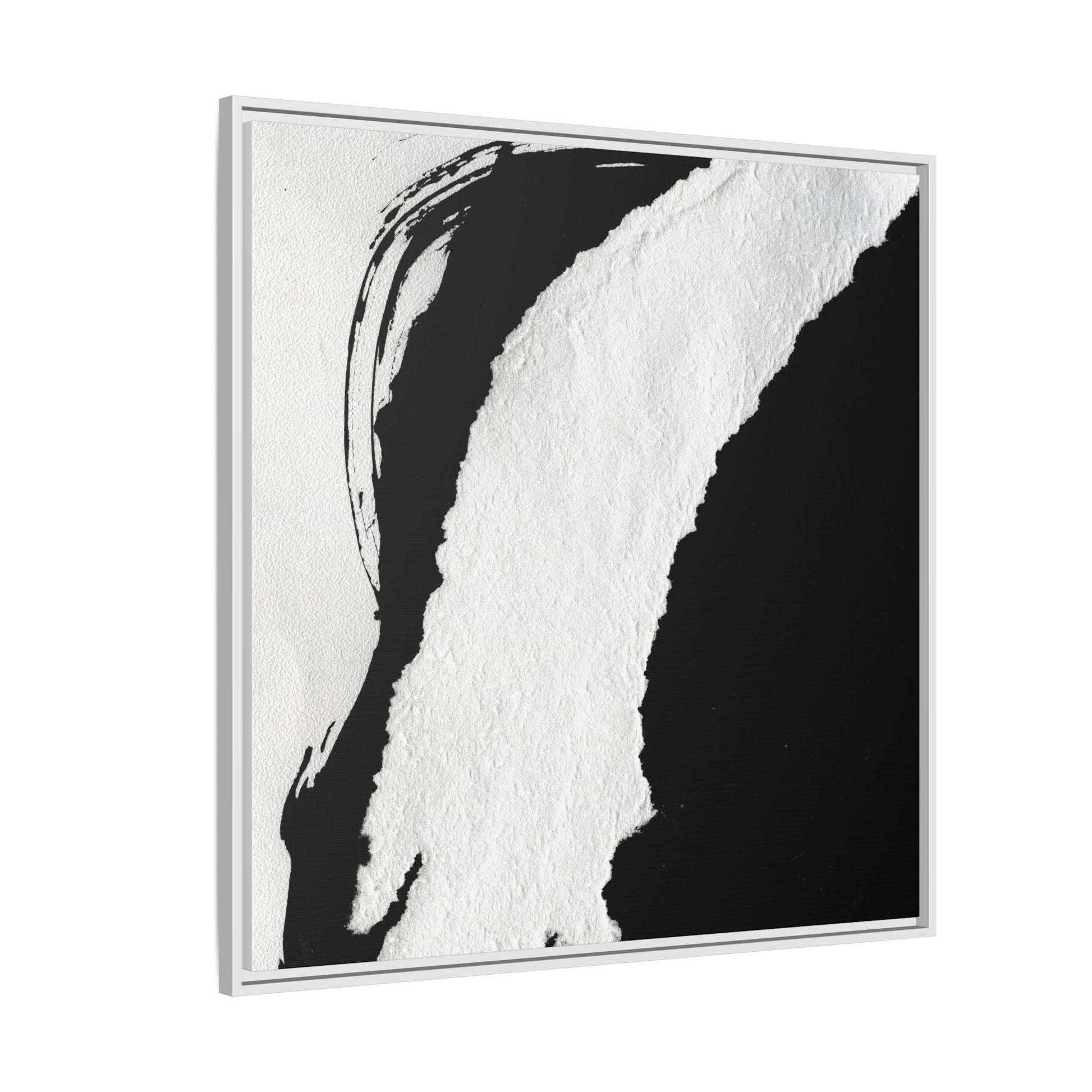 This striking black and white abstract image features a bold, organic composition of contrasting shapes and textures. The artwork presents a dramatic interplay between deep black backgrounds and a textured white central form that appears to flow and curve dynamically. Sharp, gestural brush-like marks accent the left side of the image, creating a sense of movement and energy. The white section has a rough, almost paper-like texture that adds depth and tactile quality to the piece. The overall design suggests a minimalist, expressionist approach to visual art, emphasizing form, contrast, and gestural mark-making.