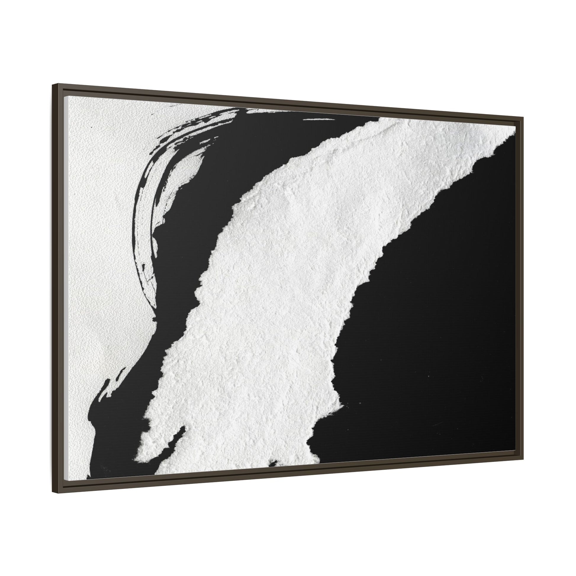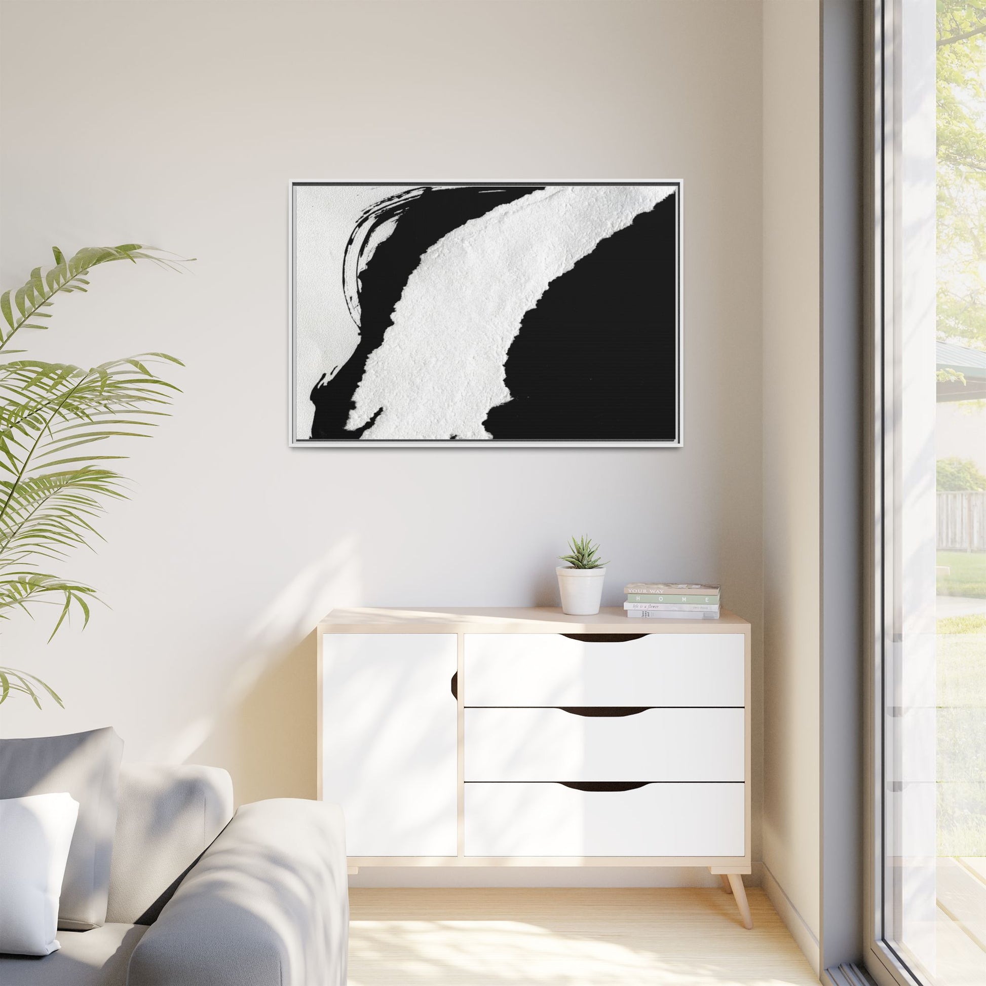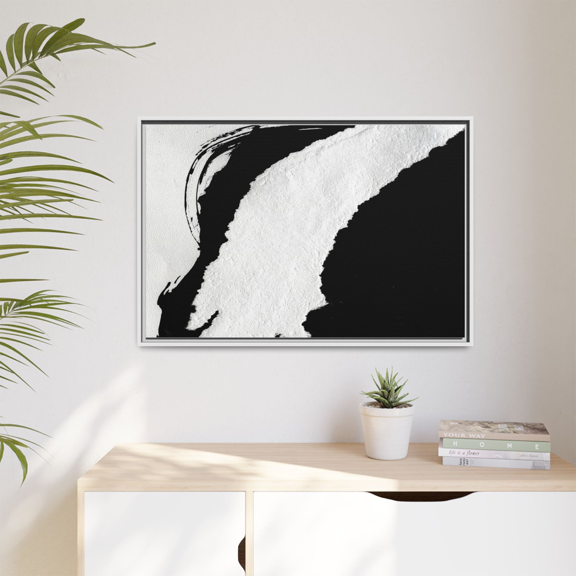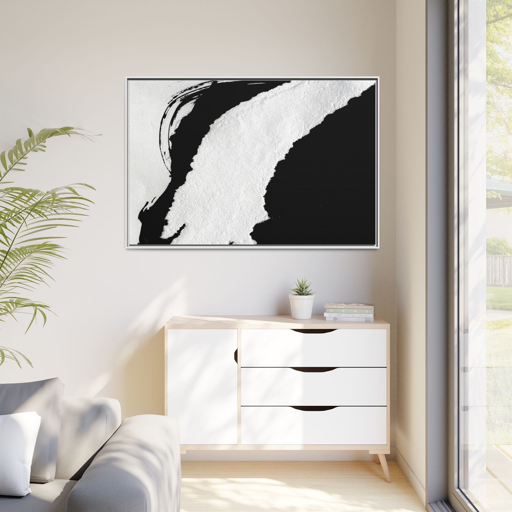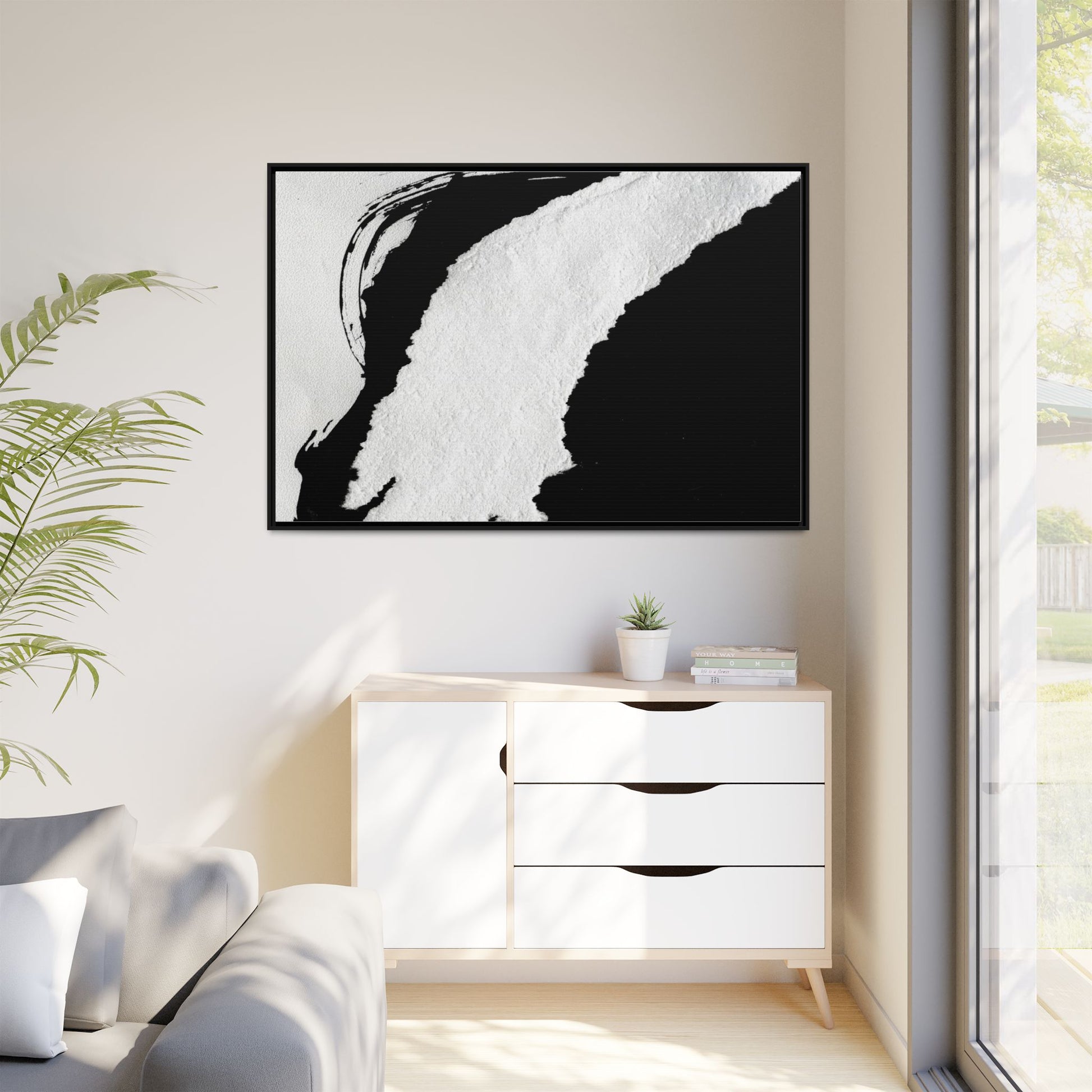 This striking black and white abstract image features a bold, organic composition of contrasting shapes and textures. The artwork presents a dramatic interplay between deep black backgrounds and a textured white central form that appears to flow and curve dynamically. Sharp, gestural brush-like marks accent the left side of the image, creating a sense of movement and energy. The white section has a rough, almost paper-like texture that adds depth and tactile quality to the piece. The overall design suggests a minimalist, expressionist approach to visual art, emphasizing form, contrast, and gestural mark-making.