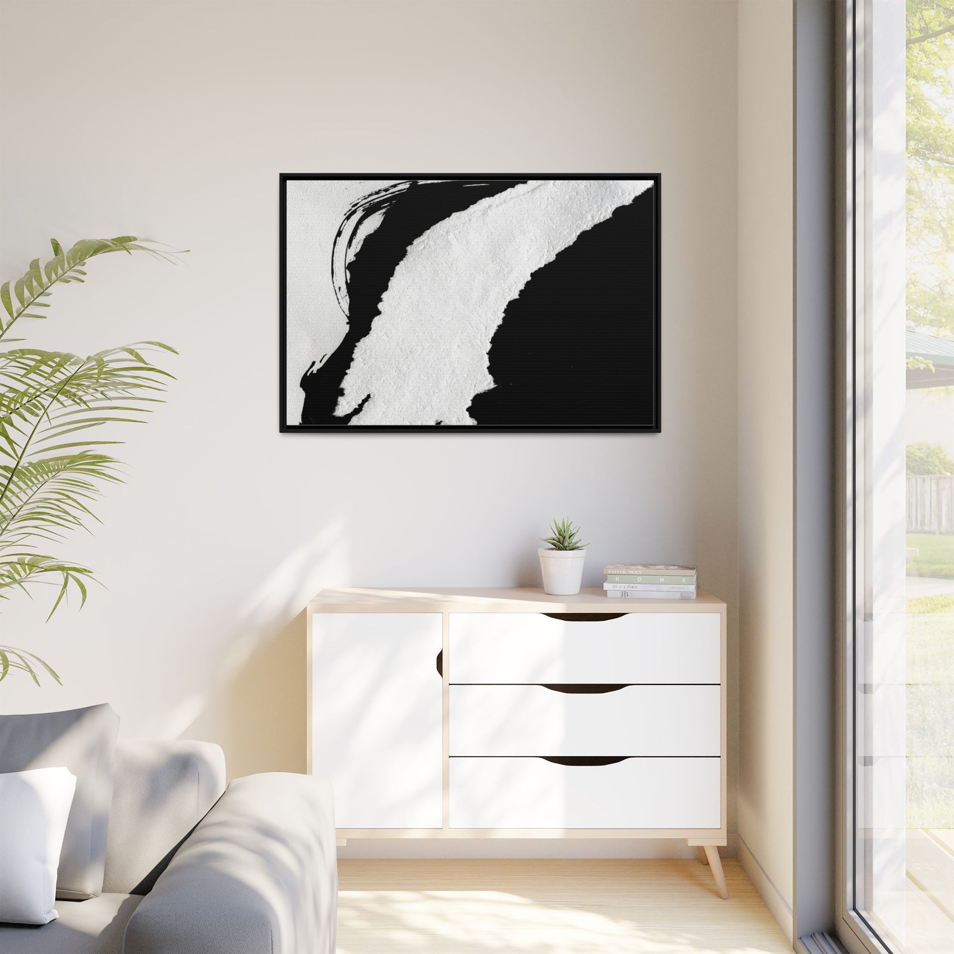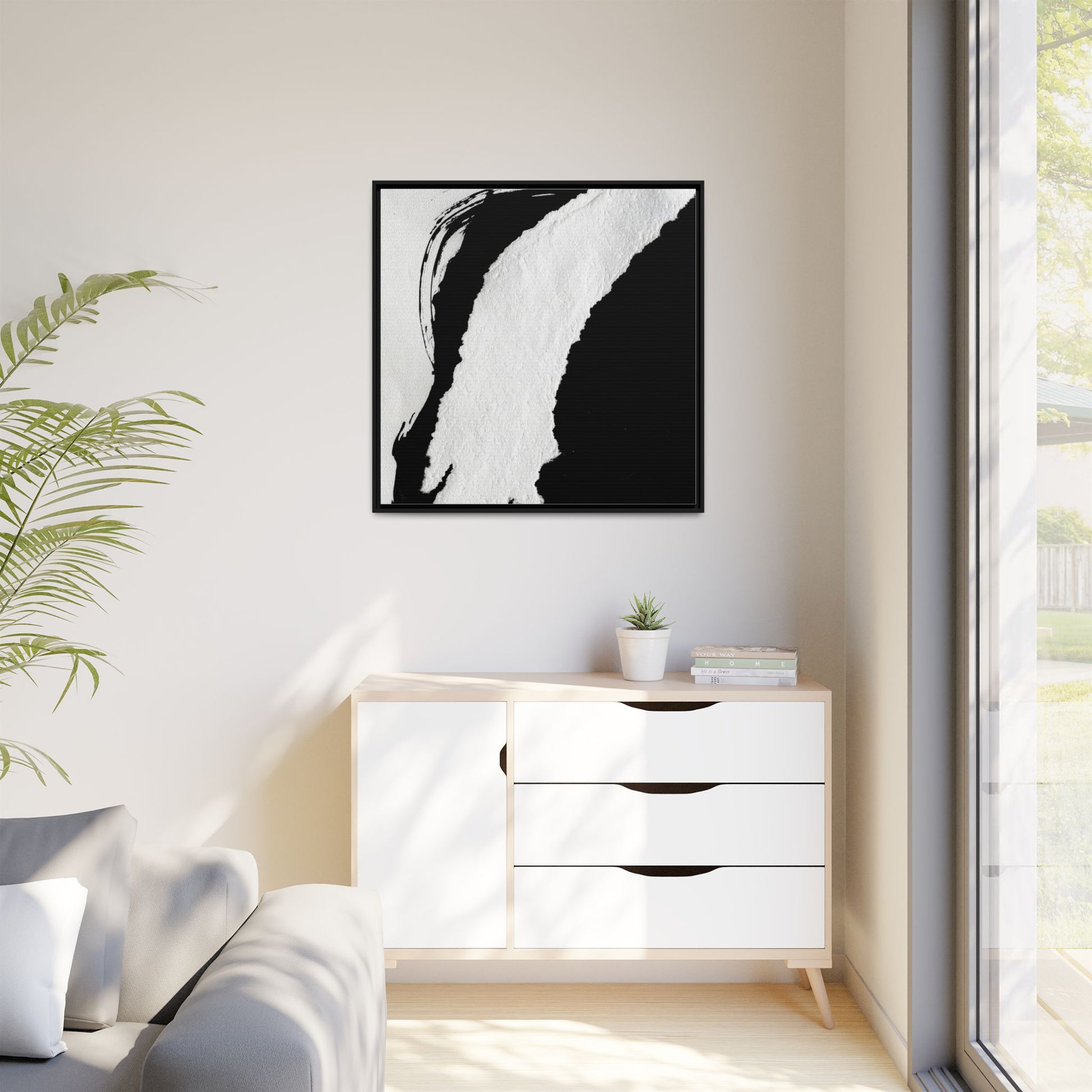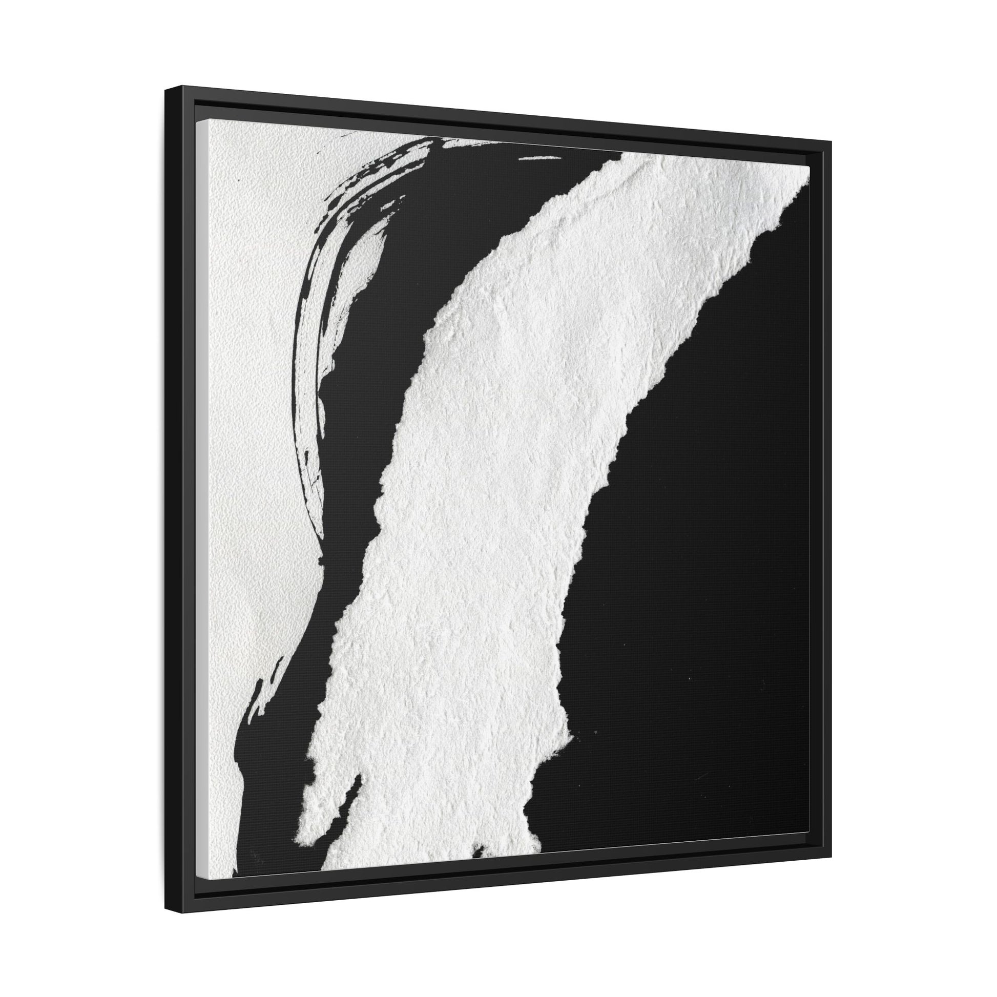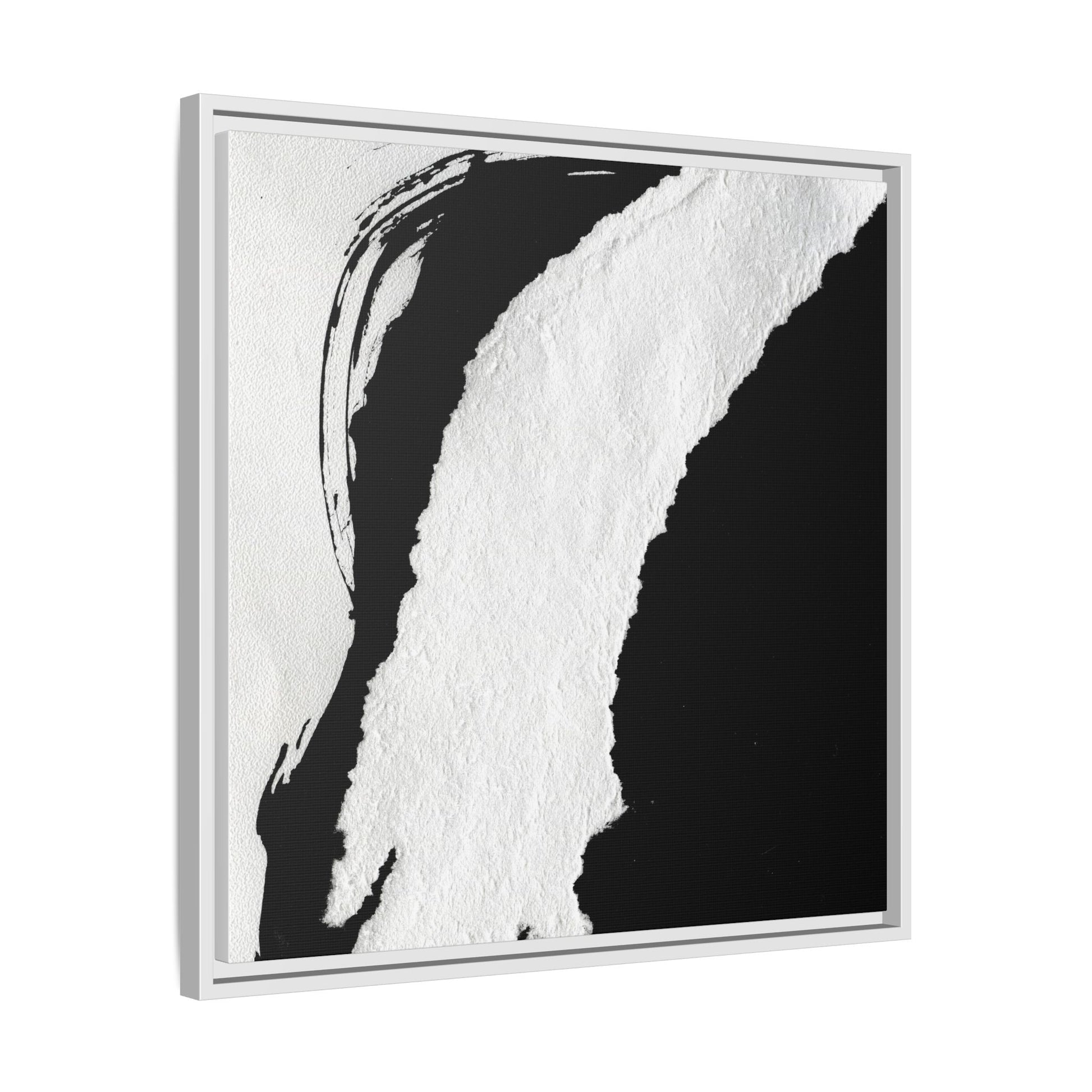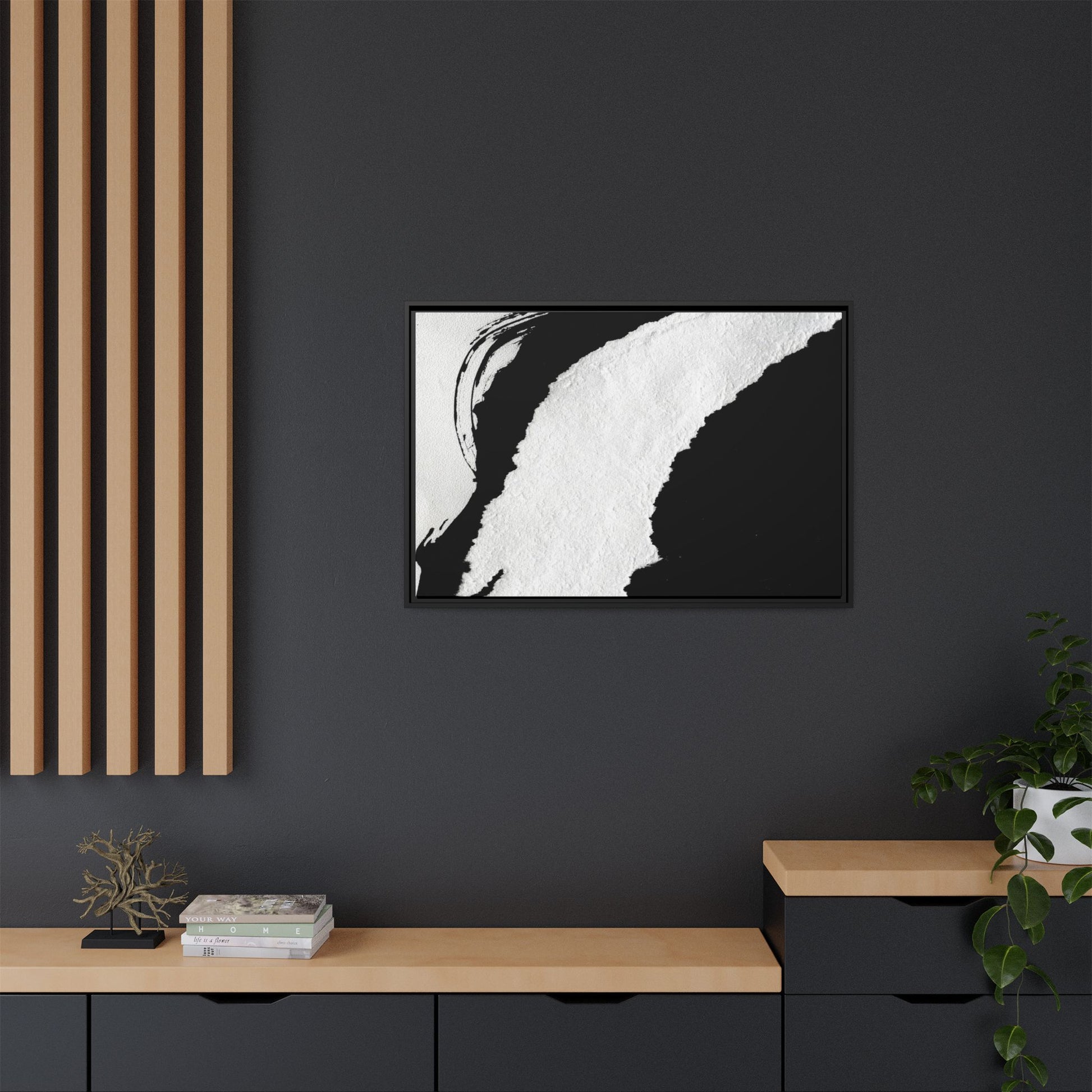 This striking black and white abstract image features a bold, organic composition of contrasting shapes and textures. The artwork presents a dramatic interplay between deep black backgrounds and a textured white central form that appears to flow and curve dynamically. Sharp, gestural brush-like marks accent the left side of the image, creating a sense of movement and energy. The white section has a rough, almost paper-like texture that adds depth and tactile quality to the piece. The overall design suggests a minimalist, expressionist approach to visual art, emphasizing form, contrast, and gestural mark-making.