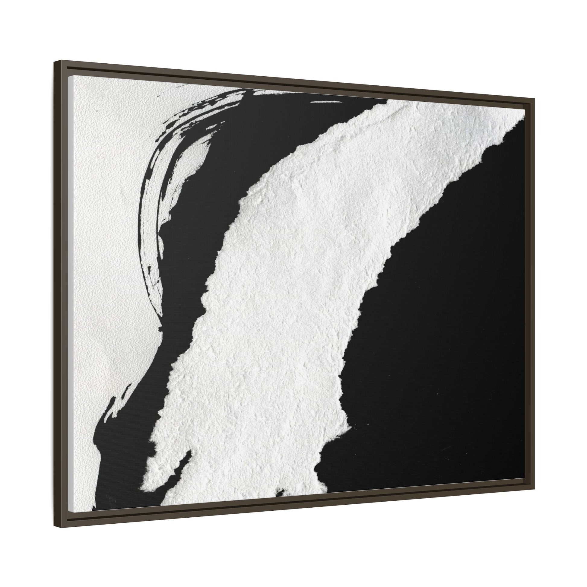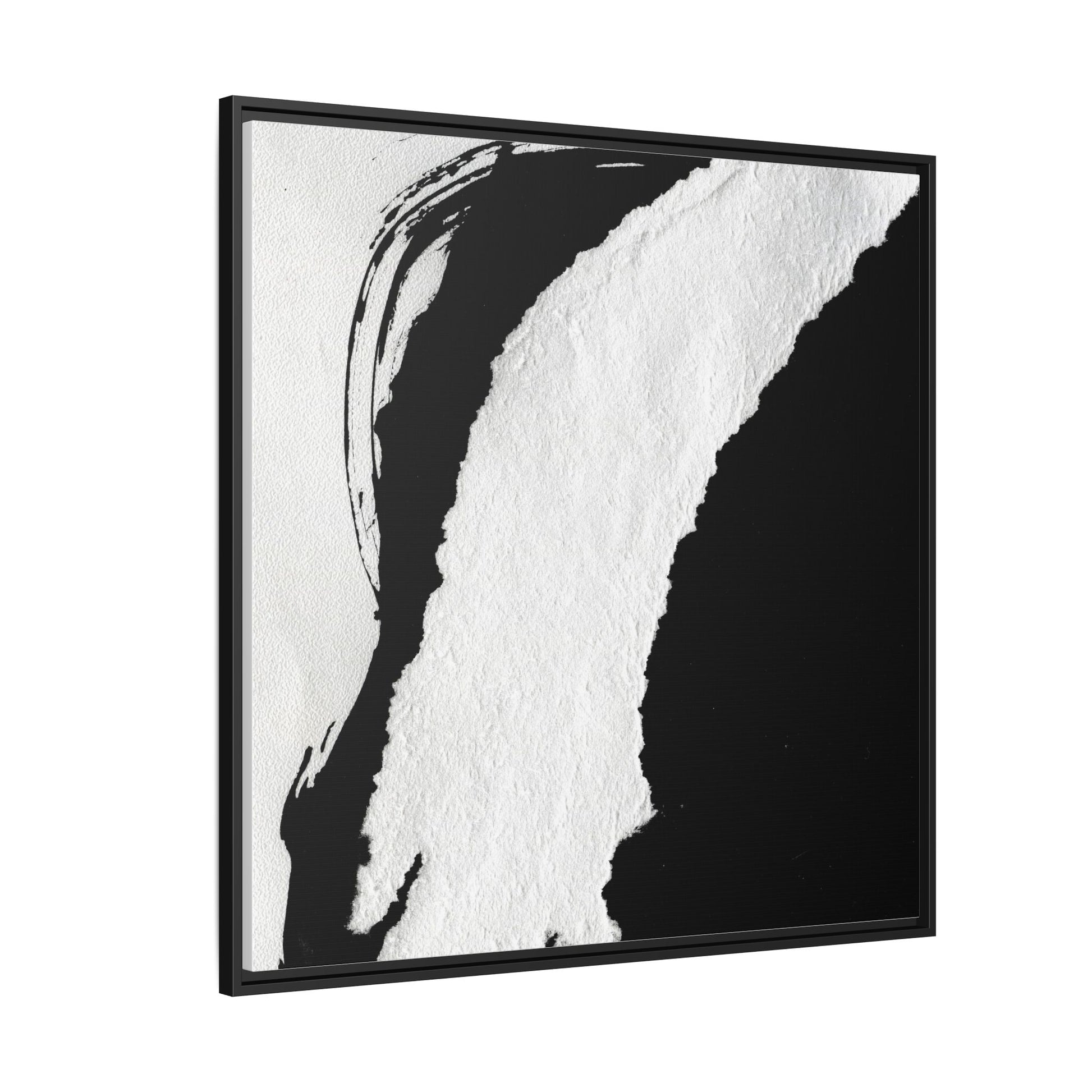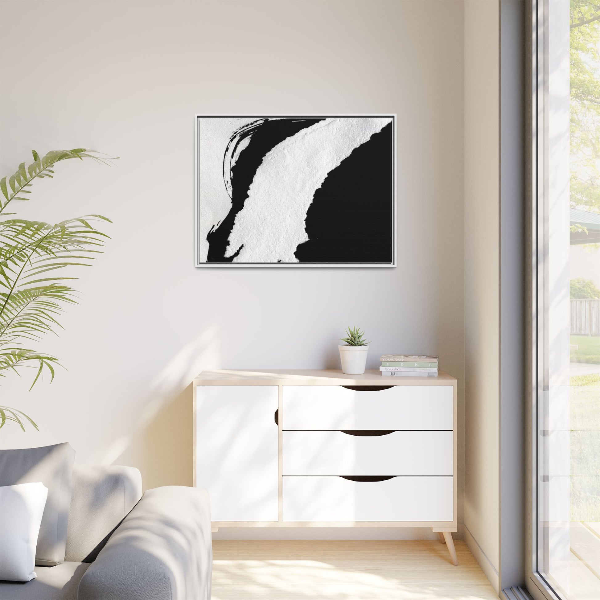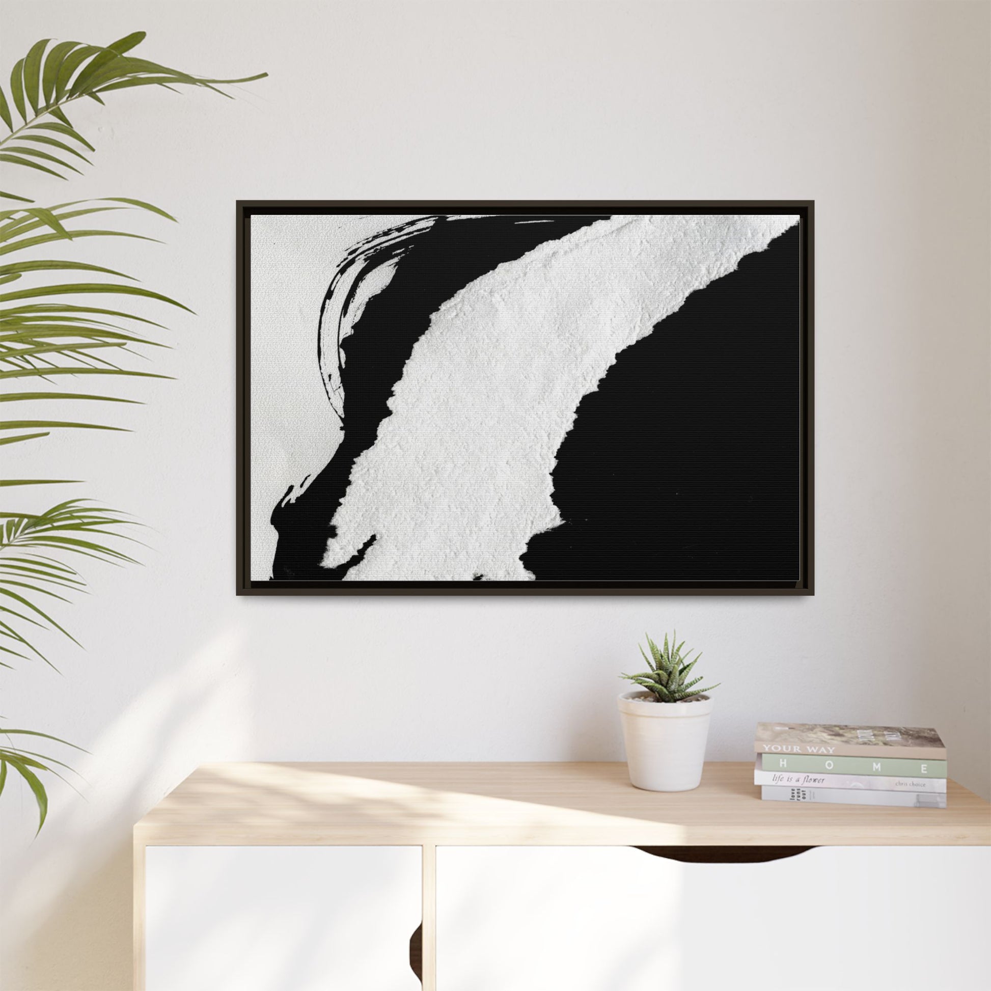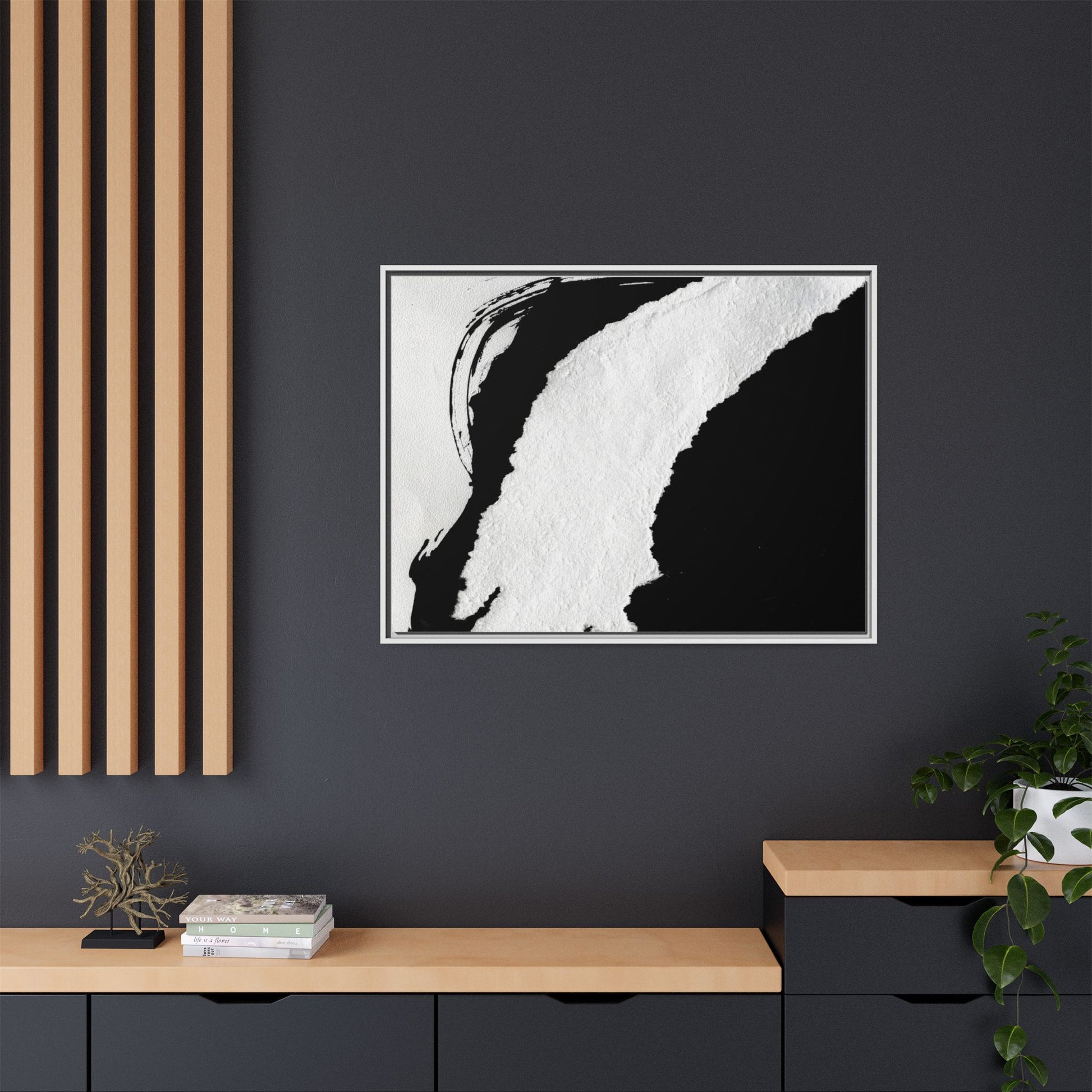 This striking black and white abstract image features a bold, organic composition of contrasting shapes and textures. The artwork presents a dramatic interplay between deep black backgrounds and a textured white central form that appears to flow and curve dynamically. Sharp, gestural brush-like marks accent the left side of the image, creating a sense of movement and energy. The white section has a rough, almost paper-like texture that adds depth and tactile quality to the piece. The overall design suggests a minimalist, expressionist approach to visual art, emphasizing form, contrast, and gestural mark-making.
