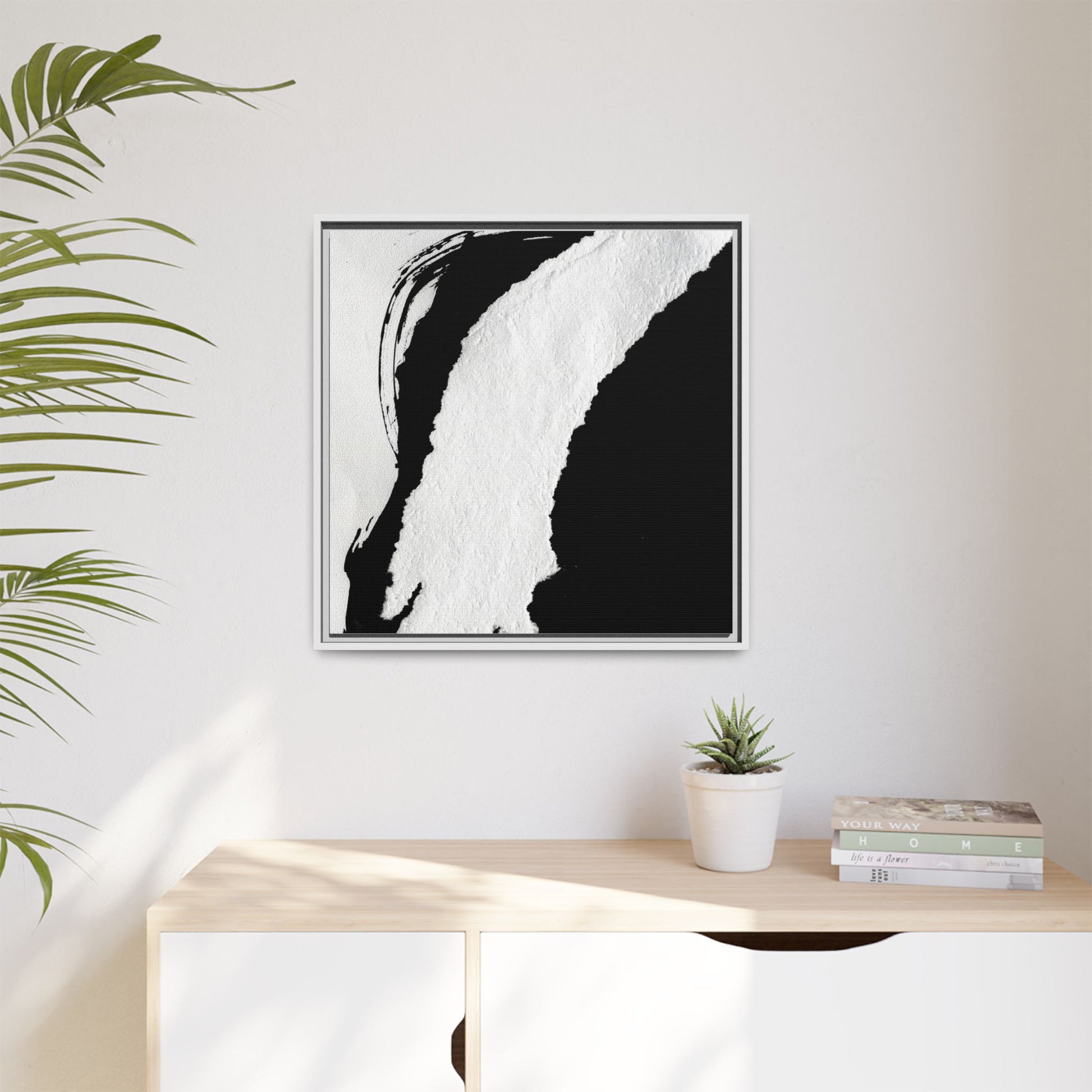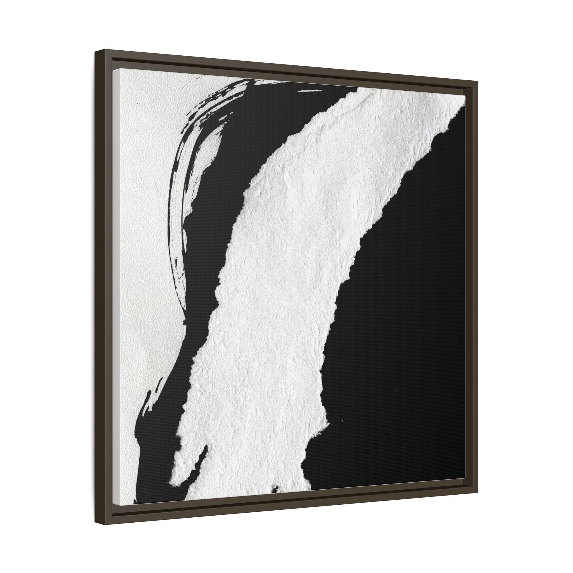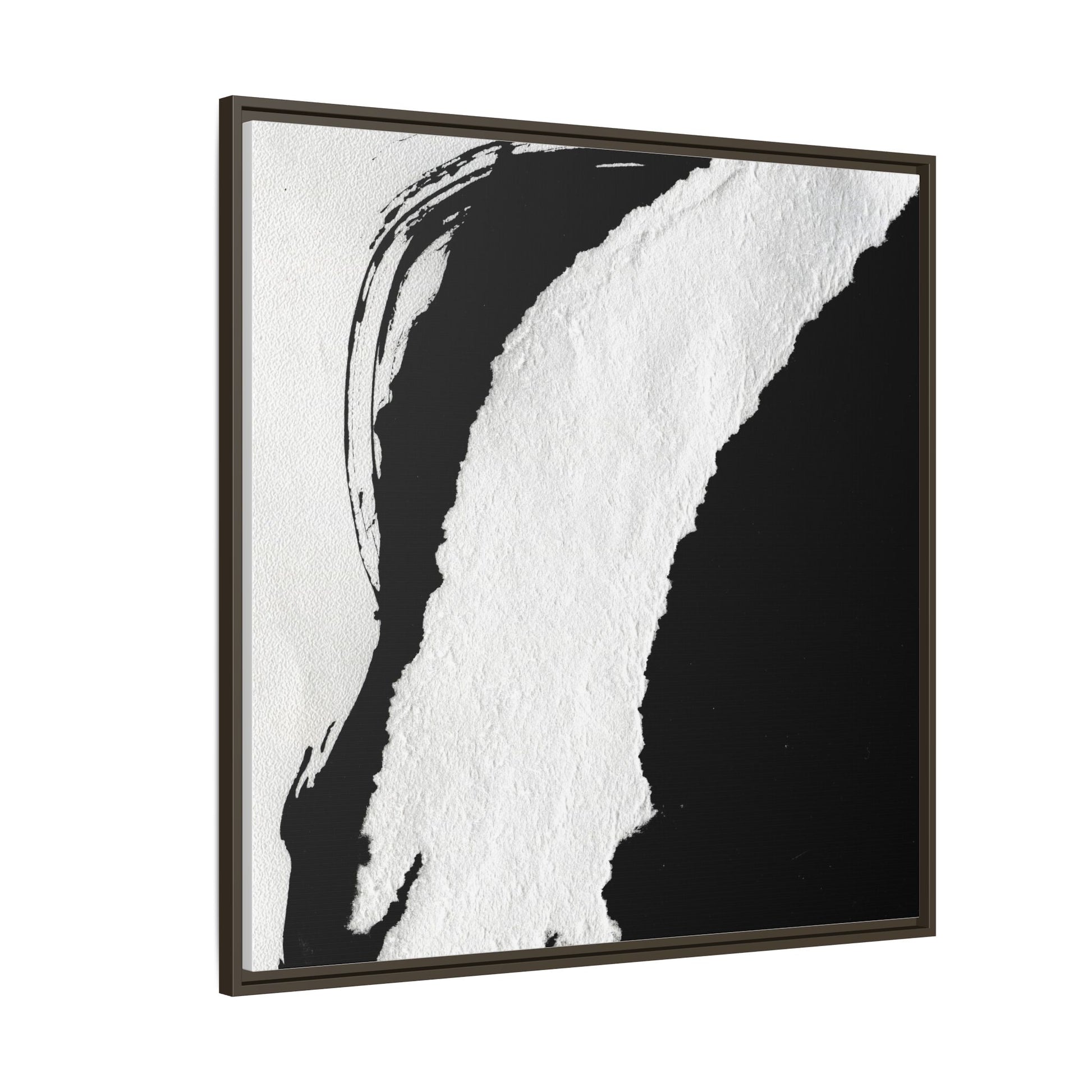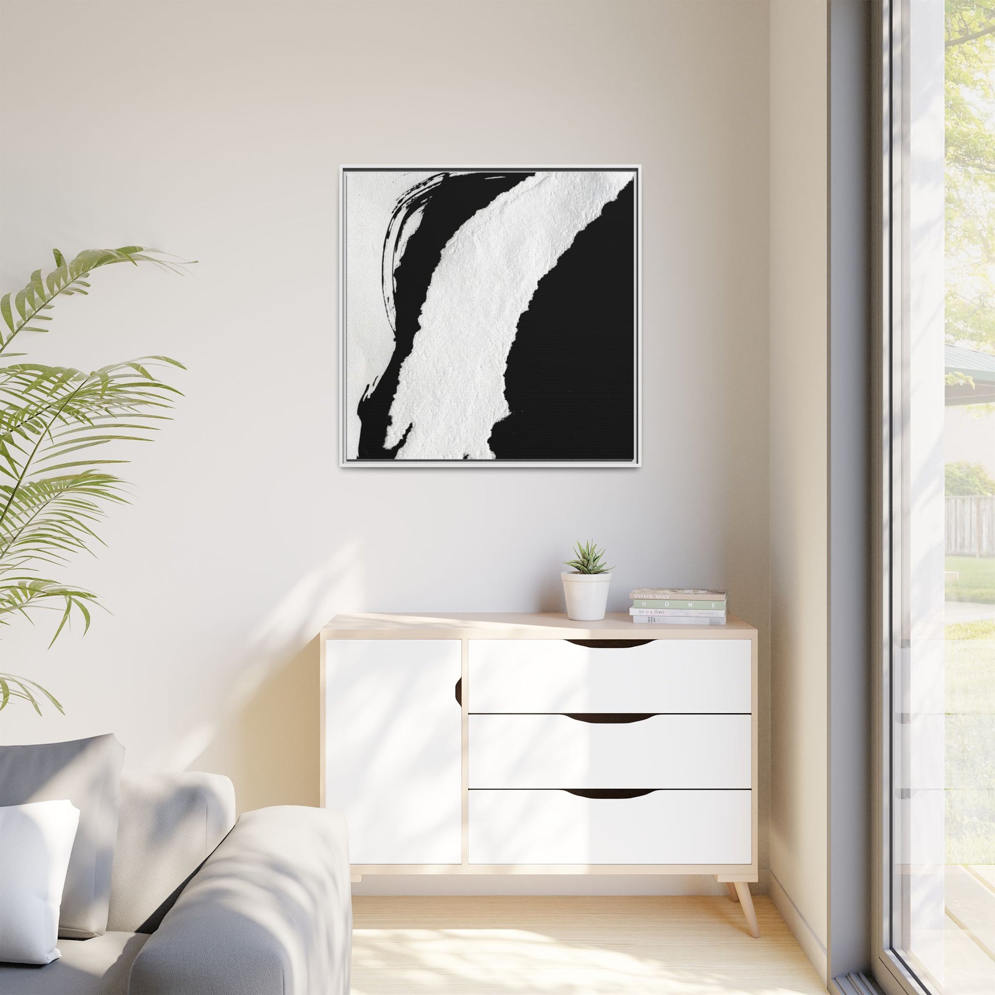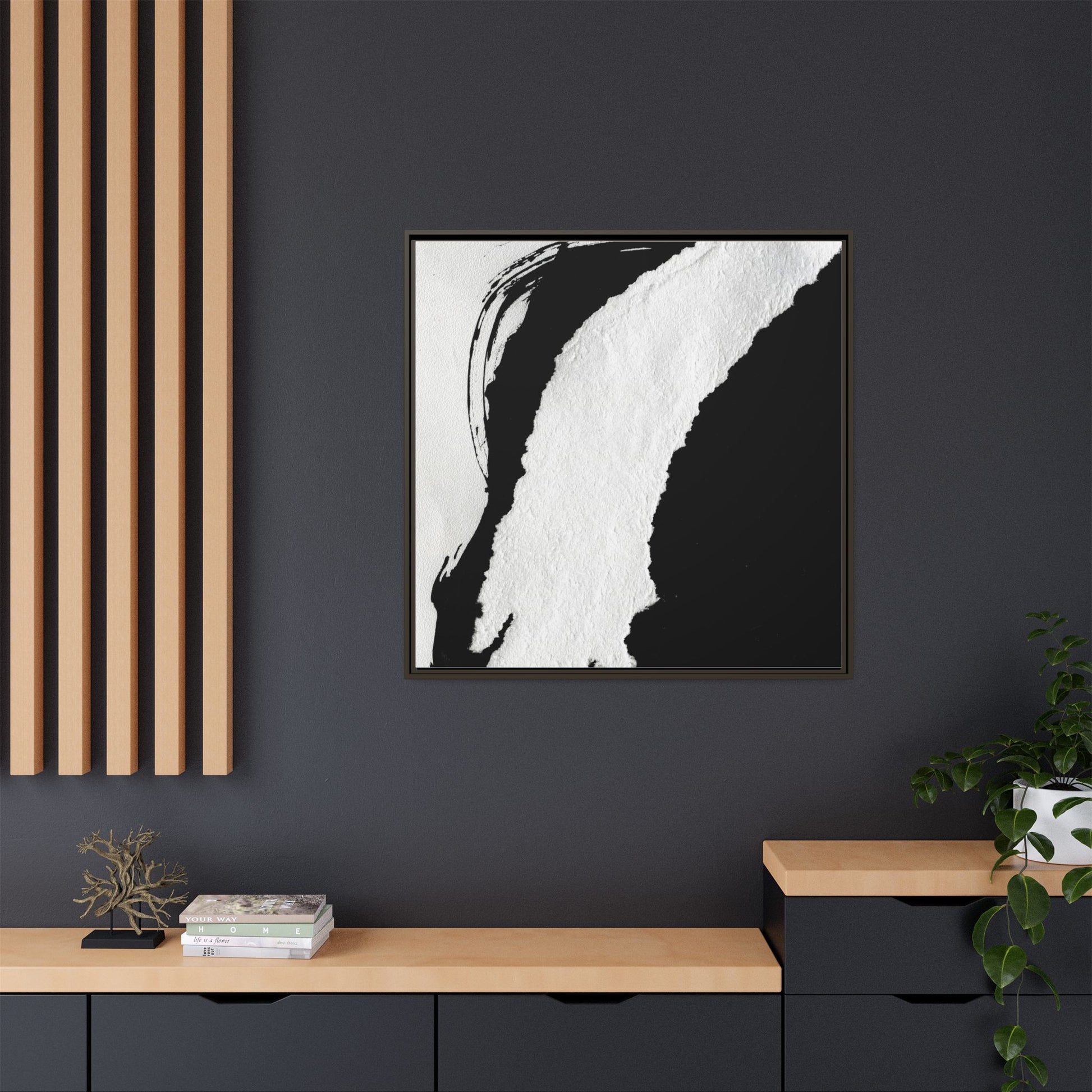 This striking black and white abstract image features a bold, organic composition of contrasting shapes and textures. The artwork presents a dramatic interplay between deep black backgrounds and a textured white central form that appears to flow and curve dynamically. Sharp, gestural brush-like marks accent the left side of the image, creating a sense of movement and energy. The white section has a rough, almost paper-like texture that adds depth and tactile quality to the piece. The overall design suggests a minimalist, expressionist approach to visual art, emphasizing form, contrast, and gestural mark-making.