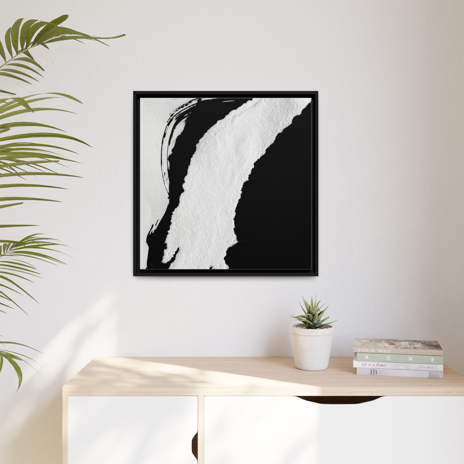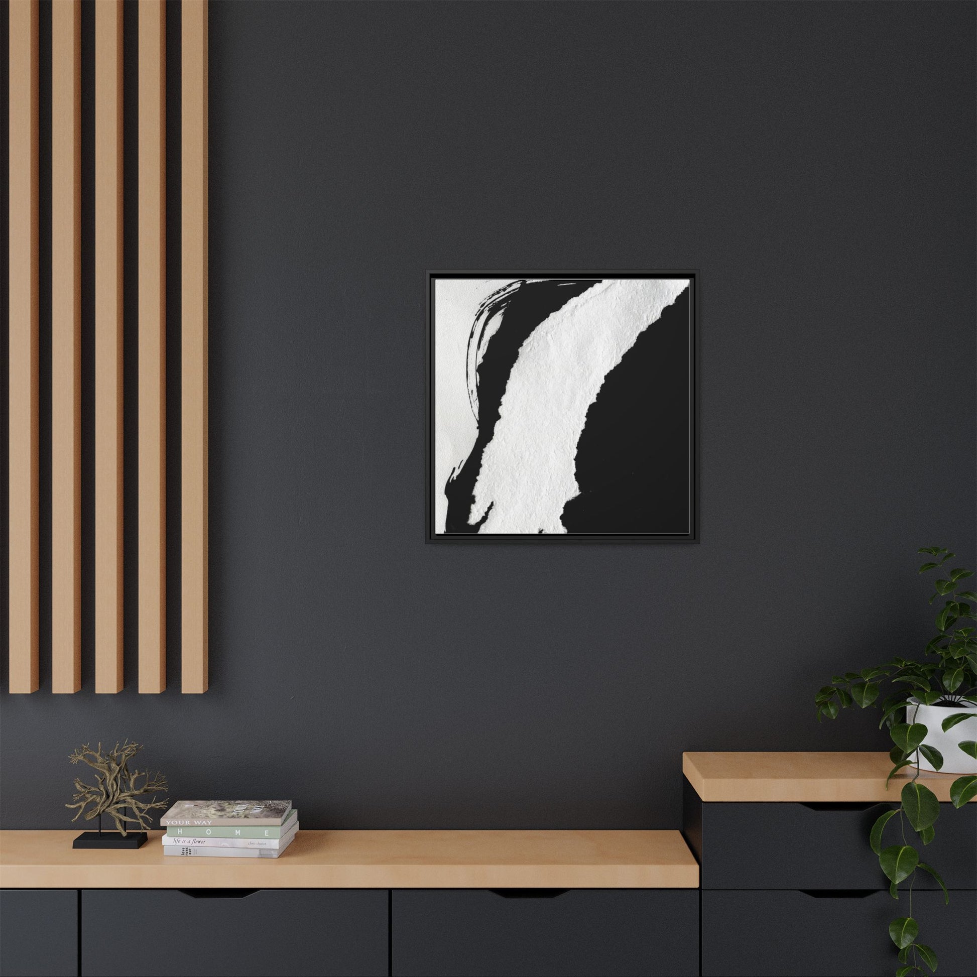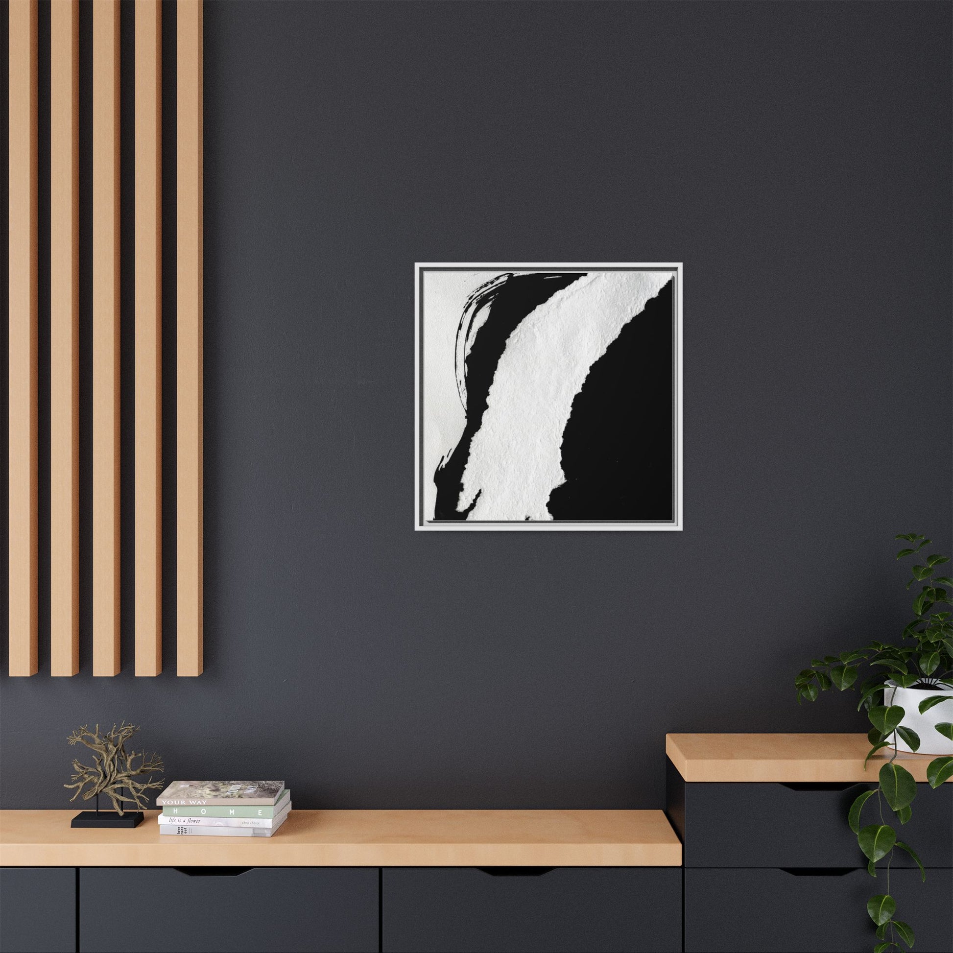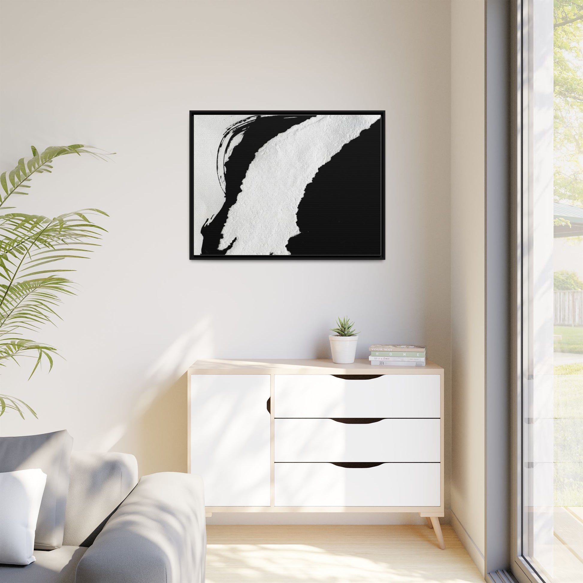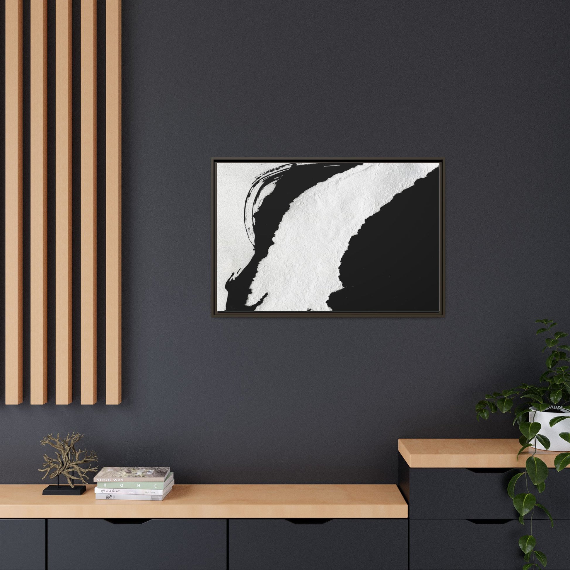 This striking black and white abstract image features a bold, organic composition of contrasting shapes and textures. The artwork presents a dramatic interplay between deep black backgrounds and a textured white central form that appears to flow and curve dynamically. Sharp, gestural brush-like marks accent the left side of the image, creating a sense of movement and energy. The white section has a rough, almost paper-like texture that adds depth and tactile quality to the piece. The overall design suggests a minimalist, expressionist approach to visual art, emphasizing form, contrast, and gestural mark-making.