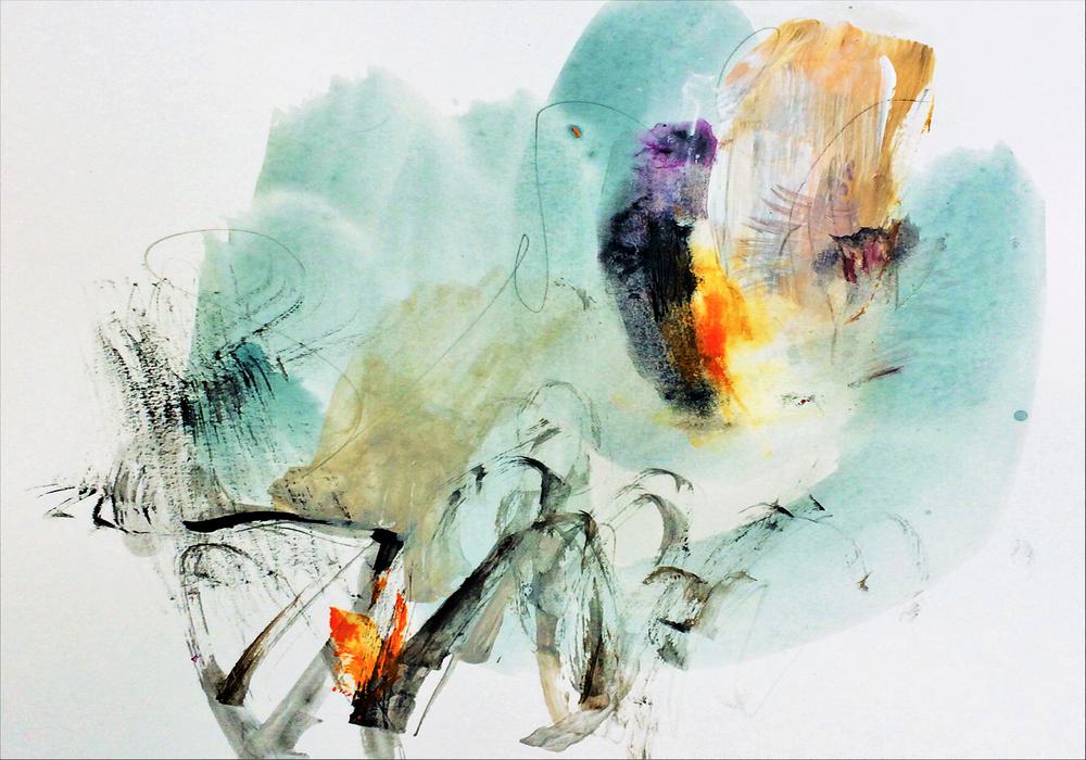 A delicate dance of muted aqua and bold strokes, where fiery bursts ignite a serene, ethereal landscape.