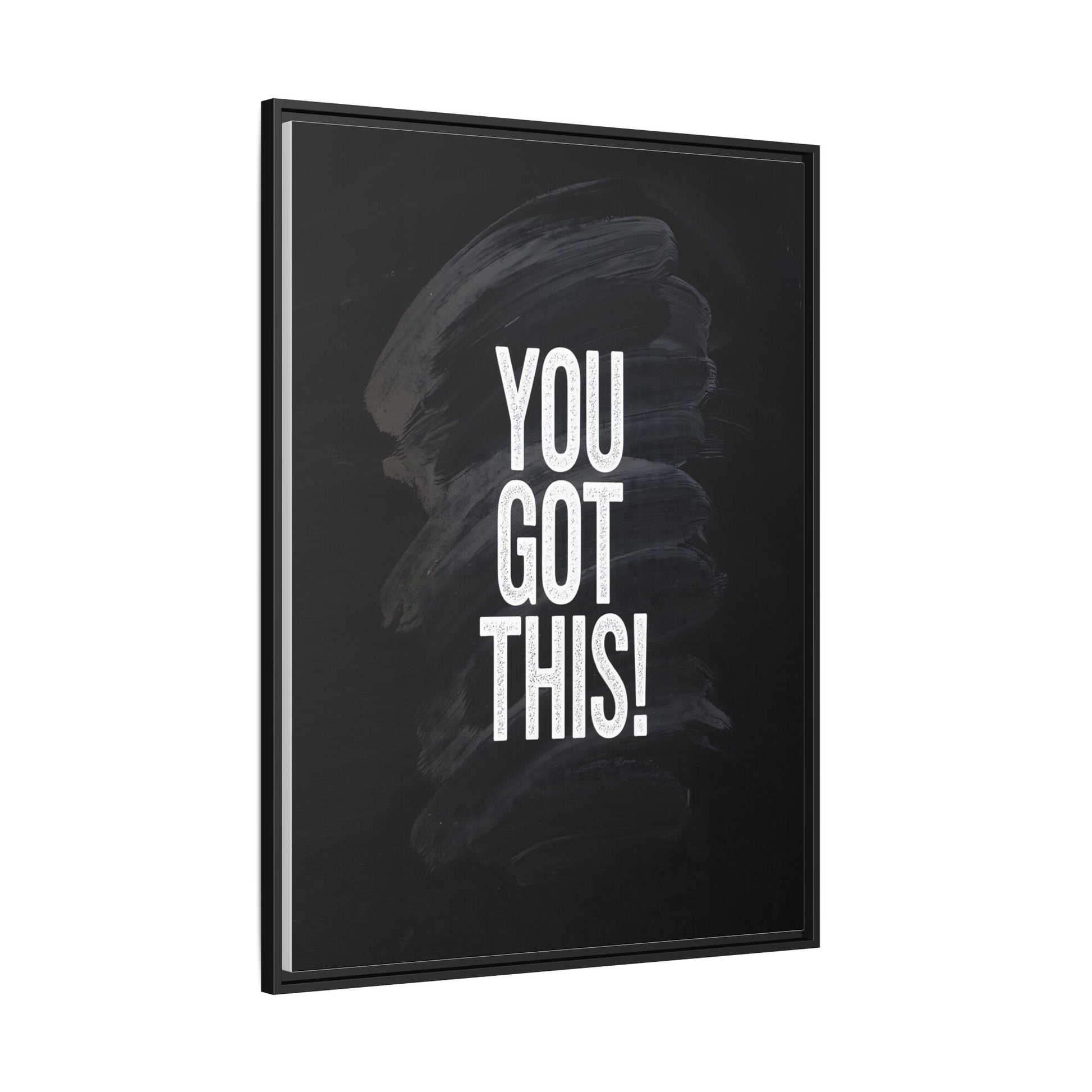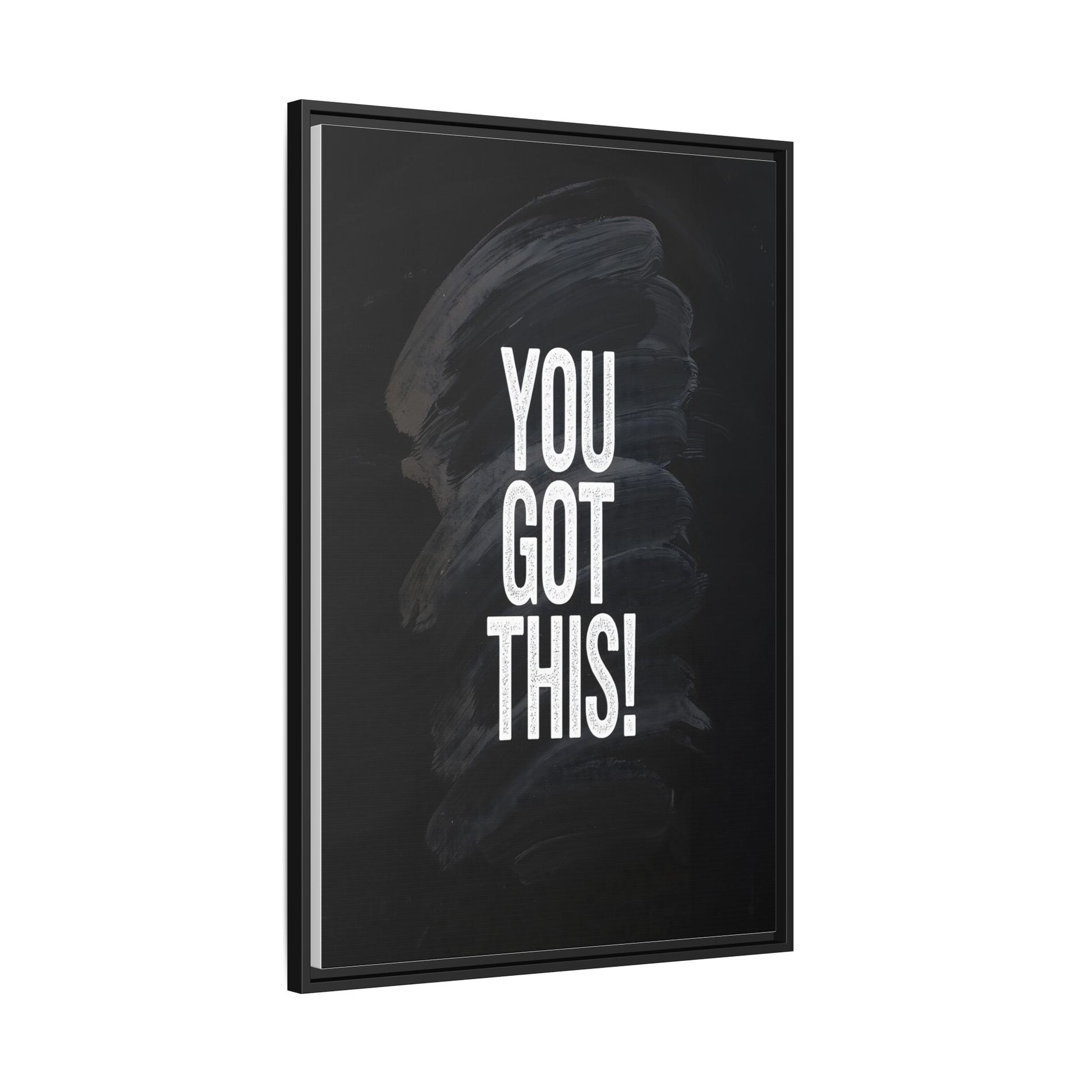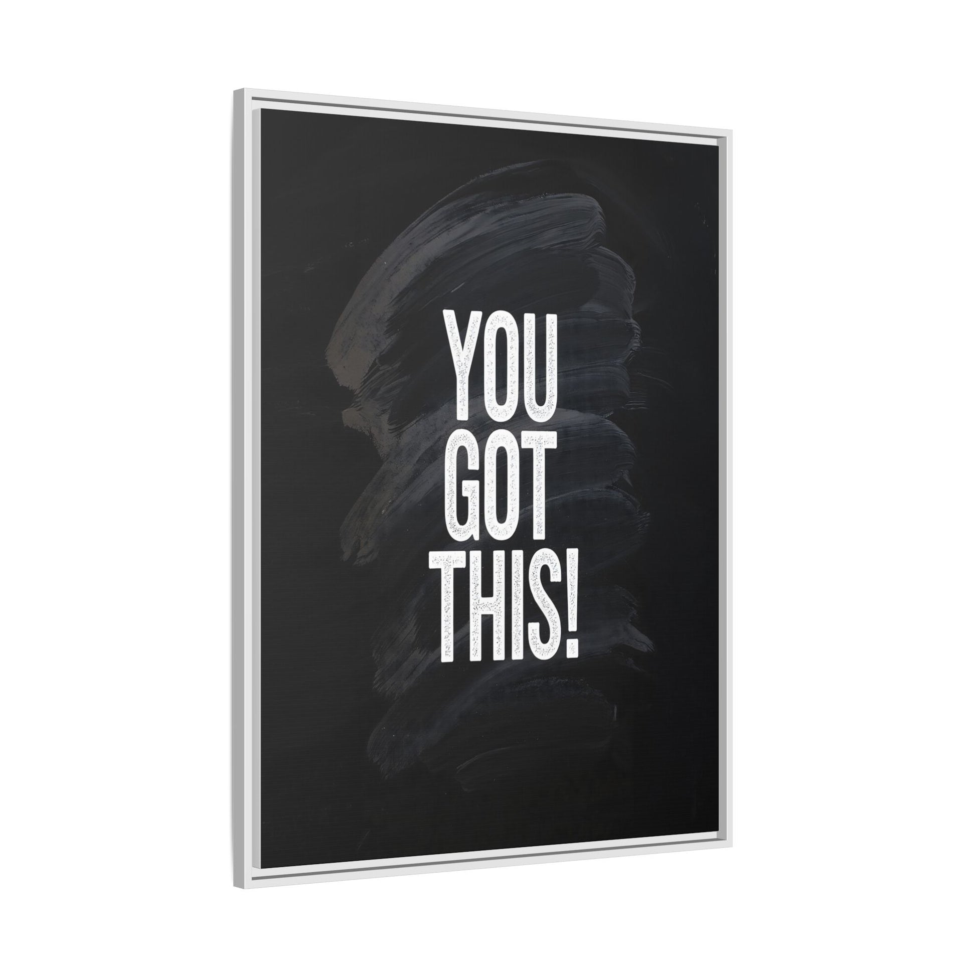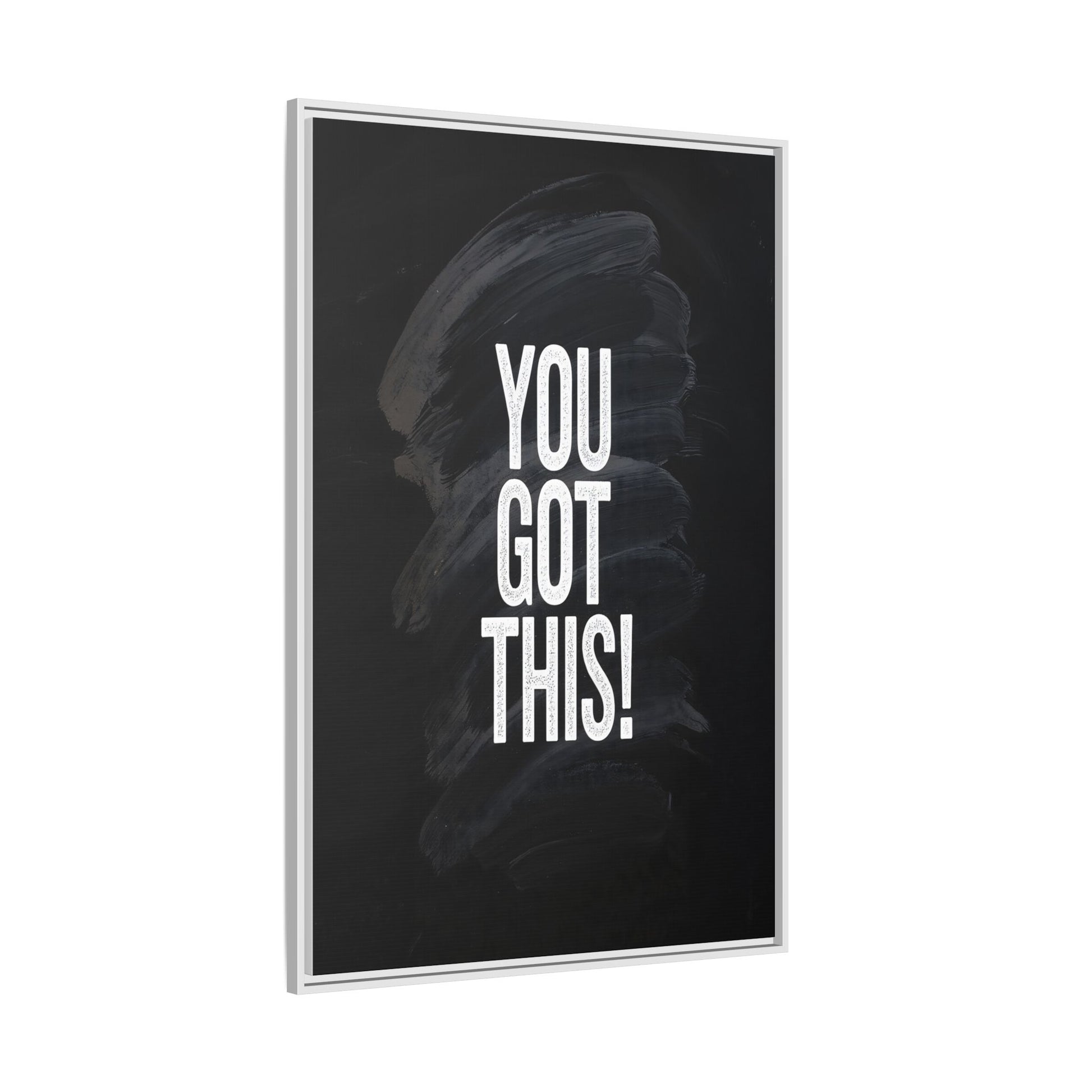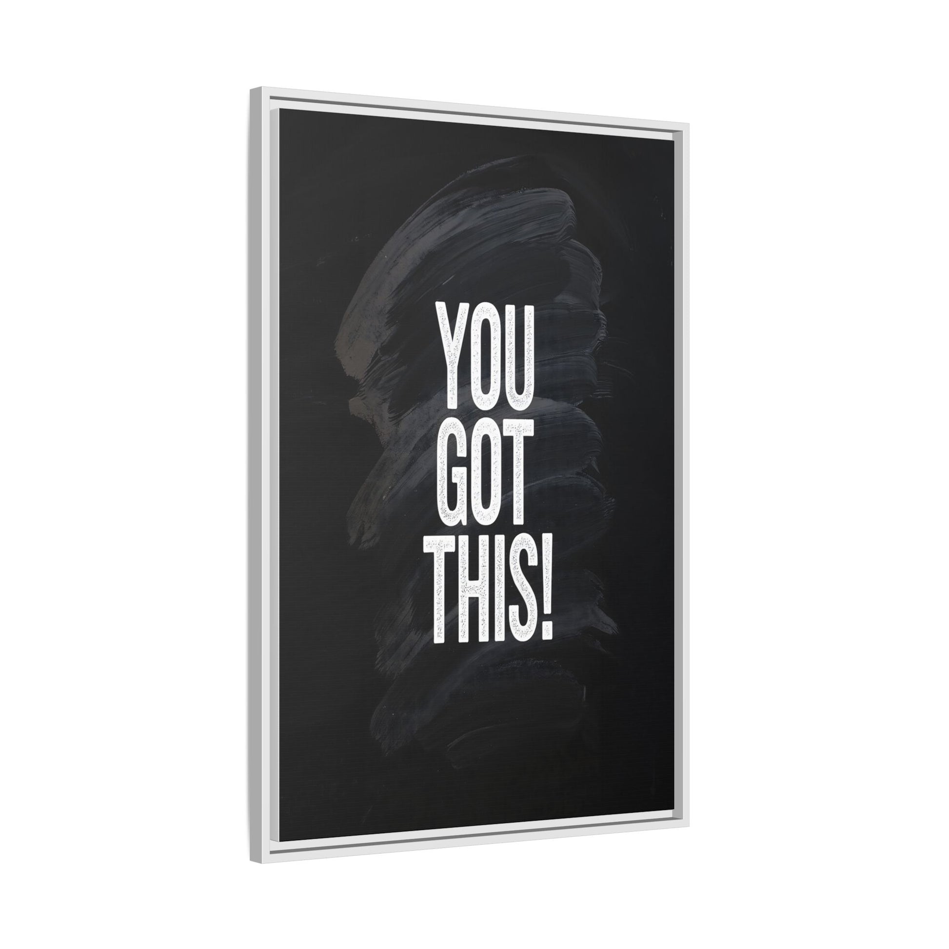 This image features the motivational text "YOU GOT THIS!" in bold, white, slightly textured typography positioned against a dark, moody background. The background consists of dramatic, sweeping black and gray brushstrokes that create a sense of dynamic movement and energy. The text appears to be centered and stands out sharply against the dark, paint-like backdrop, creating a strong visual contrast. The design has a minimalist yet powerful aesthetic, suggesting encouragement and empowerment. The grungy, textured style of both the text and background gives the image an intense and inspiring feel.