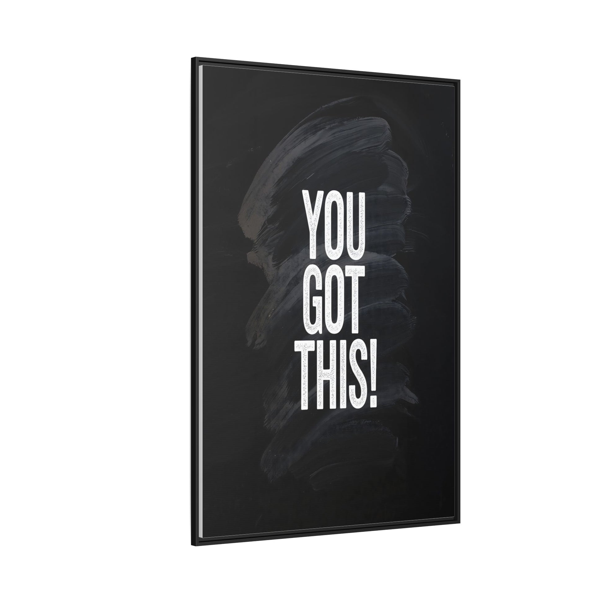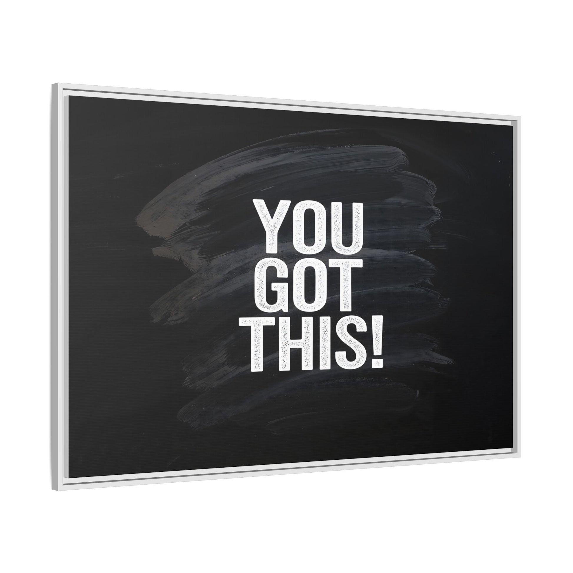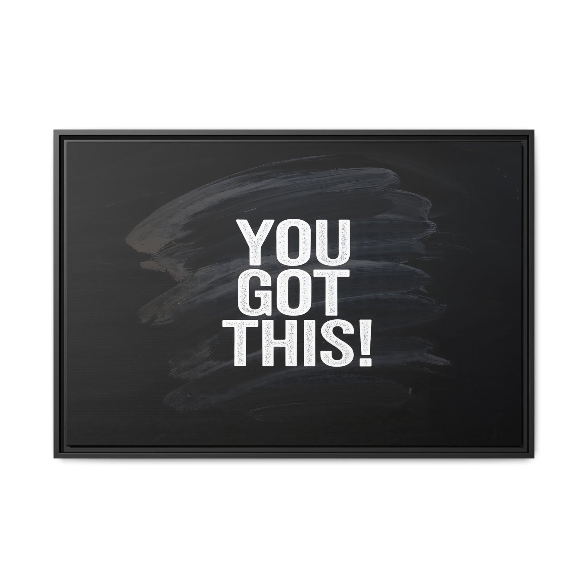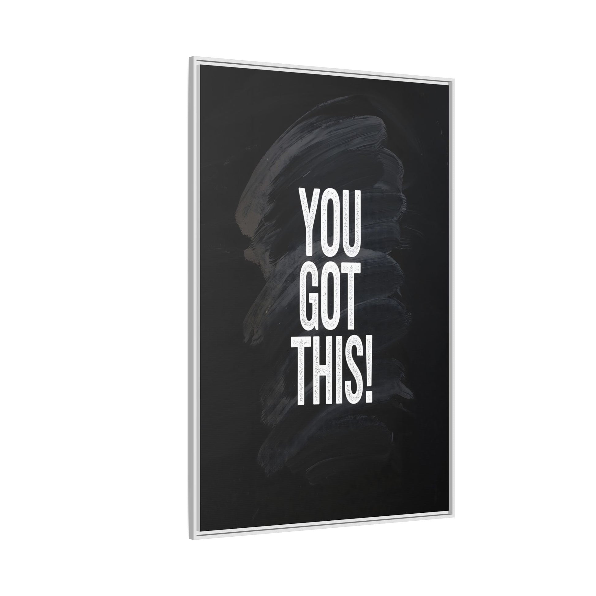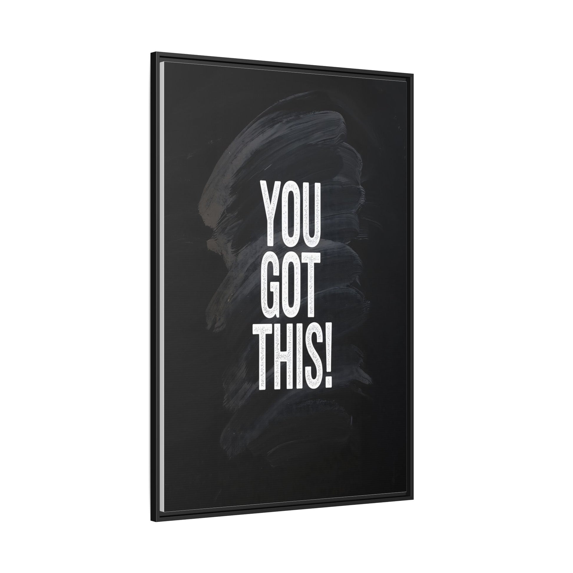 This image features the motivational text "YOU GOT THIS!" in bold, white, slightly textured typography positioned against a dark, moody background. The background consists of dramatic, sweeping black and gray brushstrokes that create a sense of dynamic movement and energy. The text appears to be centered and stands out sharply against the dark, paint-like backdrop, creating a strong visual contrast. The design has a minimalist yet powerful aesthetic, suggesting encouragement and empowerment. The grungy, textured style of both the text and background gives the image an intense and inspiring feel.