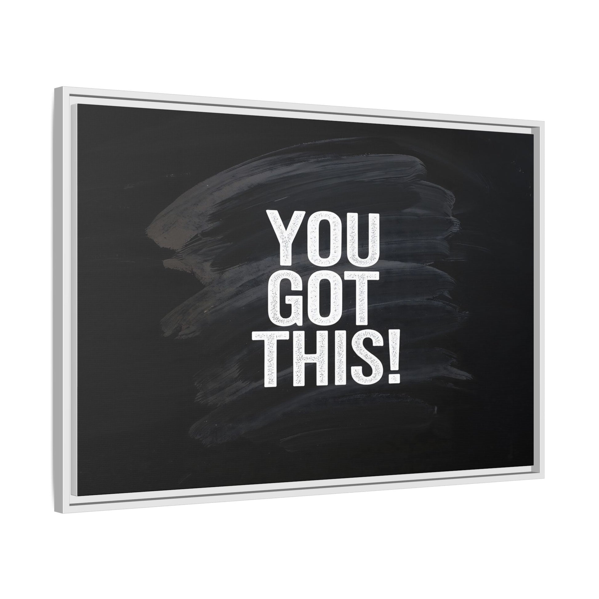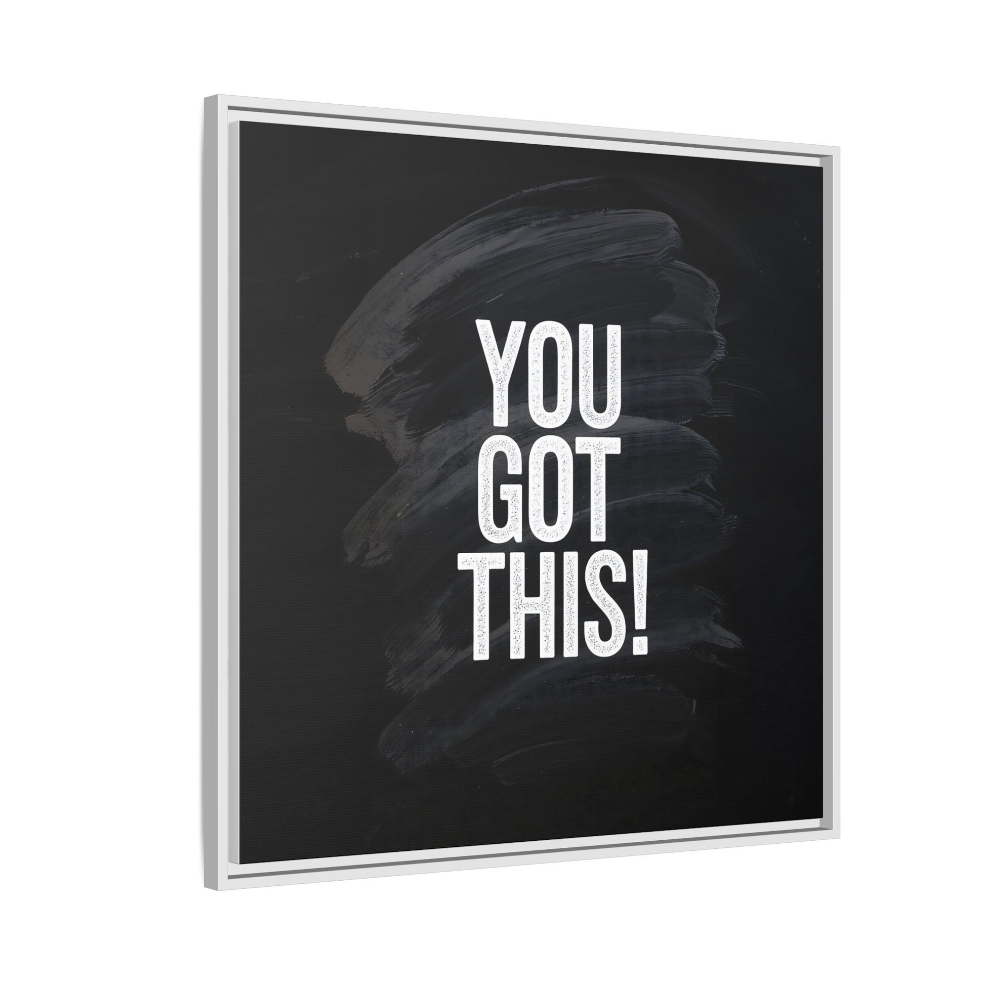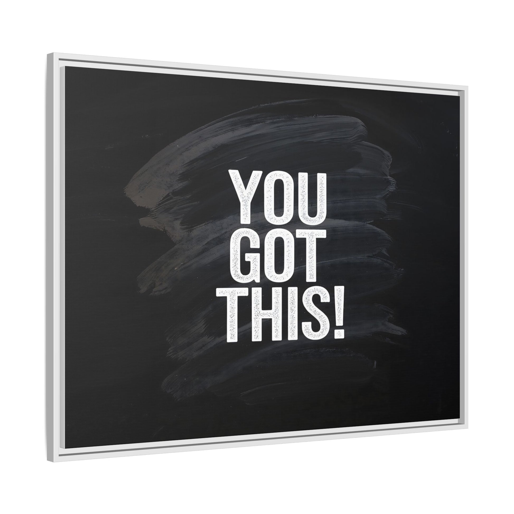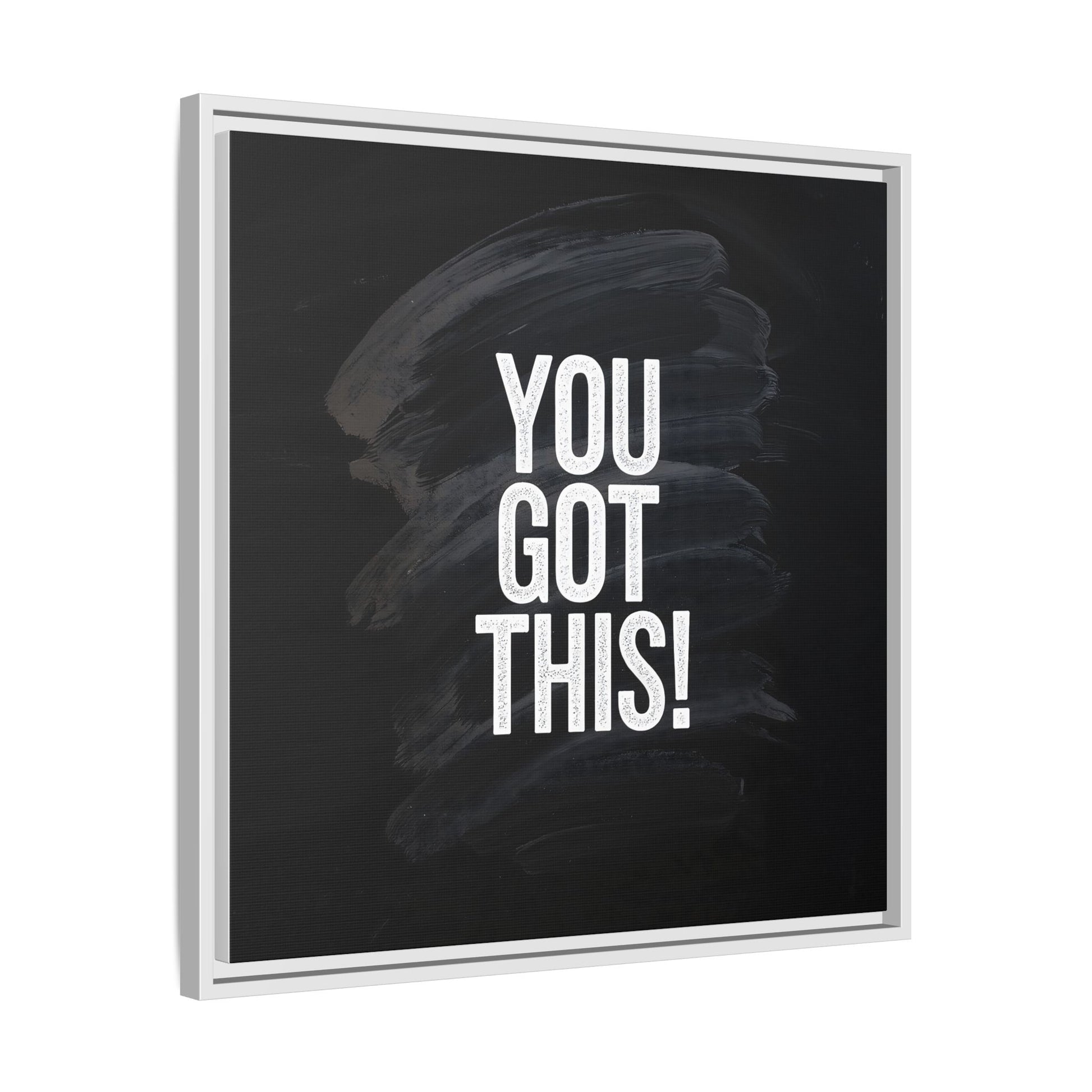 This image features the motivational text "YOU GOT THIS!" in bold, white, slightly textured typography positioned against a dark, moody background. The background consists of dramatic, sweeping black and gray brushstrokes that create a sense of dynamic movement and energy. The text appears to be centered and stands out sharply against the dark, paint-like backdrop, creating a strong visual contrast. The design has a minimalist yet powerful aesthetic, suggesting encouragement and empowerment. The grungy, textured style of both the text and background gives the image an intense and inspiring feel.