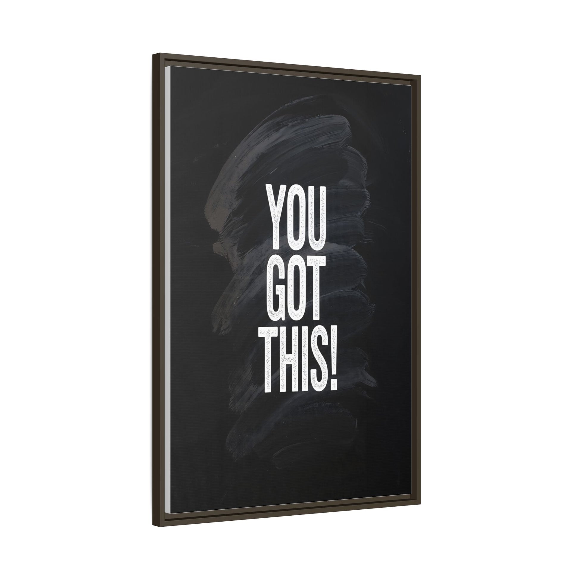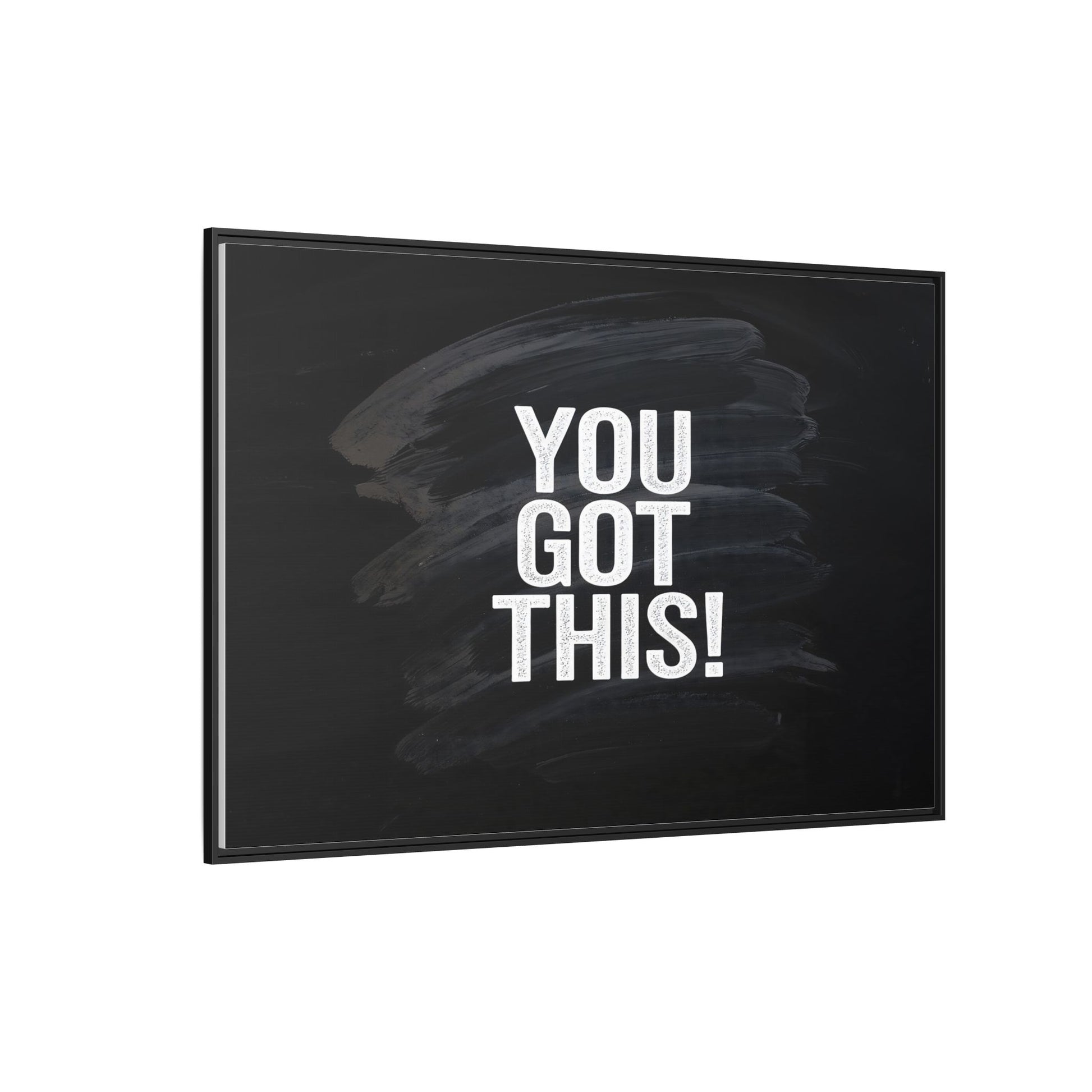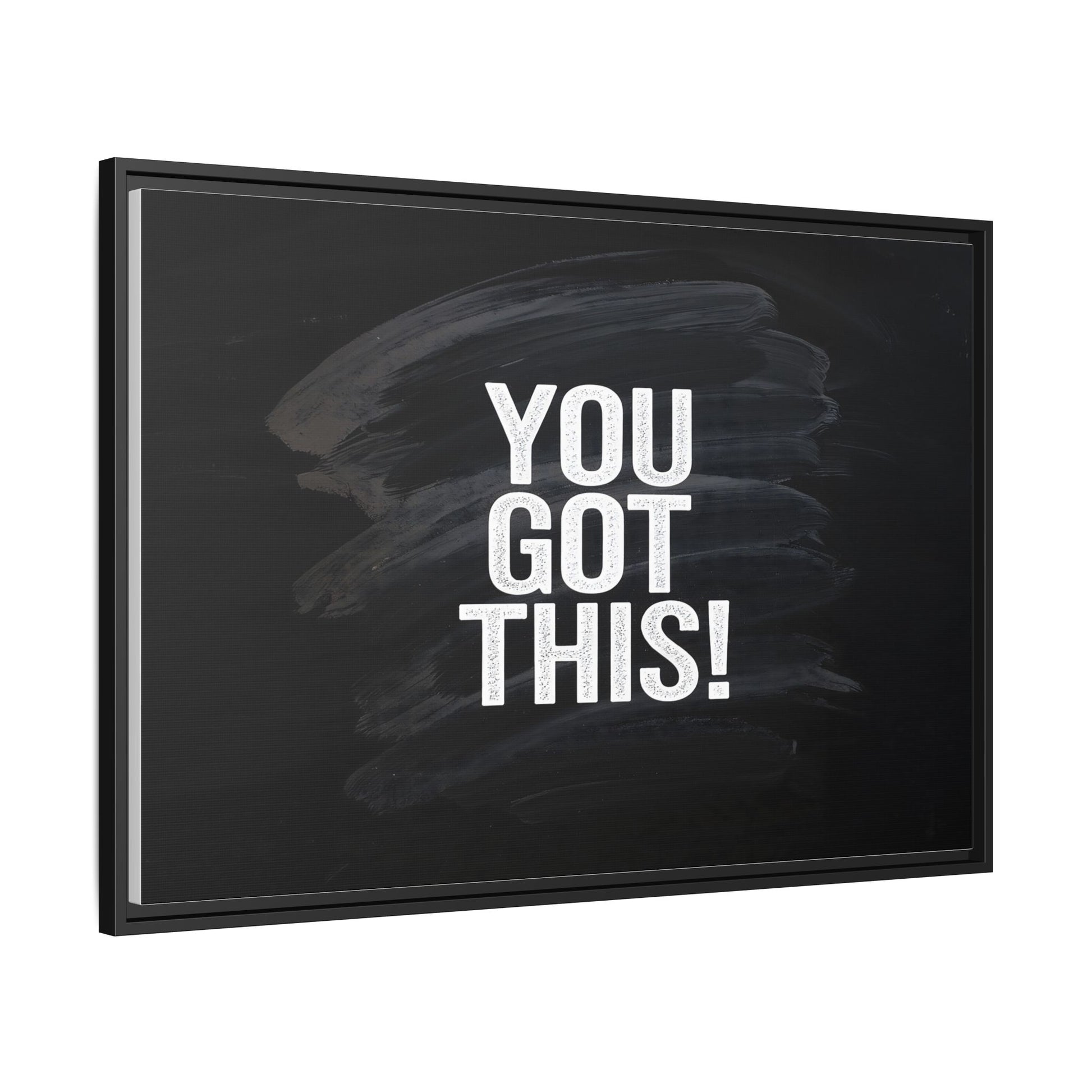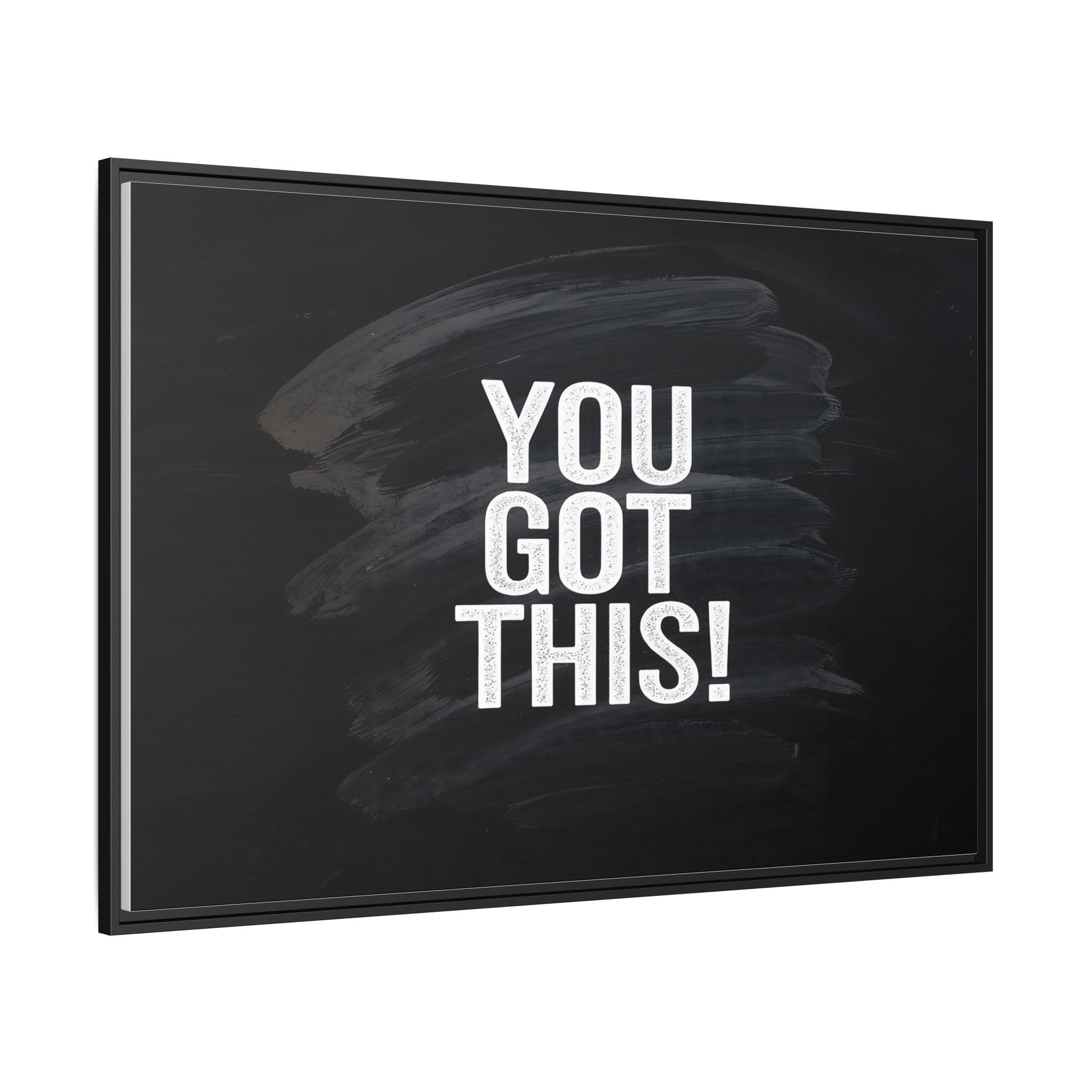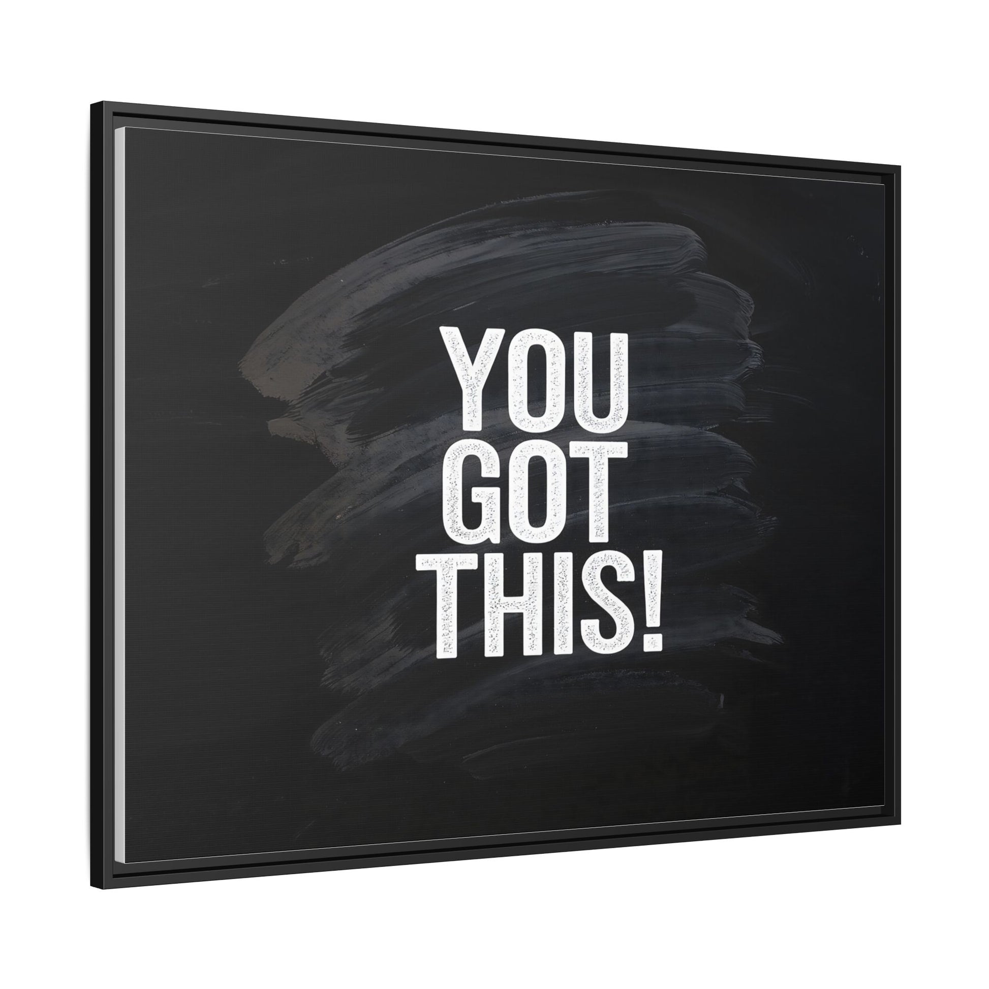 This image features the motivational text "YOU GOT THIS!" in bold, white, slightly textured typography positioned against a dark, moody background. The background consists of dramatic, sweeping black and gray brushstrokes that create a sense of dynamic movement and energy. The text appears to be centered and stands out sharply against the dark, paint-like backdrop, creating a strong visual contrast. The design has a minimalist yet powerful aesthetic, suggesting encouragement and empowerment. The grungy, textured style of both the text and background gives the image an intense and inspiring feel.