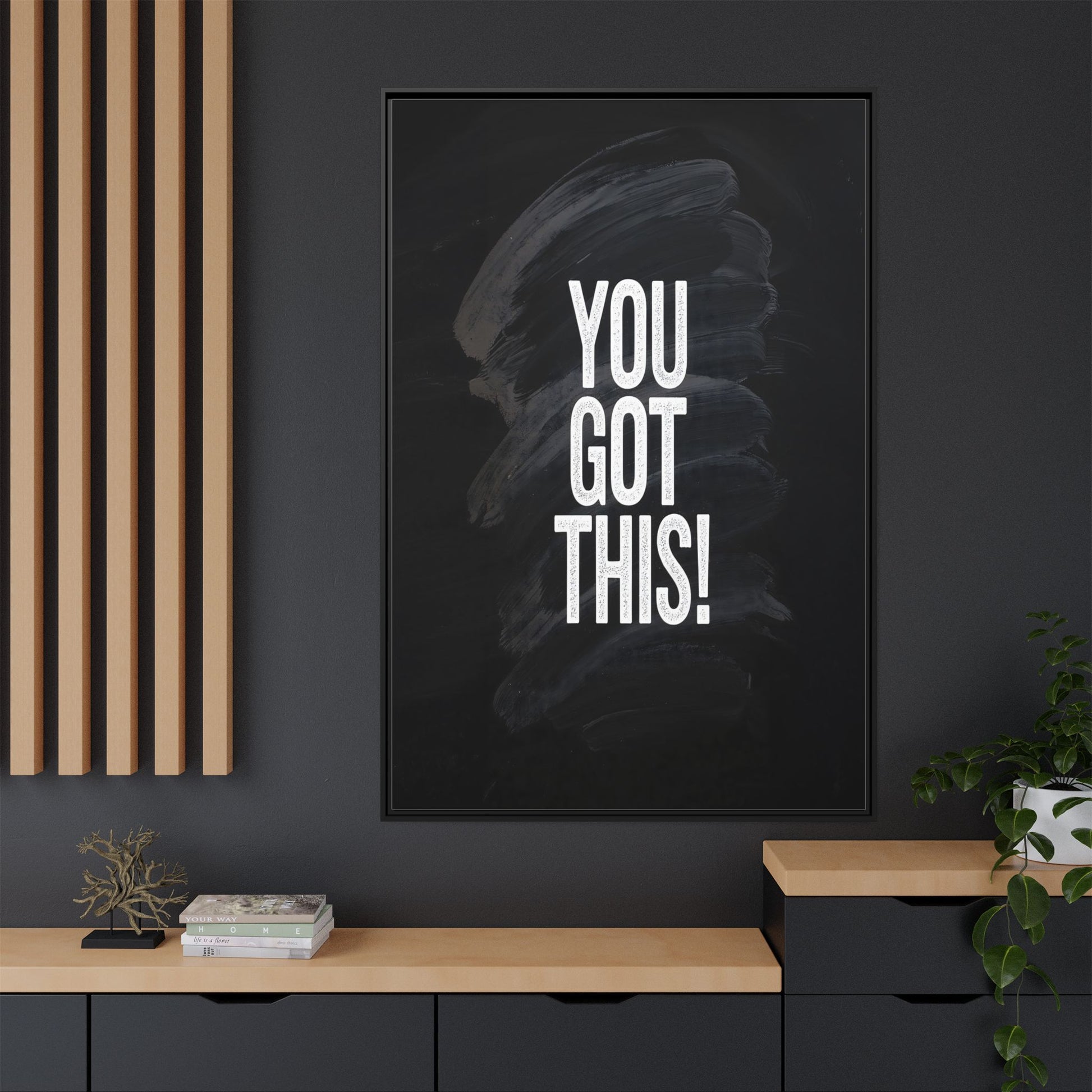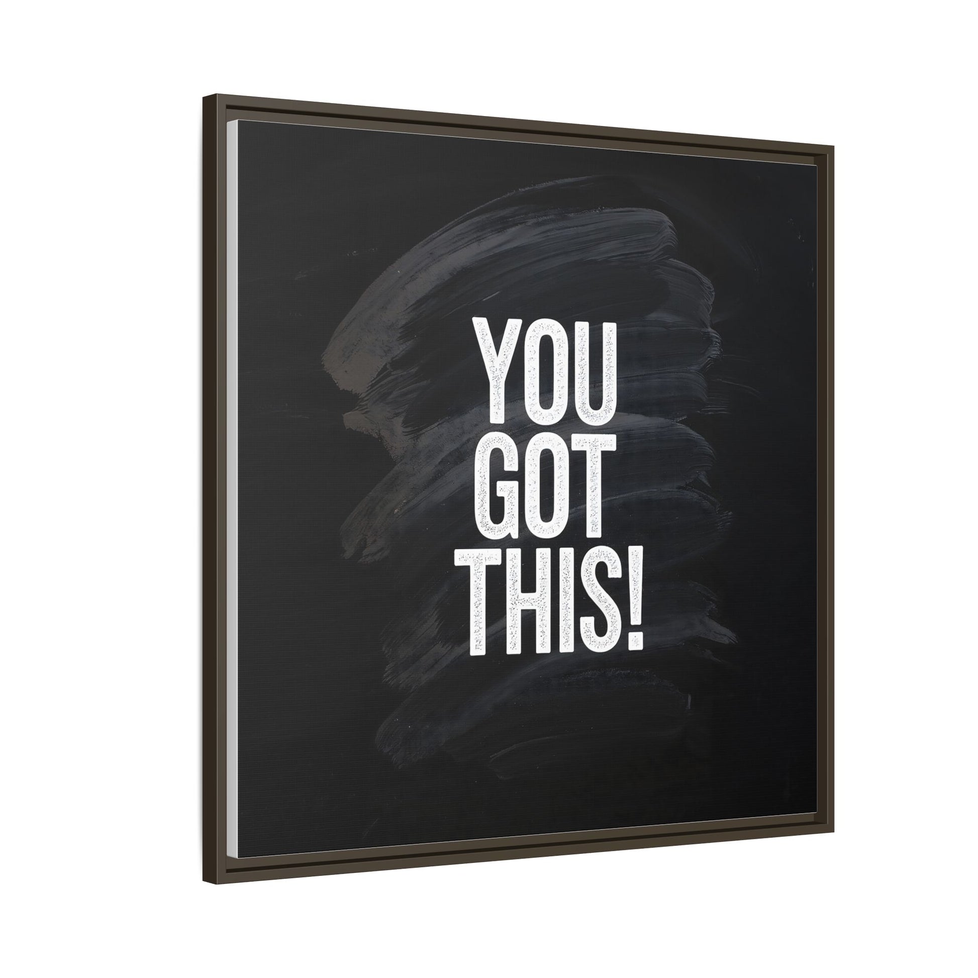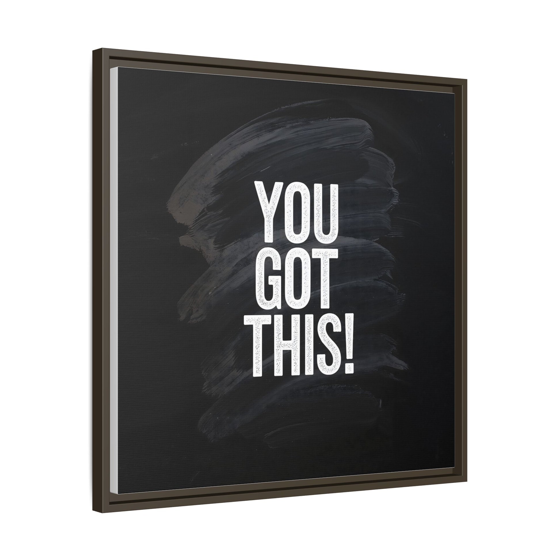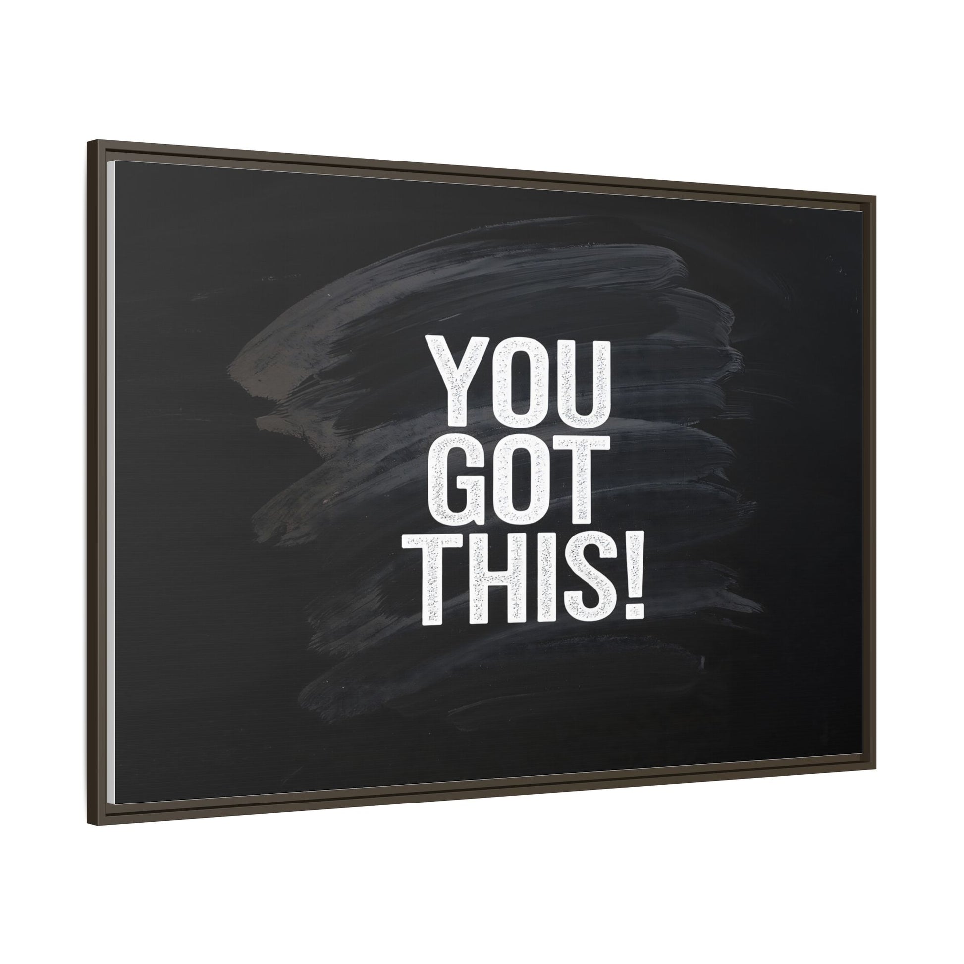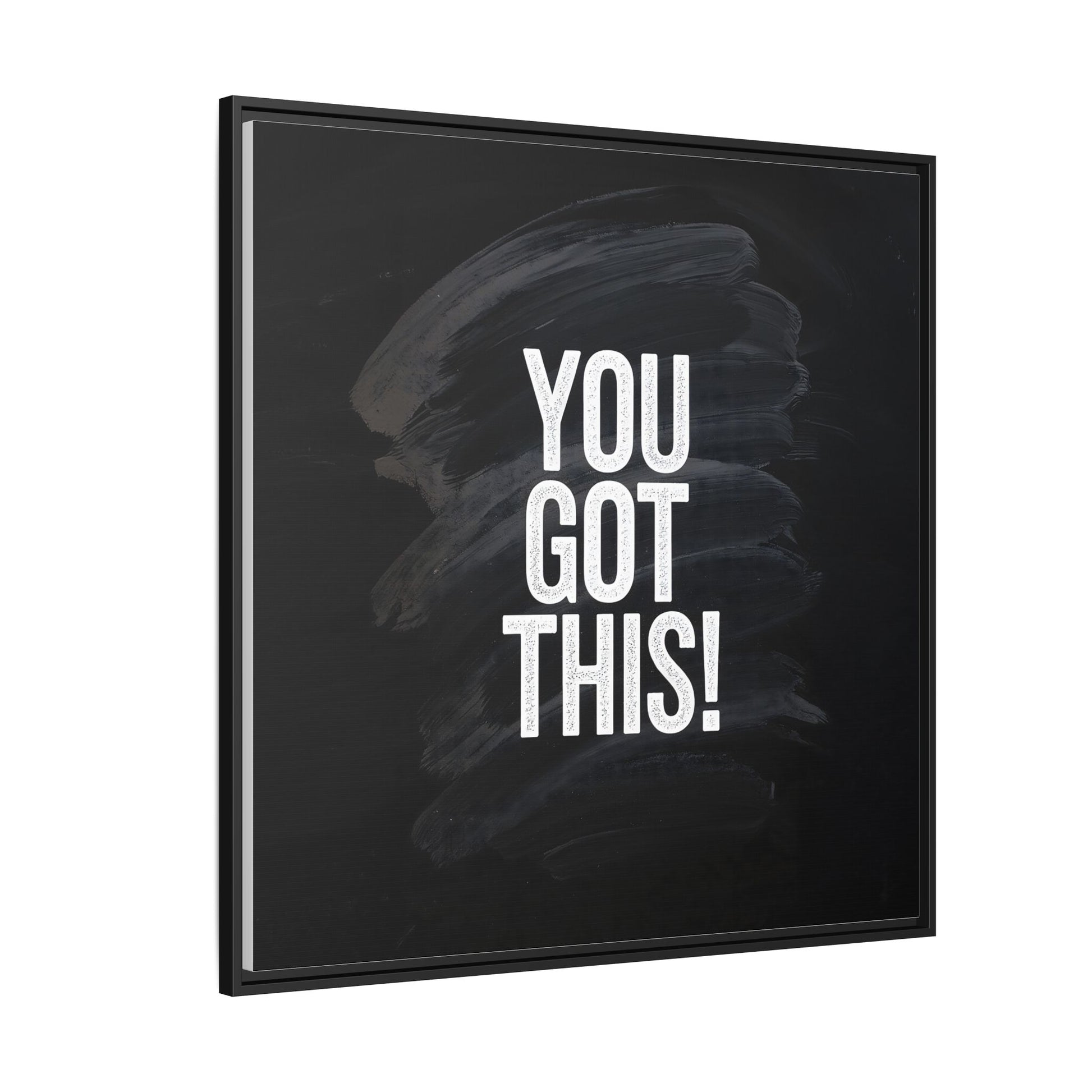 This image features the motivational text "YOU GOT THIS!" in bold, white, slightly textured typography positioned against a dark, moody background. The background consists of dramatic, sweeping black and gray brushstrokes that create a sense of dynamic movement and energy. The text appears to be centered and stands out sharply against the dark, paint-like backdrop, creating a strong visual contrast. The design has a minimalist yet powerful aesthetic, suggesting encouragement and empowerment. The grungy, textured style of both the text and background gives the image an intense and inspiring feel.