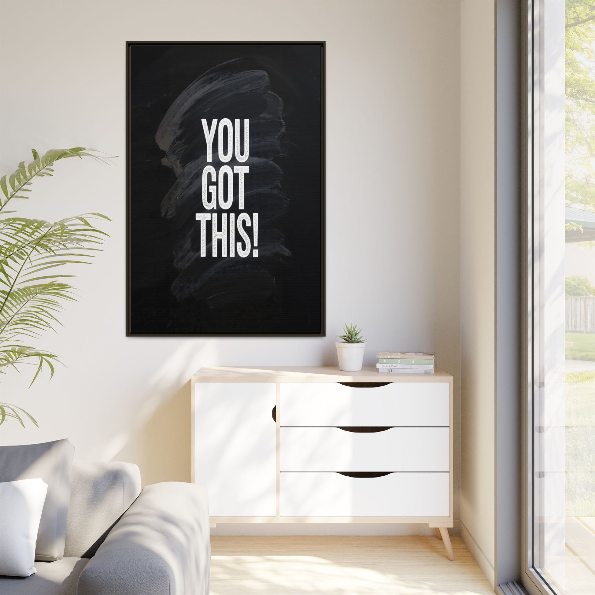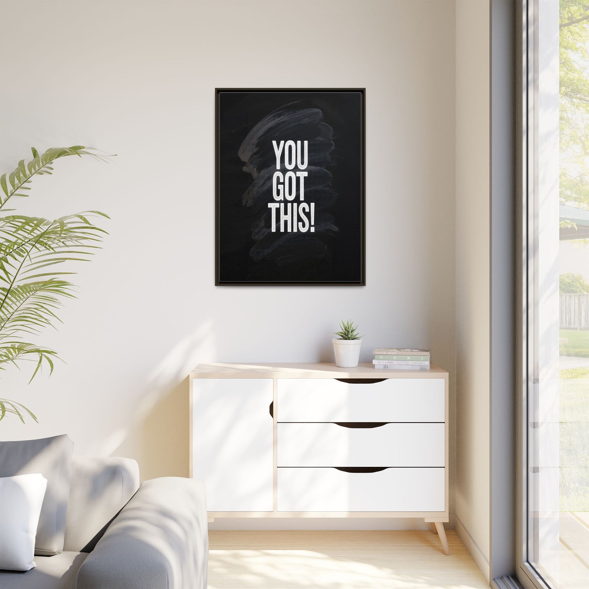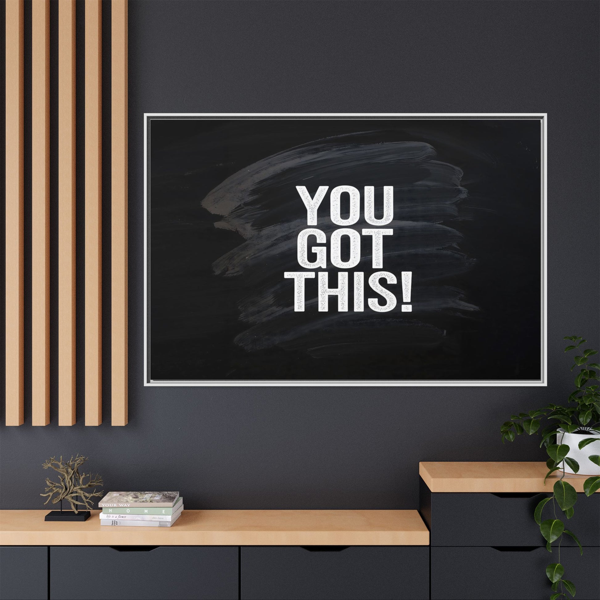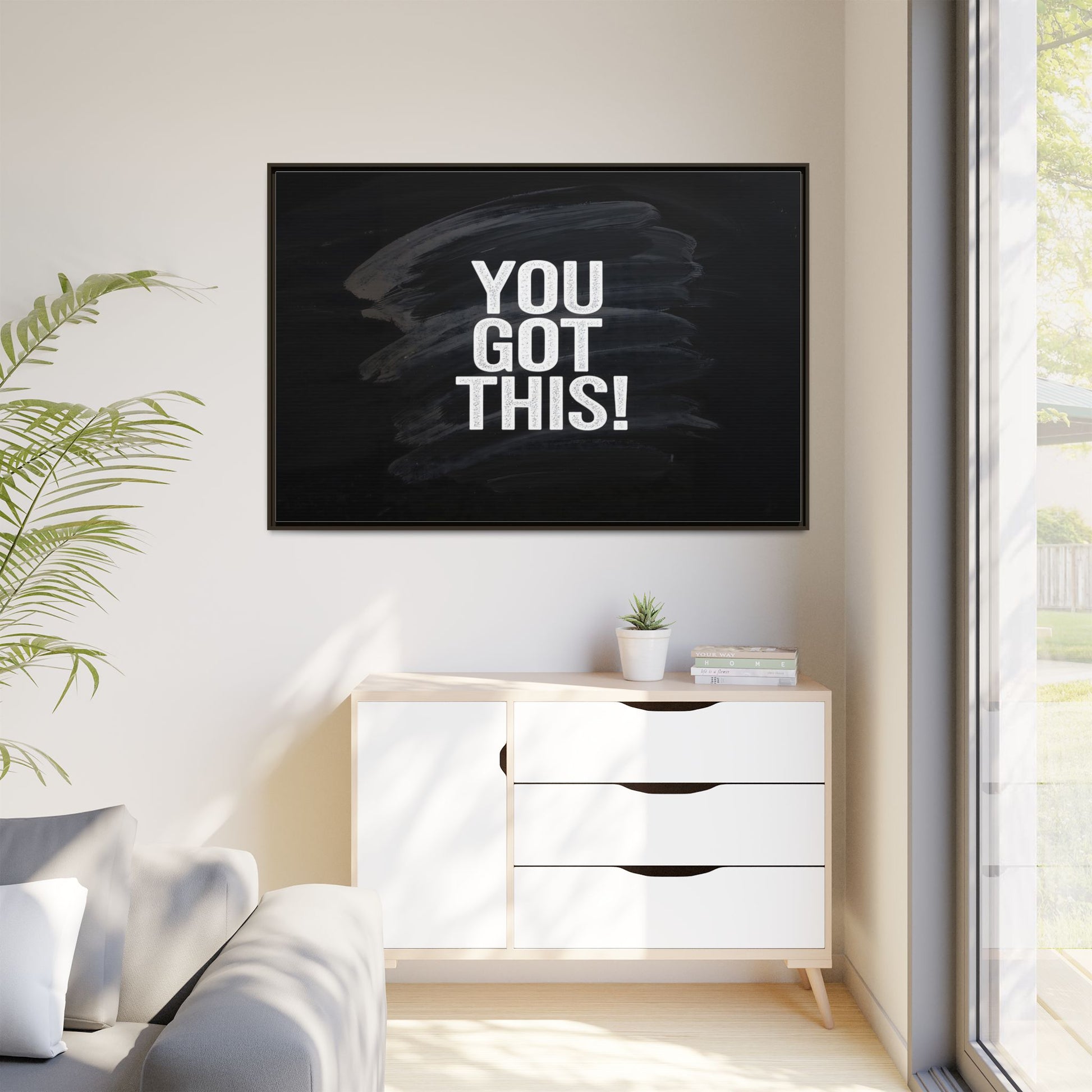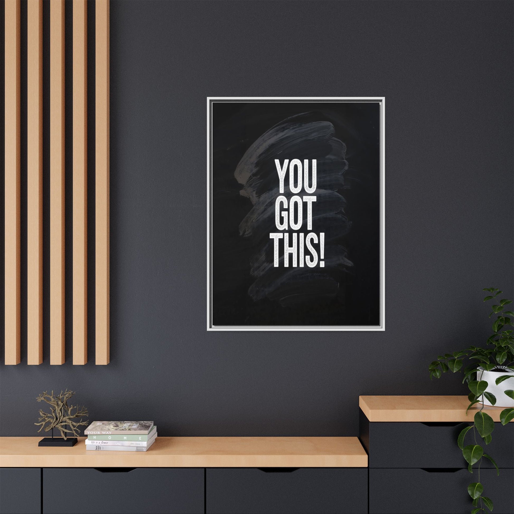 This image features the motivational text "YOU GOT THIS!" in bold, white, slightly textured typography positioned against a dark, moody background. The background consists of dramatic, sweeping black and gray brushstrokes that create a sense of dynamic movement and energy. The text appears to be centered and stands out sharply against the dark, paint-like backdrop, creating a strong visual contrast. The design has a minimalist yet powerful aesthetic, suggesting encouragement and empowerment. The grungy, textured style of both the text and background gives the image an intense and inspiring feel.