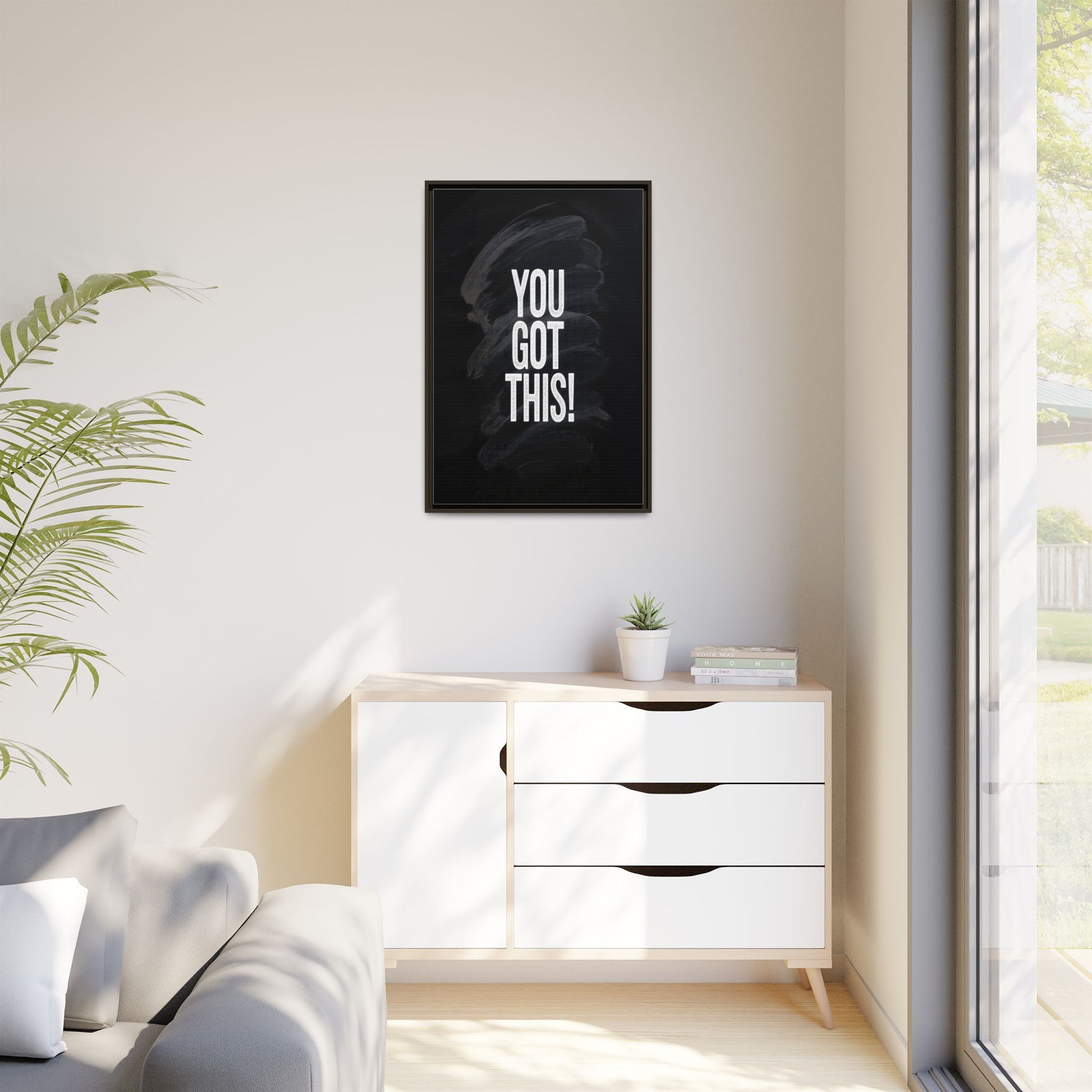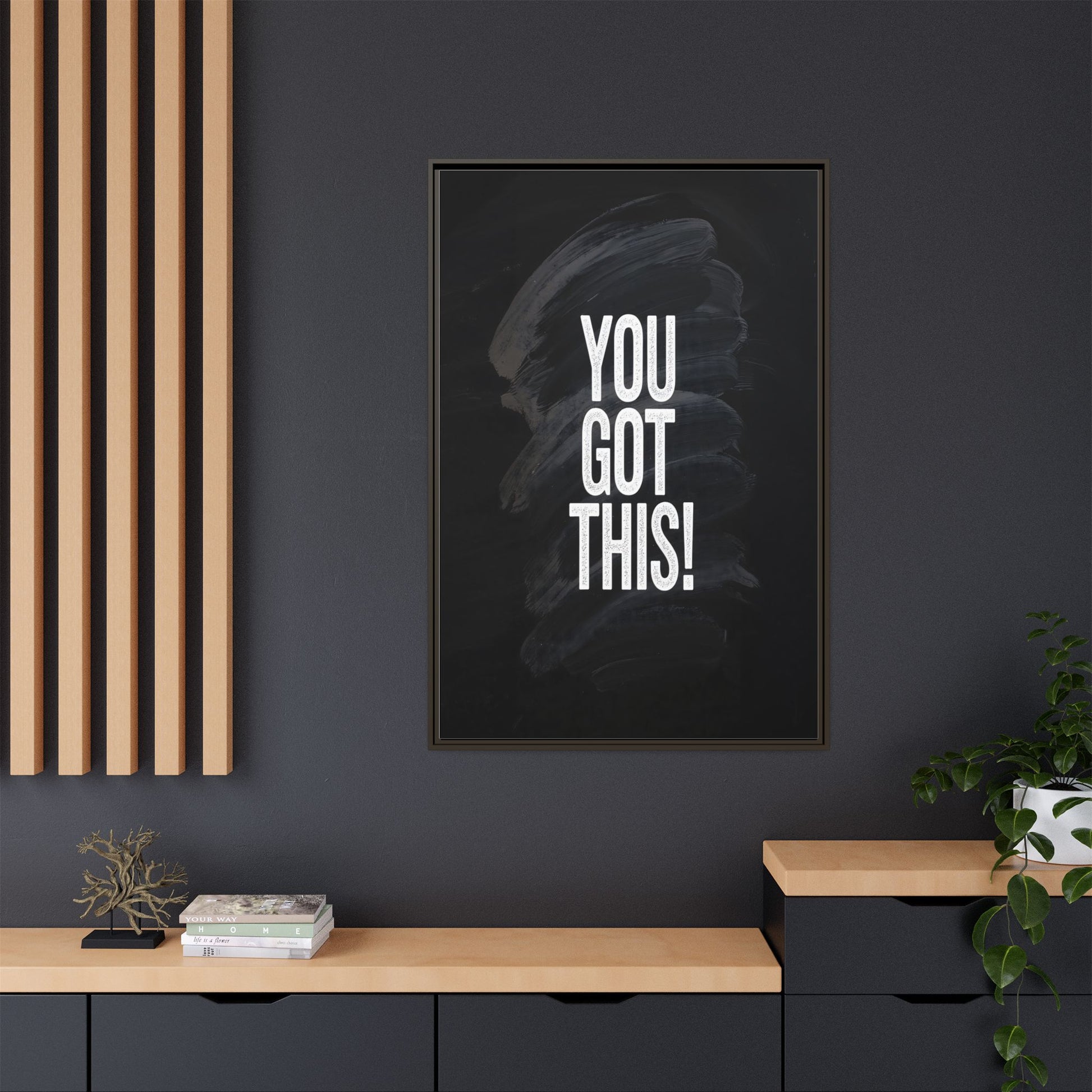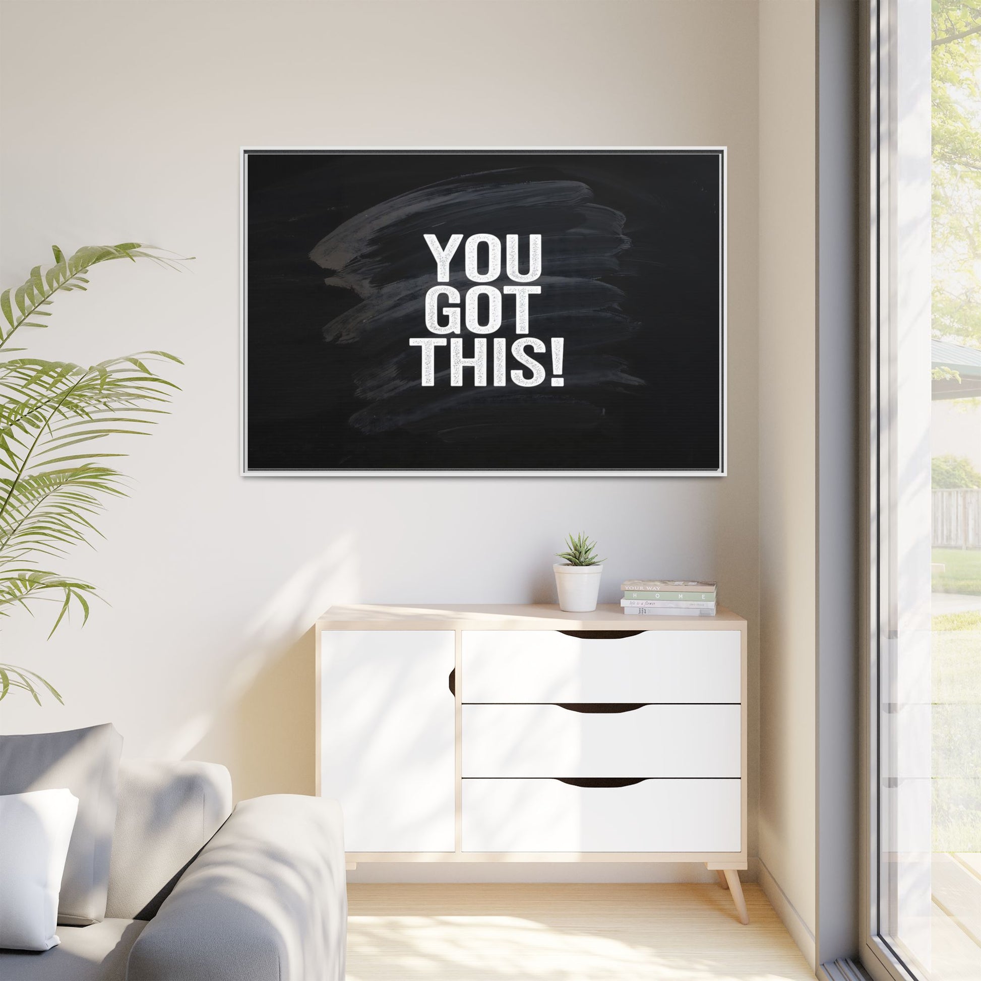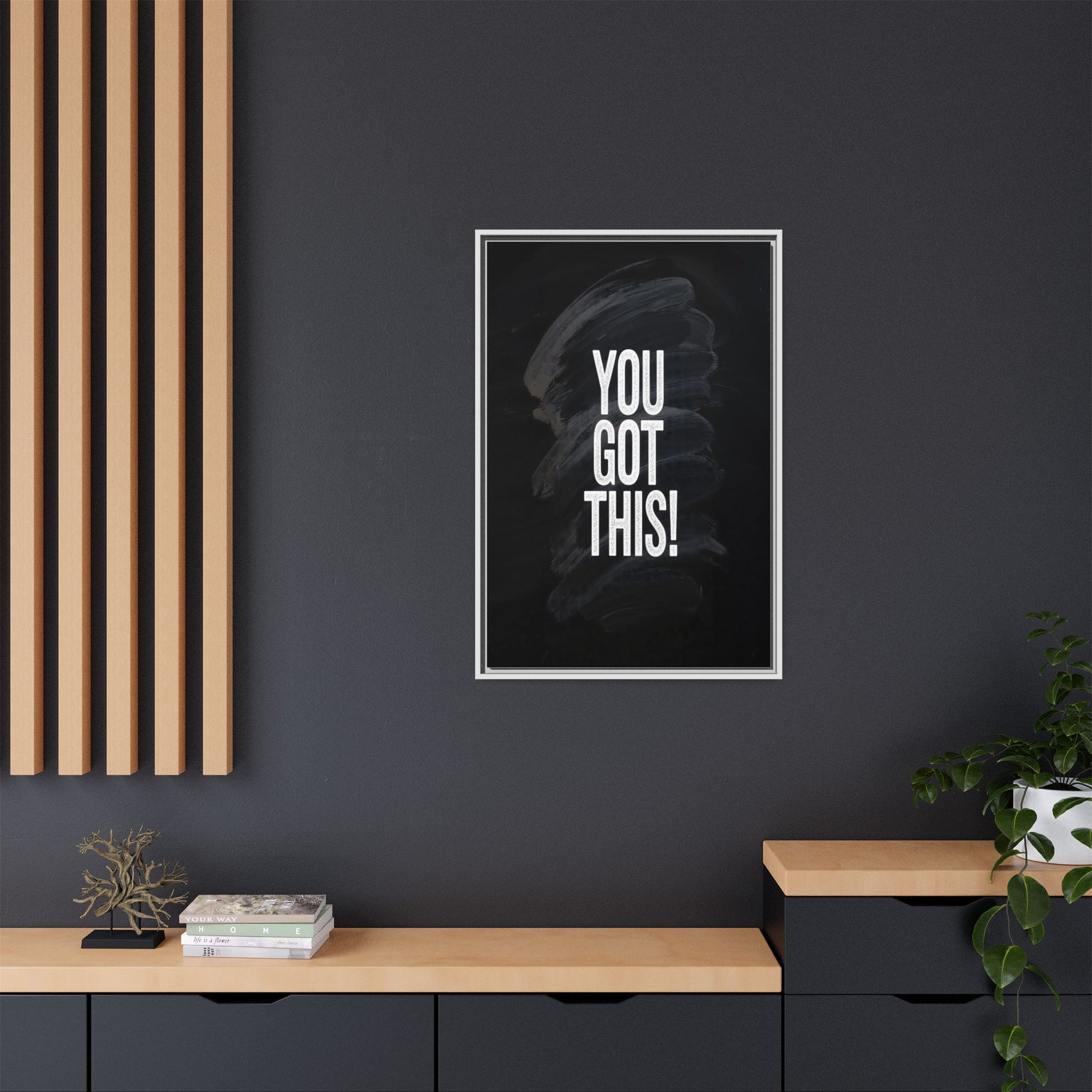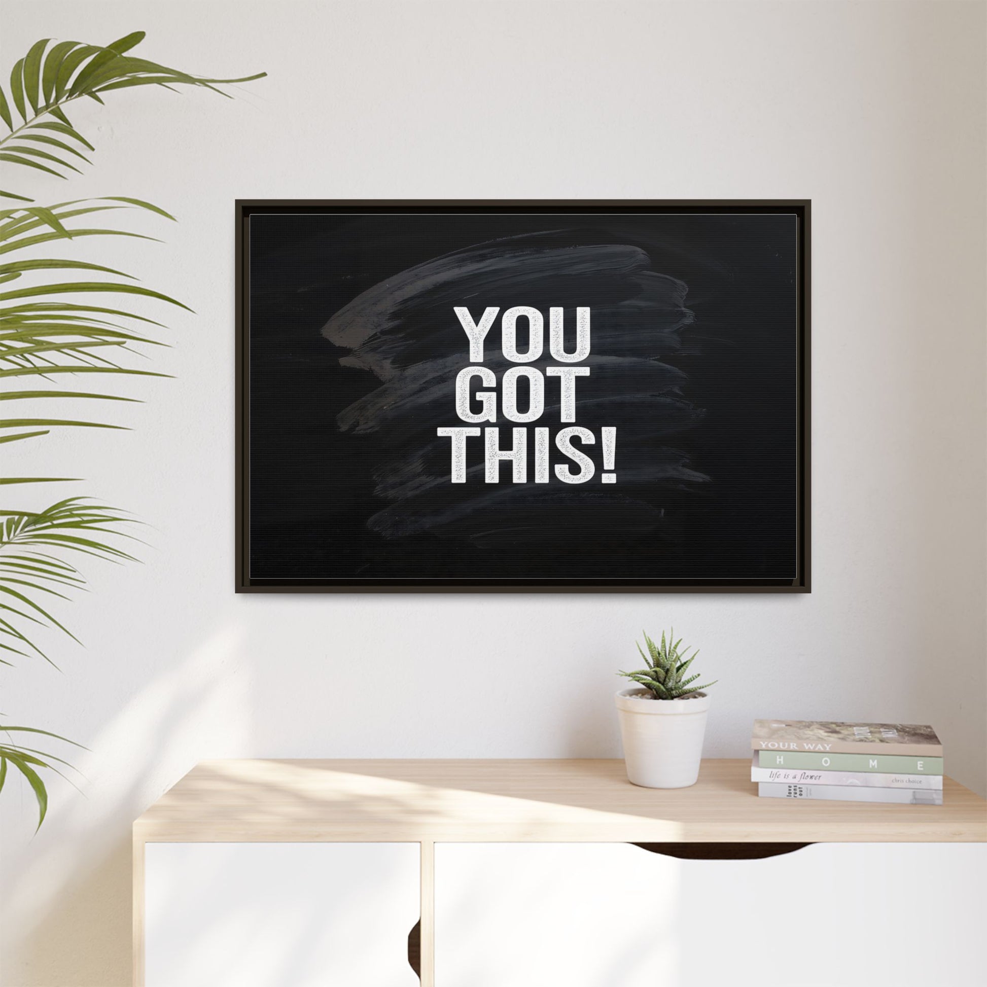 This image features the motivational text "YOU GOT THIS!" in bold, white, slightly textured typography positioned against a dark, moody background. The background consists of dramatic, sweeping black and gray brushstrokes that create a sense of dynamic movement and energy. The text appears to be centered and stands out sharply against the dark, paint-like backdrop, creating a strong visual contrast. The design has a minimalist yet powerful aesthetic, suggesting encouragement and empowerment. The grungy, textured style of both the text and background gives the image an intense and inspiring feel.