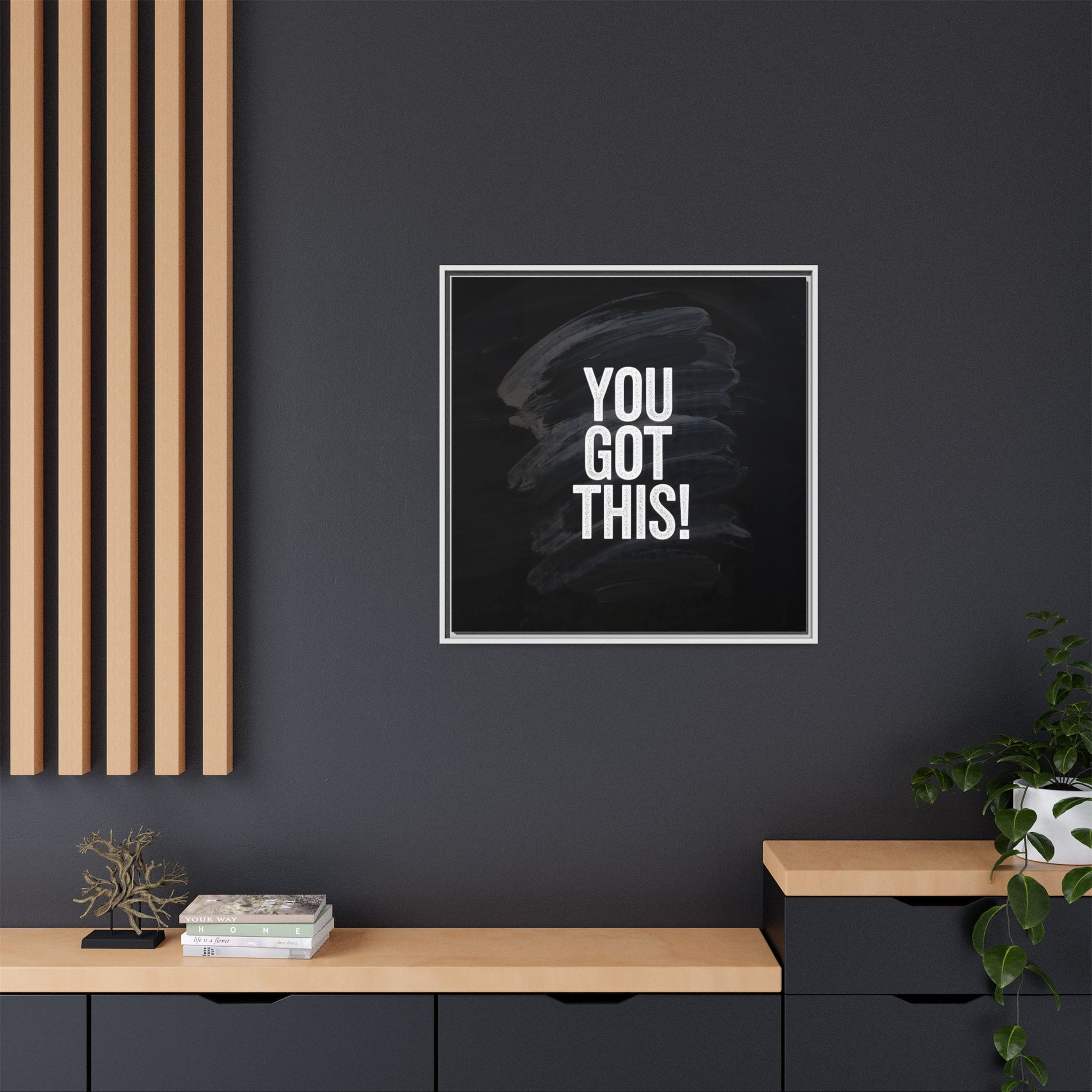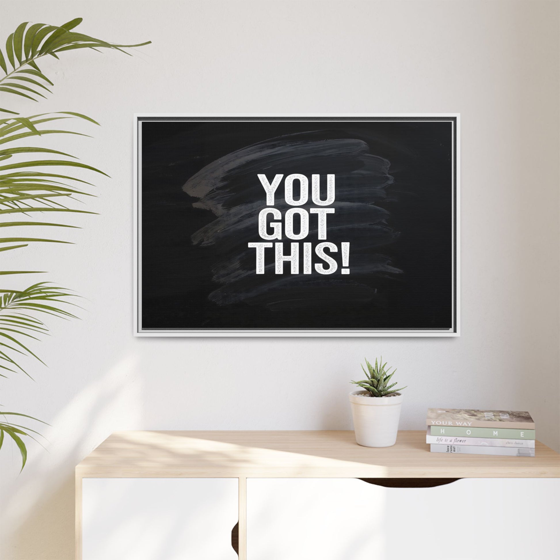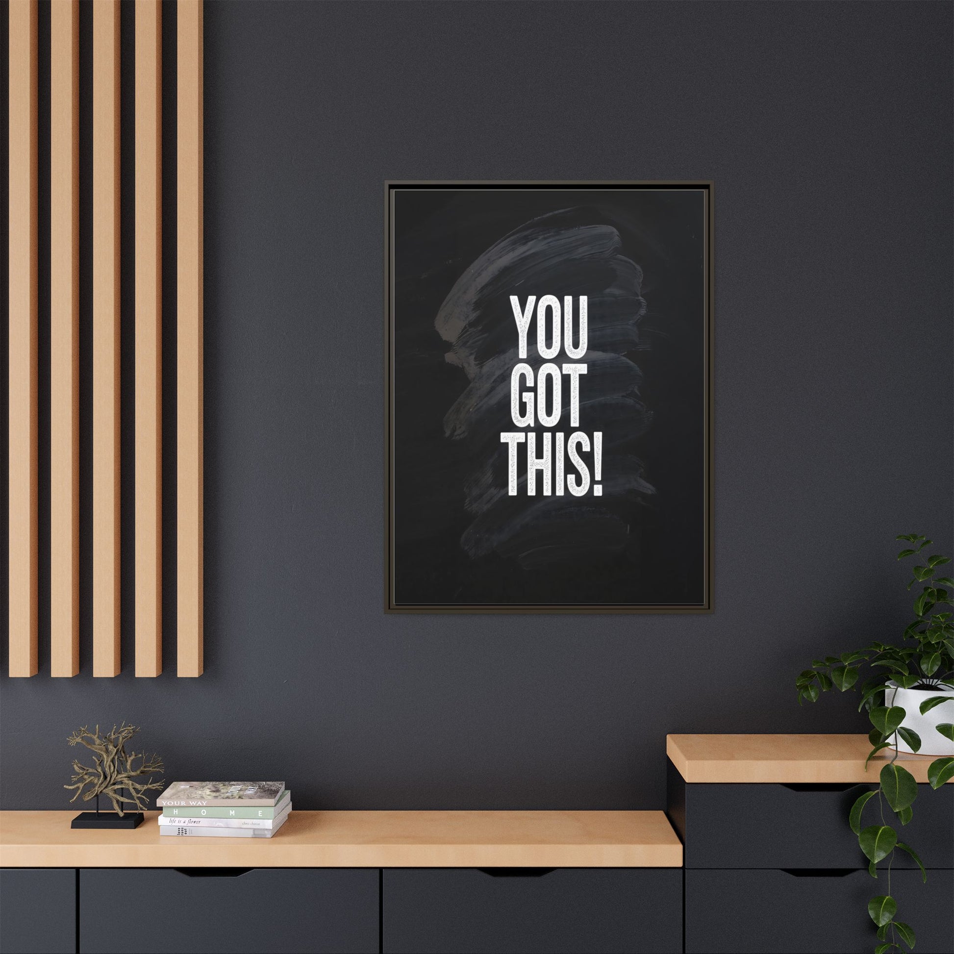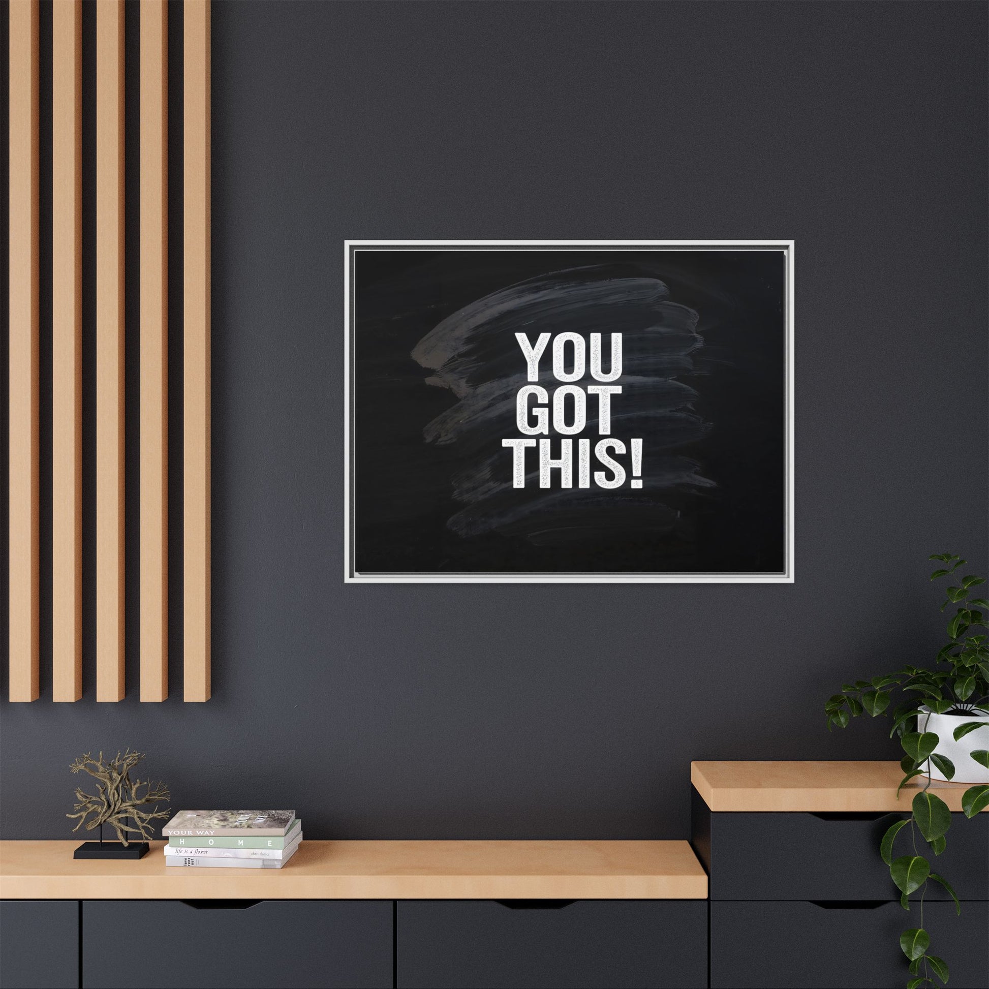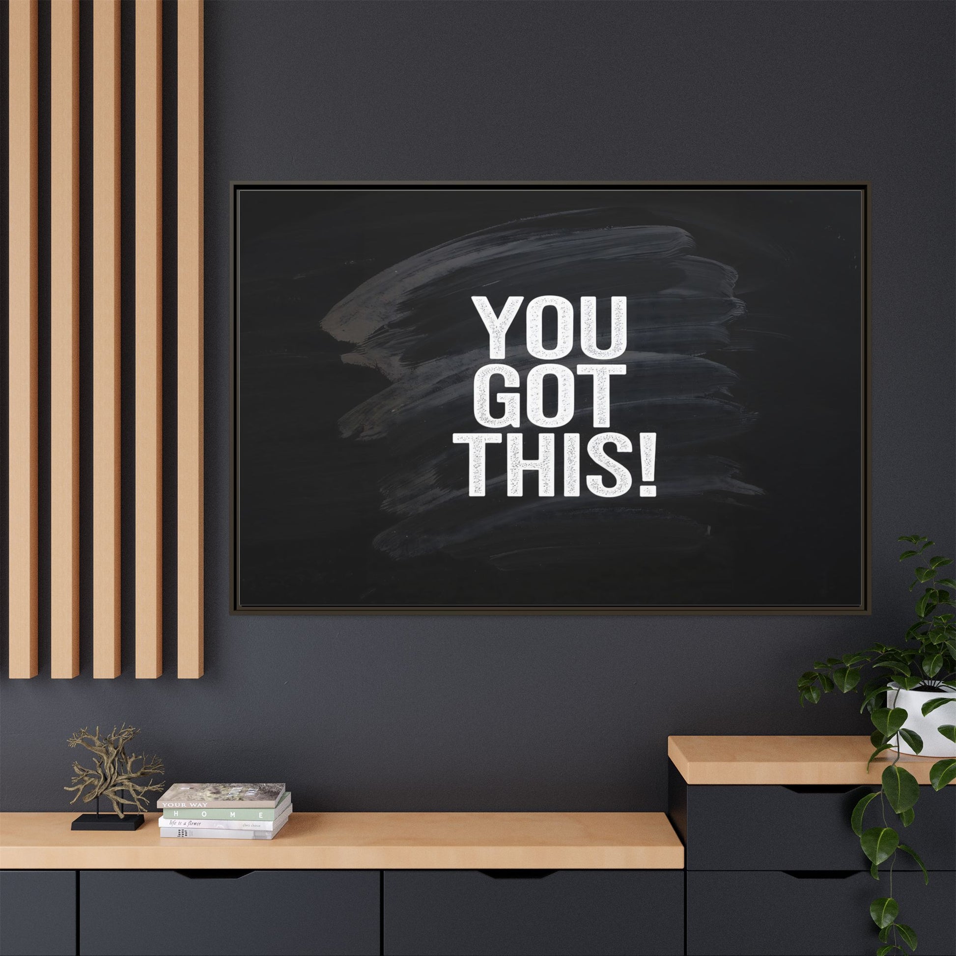 This image features the motivational text "YOU GOT THIS!" in bold, white, slightly textured typography positioned against a dark, moody background. The background consists of dramatic, sweeping black and gray brushstrokes that create a sense of dynamic movement and energy. The text appears to be centered and stands out sharply against the dark, paint-like backdrop, creating a strong visual contrast. The design has a minimalist yet powerful aesthetic, suggesting encouragement and empowerment. The grungy, textured style of both the text and background gives the image an intense and inspiring feel.