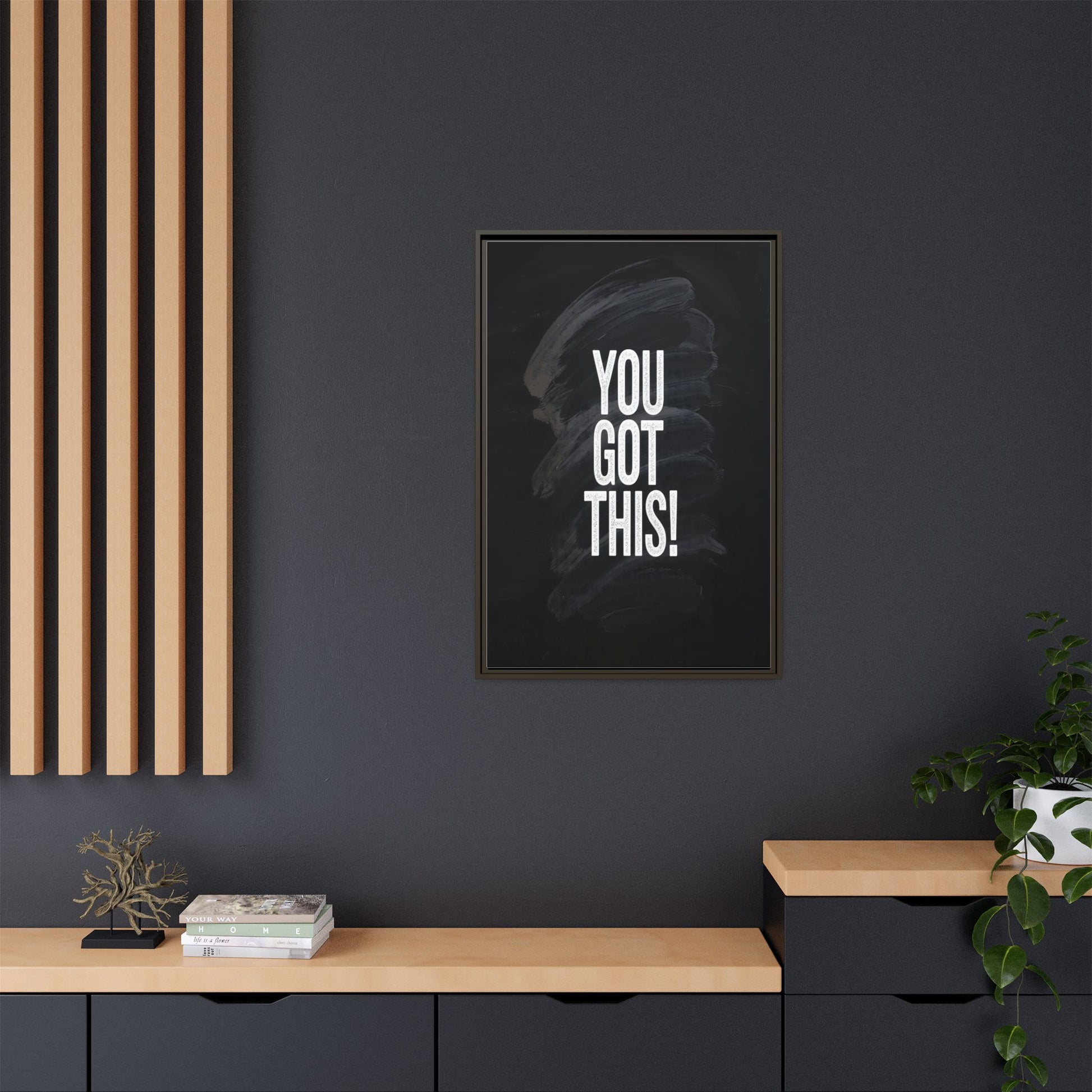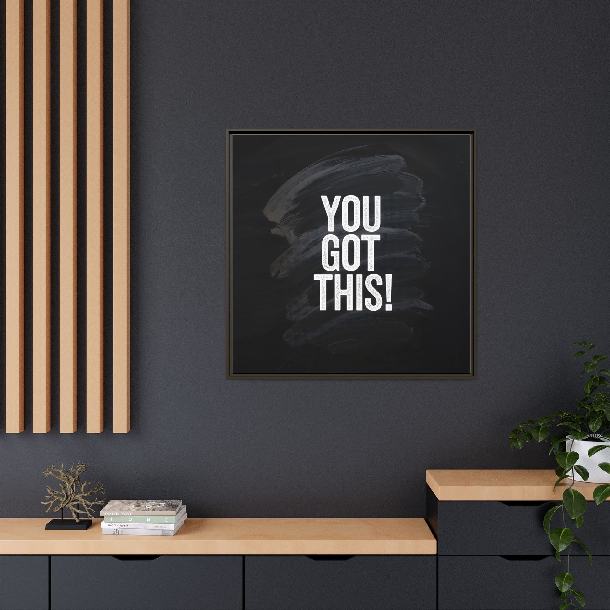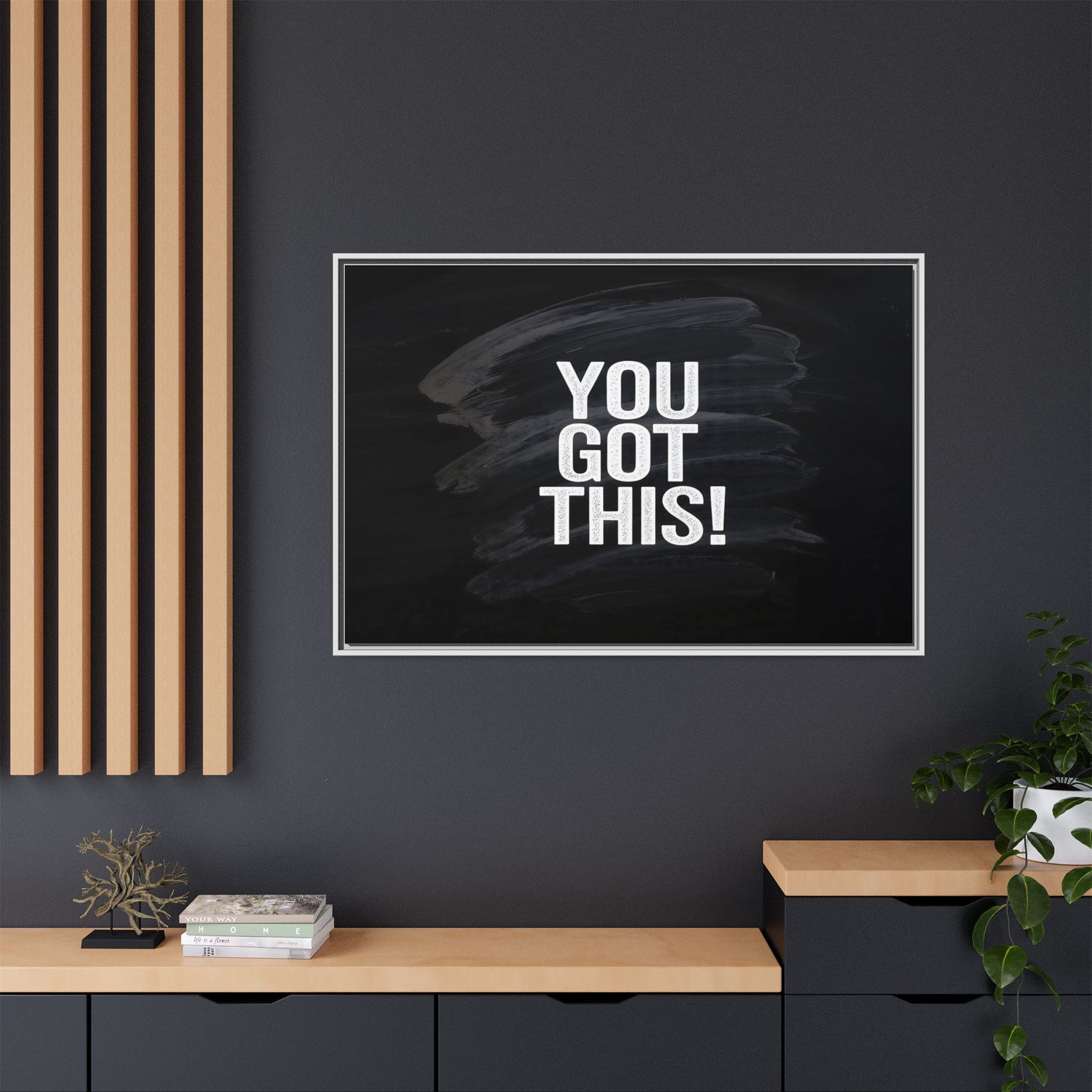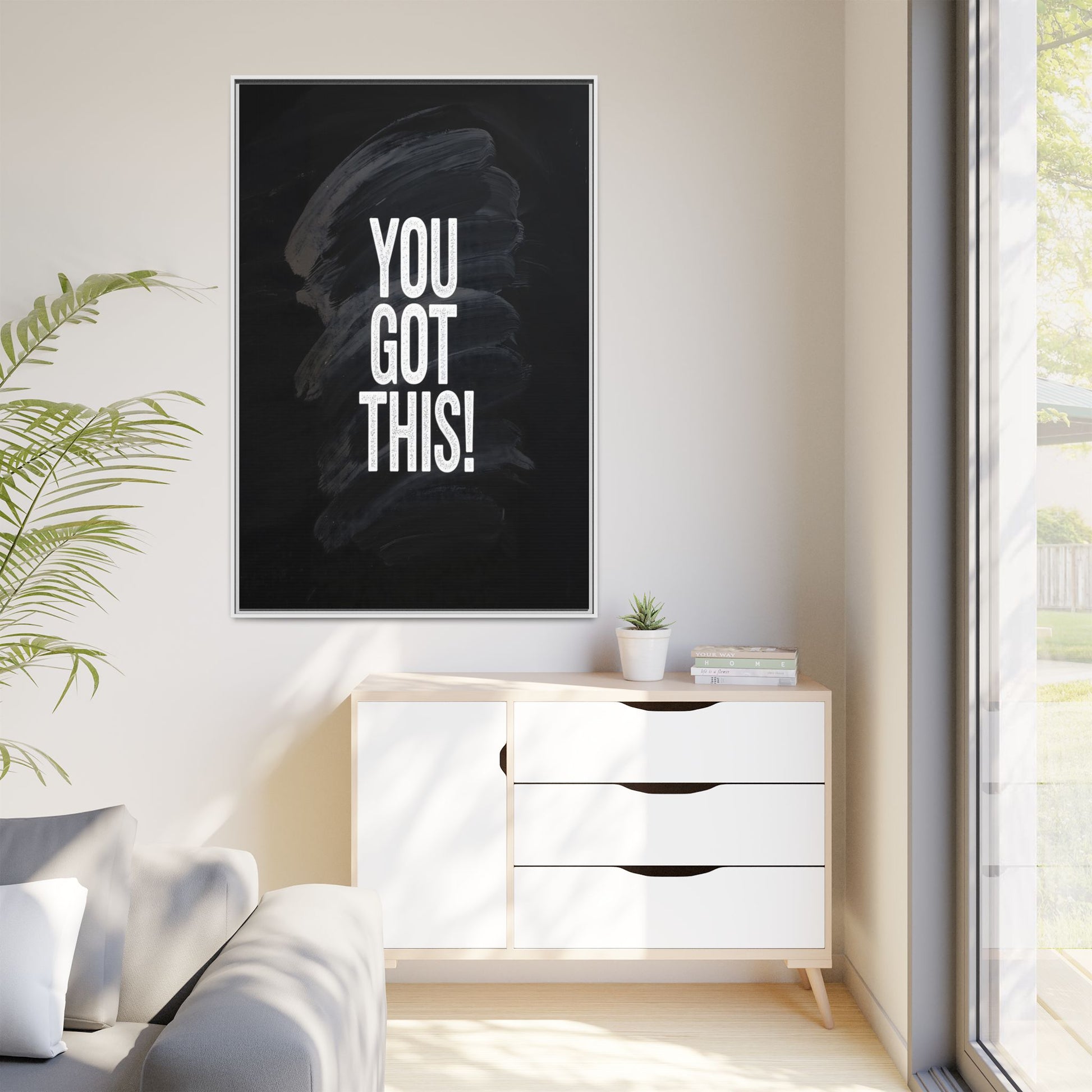 This image features the motivational text "YOU GOT THIS!" in bold, white, slightly textured typography positioned against a dark, moody background. The background consists of dramatic, sweeping black and gray brushstrokes that create a sense of dynamic movement and energy. The text appears to be centered and stands out sharply against the dark, paint-like backdrop, creating a strong visual contrast. The design has a minimalist yet powerful aesthetic, suggesting encouragement and empowerment. The grungy, textured style of both the text and background gives the image an intense and inspiring feel.