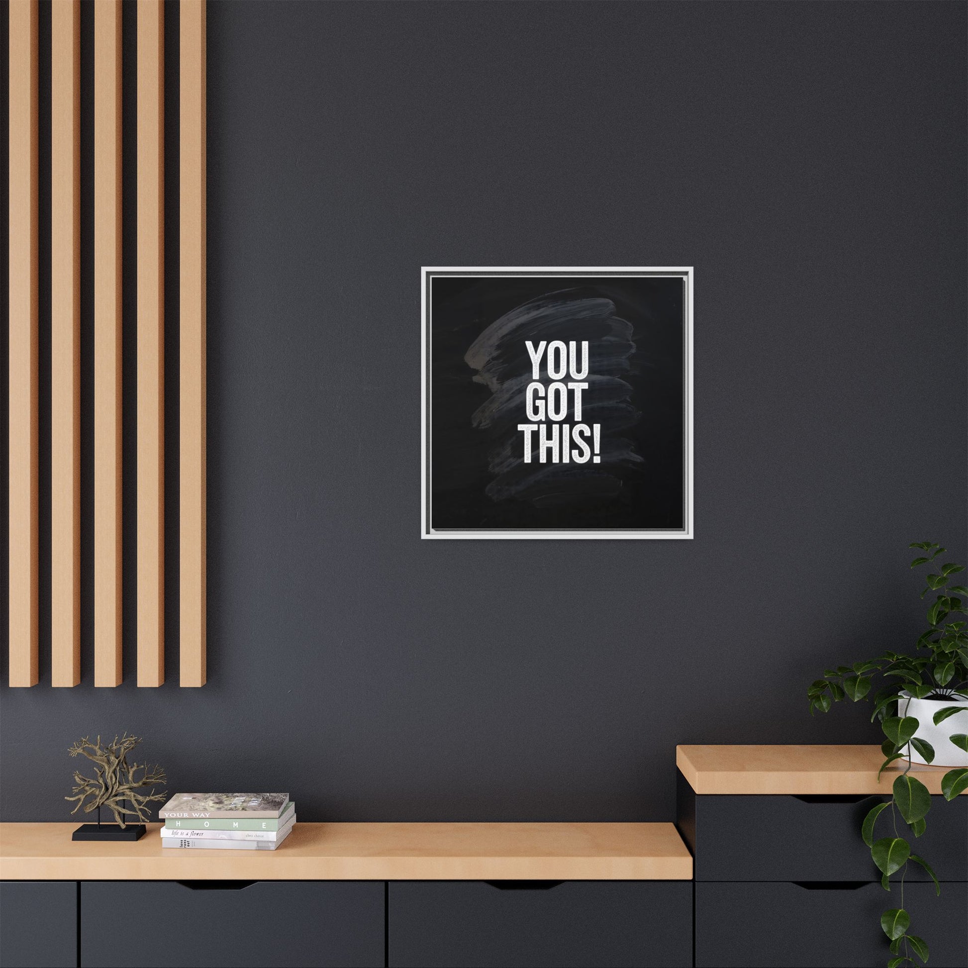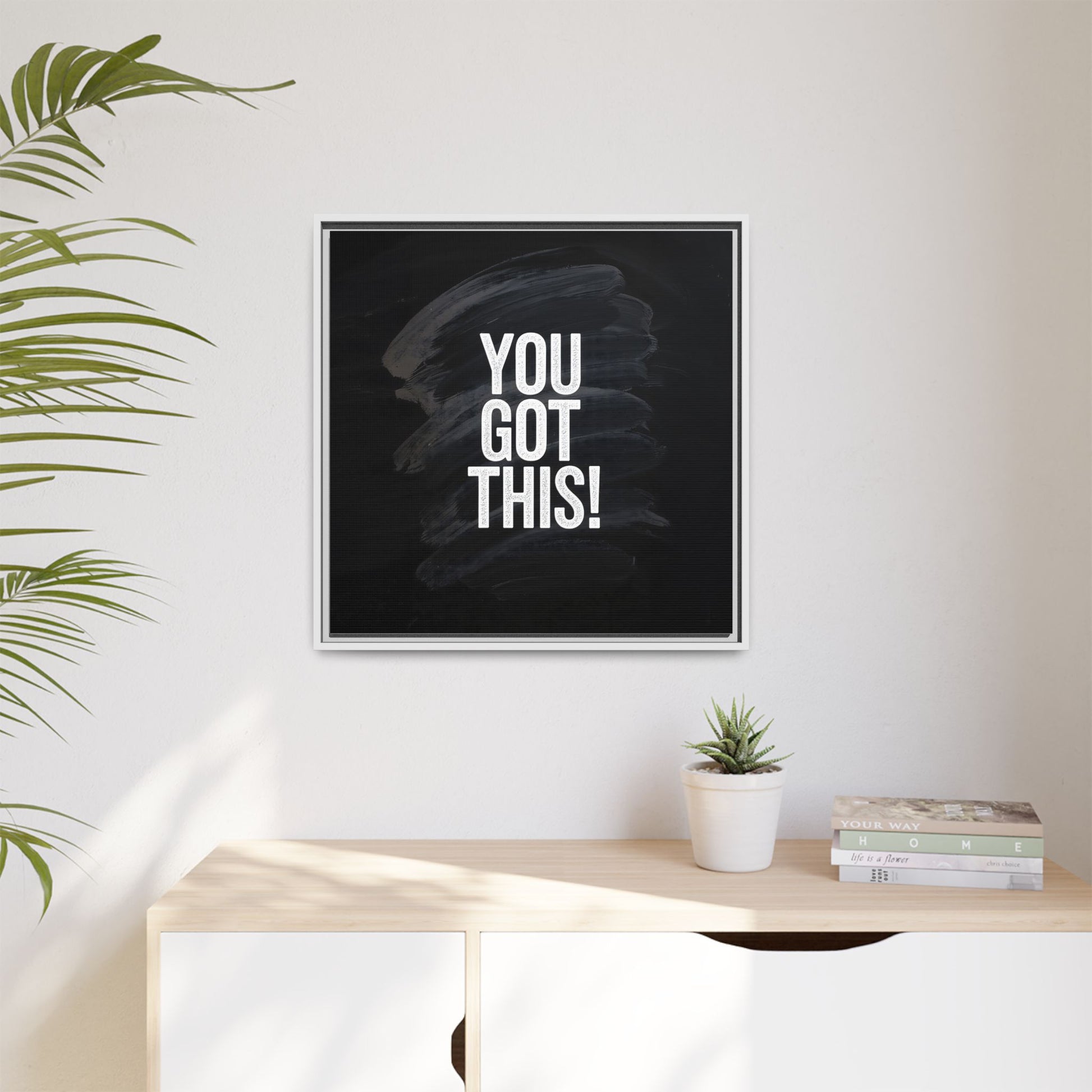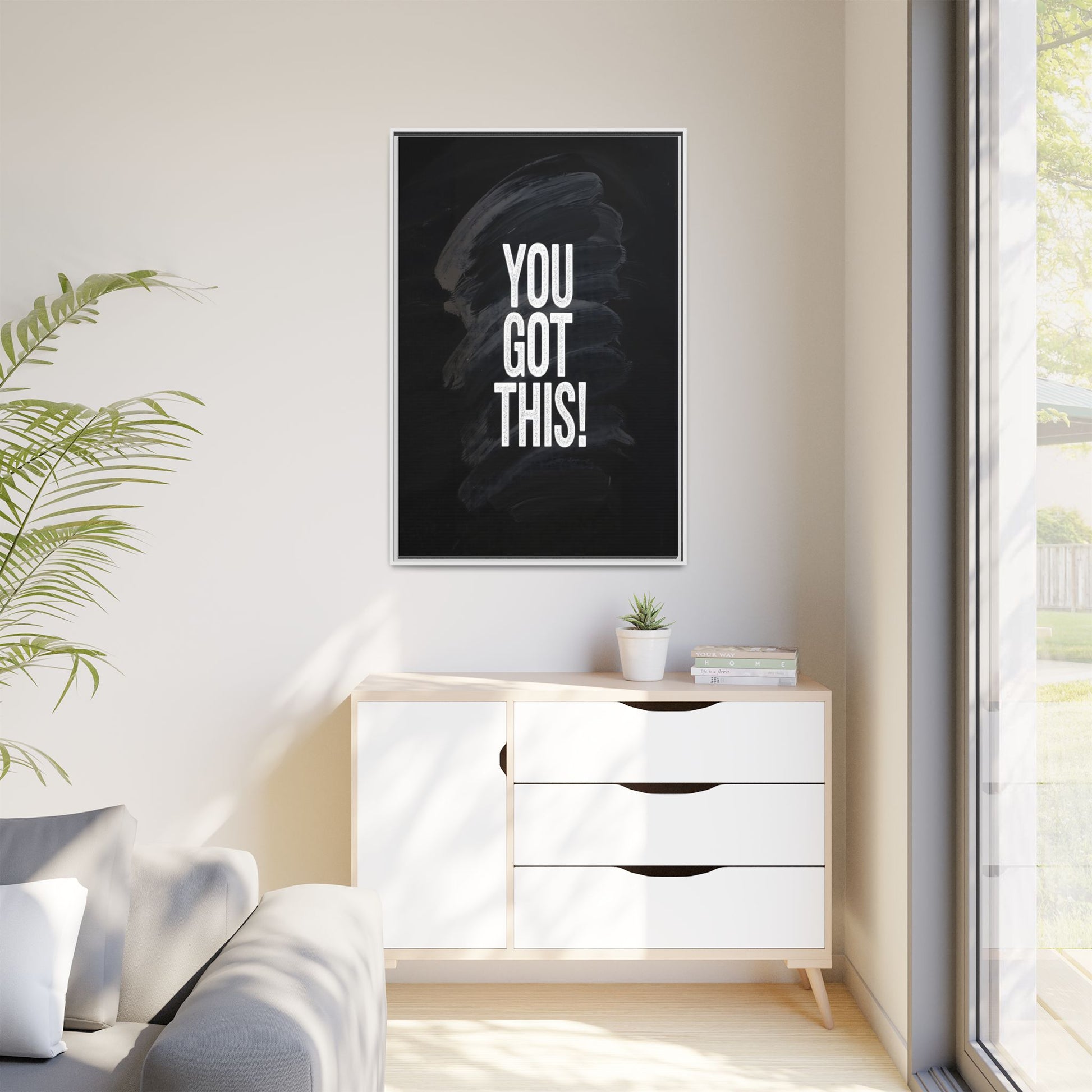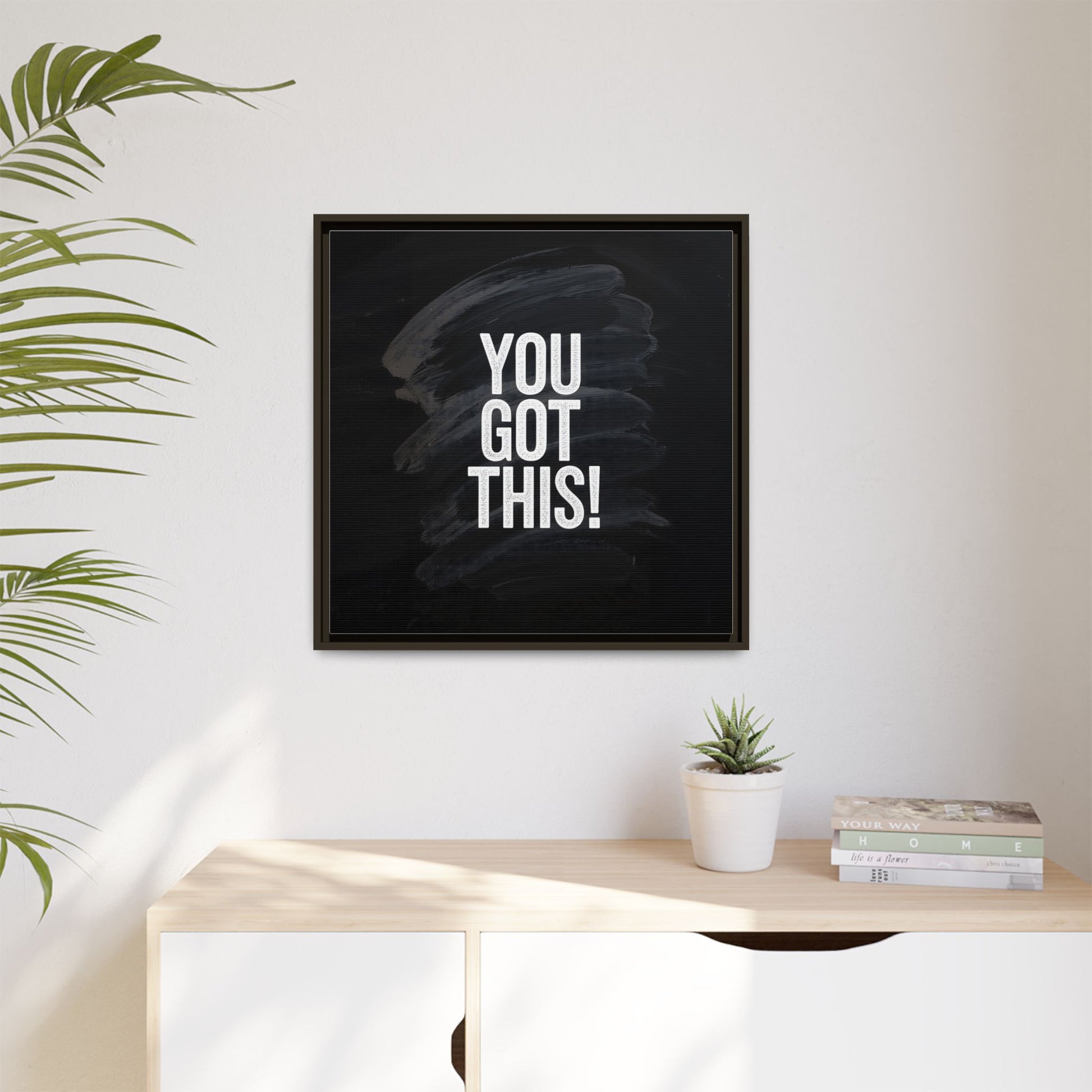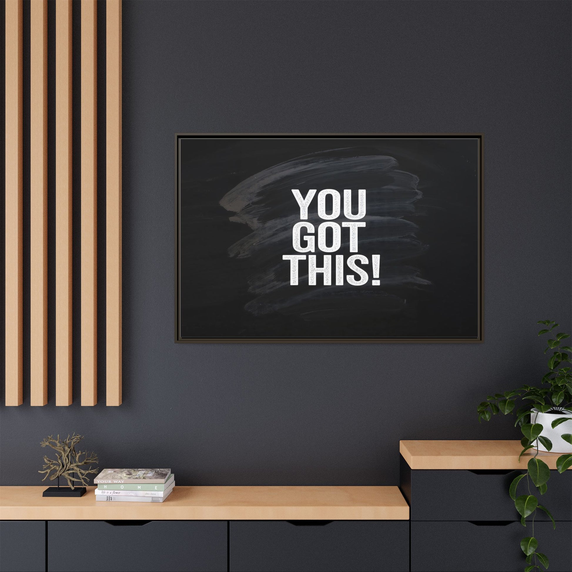 This image features the motivational text "YOU GOT THIS!" in bold, white, slightly textured typography positioned against a dark, moody background. The background consists of dramatic, sweeping black and gray brushstrokes that create a sense of dynamic movement and energy. The text appears to be centered and stands out sharply against the dark, paint-like backdrop, creating a strong visual contrast. The design has a minimalist yet powerful aesthetic, suggesting encouragement and empowerment. The grungy, textured style of both the text and background gives the image an intense and inspiring feel.
