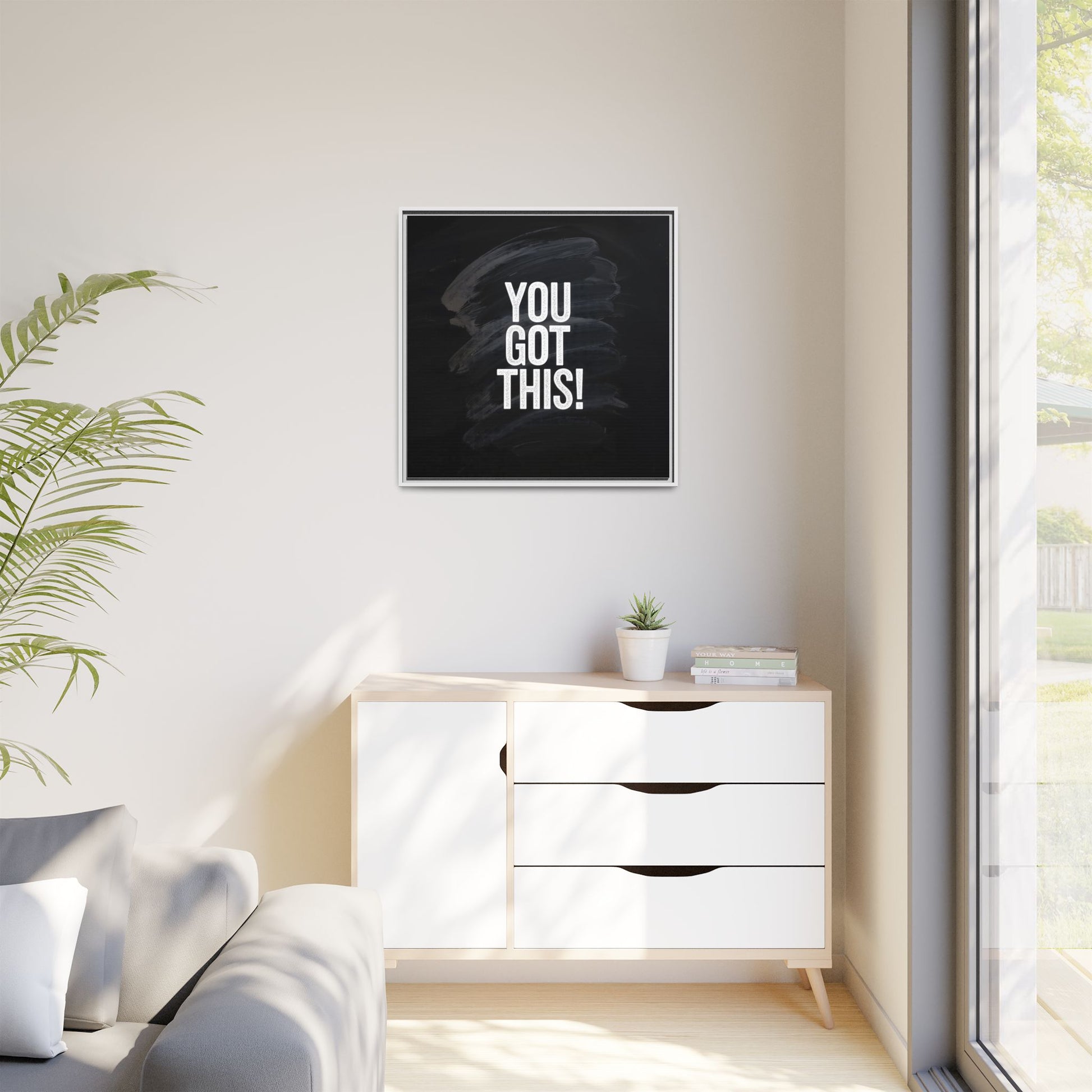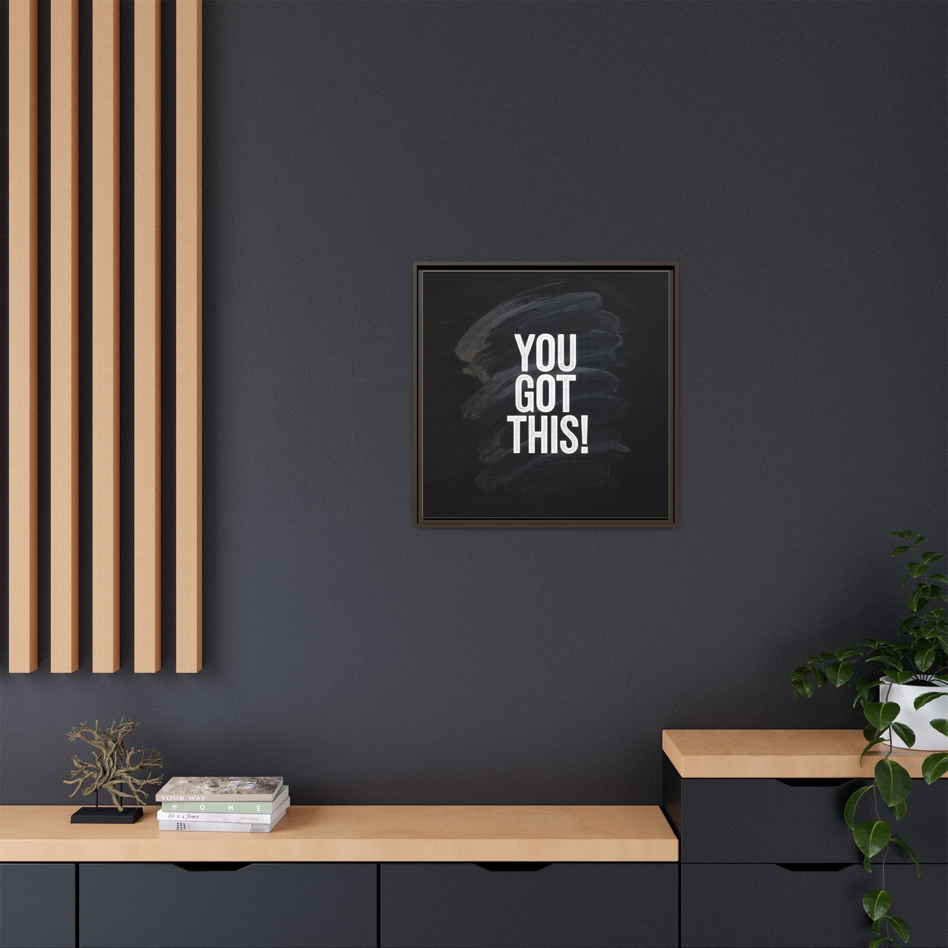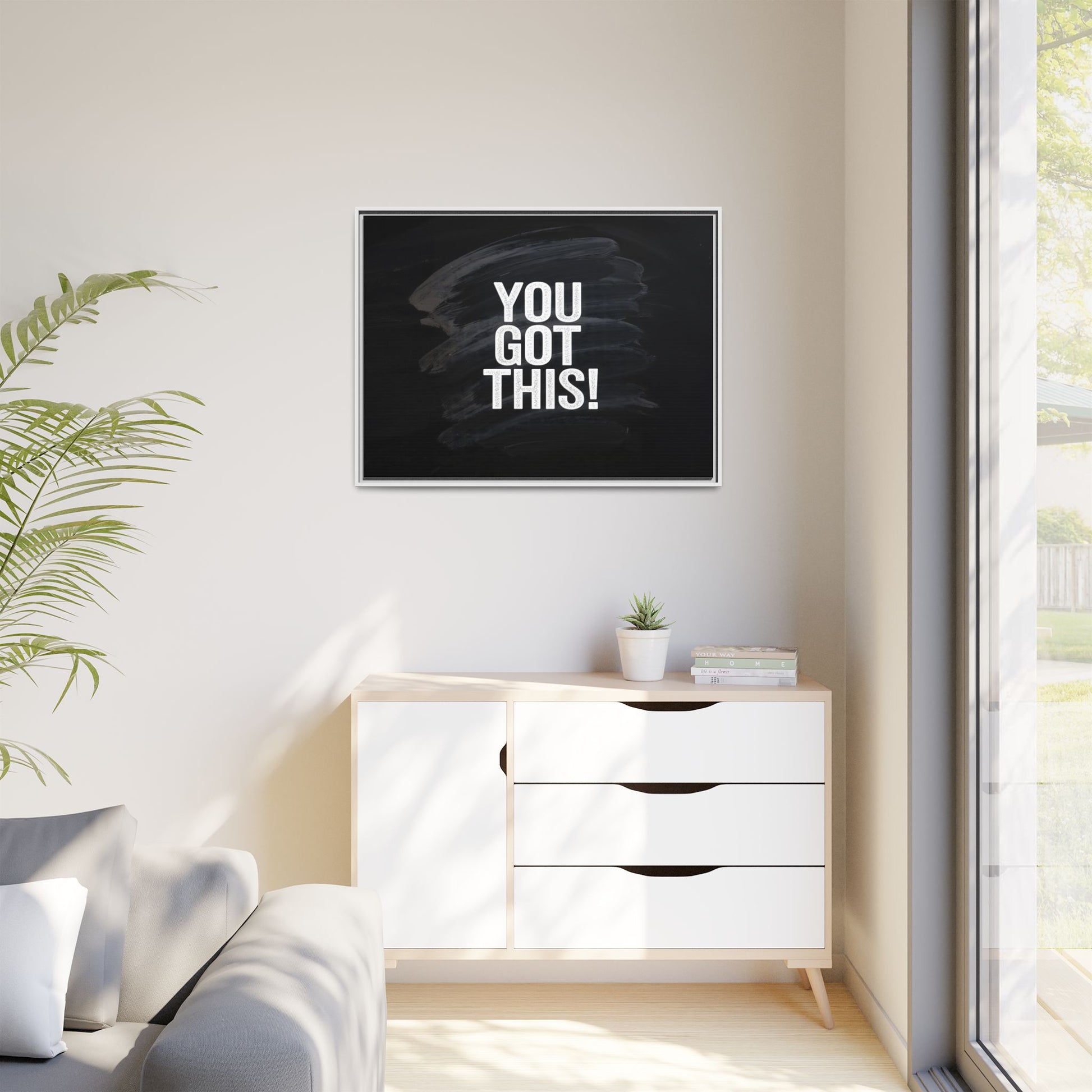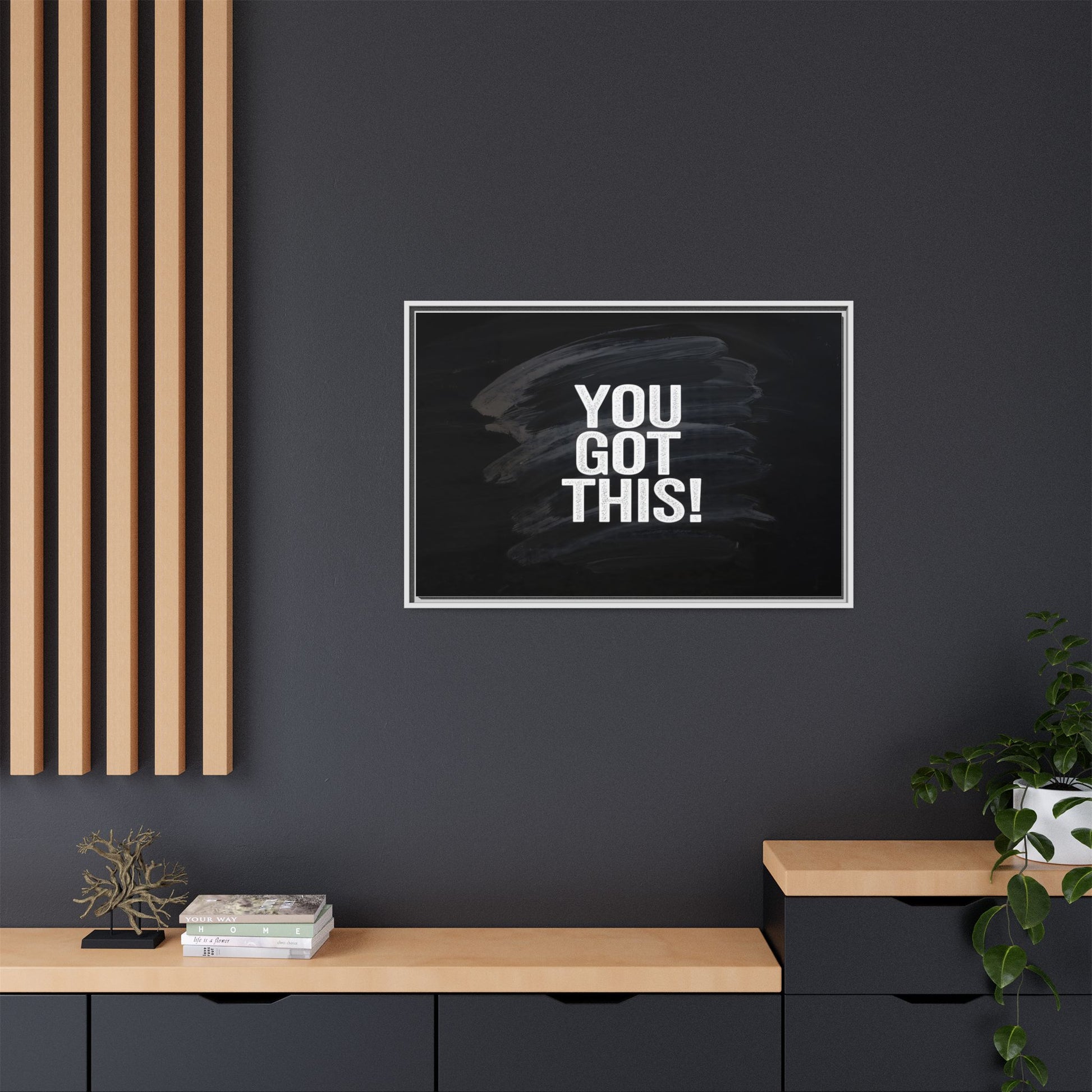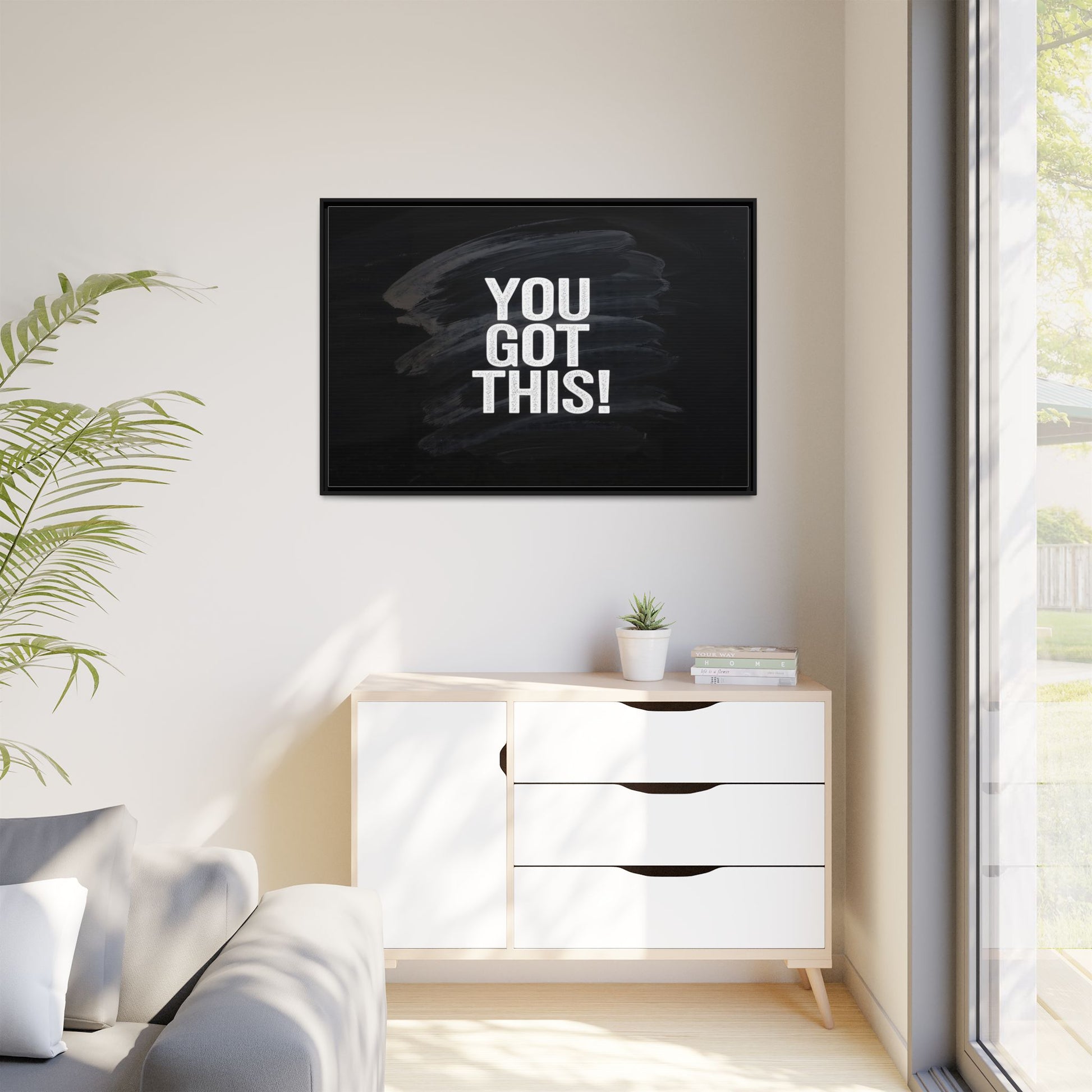 This image features the motivational text "YOU GOT THIS!" in bold, white, slightly textured typography positioned against a dark, moody background. The background consists of dramatic, sweeping black and gray brushstrokes that create a sense of dynamic movement and energy. The text appears to be centered and stands out sharply against the dark, paint-like backdrop, creating a strong visual contrast. The design has a minimalist yet powerful aesthetic, suggesting encouragement and empowerment. The grungy, textured style of both the text and background gives the image an intense and inspiring feel.
